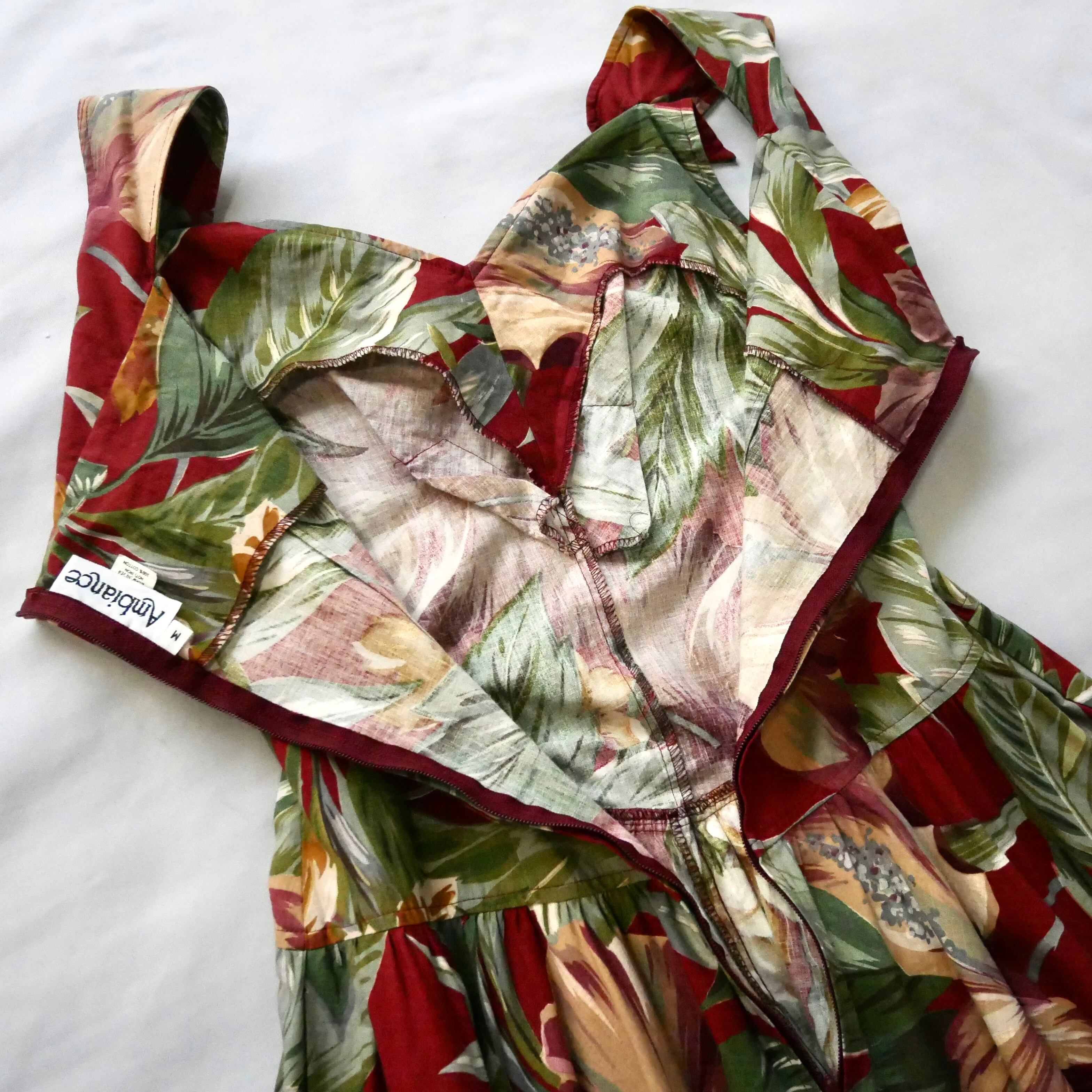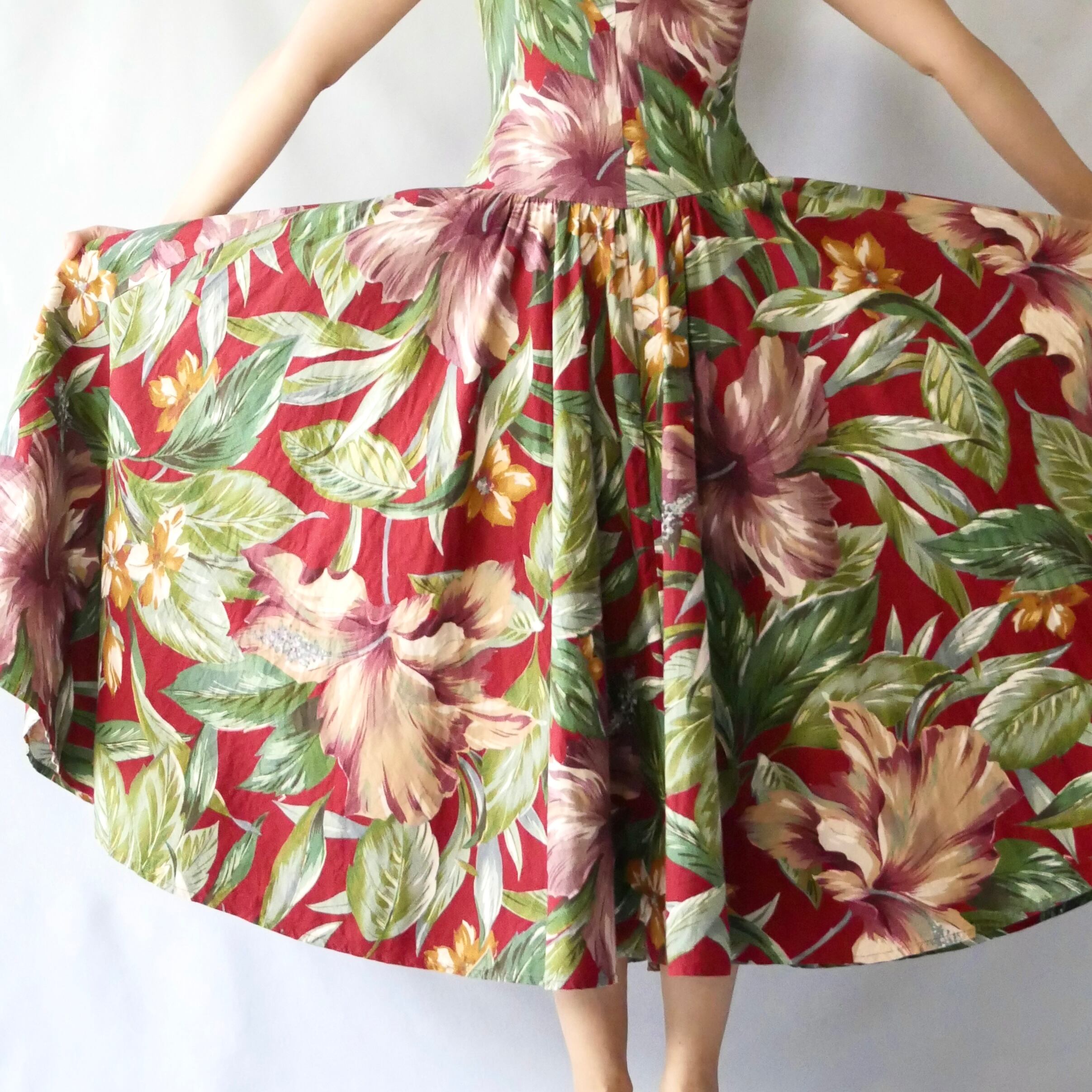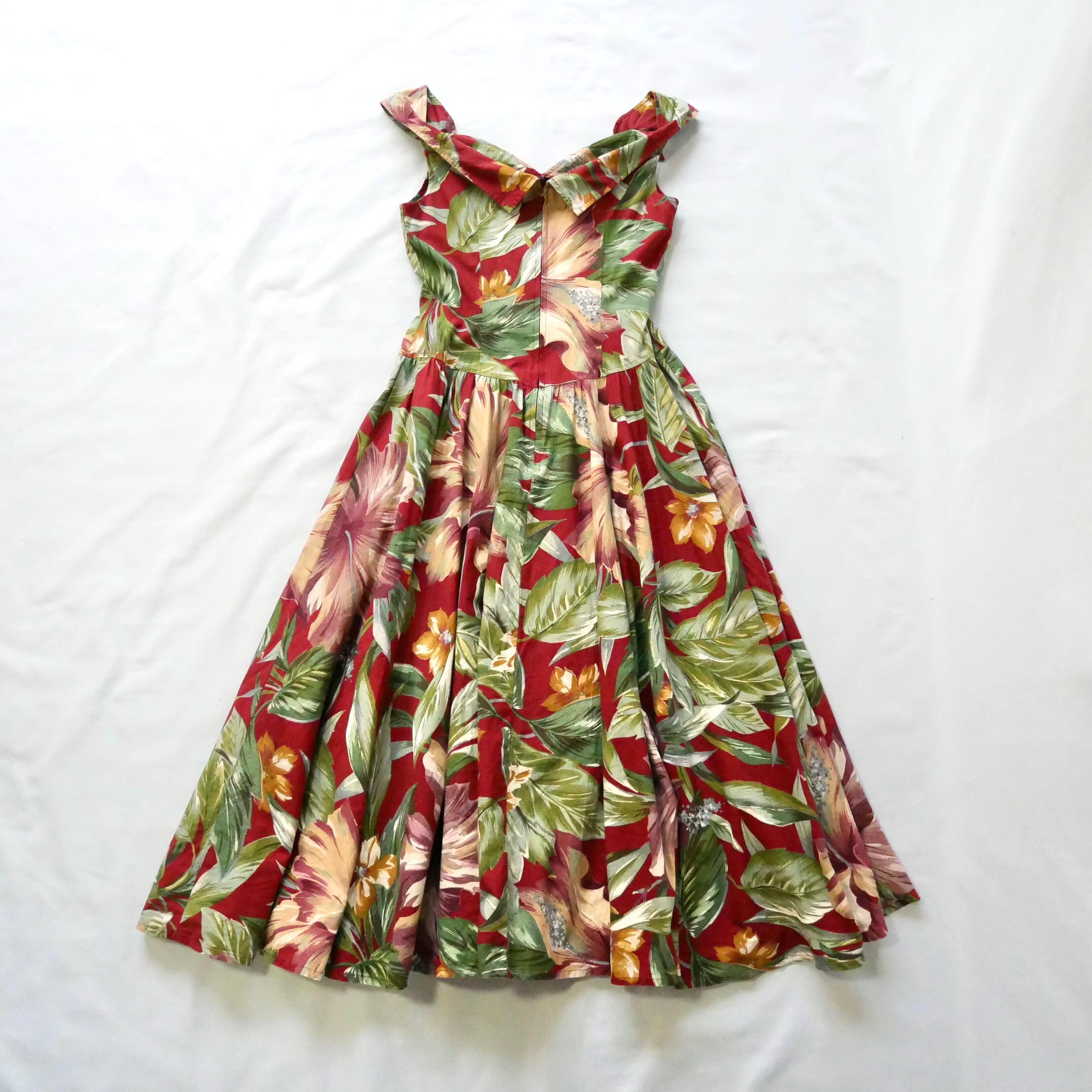 胸元のデザインや大胆なボタニカルパターンが素敵な80年代頃のコットンワンピースです。