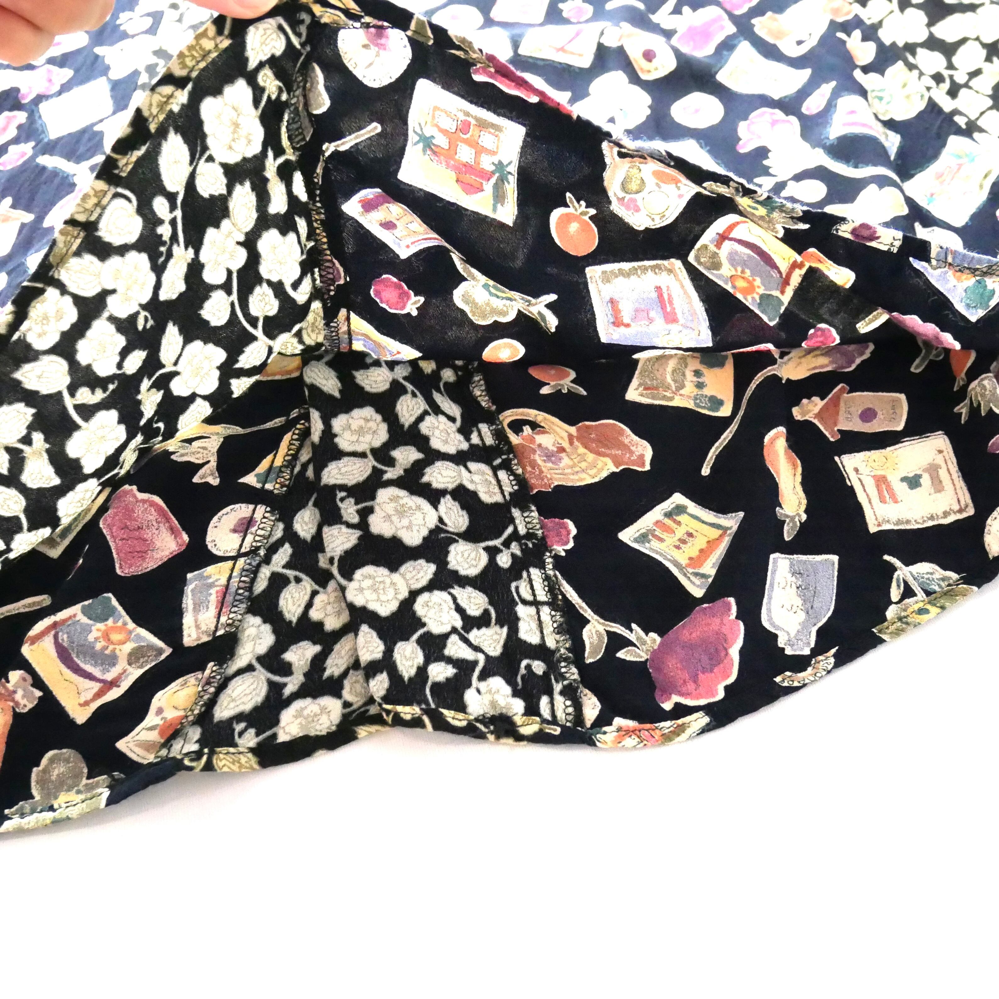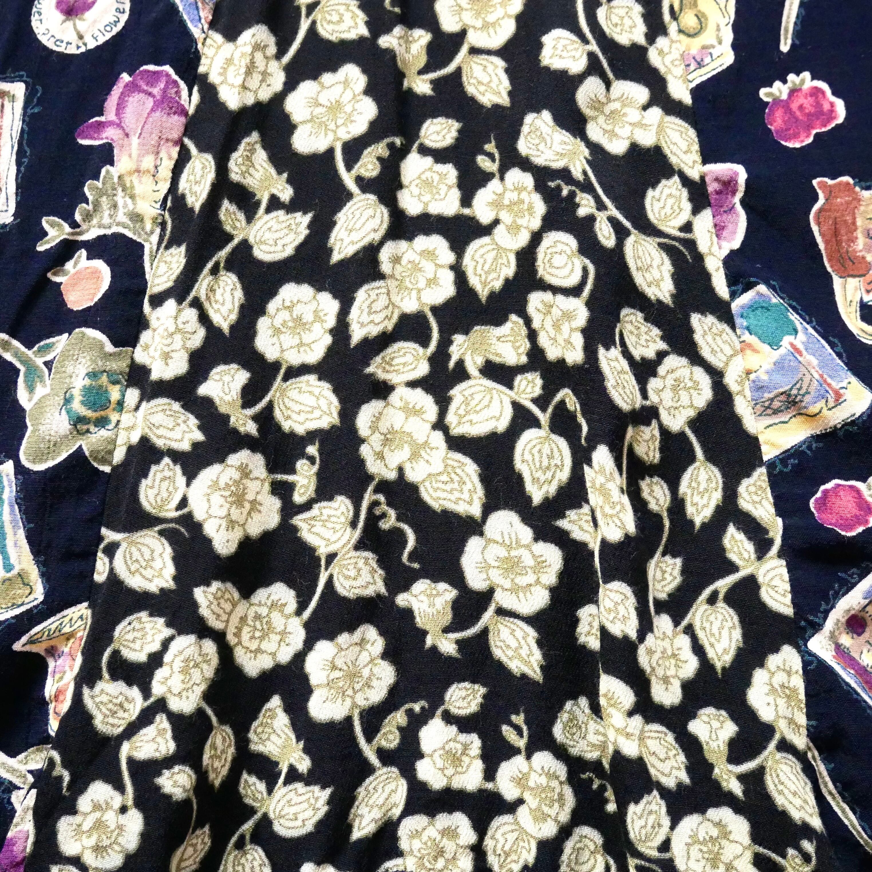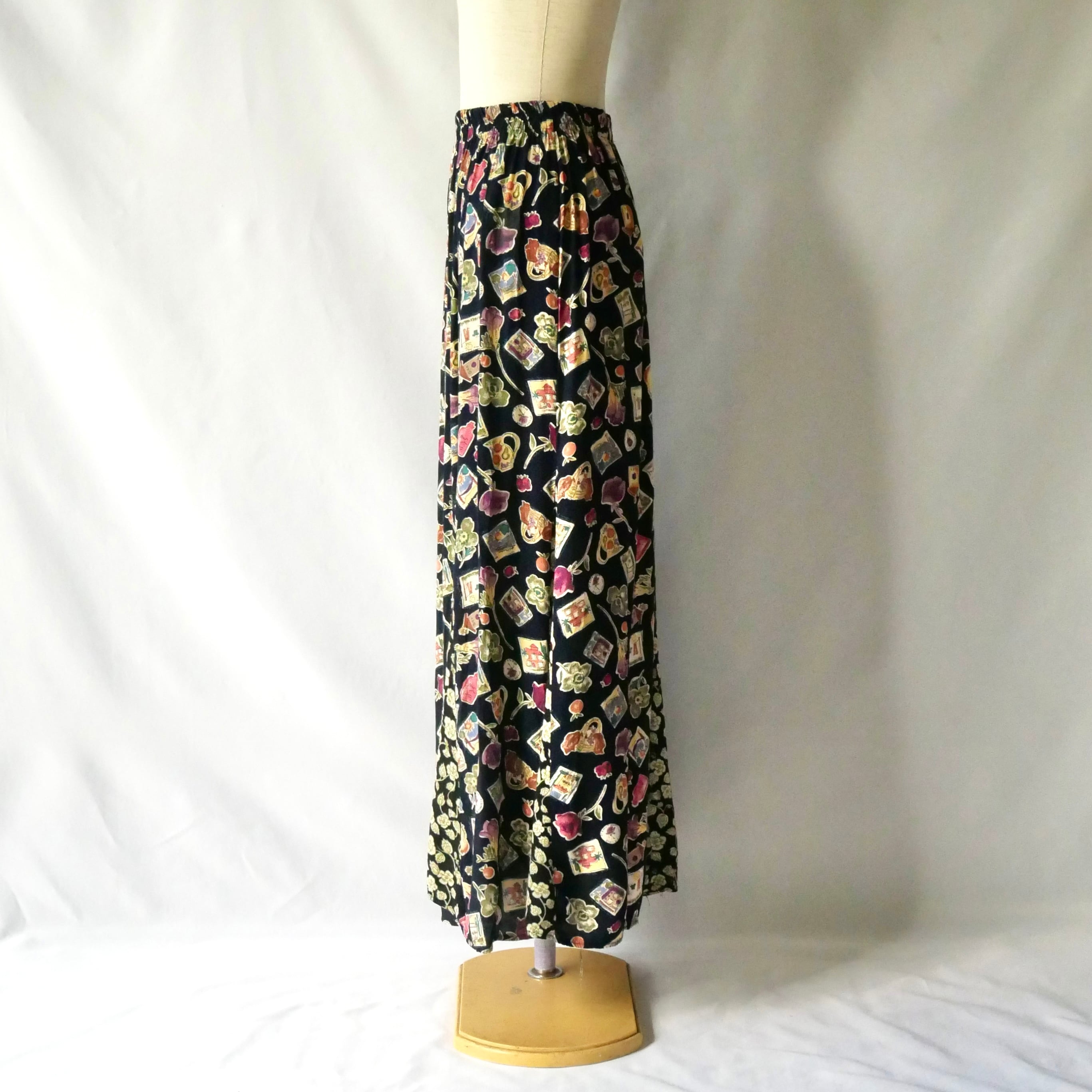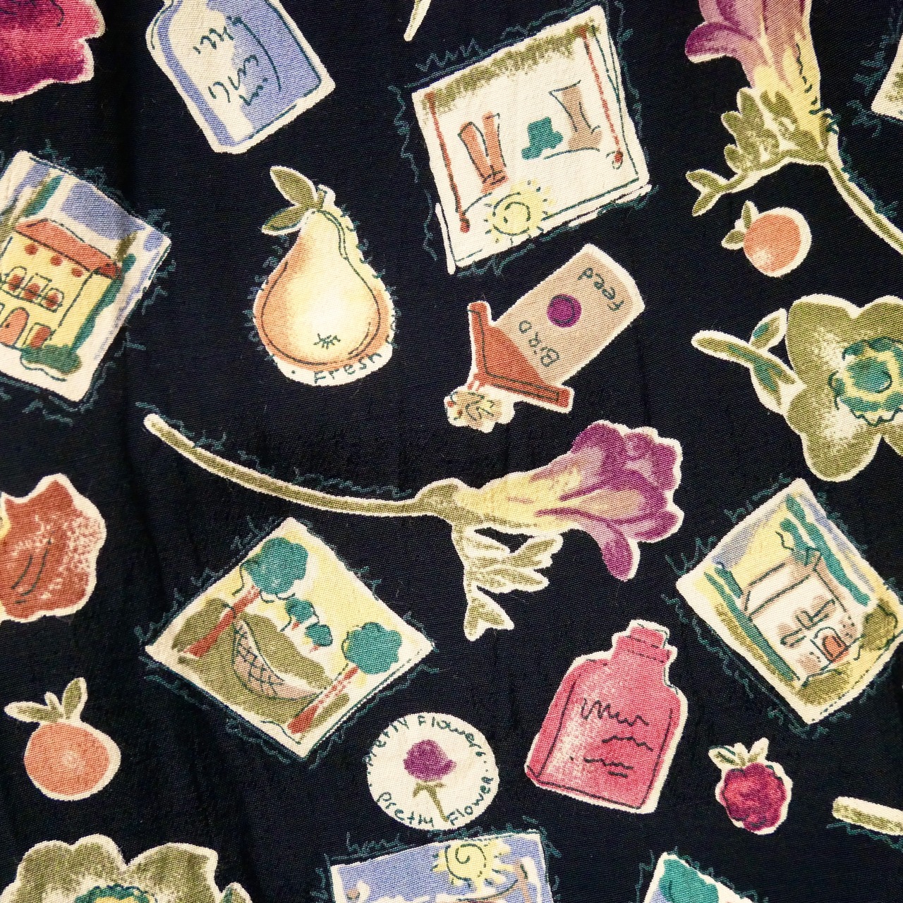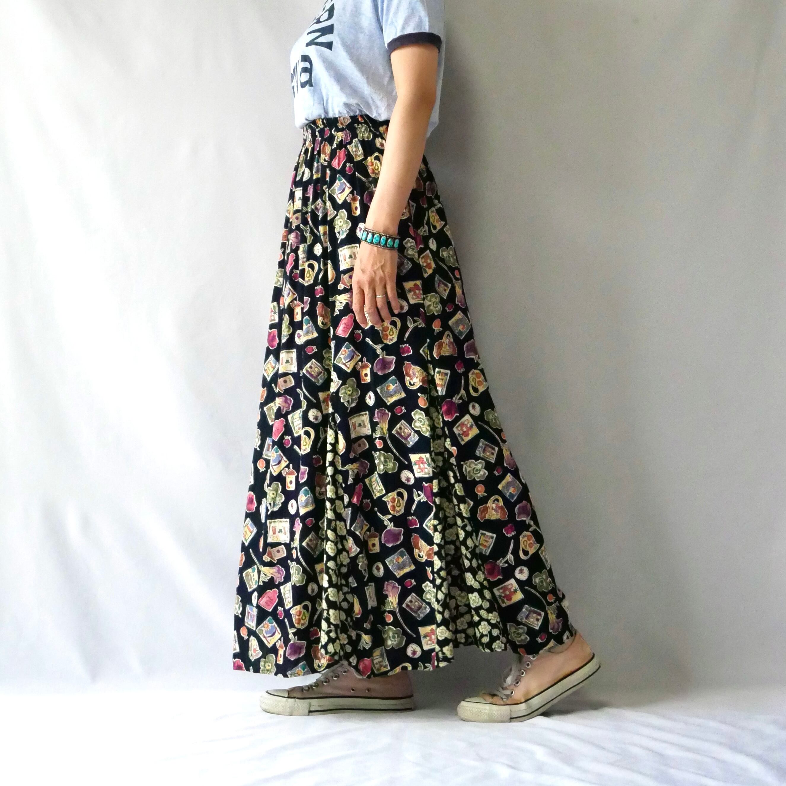 お花や雑貨、フルーツなど可愛い総柄のアメリカ製レーヨンスカートです。