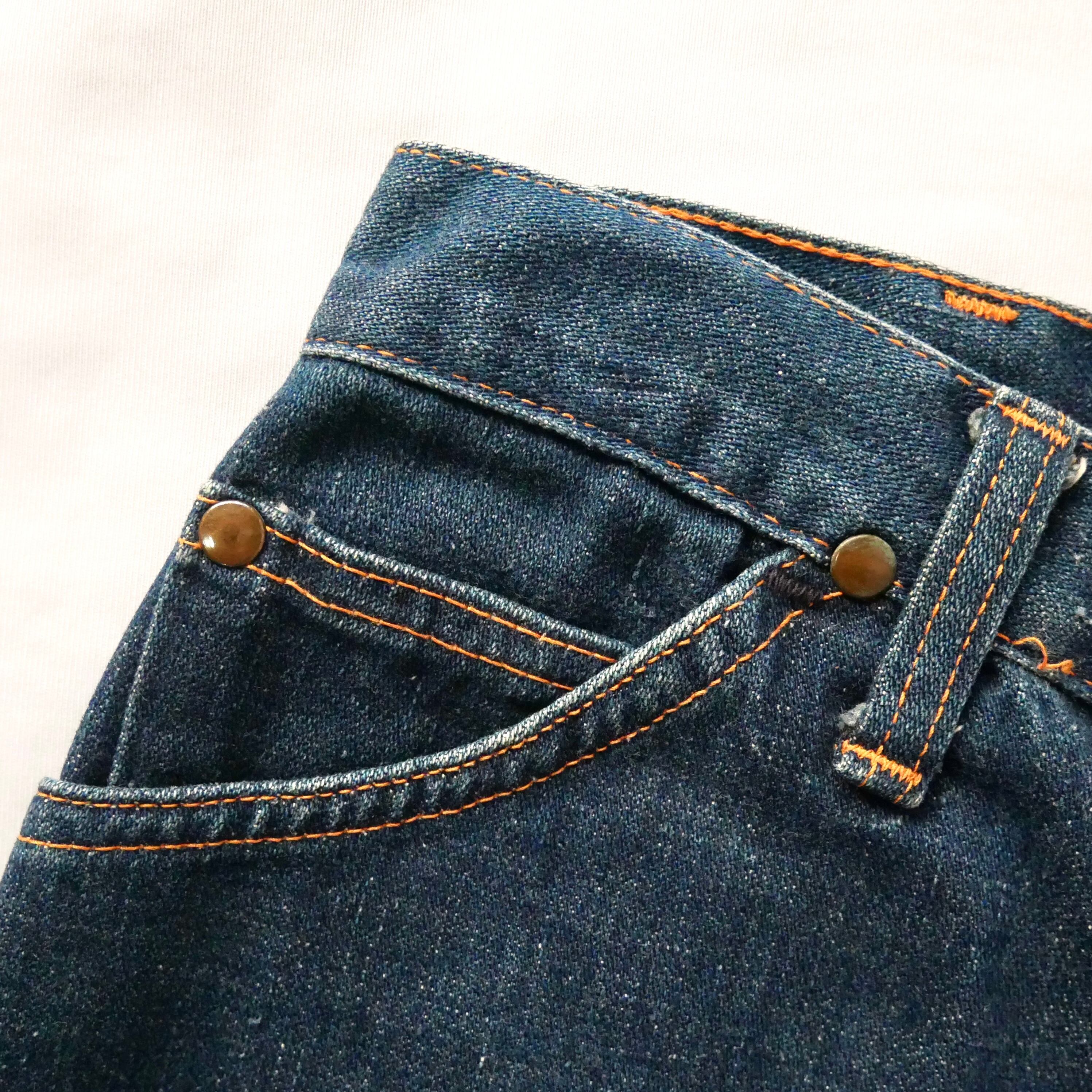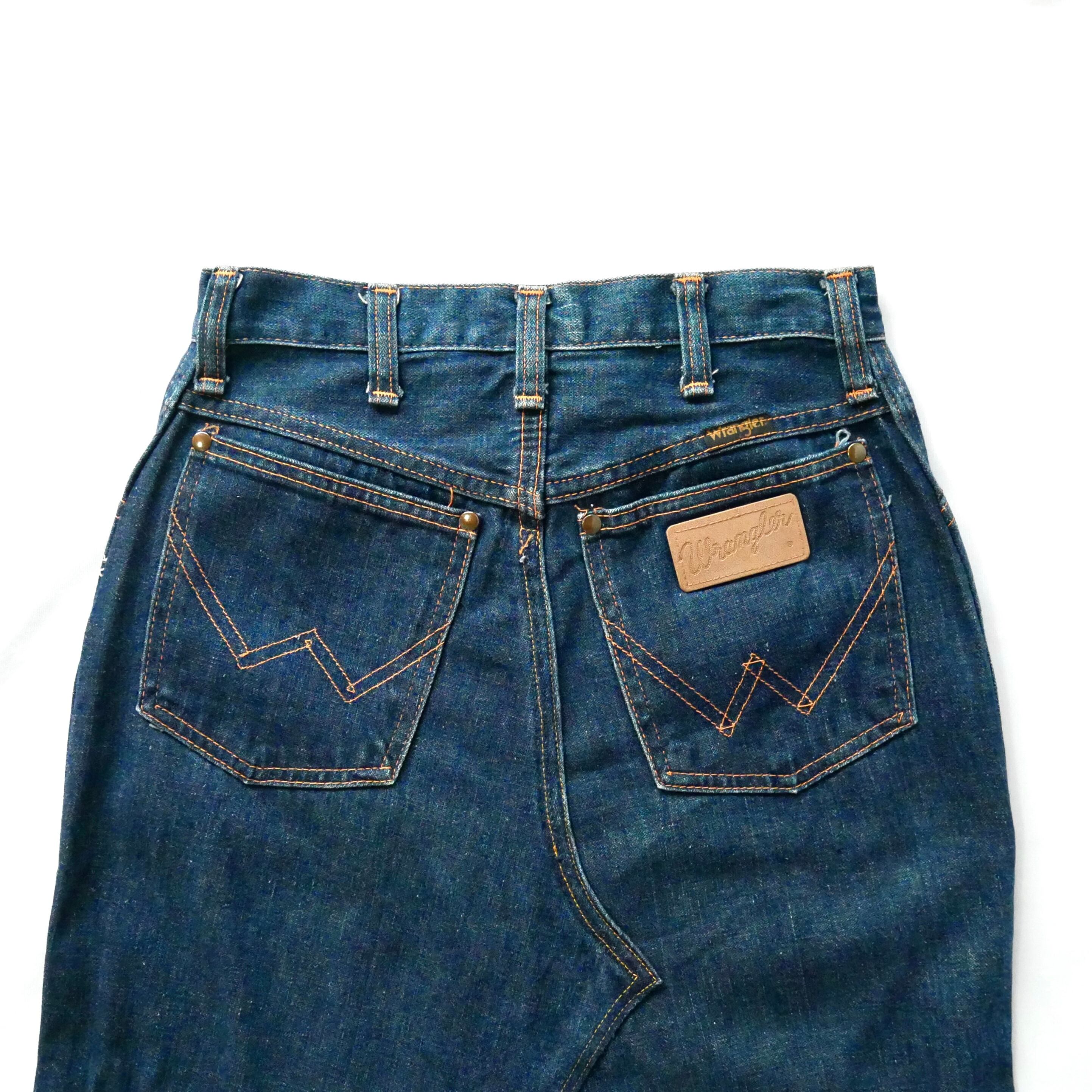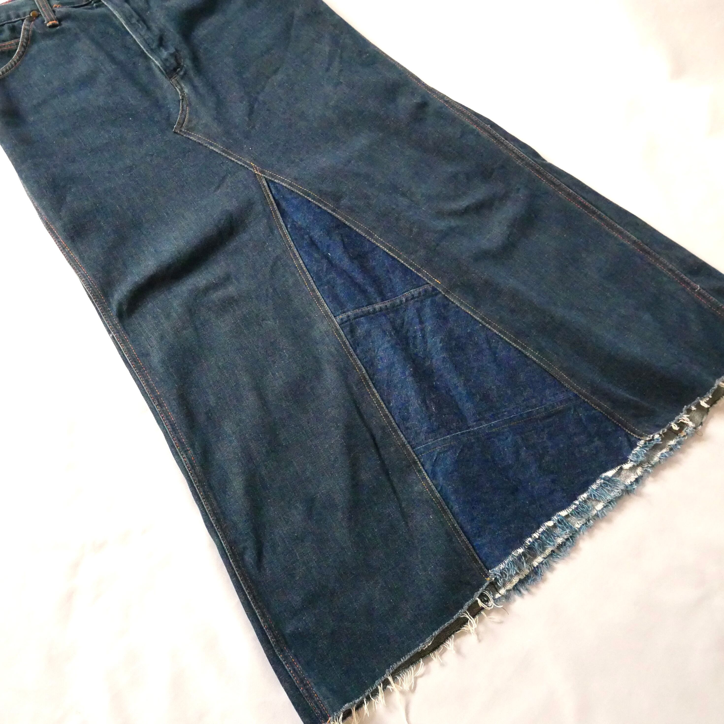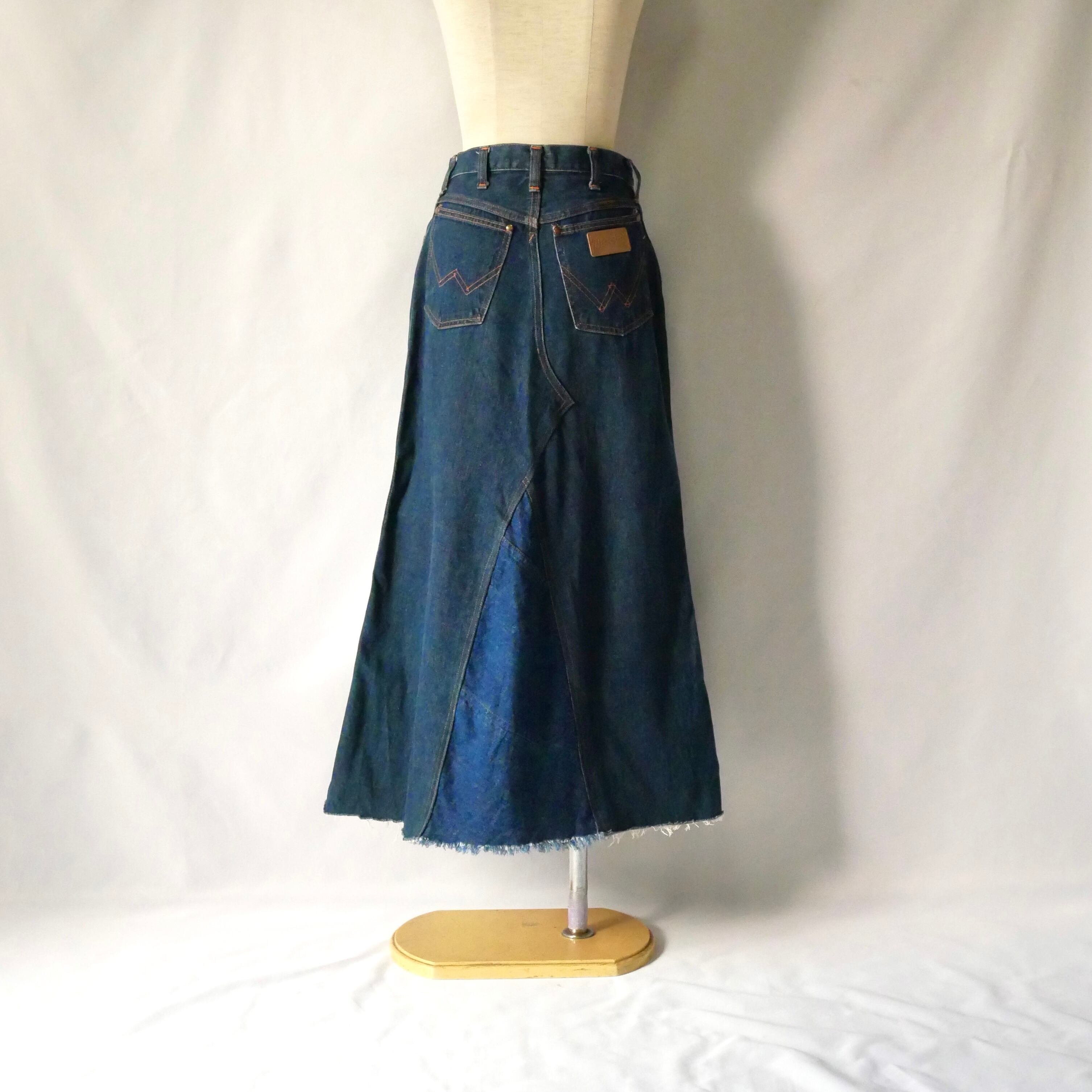 70年代頃のUSA製ラングラーデニムパンツがリメイクされたマキシスカートです。