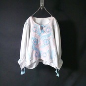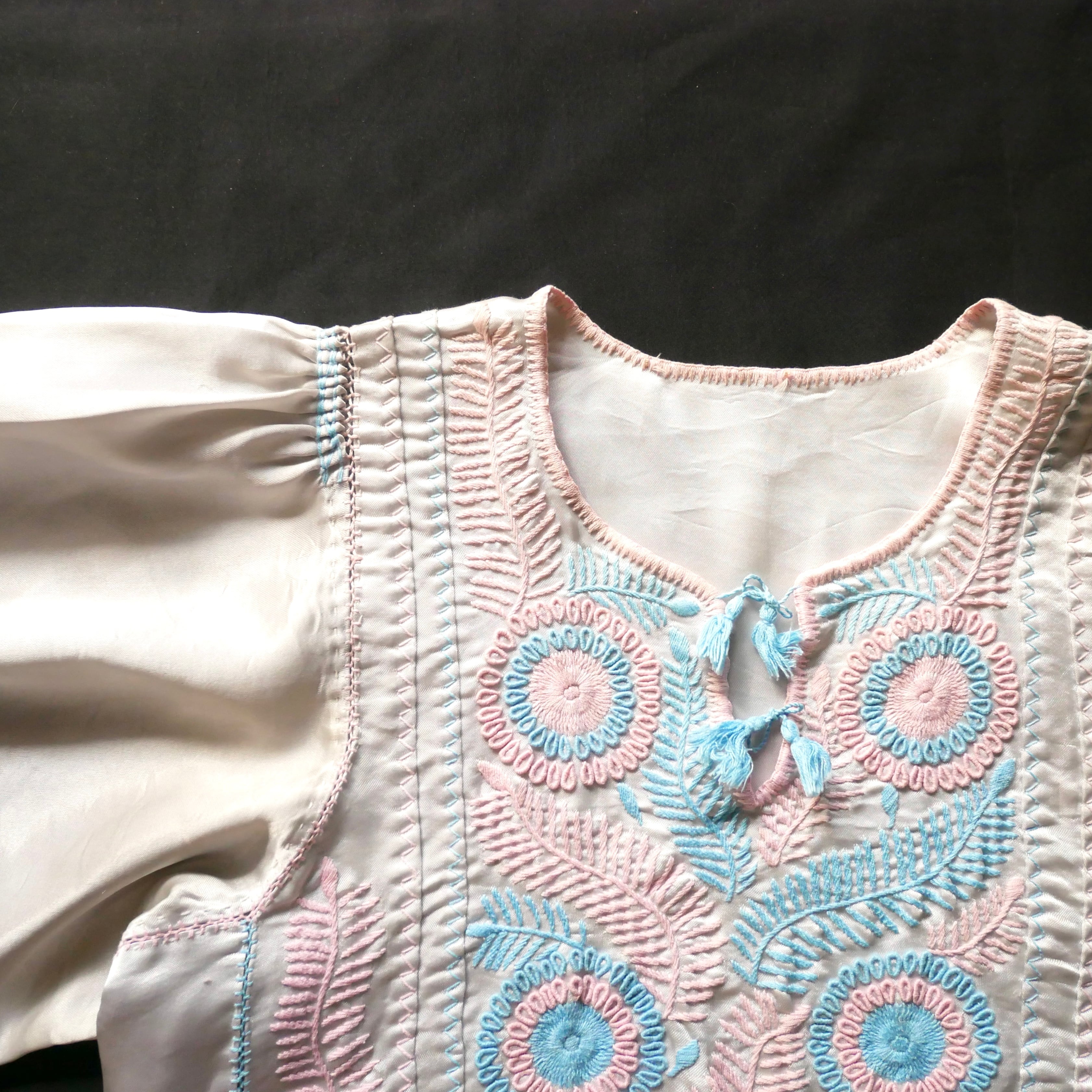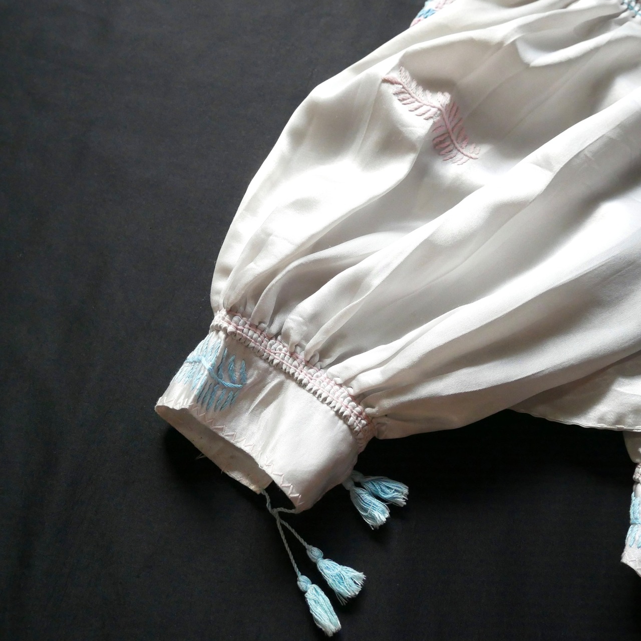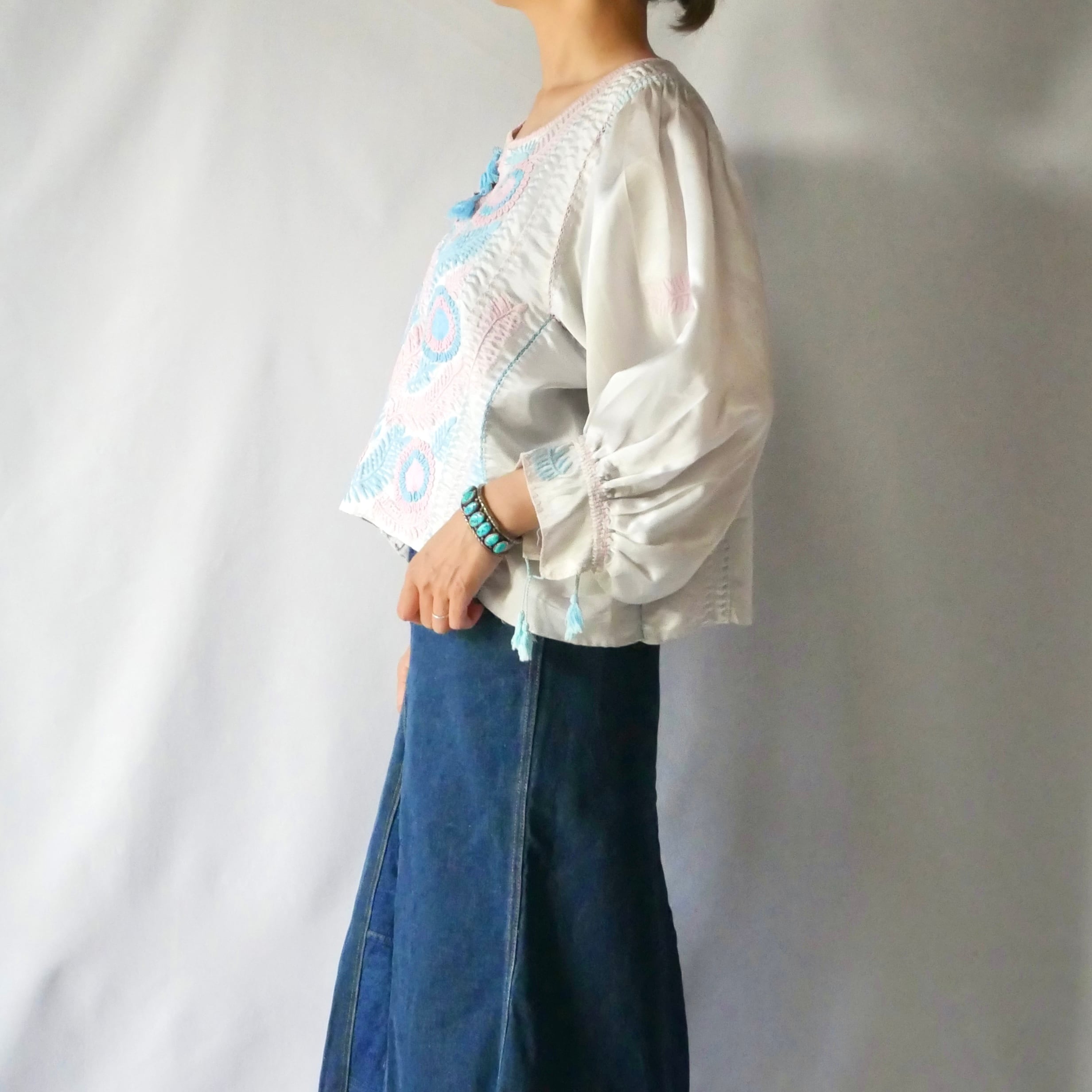 胸元、袖口にもびっしりと入ったパステルカラーの刺繍が可愛いです。