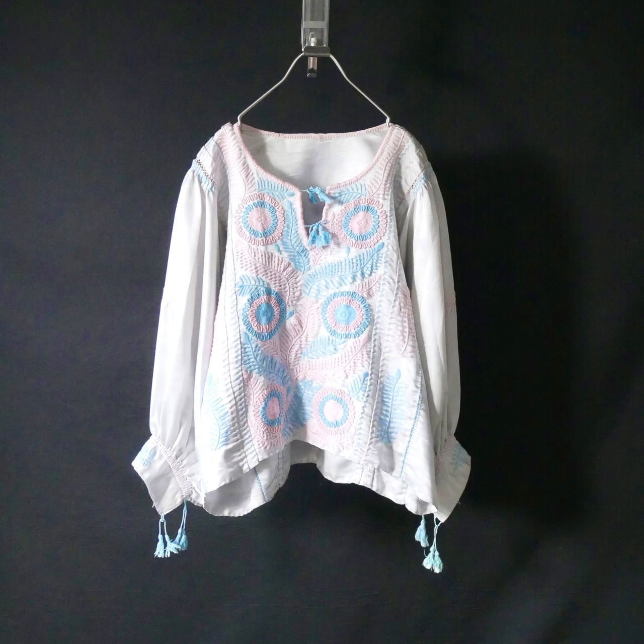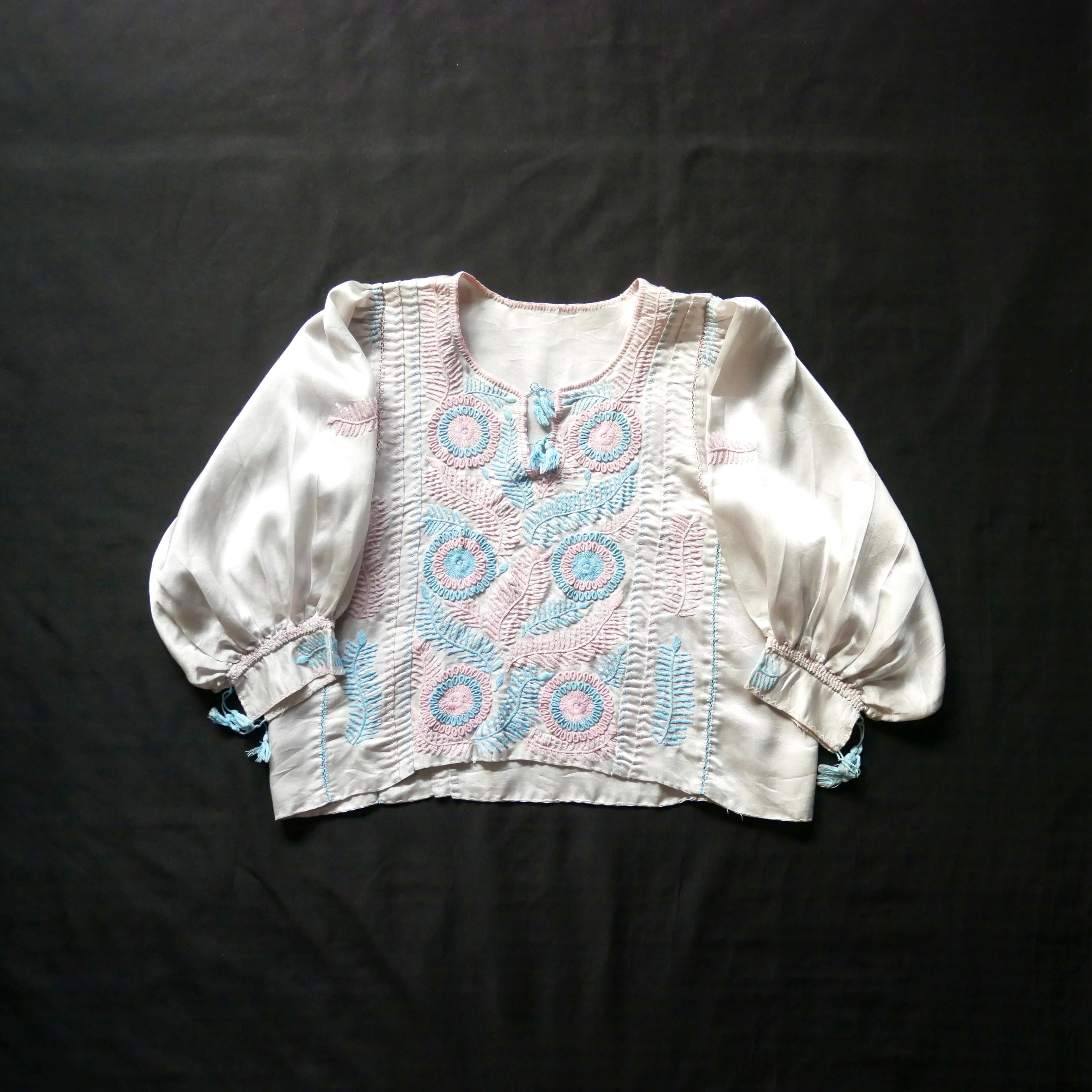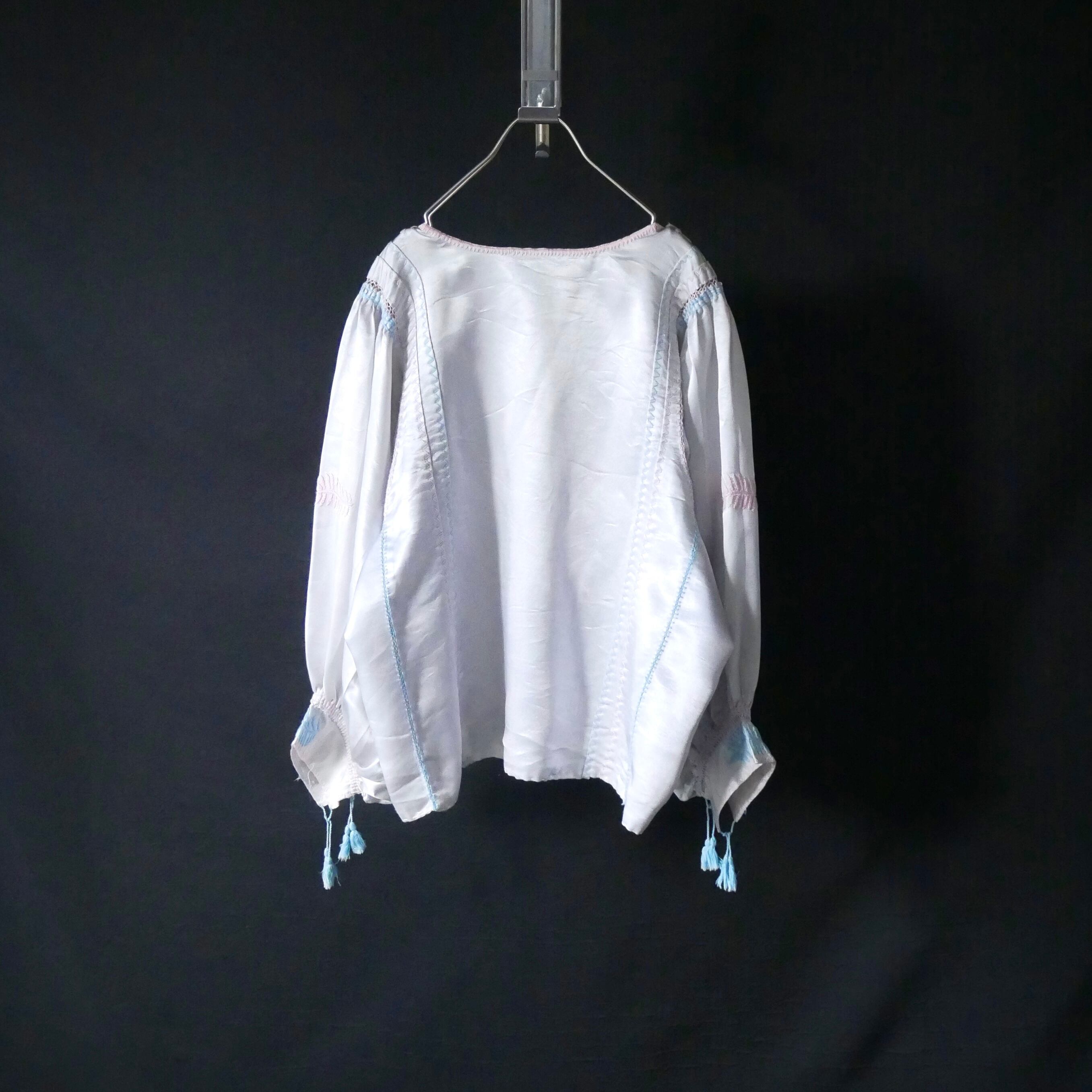 光沢のあるサテンのような生地が珍しいメキシコ刺繍トップスです。