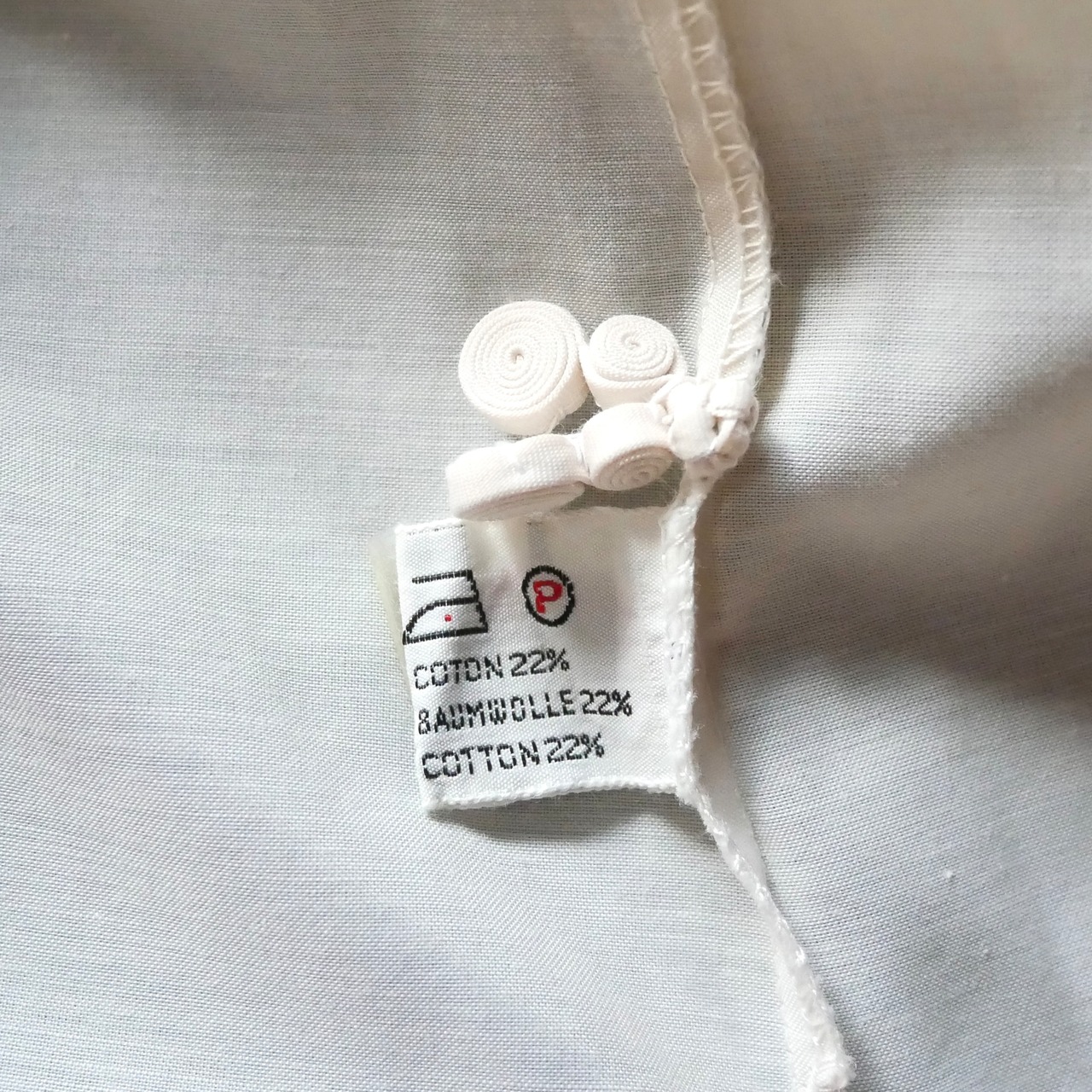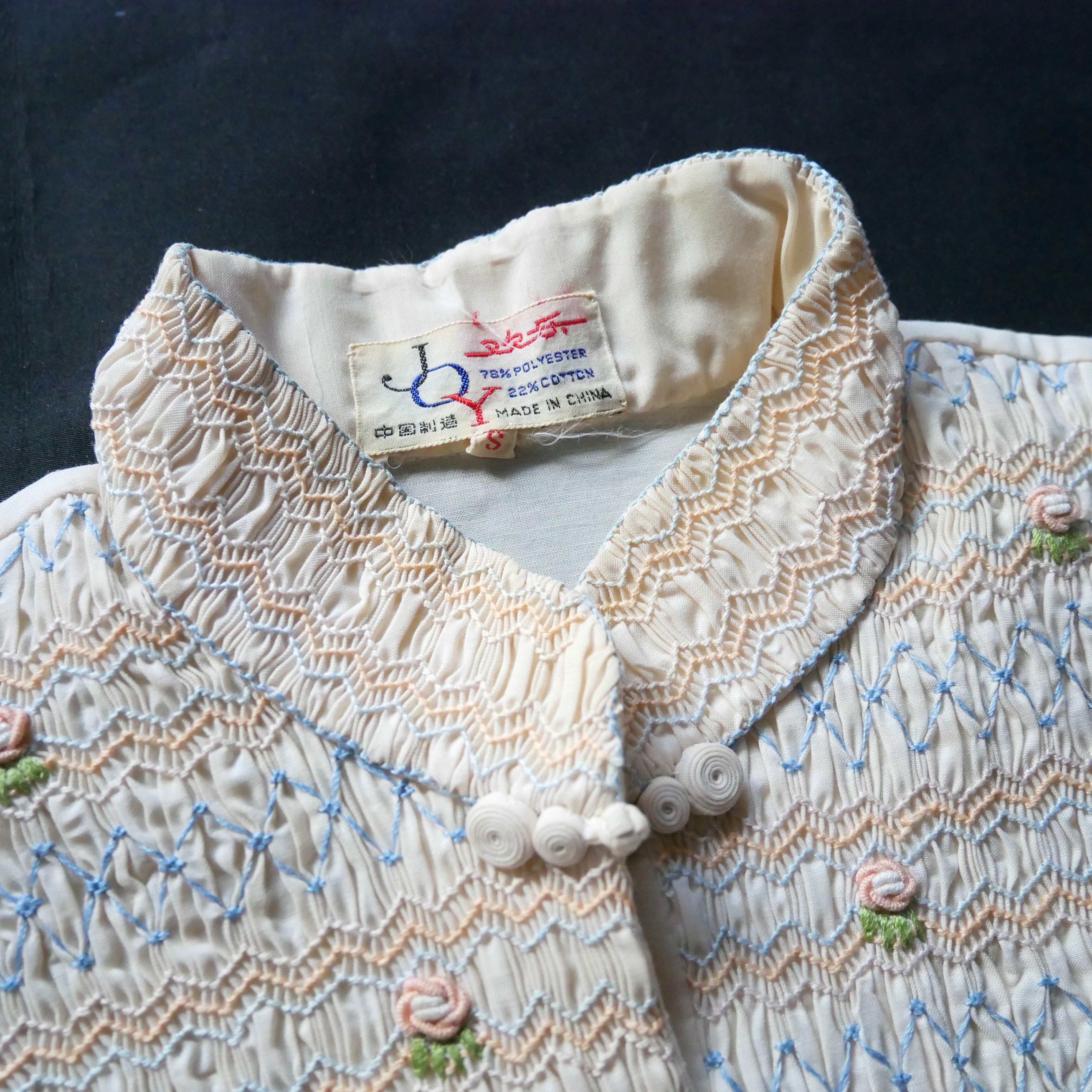 胸元やカフスにびっしりと入ったシャーリングとお花の刺繍が可愛いヴィンテージチャイナシャツです。