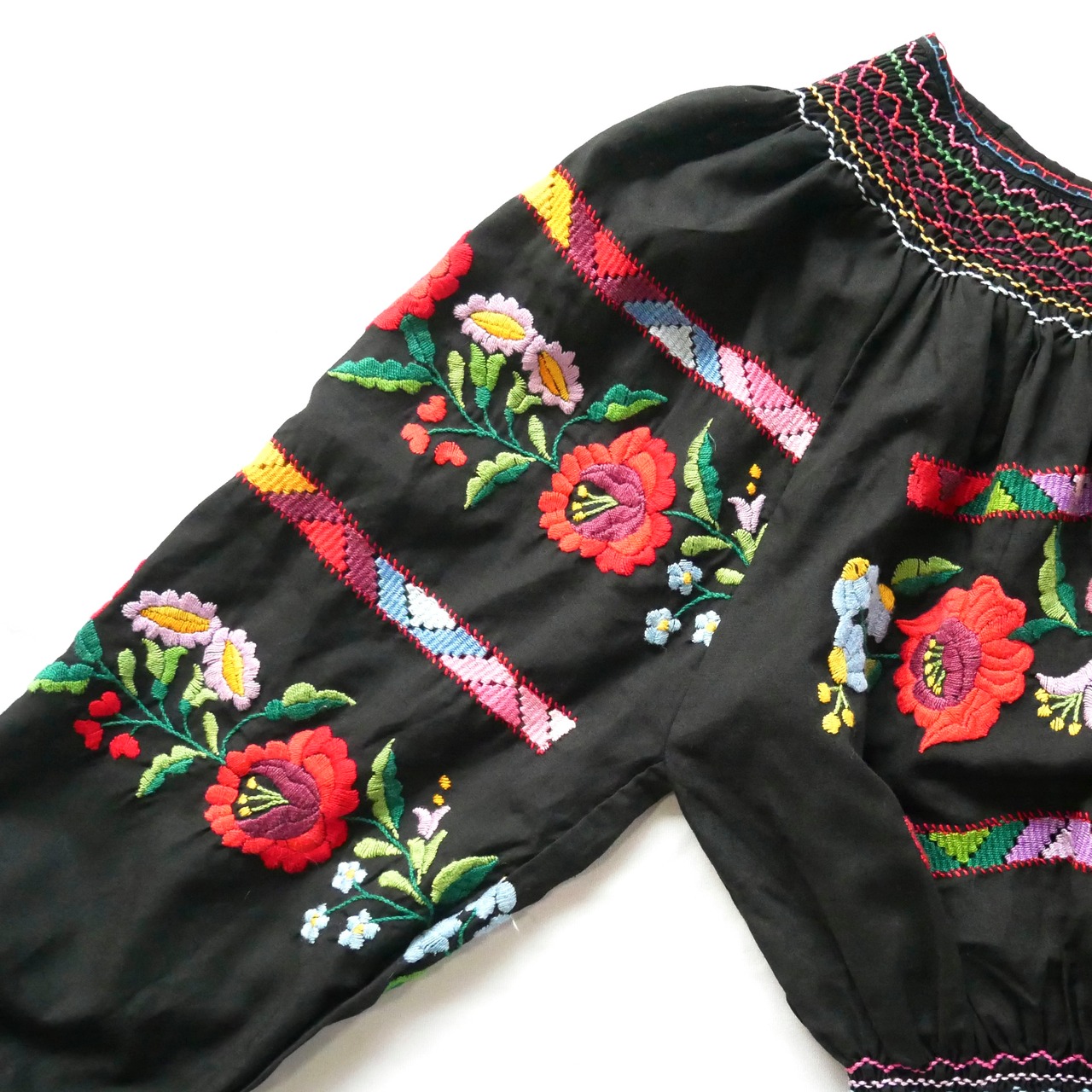 Euro vintage black embroidery tops ユーロヴィンテージ 黒 お花刺繍 シャーリングトップス