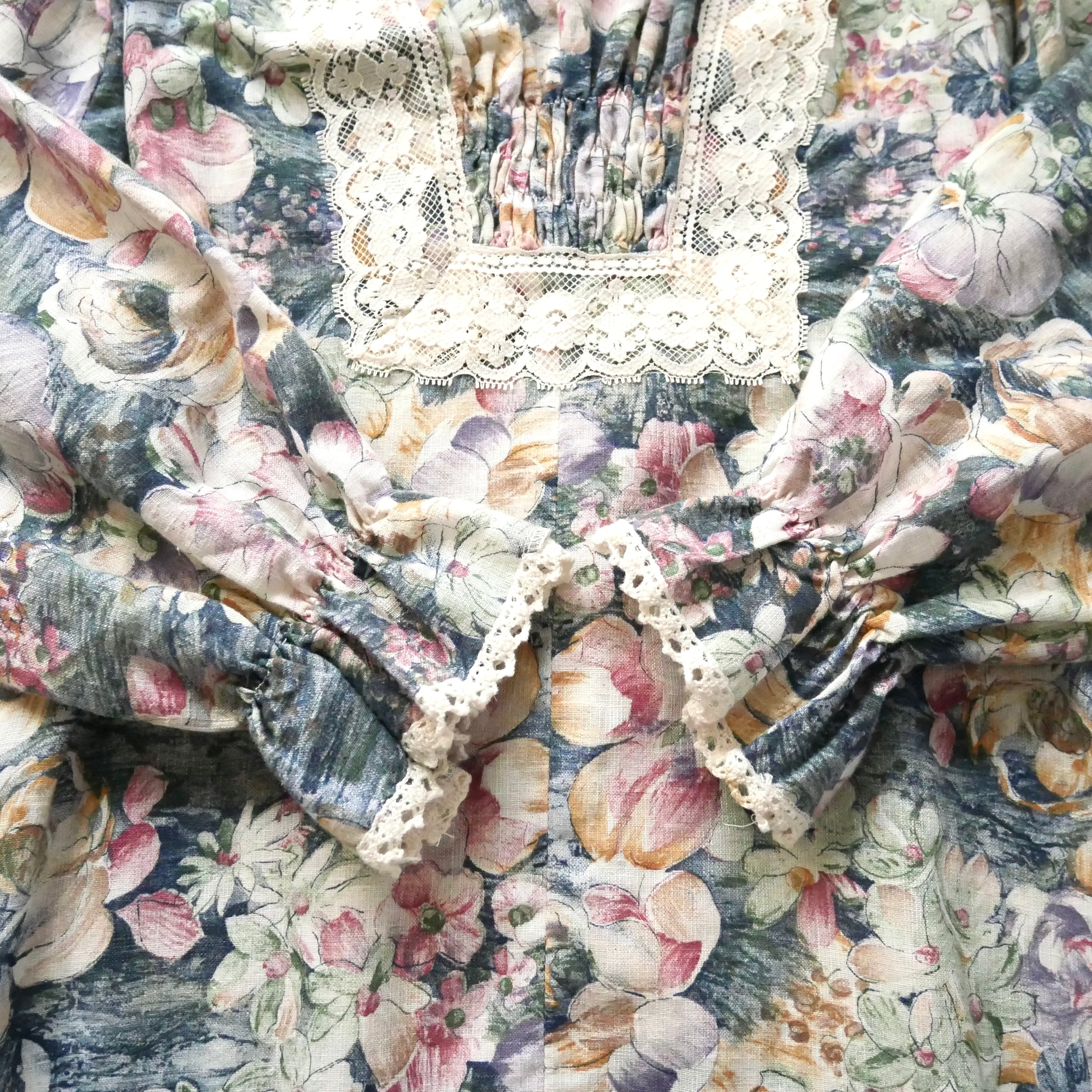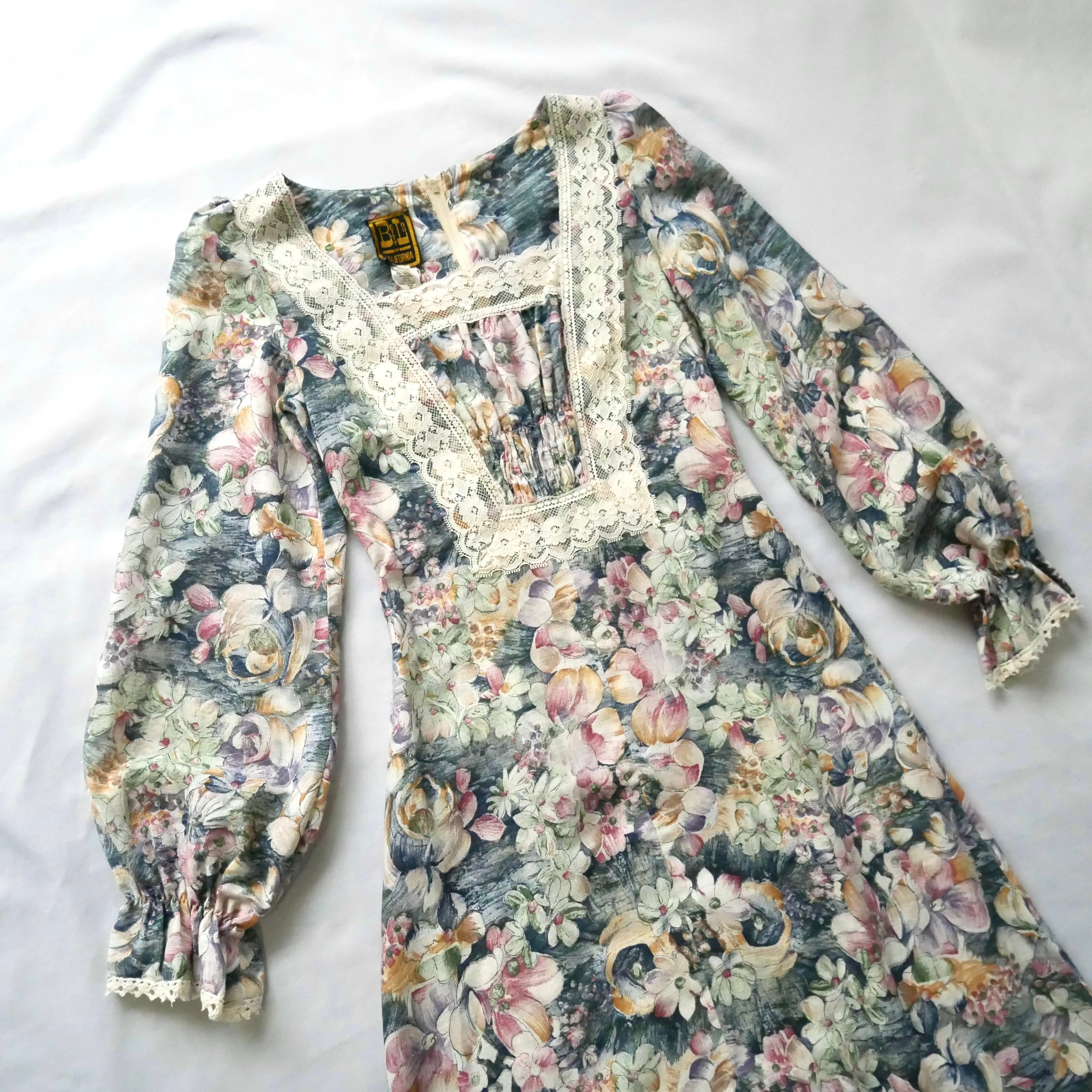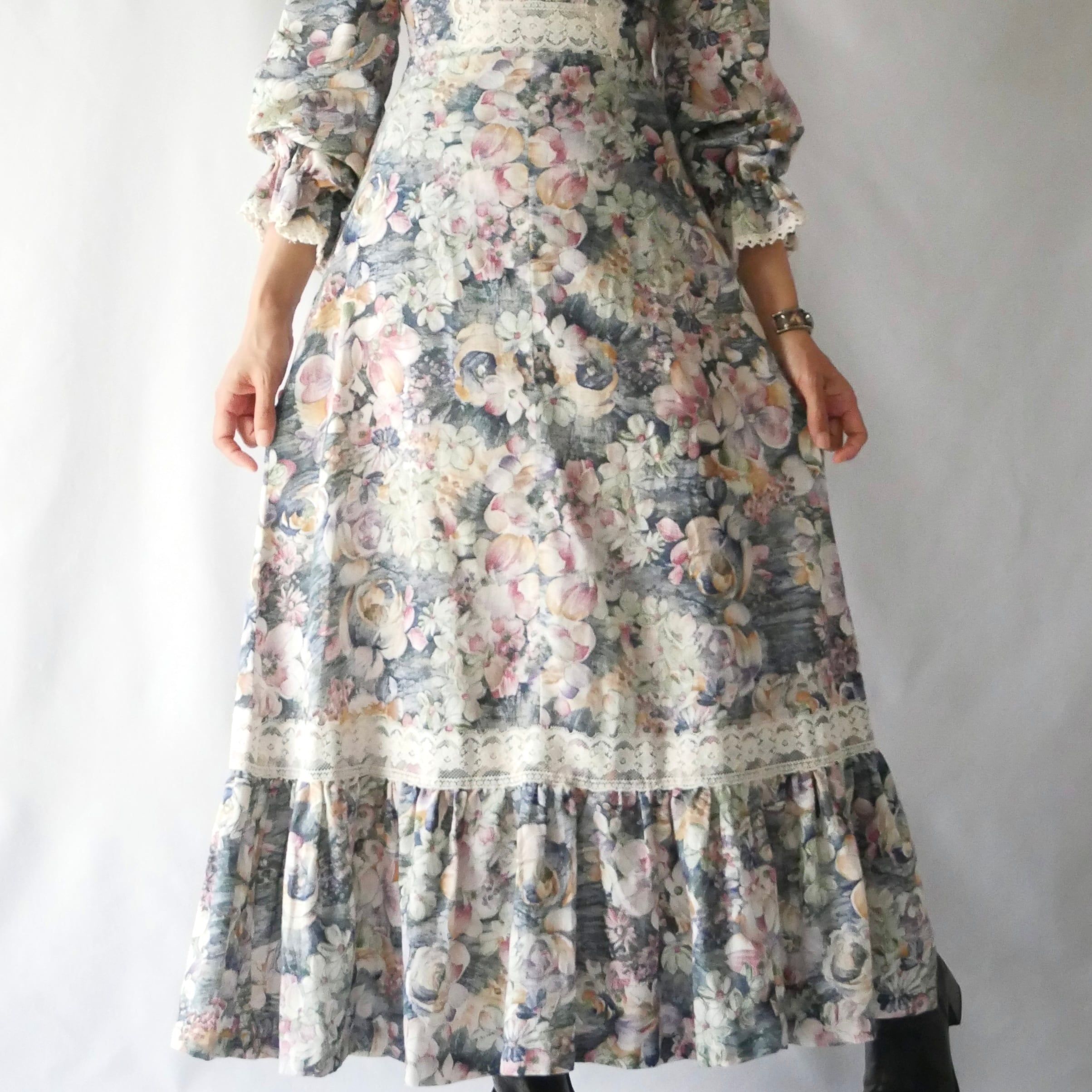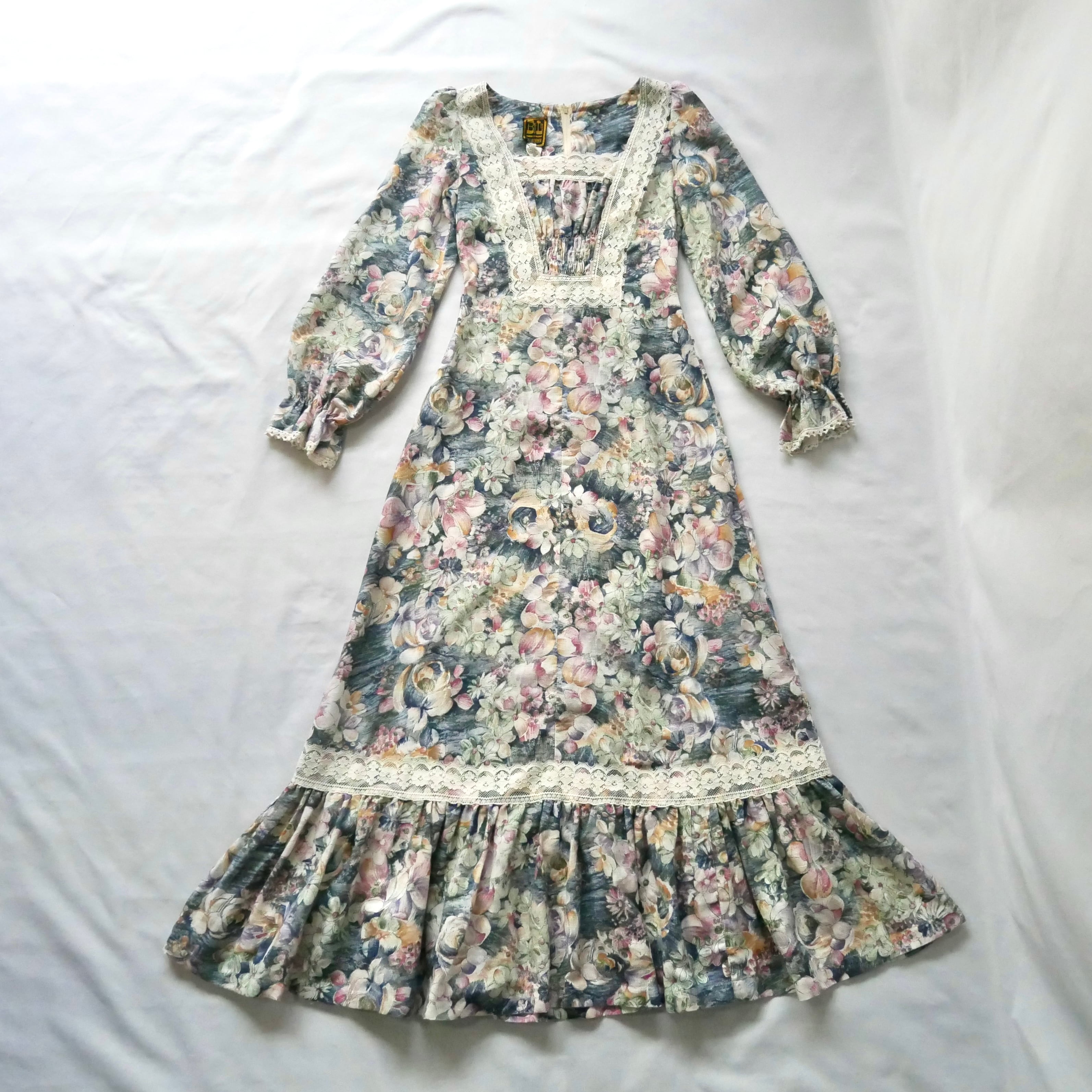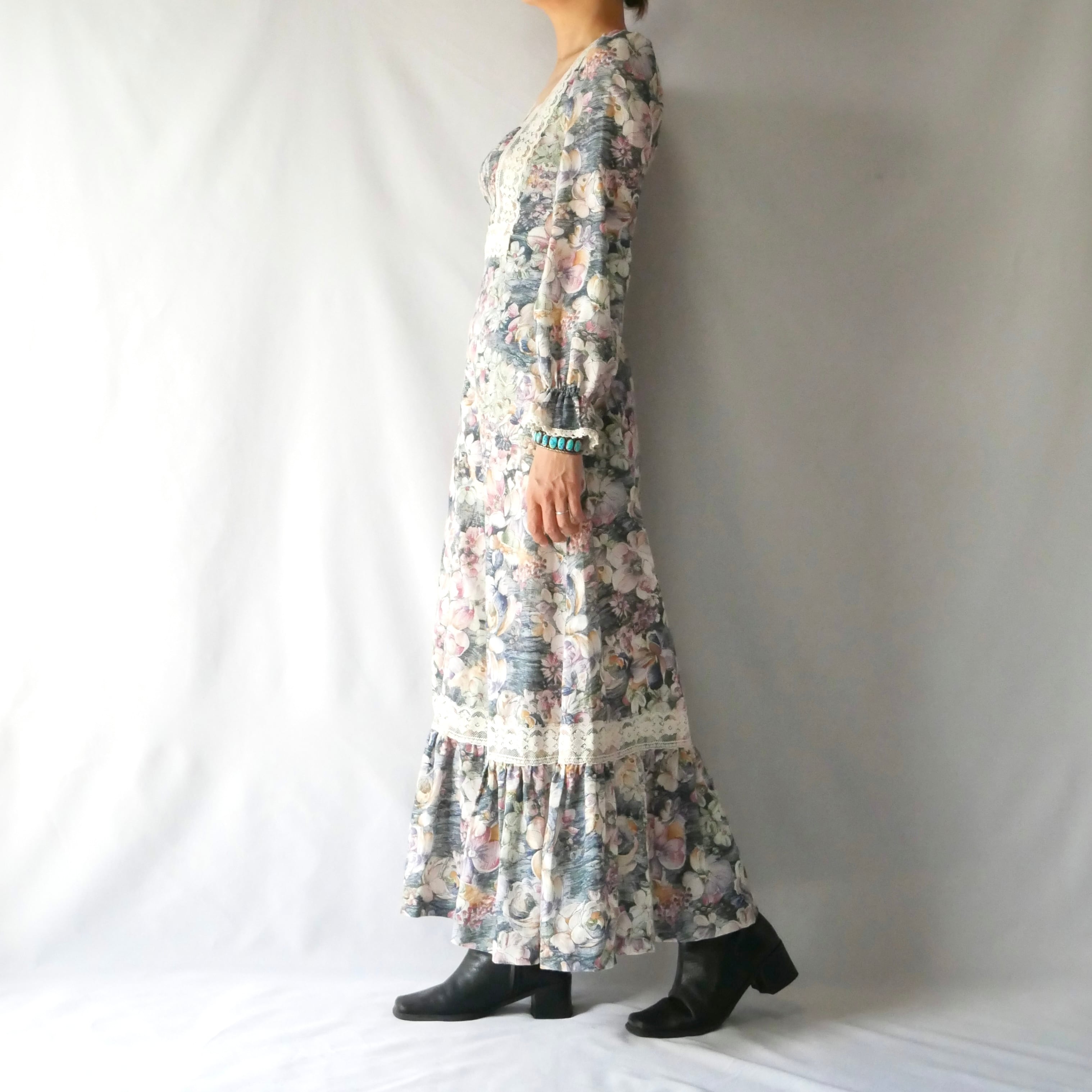 水彩画のような花柄が素敵な70年代ヴィンテージマキシドレスです。