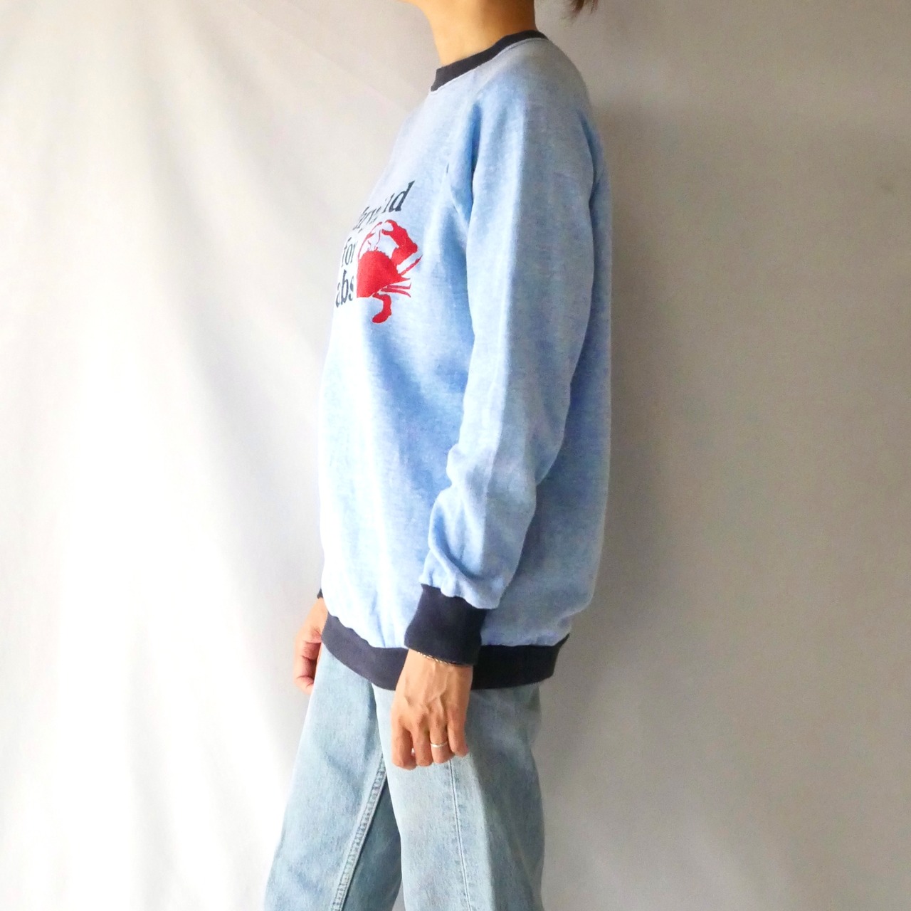 Made in USA 80s vintage crab print blue trim sweat アメリカ製 90年代 ブルー リンガー カニ プリント スウェット