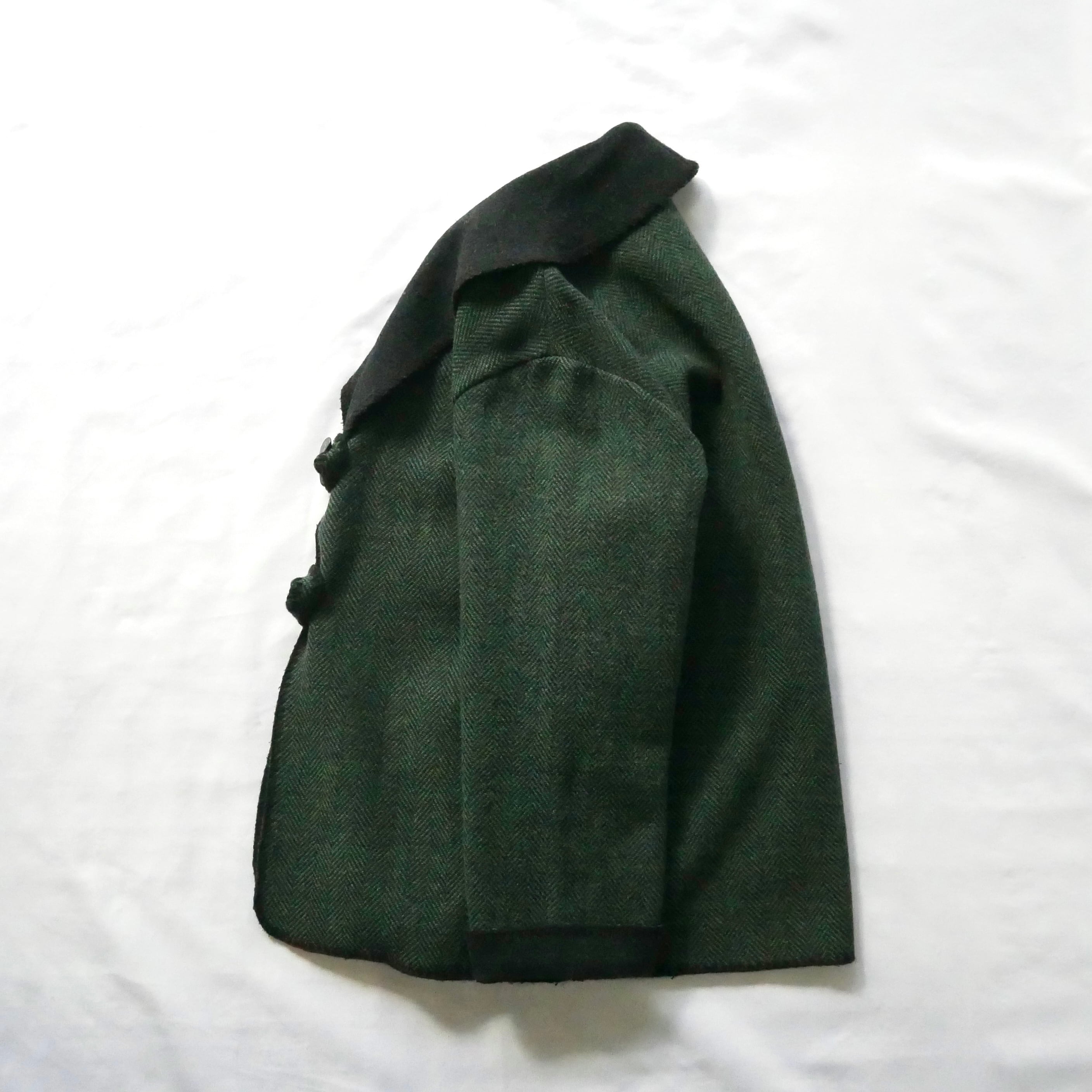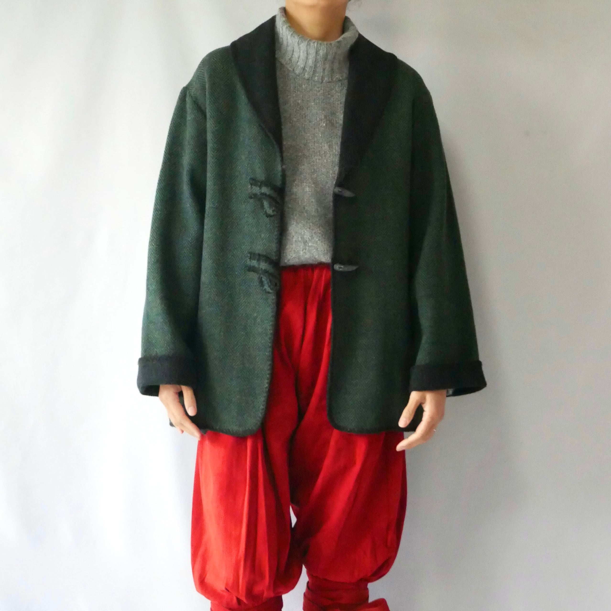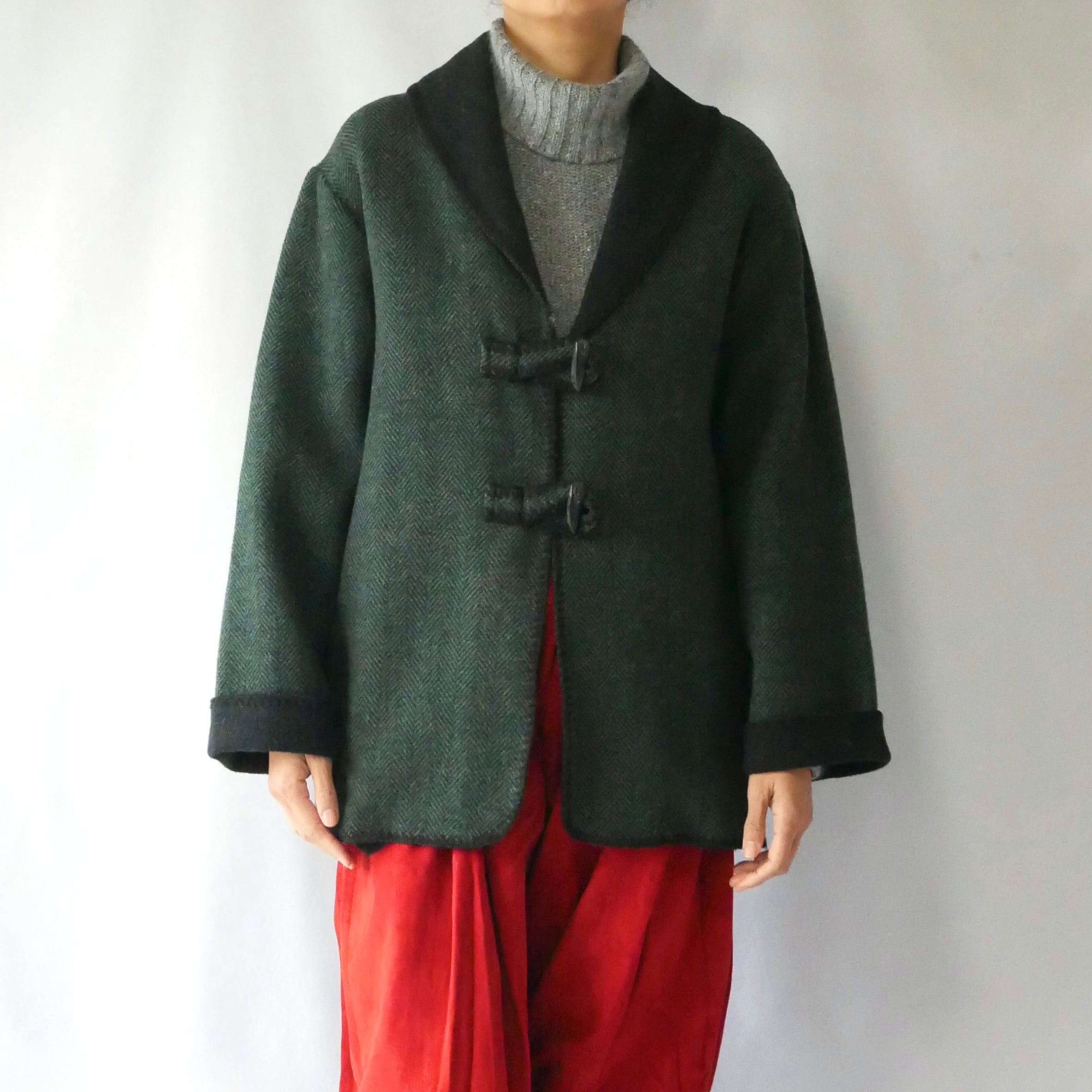 深いグリーンのヘリンボーンにショールカラーとトグルボタンが上品で素敵です。