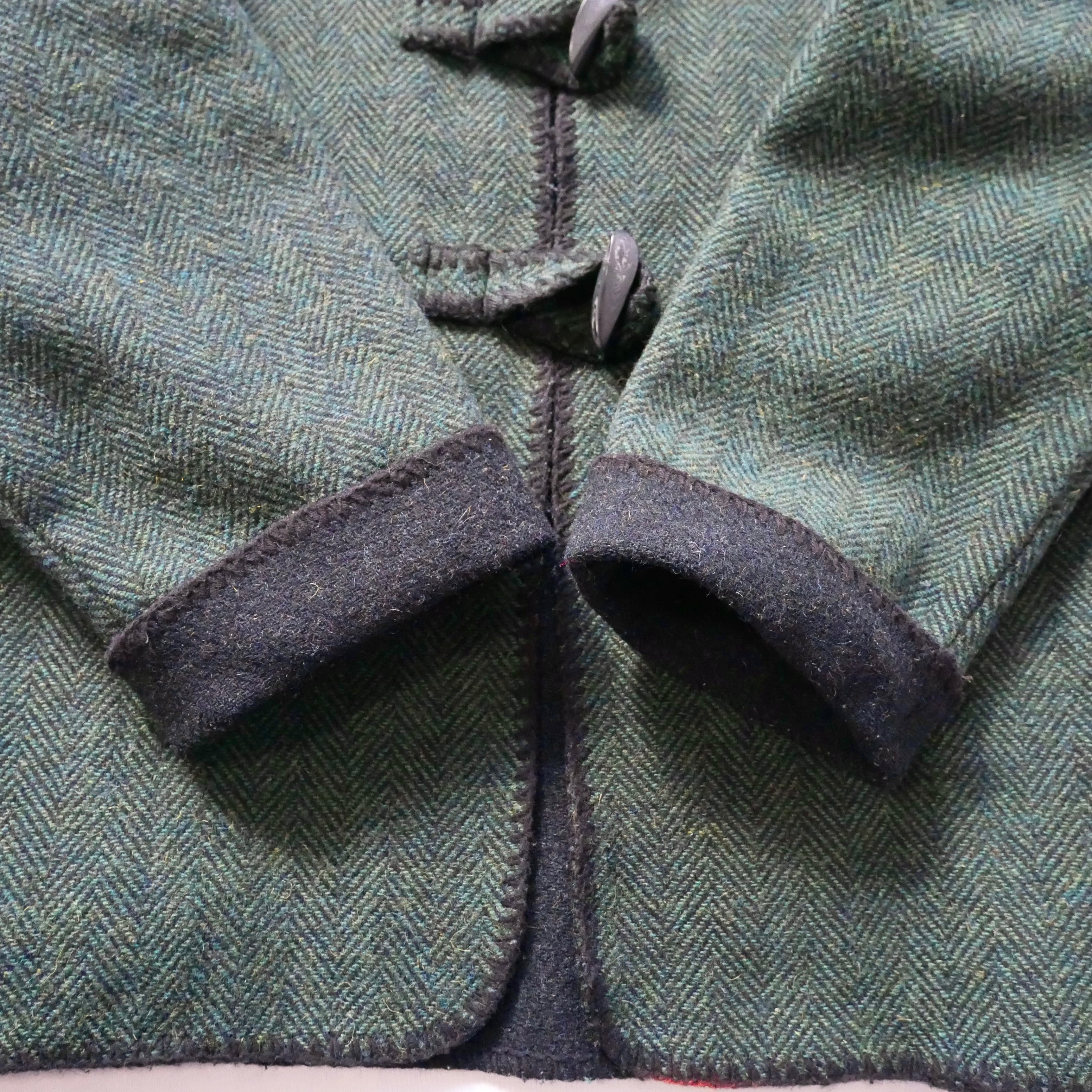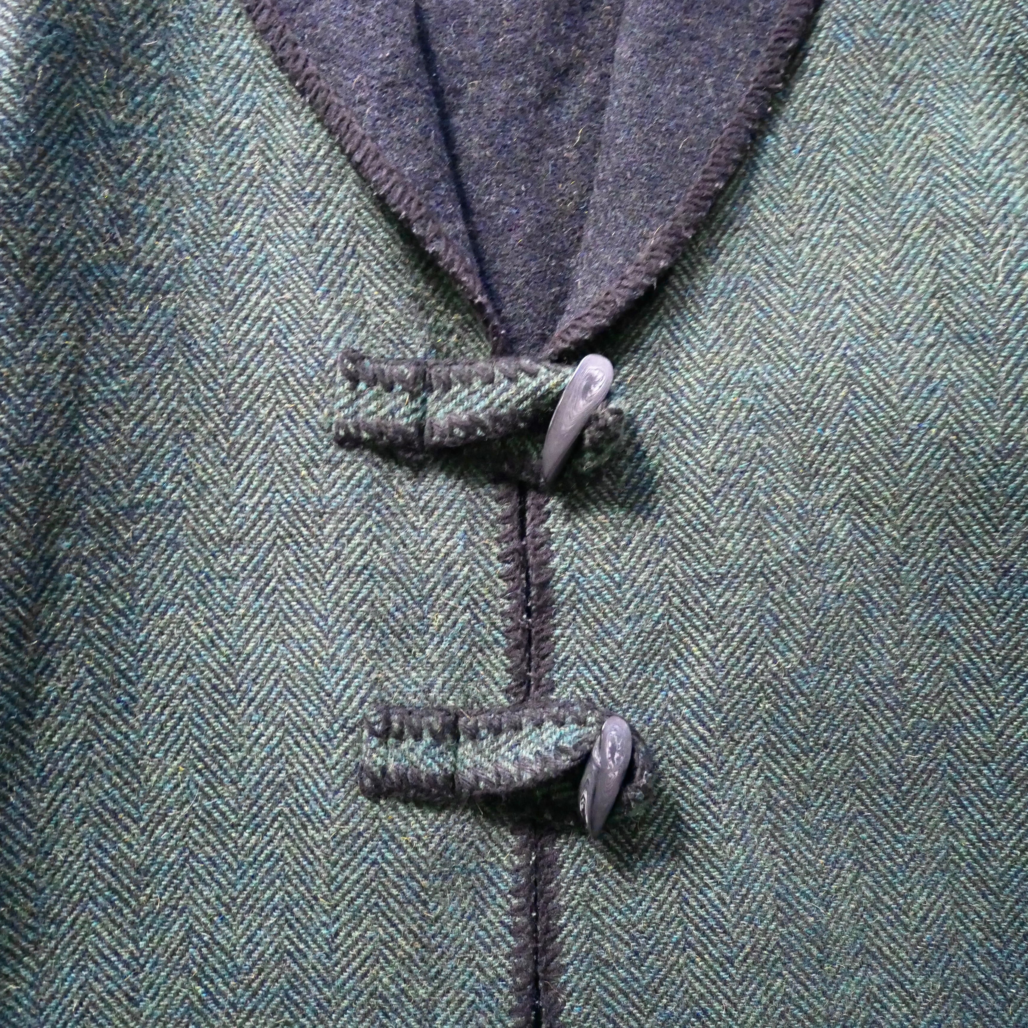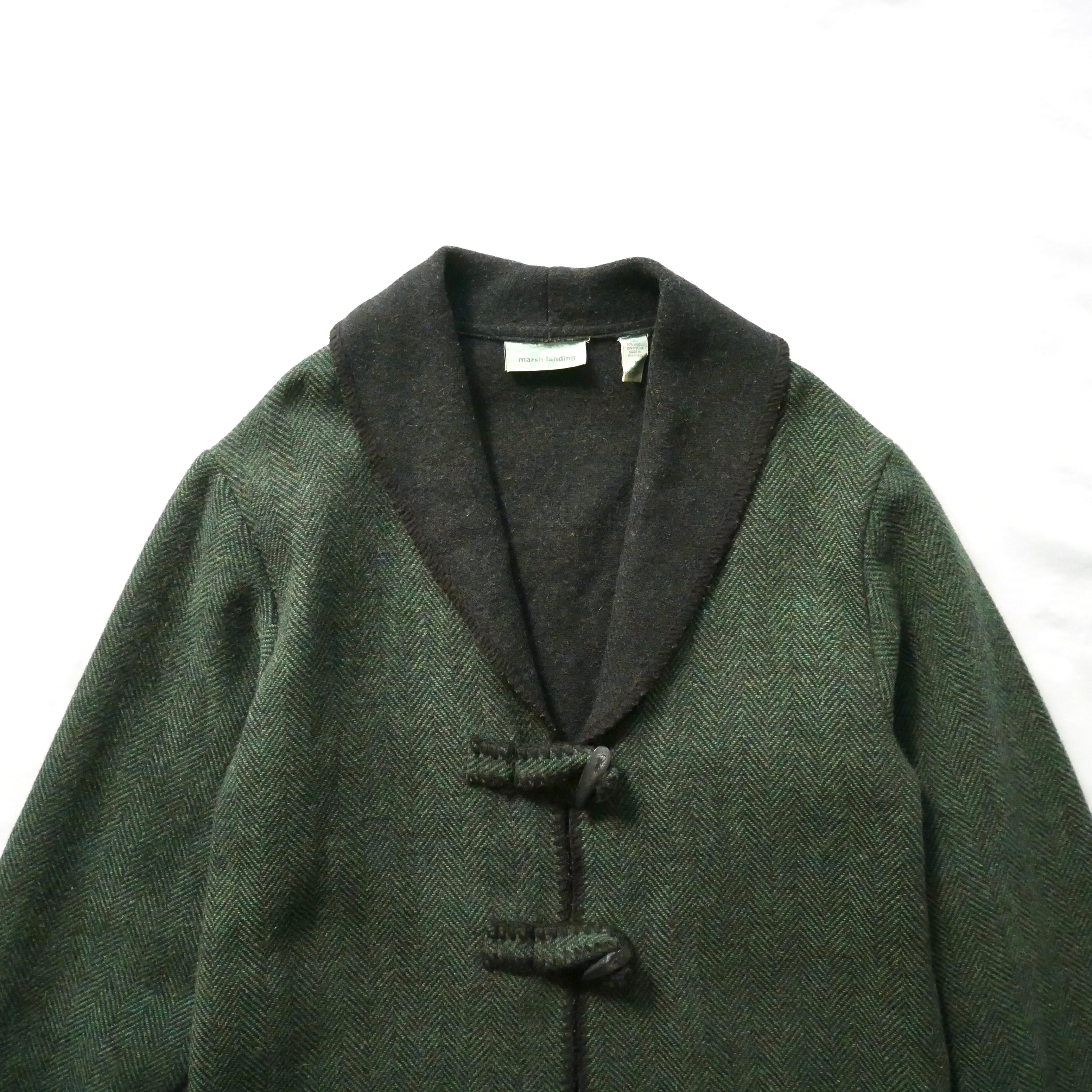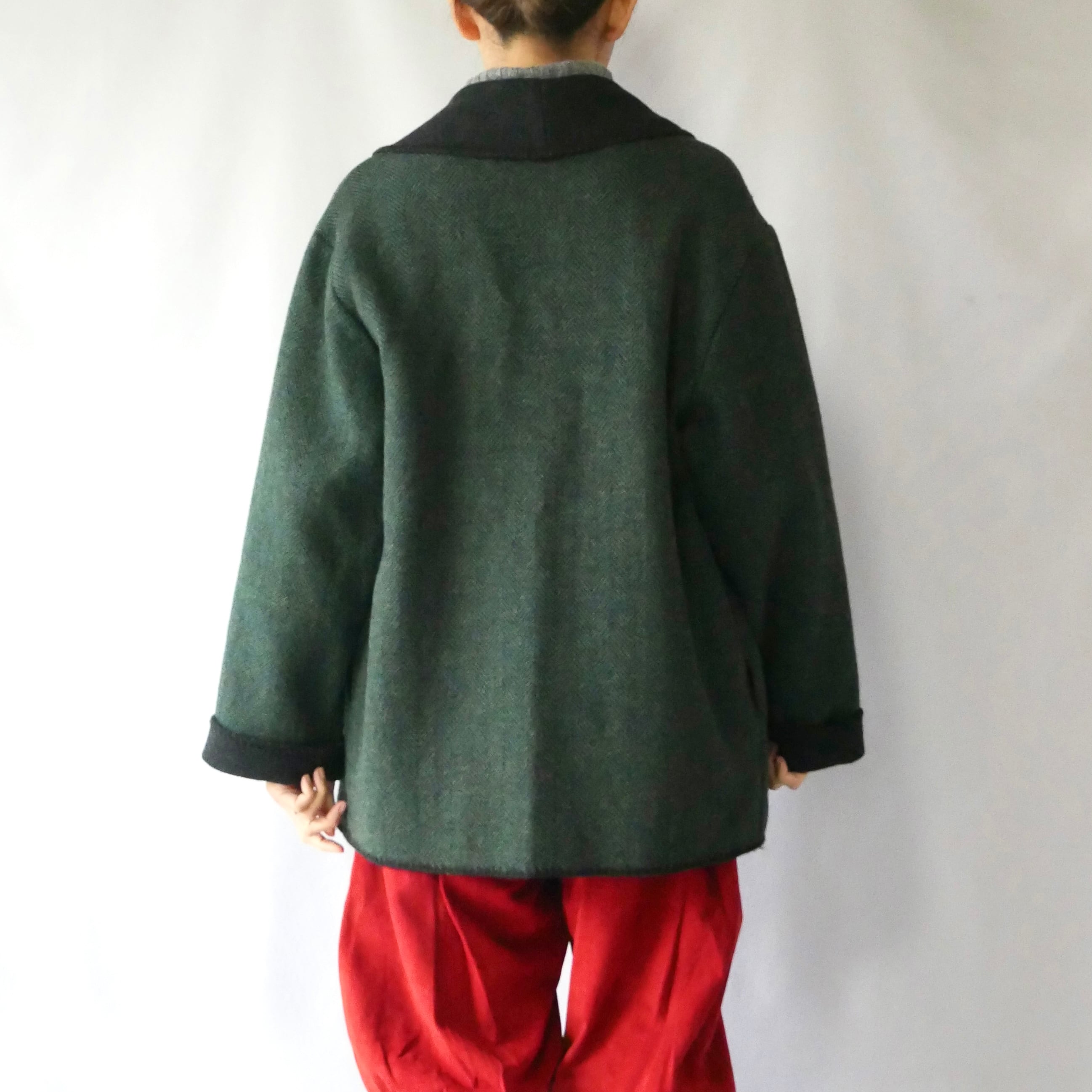 深いグリーンのヘリンボーンにショールカラーとトグルボタンが上品で素敵です。