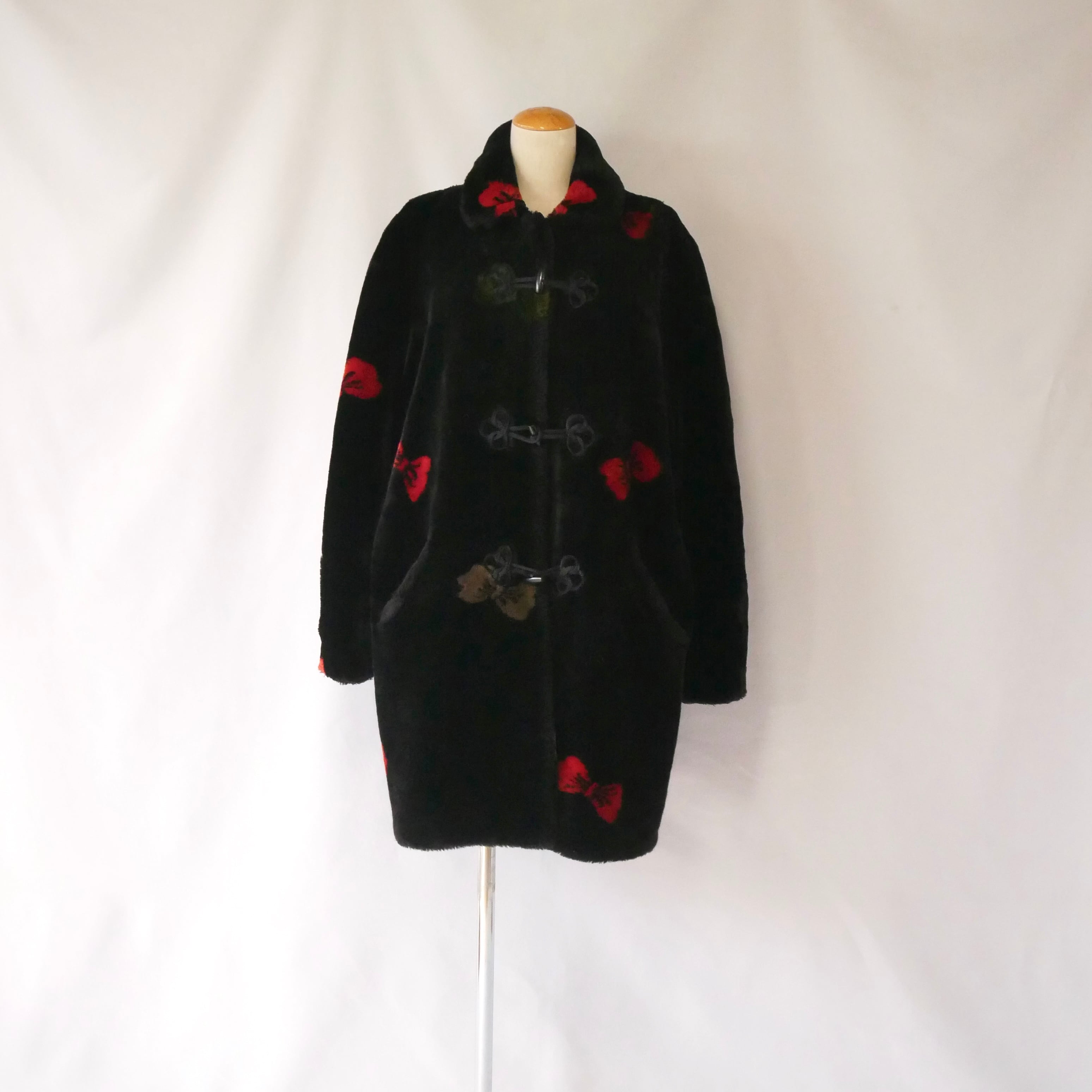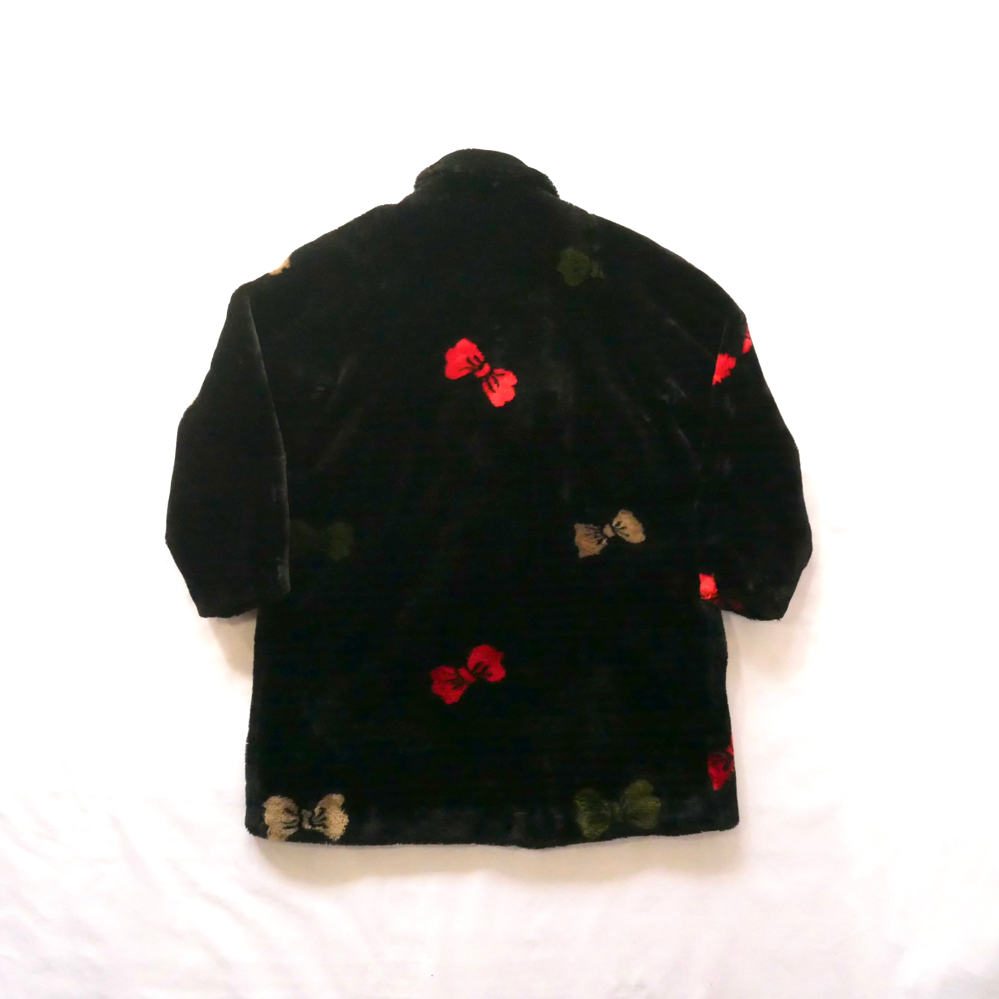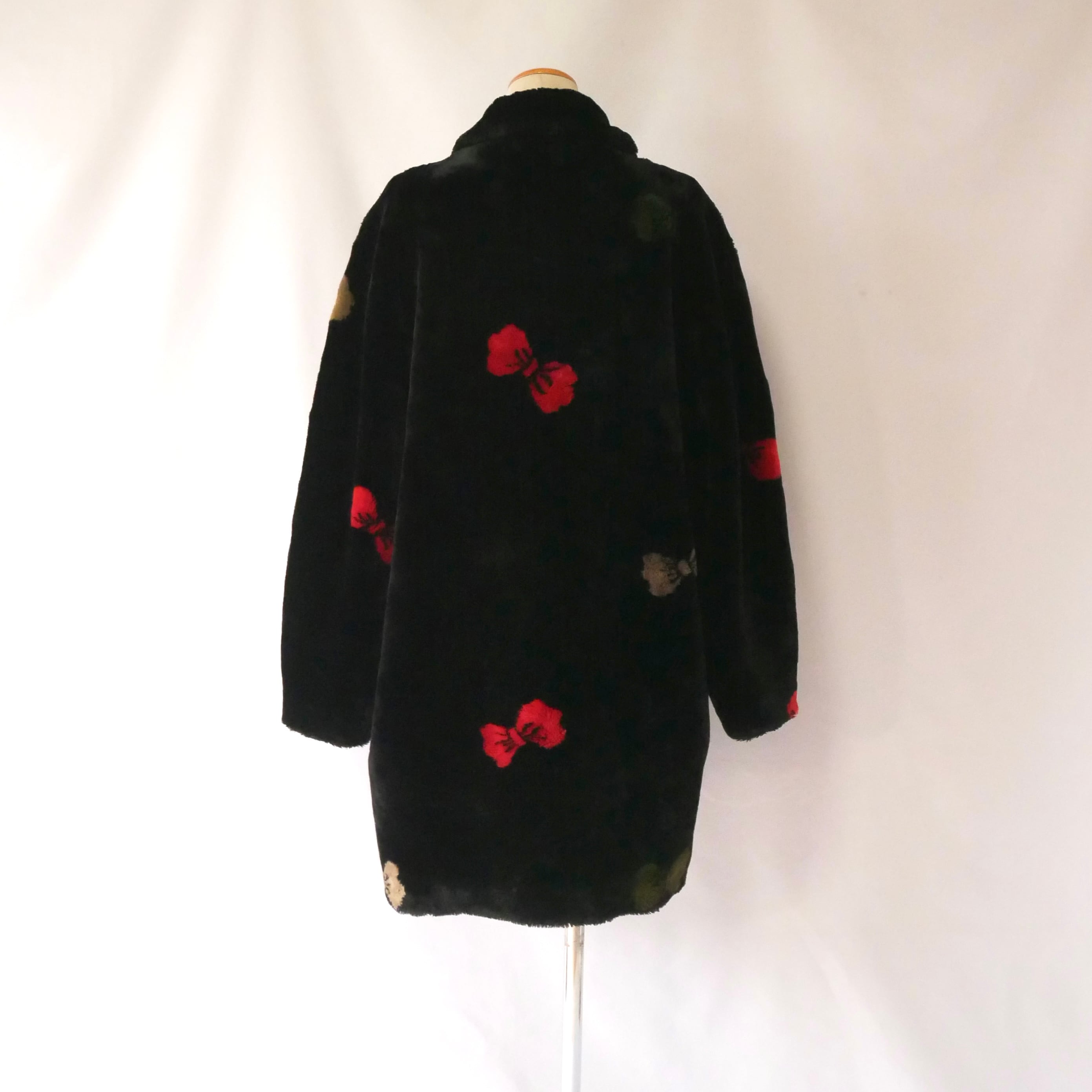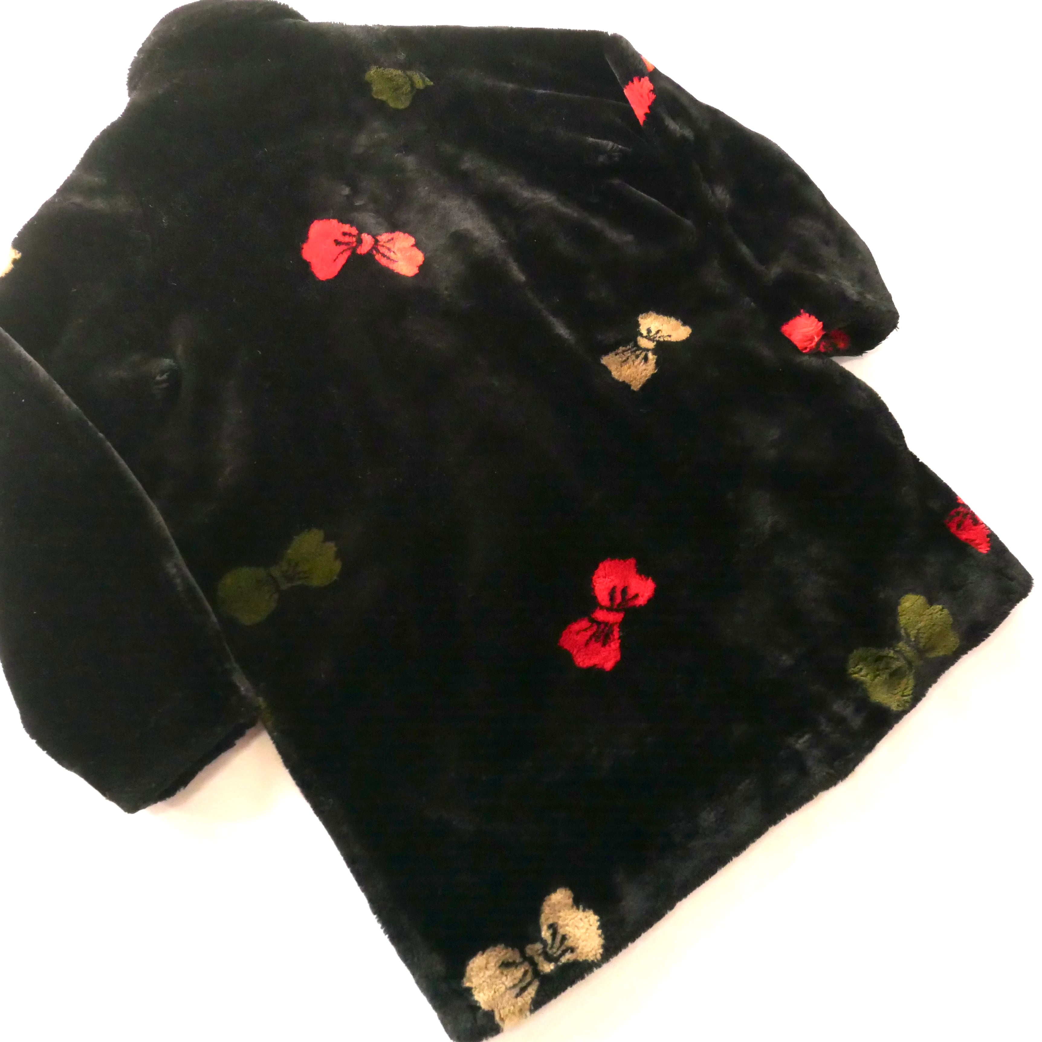 70-80s vintage madein France black ribbon fakefur jacket ヴィンテージ フランス製 黒 リボン総柄 フェイクファー ジャケット