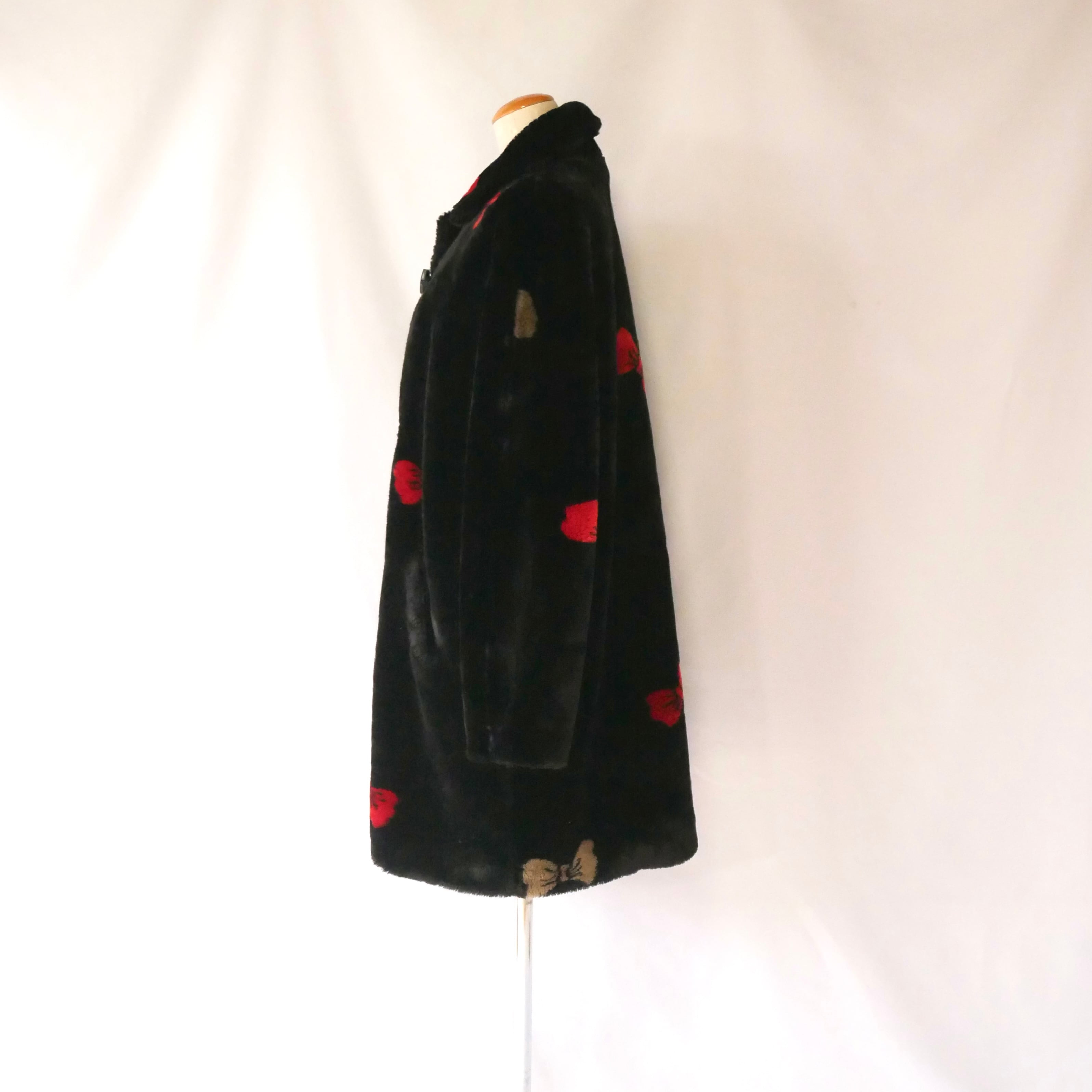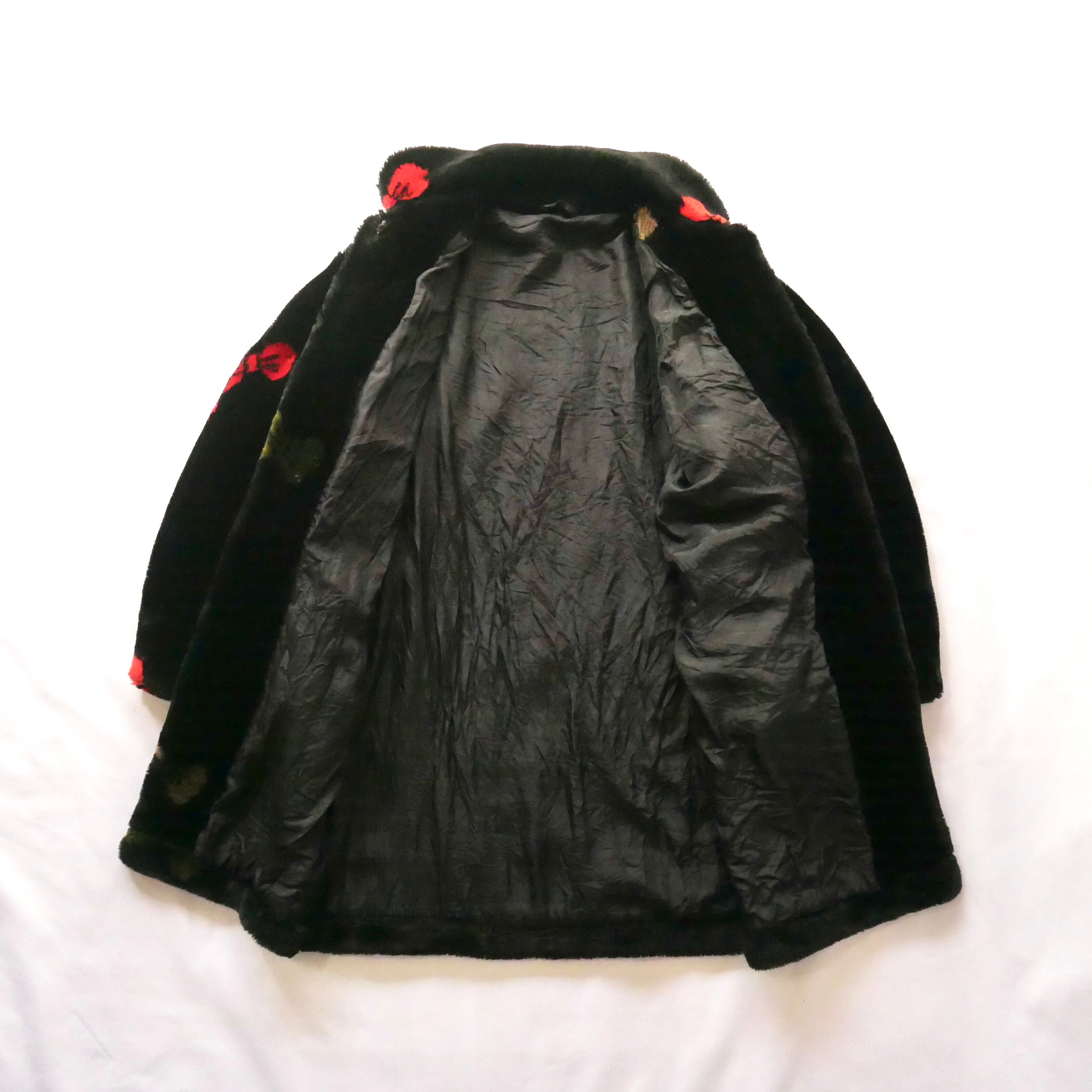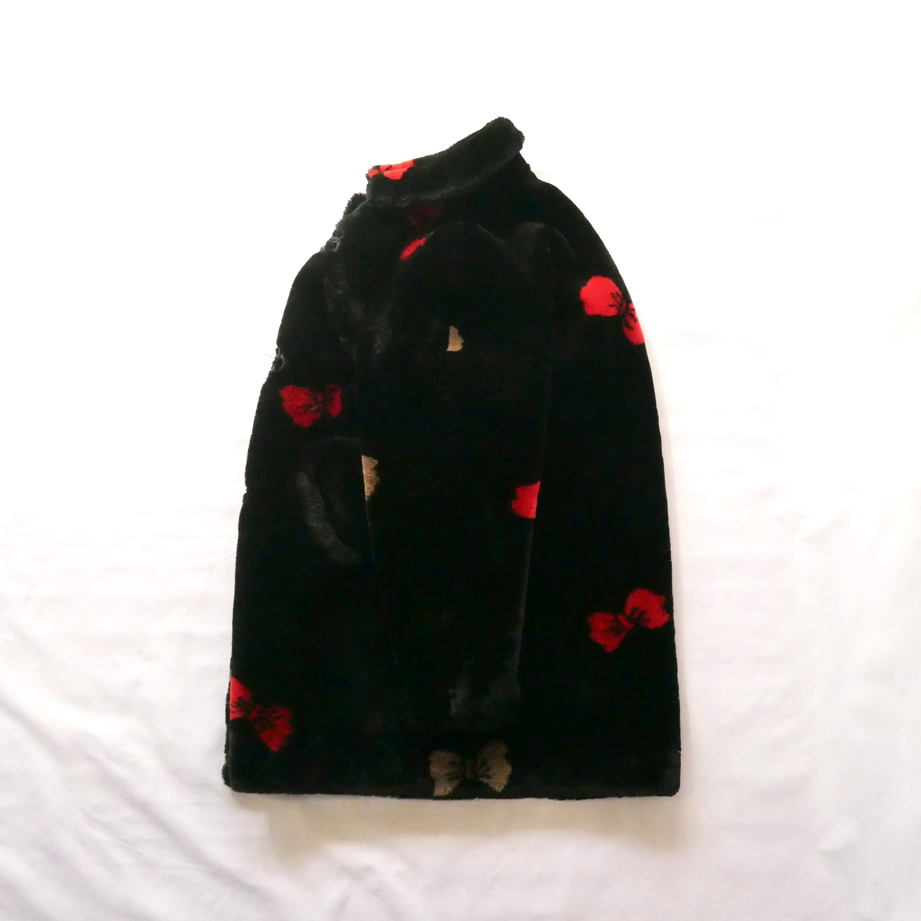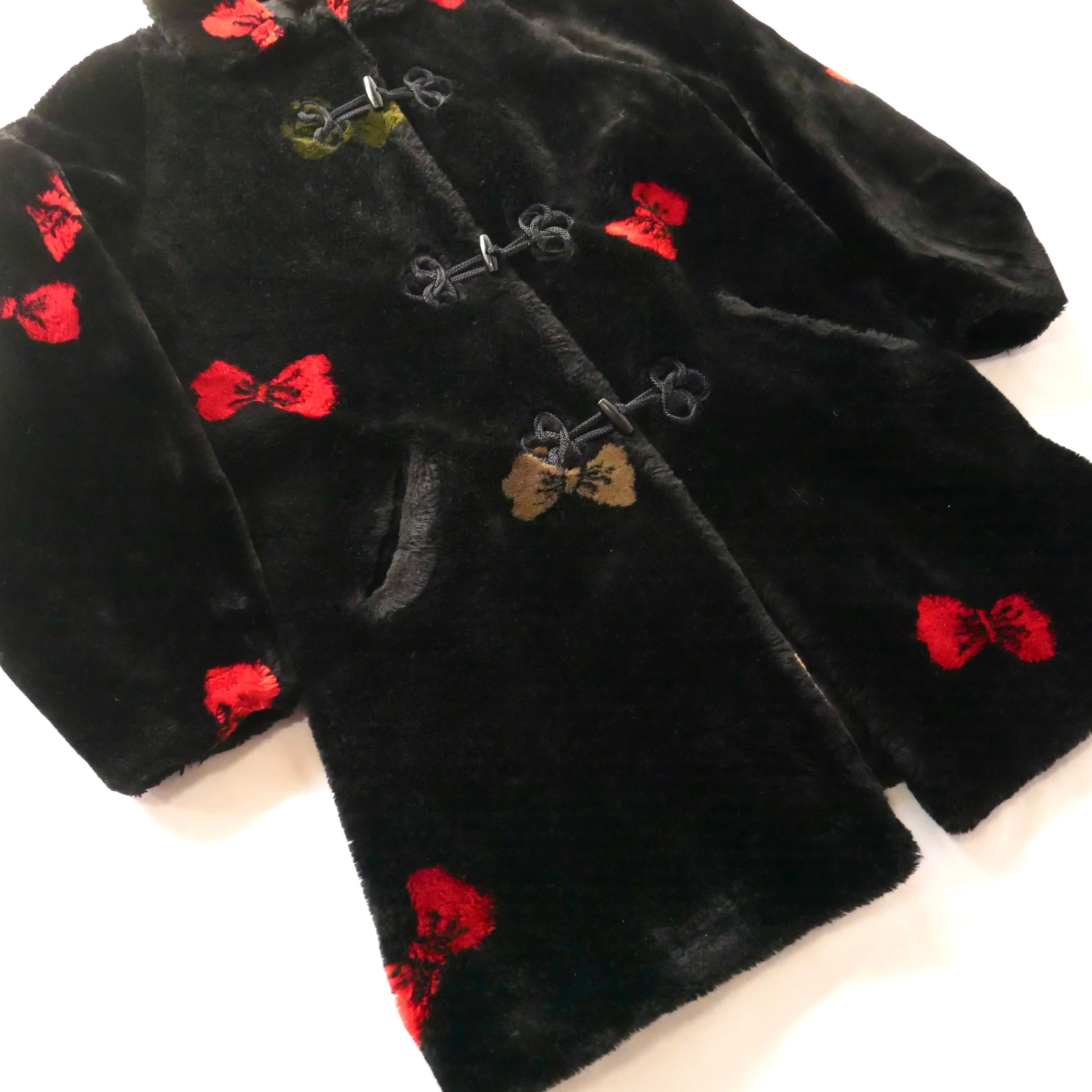 70-80s vintage madein France black ribbon fakefur jacket ヴィンテージ フランス製 黒 リボン総柄 フェイクファー ジャケット