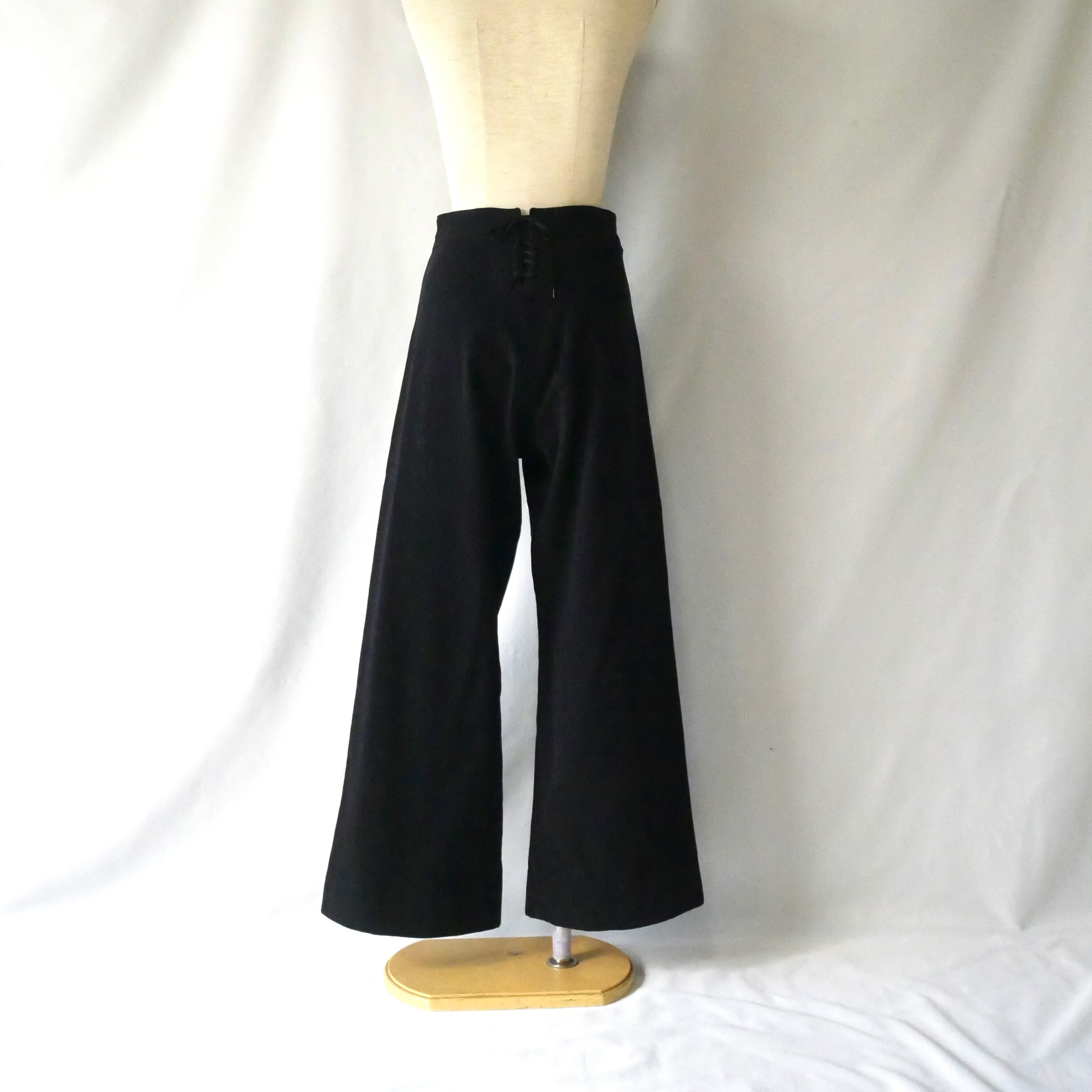 ハイウエストなバックはレースアップ、独特なワイドシルエット。