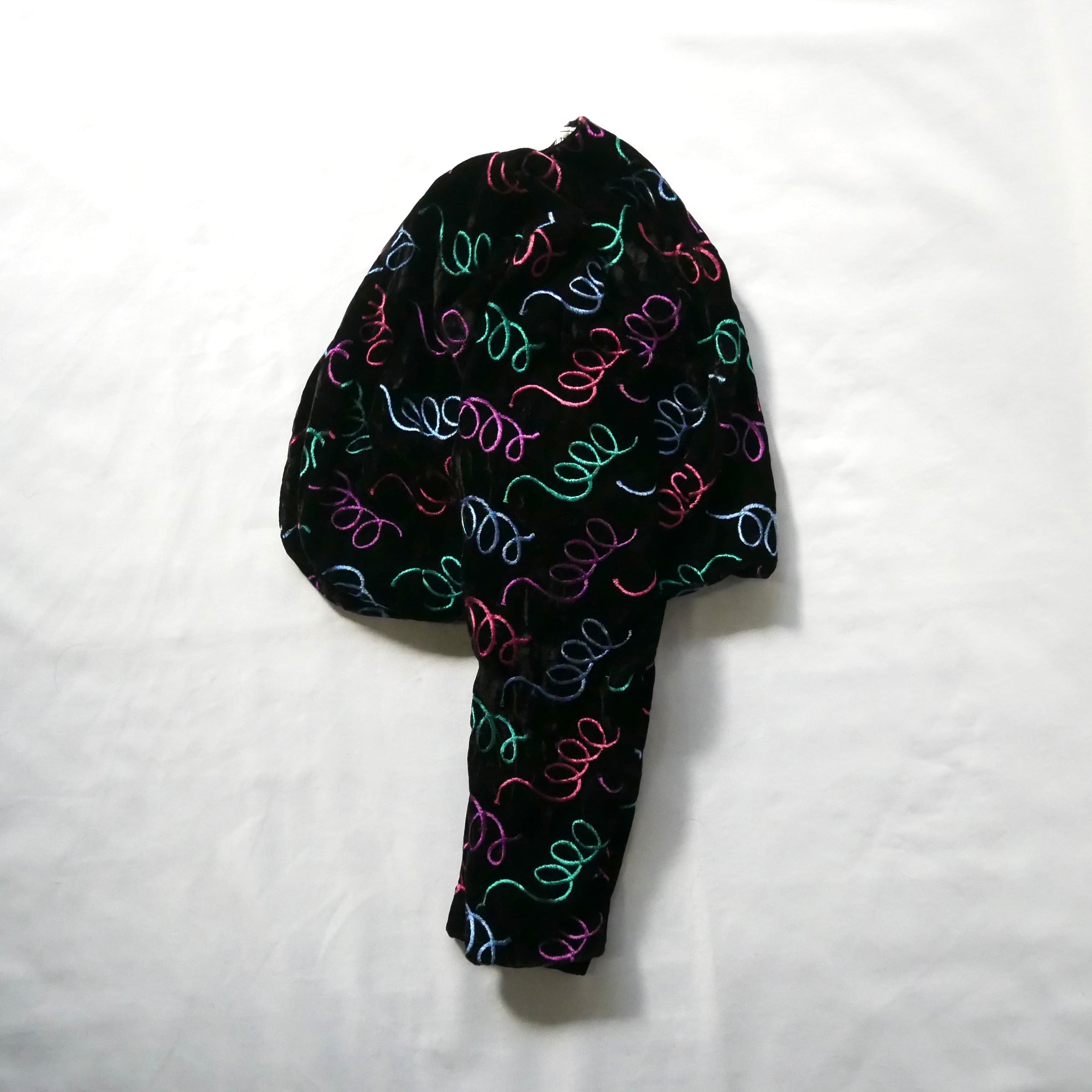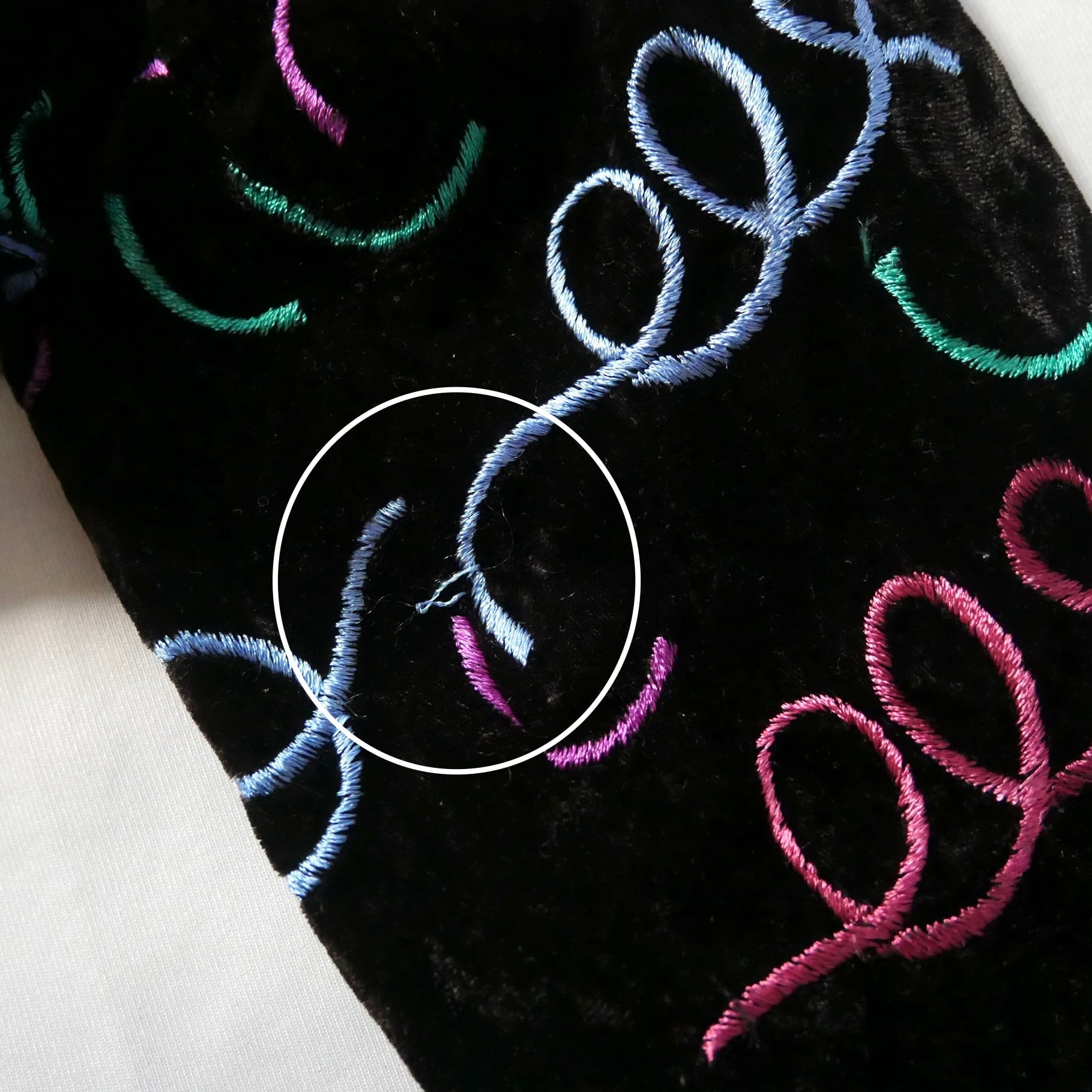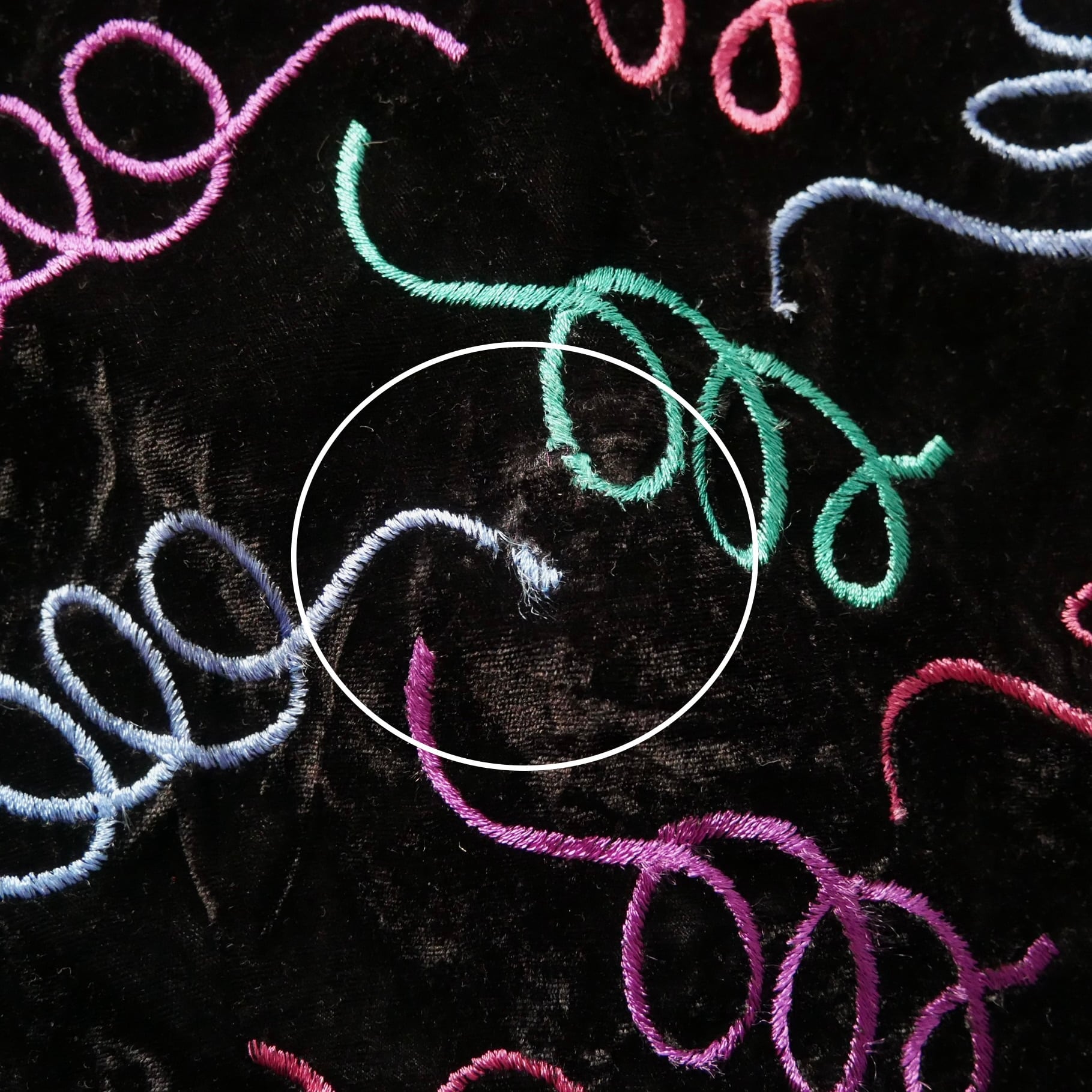 黒のベロアにネオンカラーのカラフルなクルクル刺繍がポップで可愛いです。