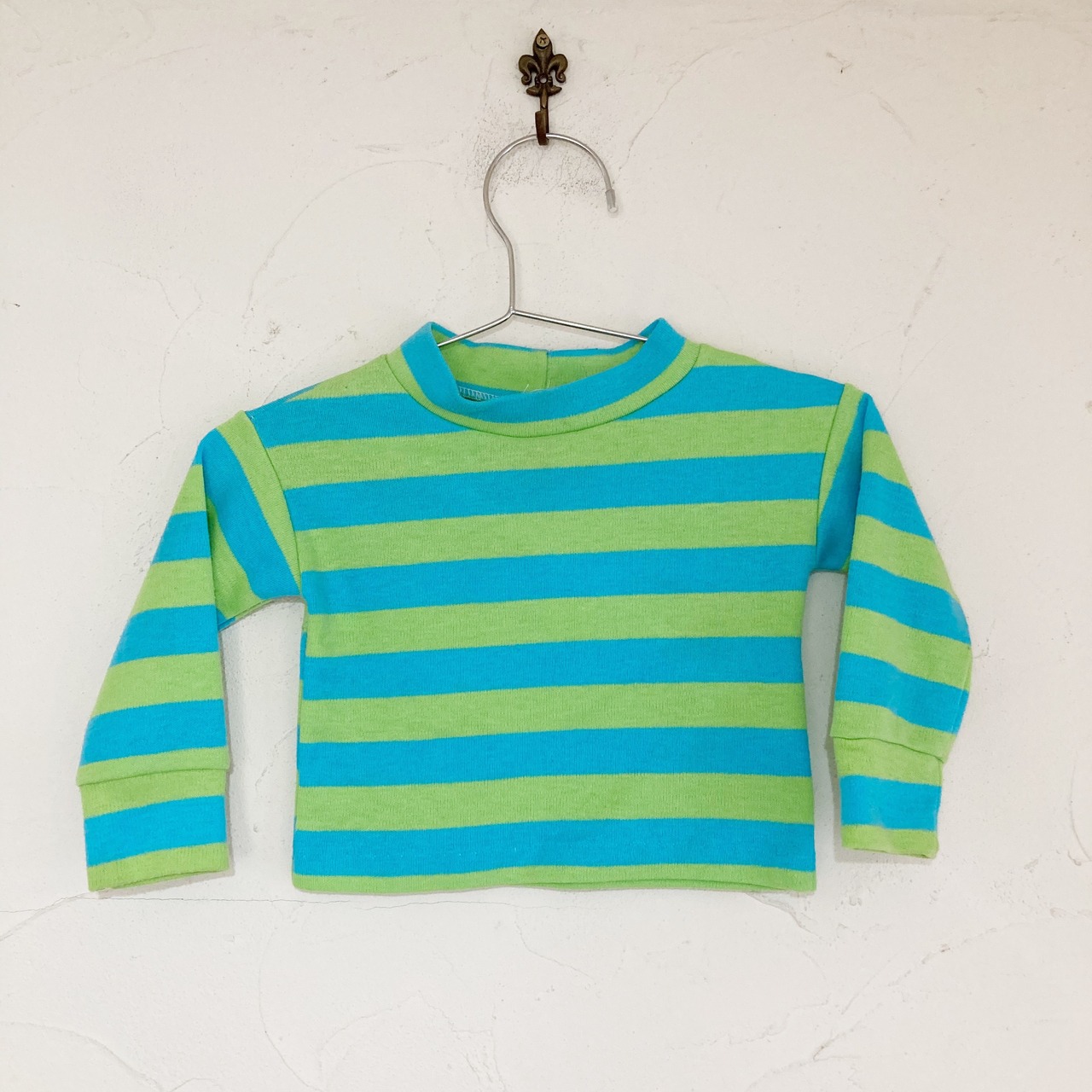 1歳児程度のサイズ感。伸縮性のある生地に色使いがかわいいモックネックロンTです。