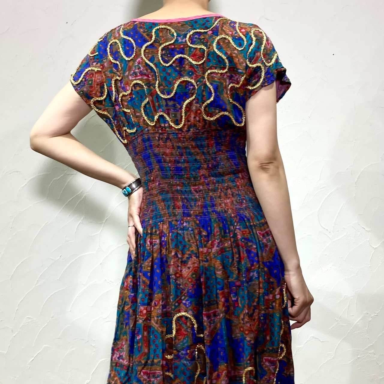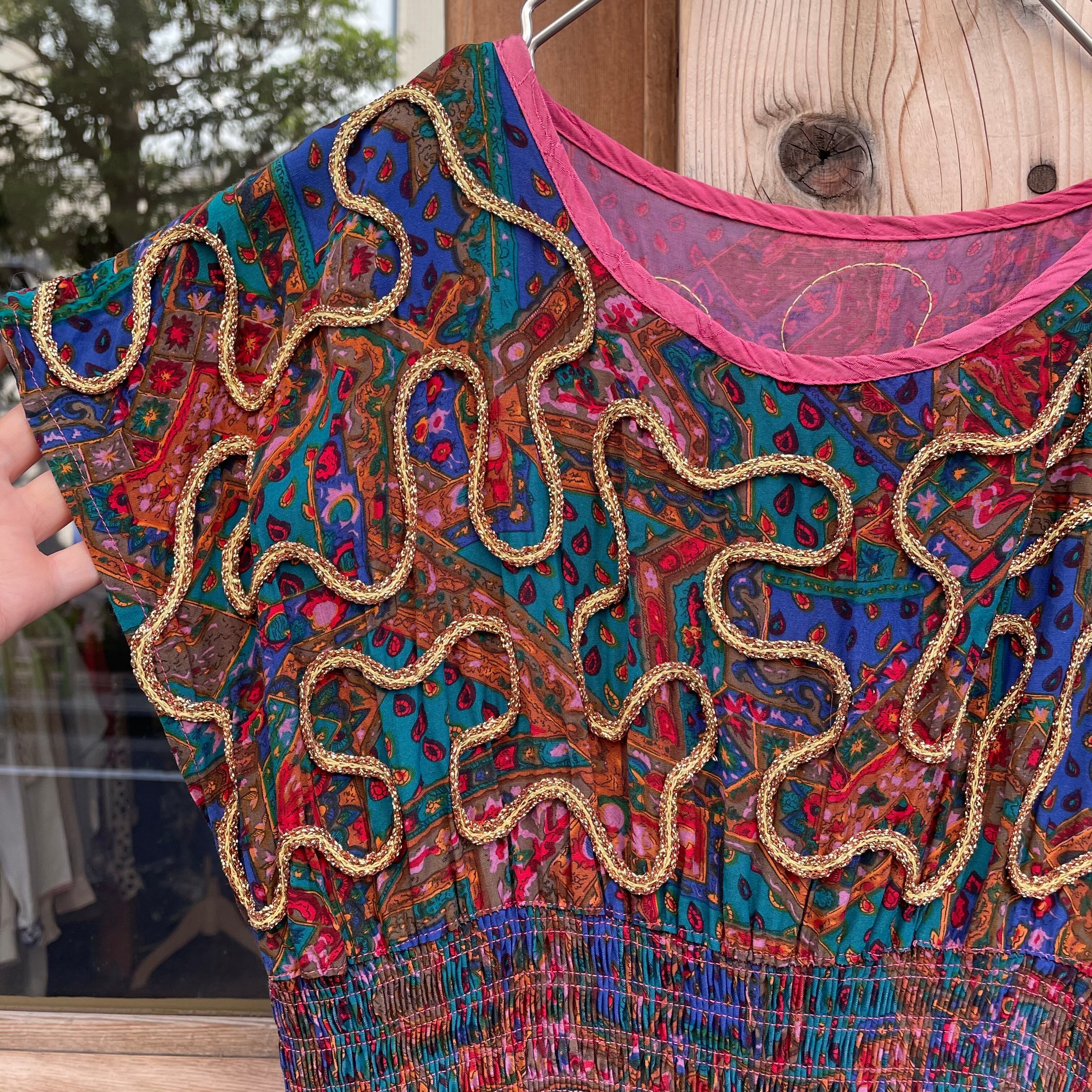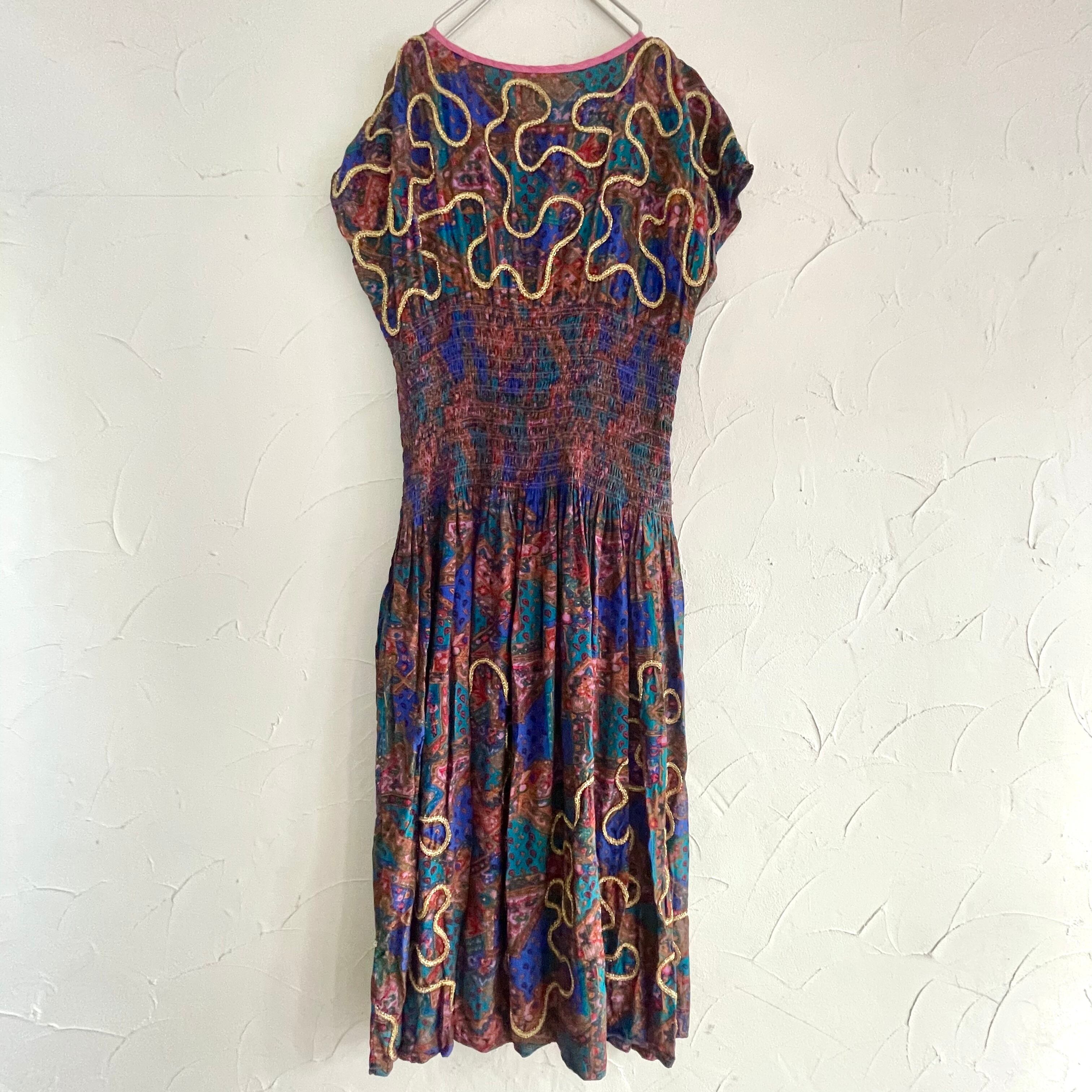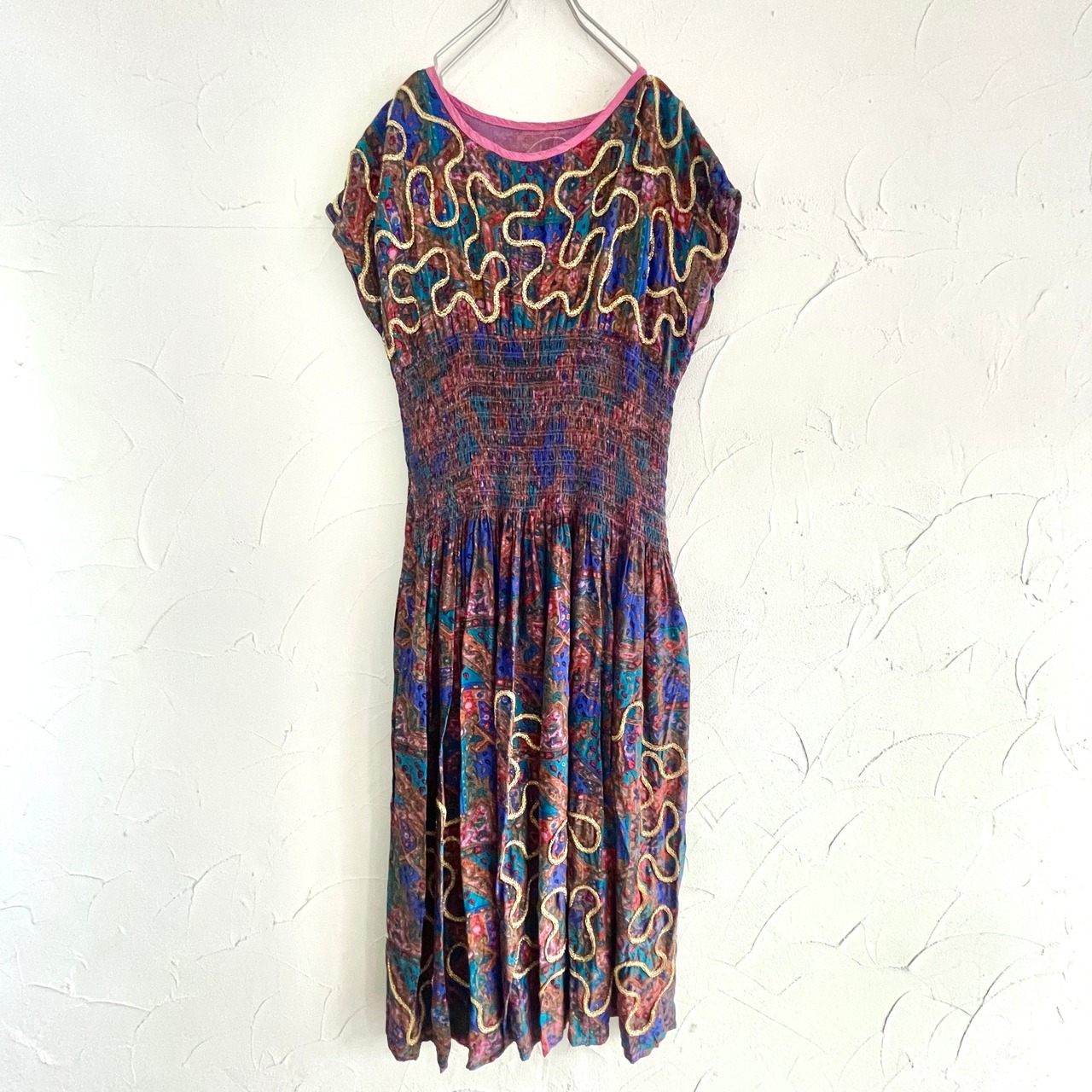 ペイズリーなどの総柄生地にゴールドのリボン刺繍装飾が施されたビンテージワンピースです。