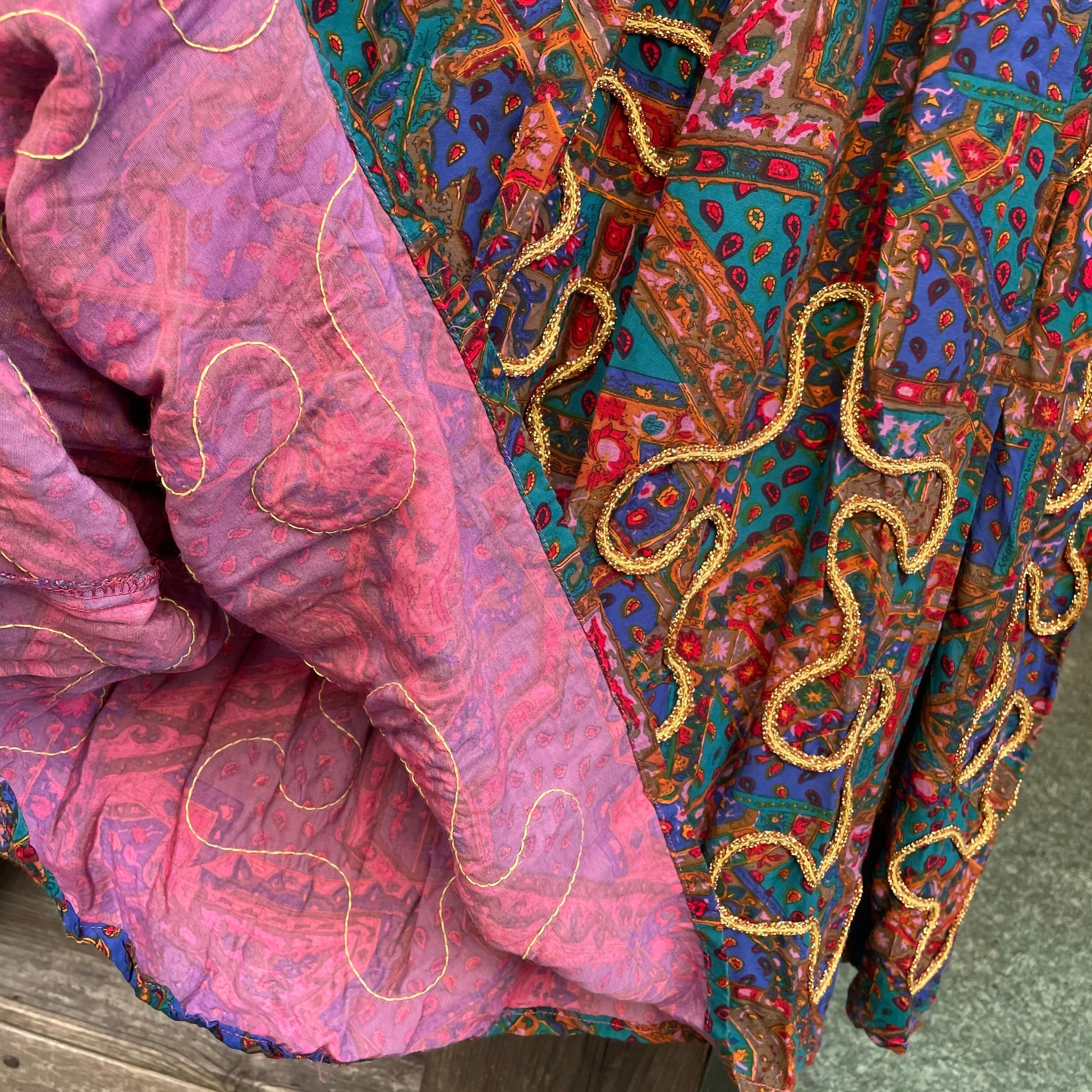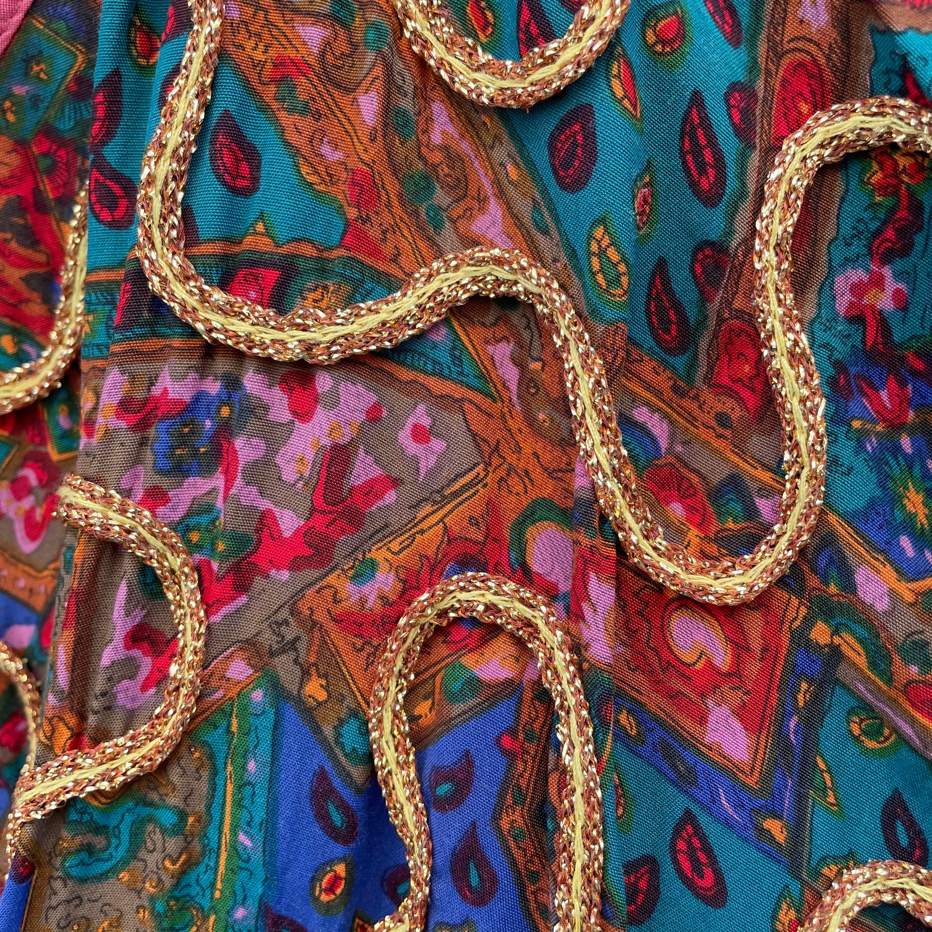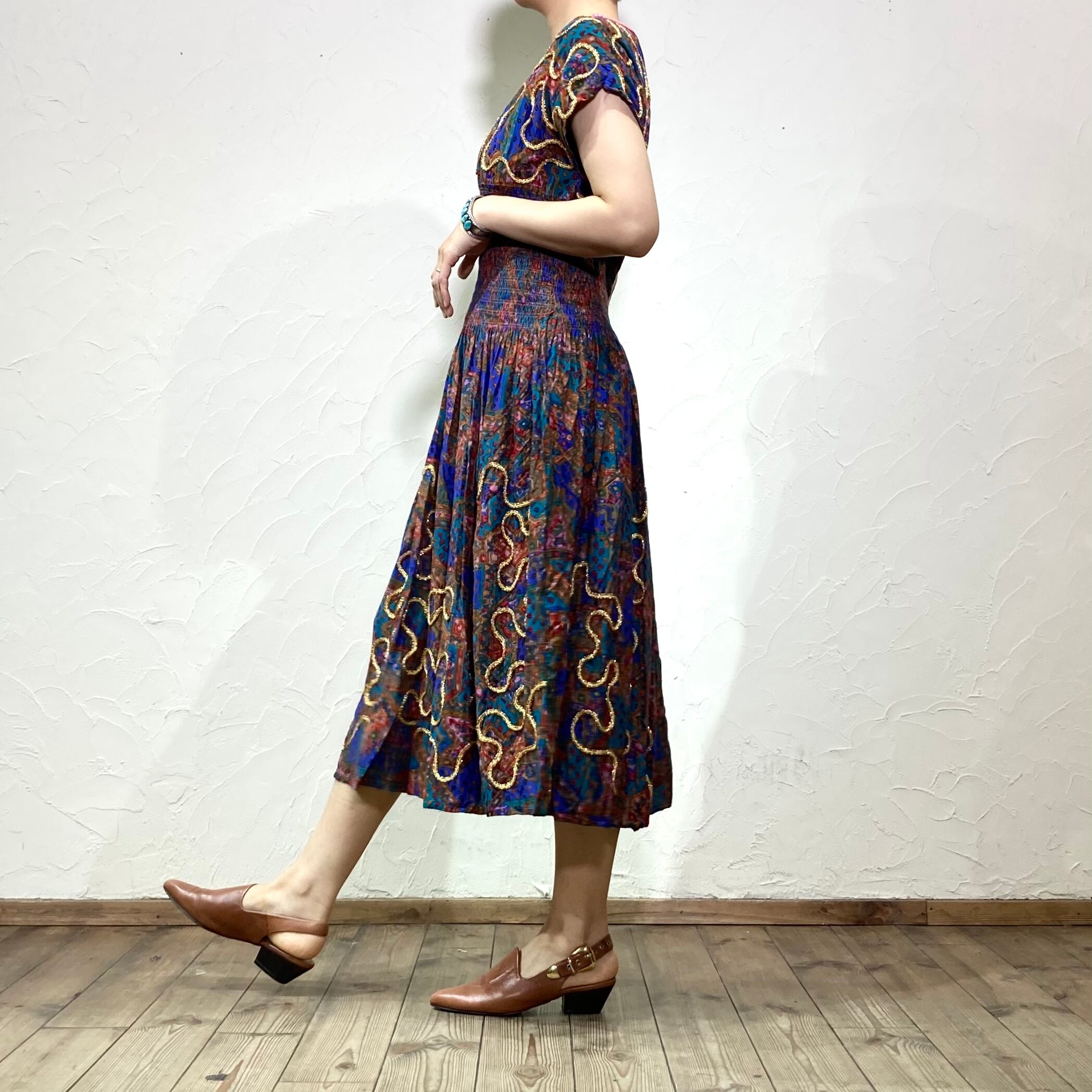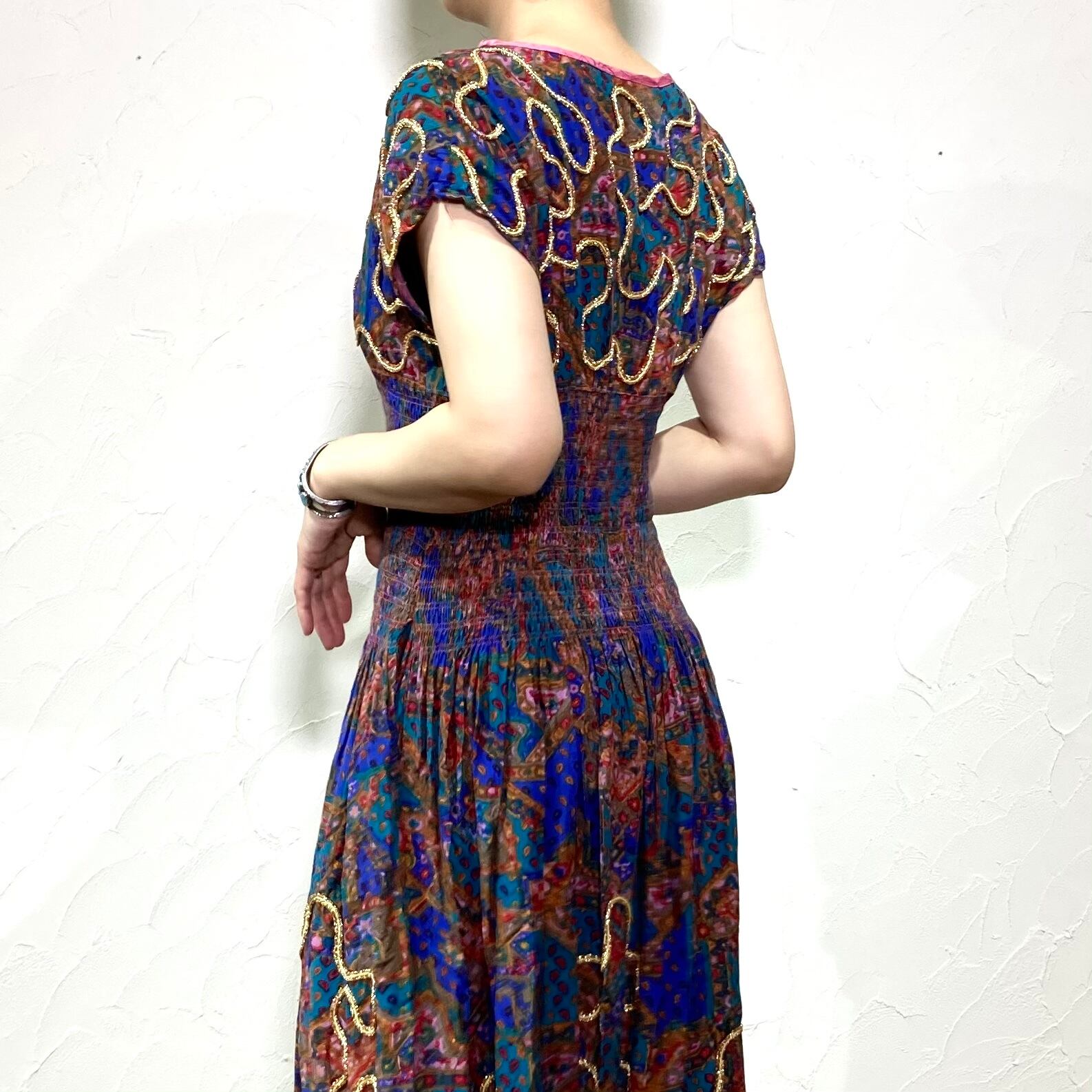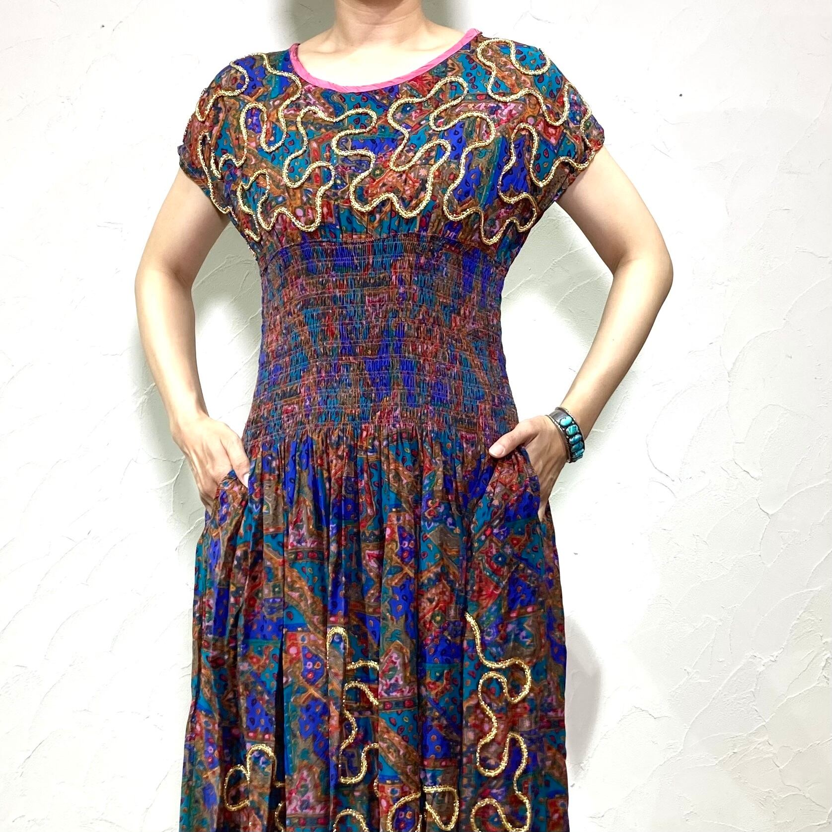 ペイズリーなどの総柄生地にゴールドのリボン刺繍装飾が施されたビンテージワンピースです。