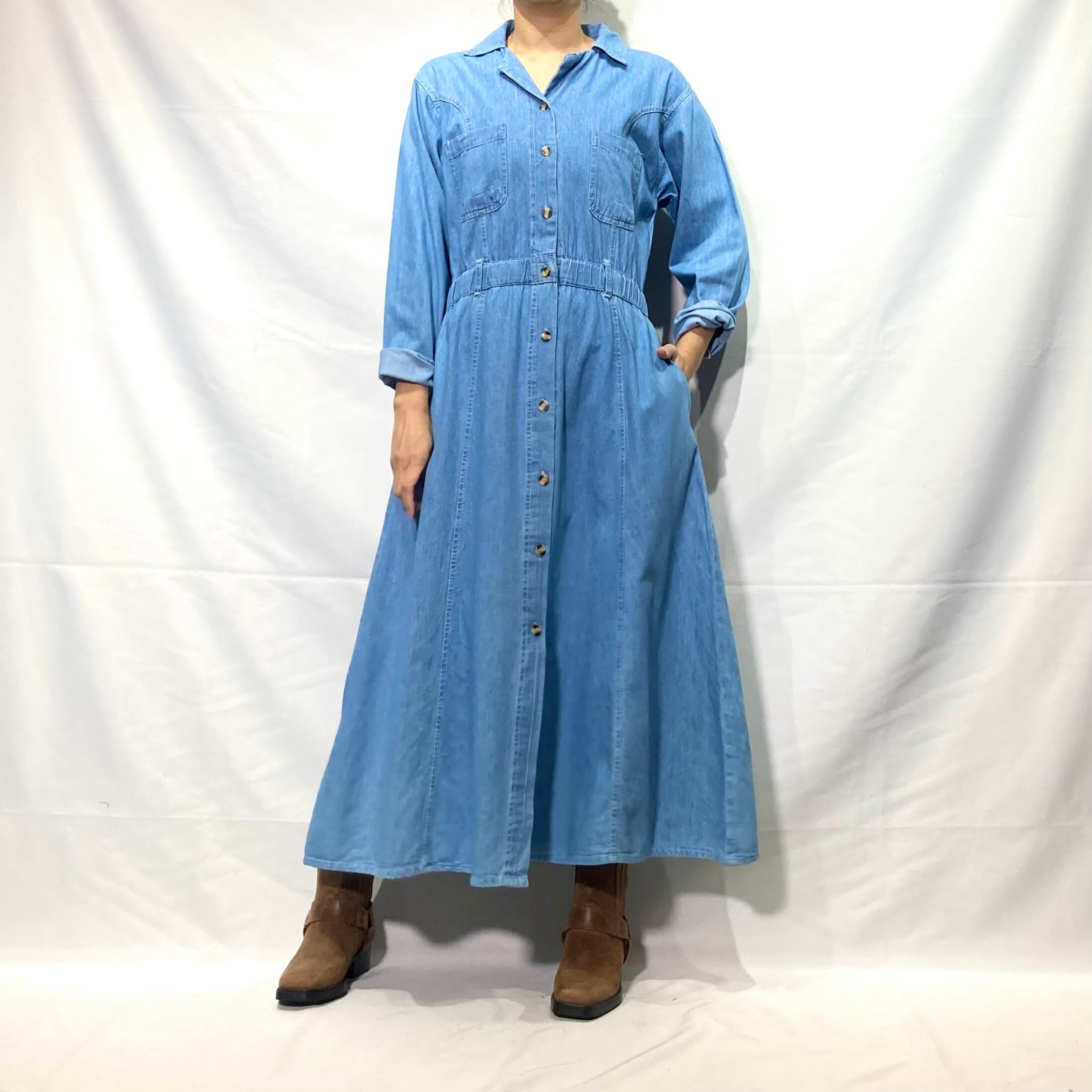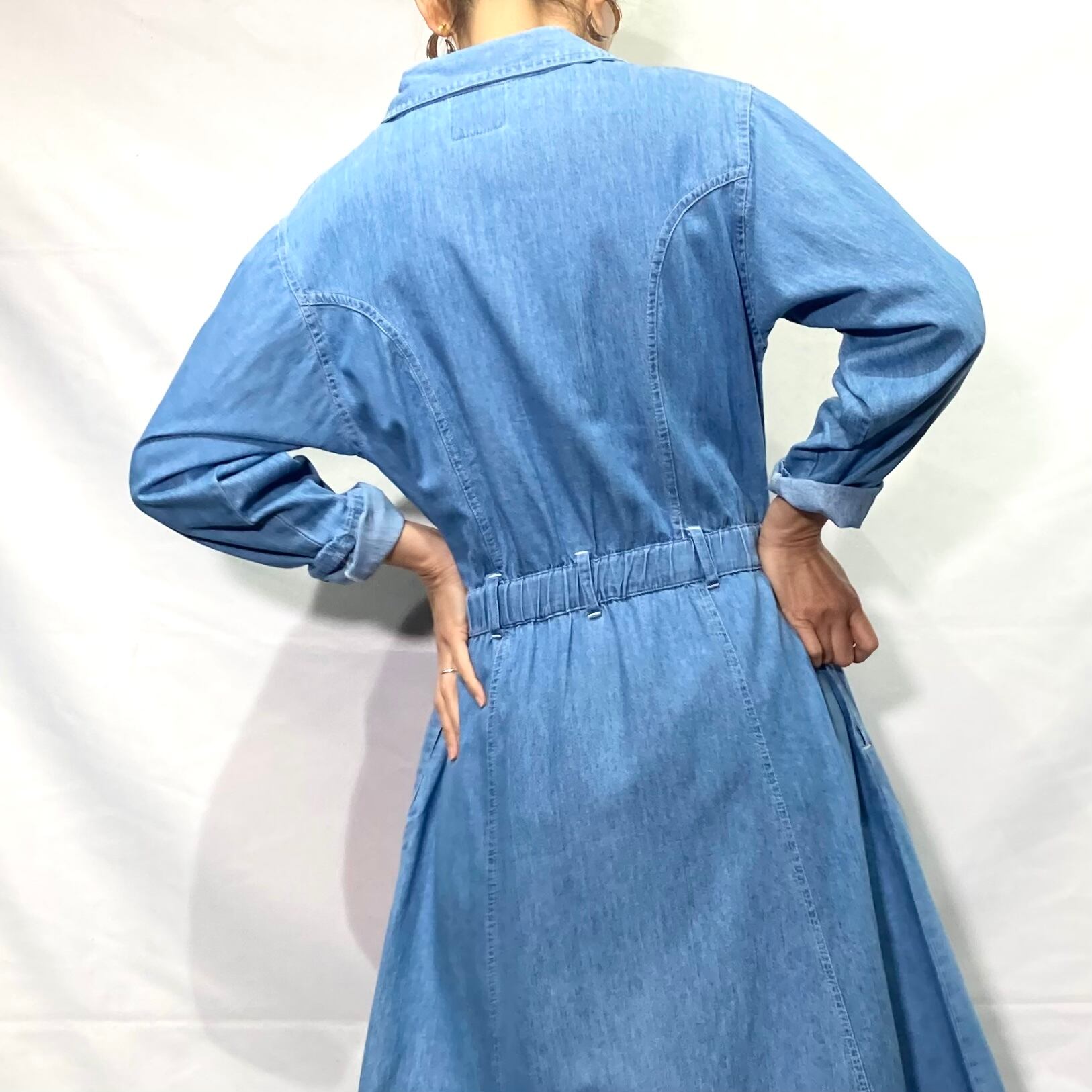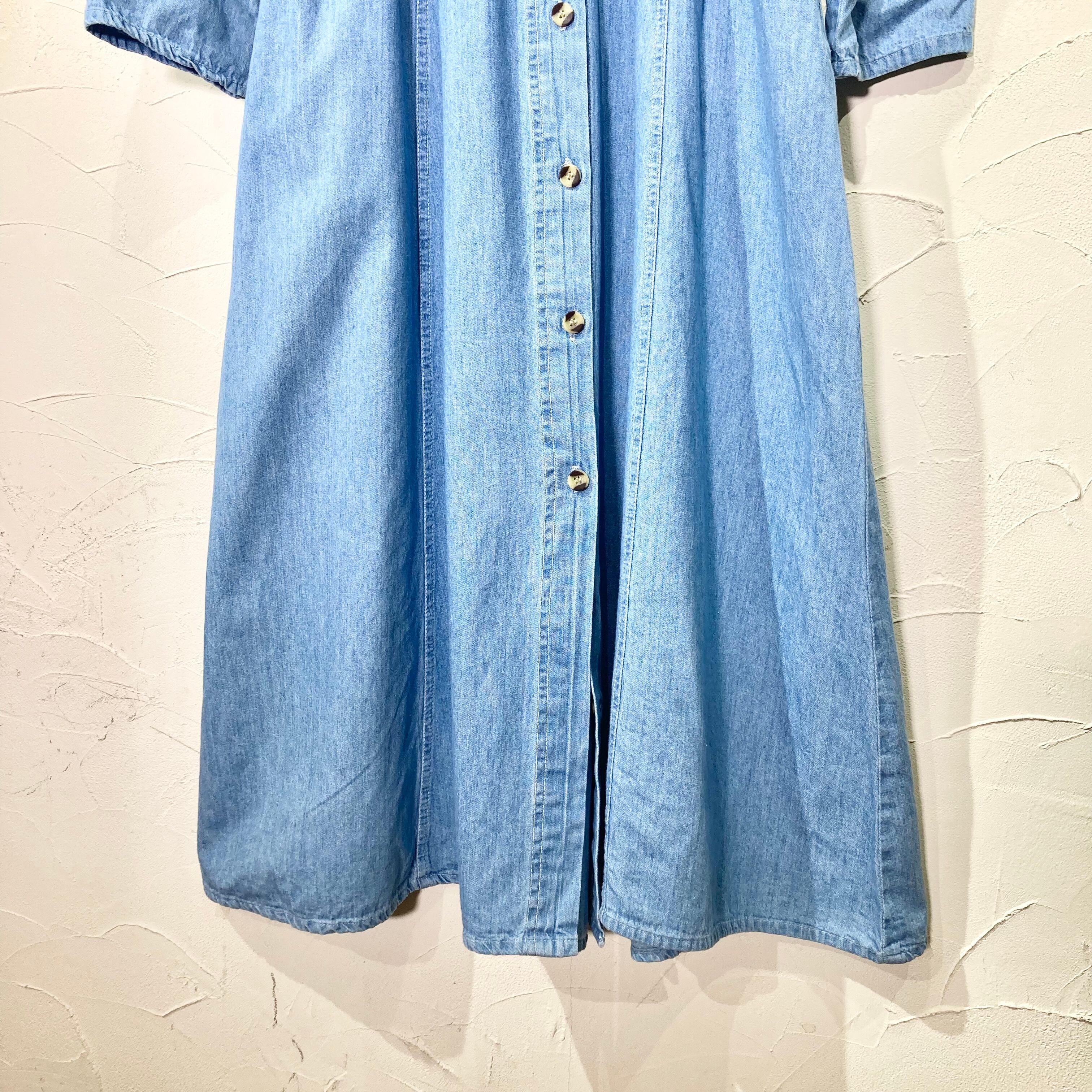 開襟デザインの前開きフレアシルエットがかわいいデニムワンピースです。ポケットつき。