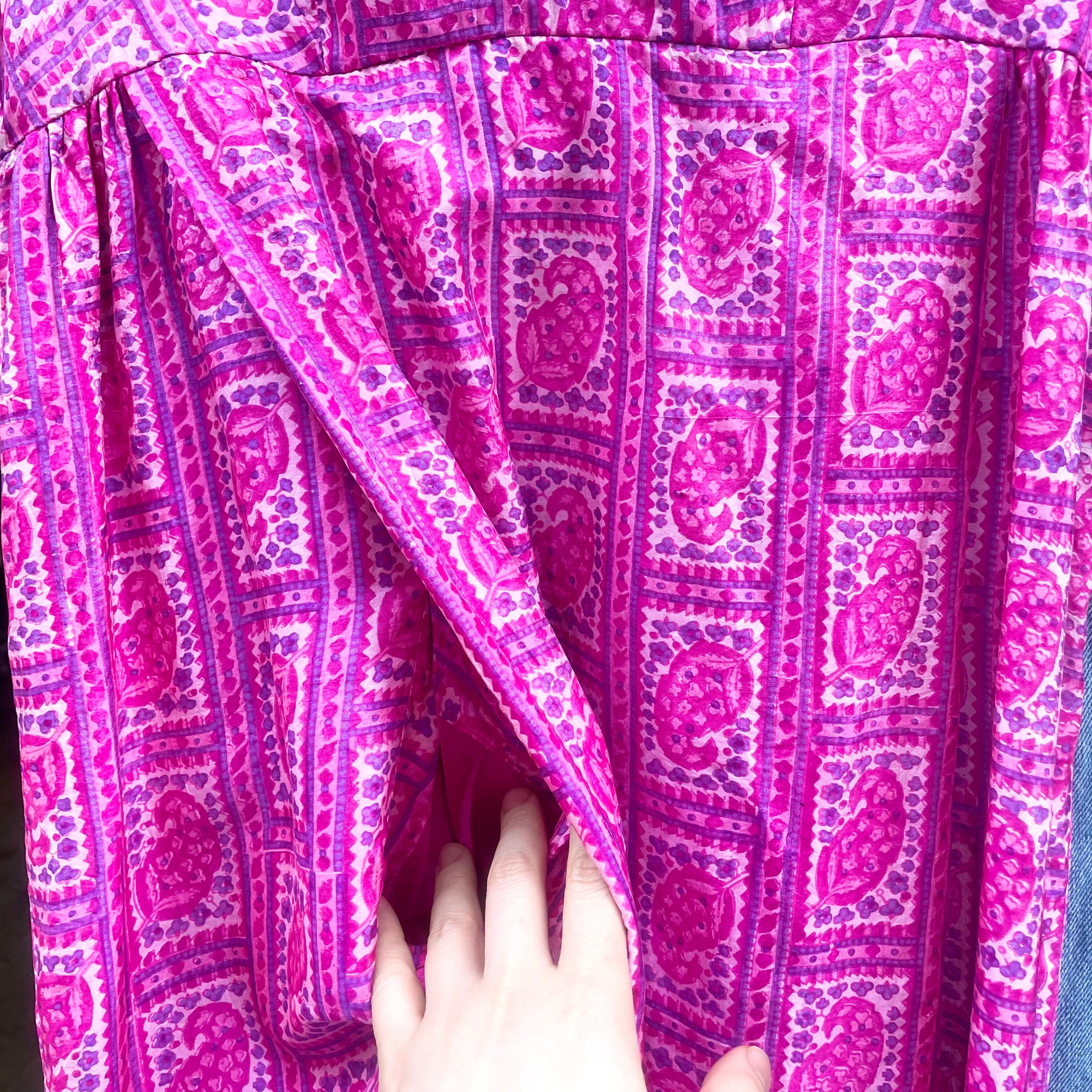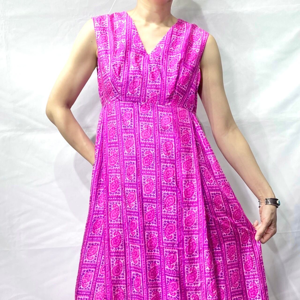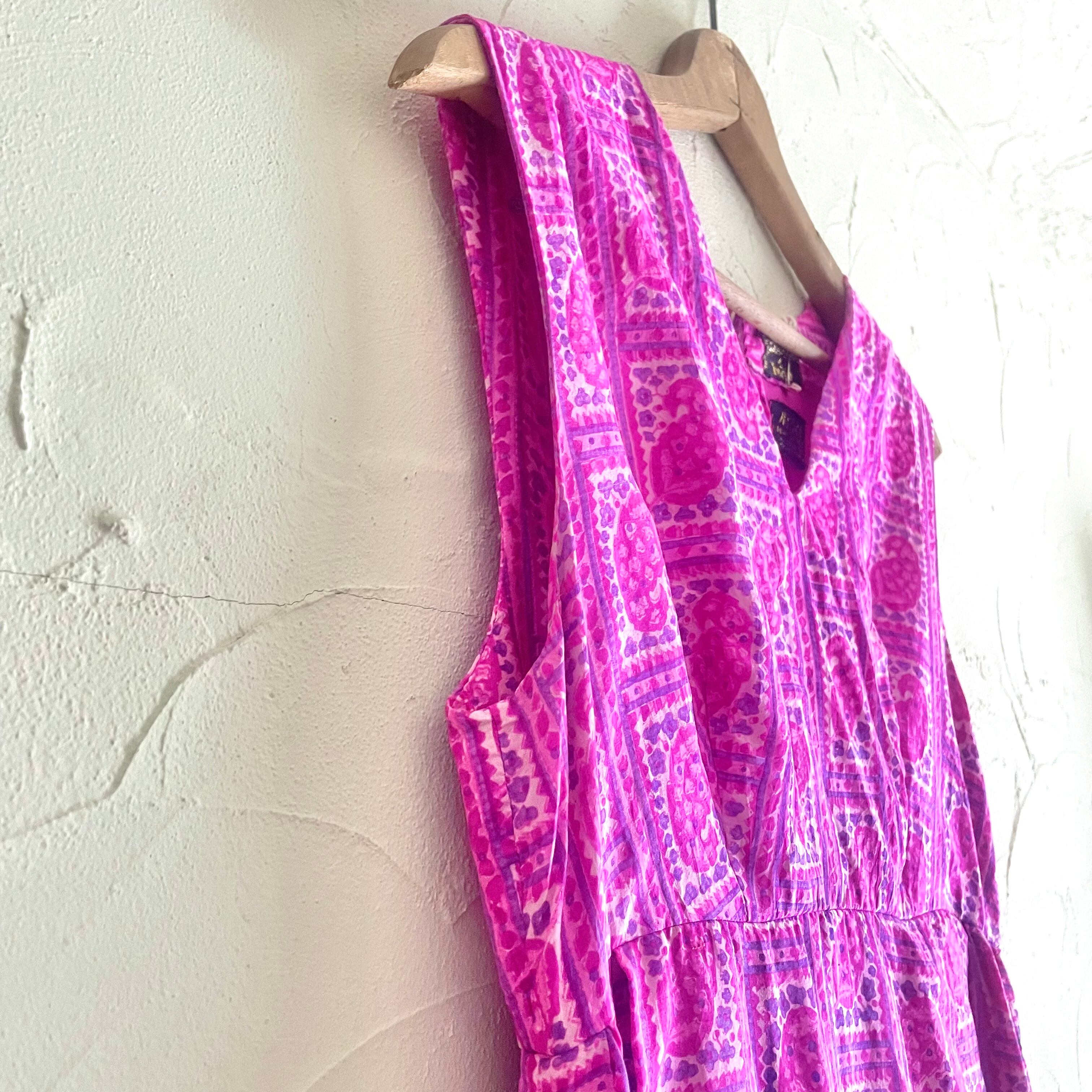 ヴィンテージインド製シルク100%フューシャピンクペイズリー柄マキシ丈ノースリーブワンピースです。フロントプリーツめくった部分に両ポケット付き。