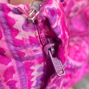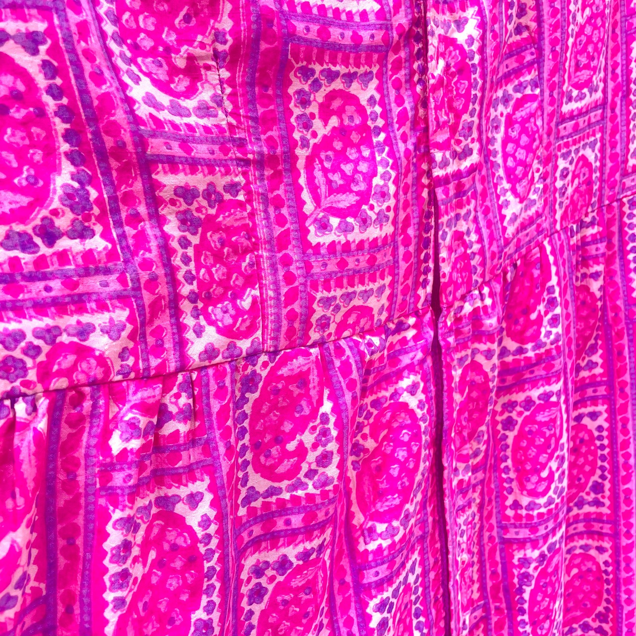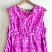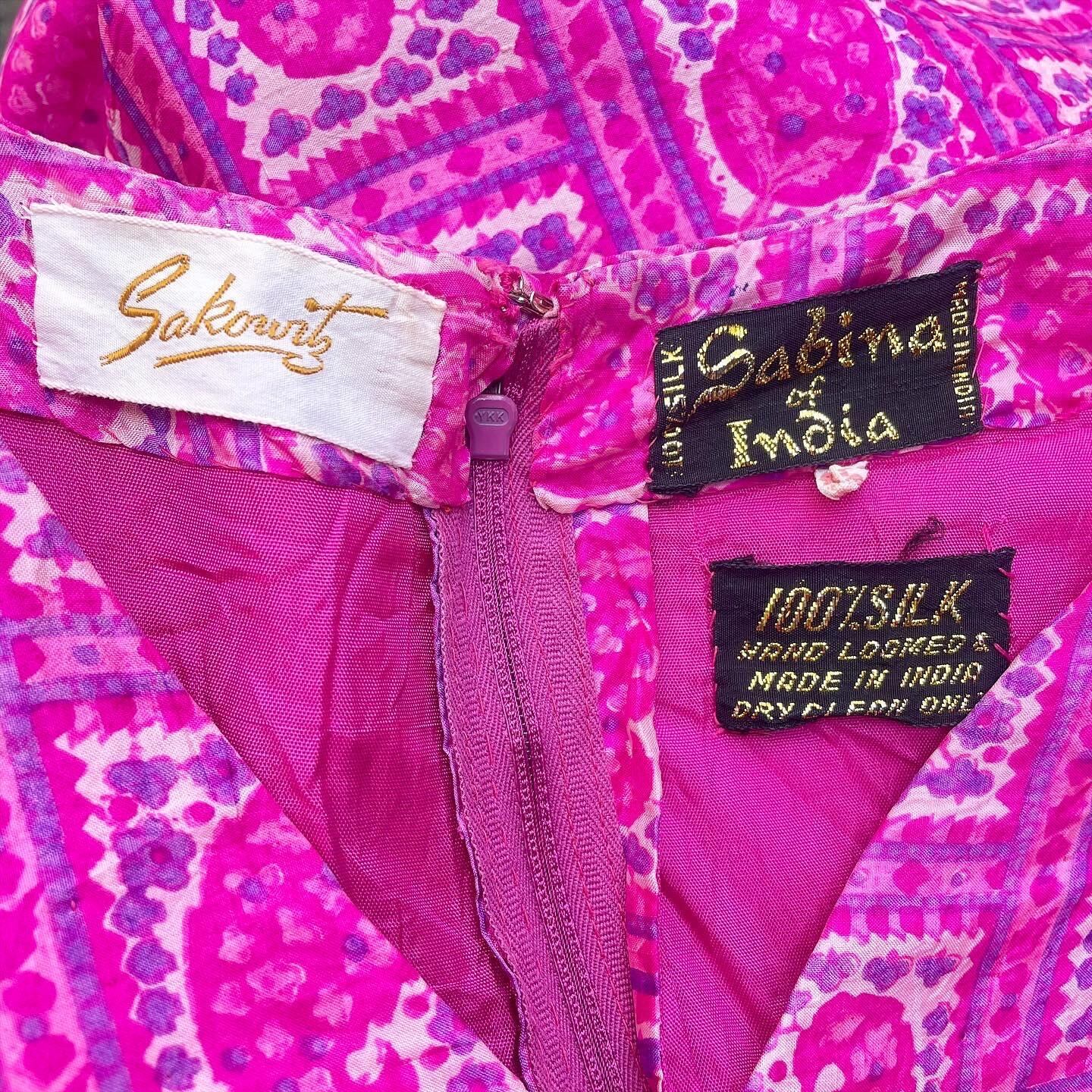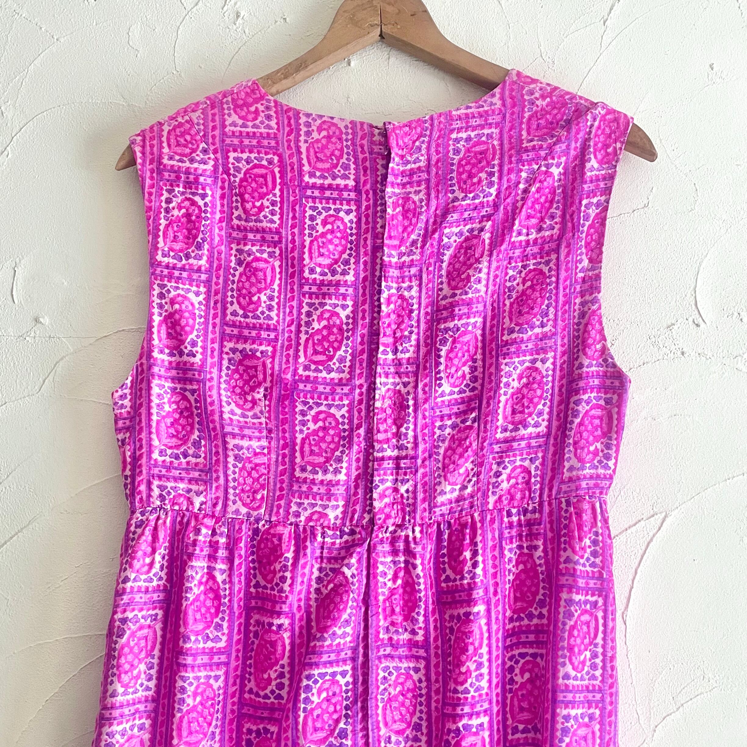 ヴィンテージインド製シルク100%フューシャピンクペイズリー柄マキシ丈ノースリーブワンピースです。フロントプリーツめくった部分に両ポケット付き。