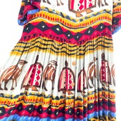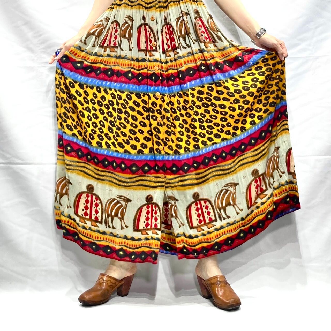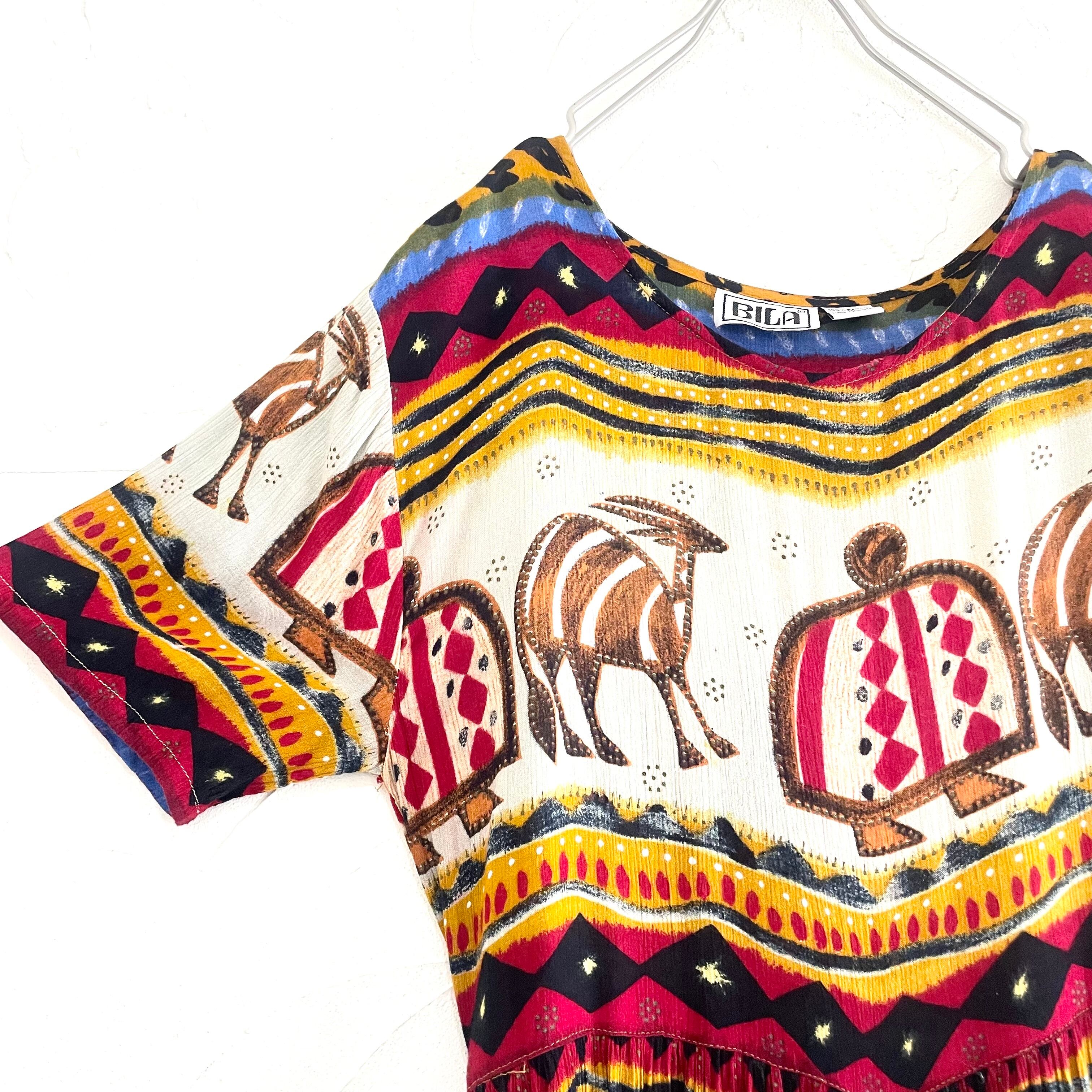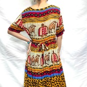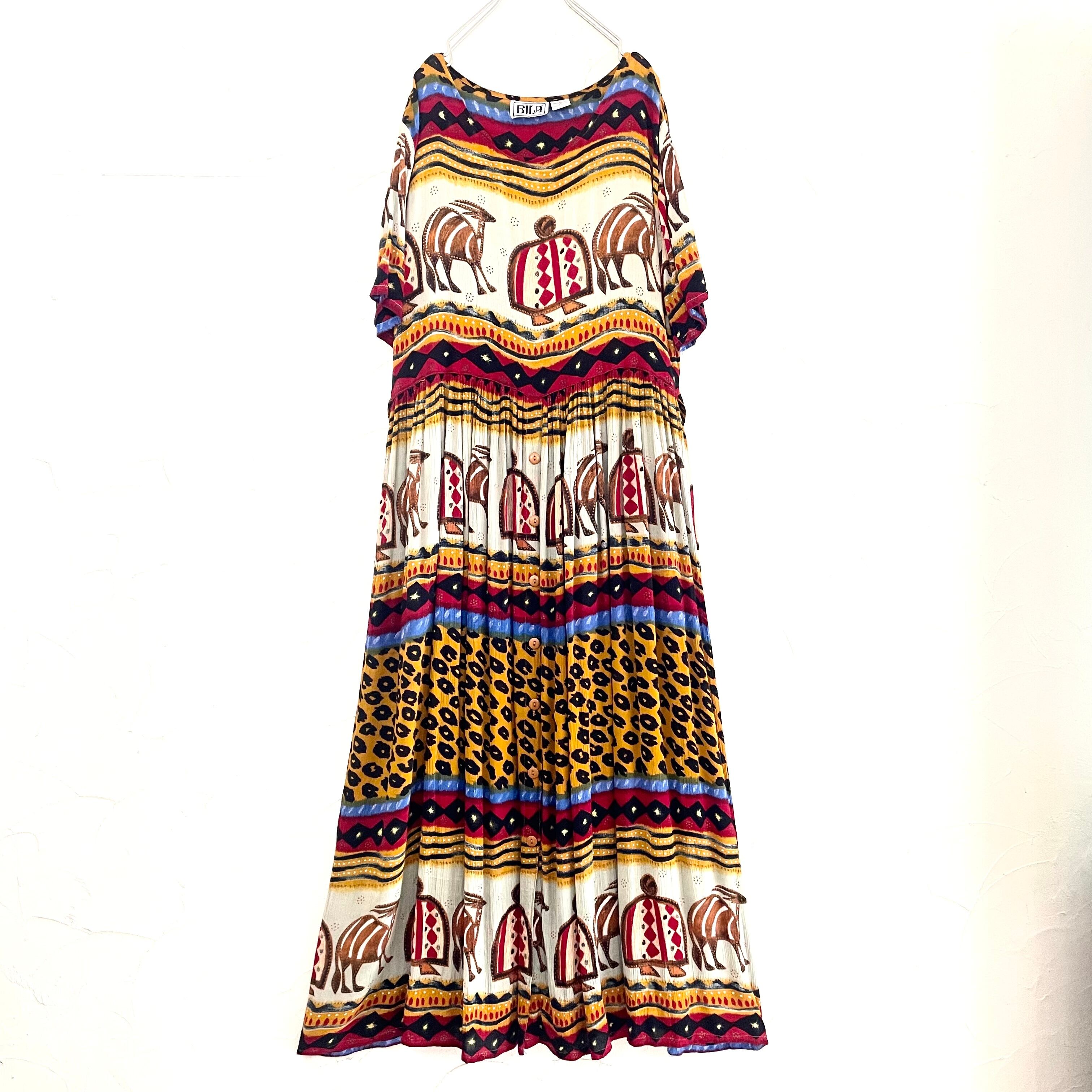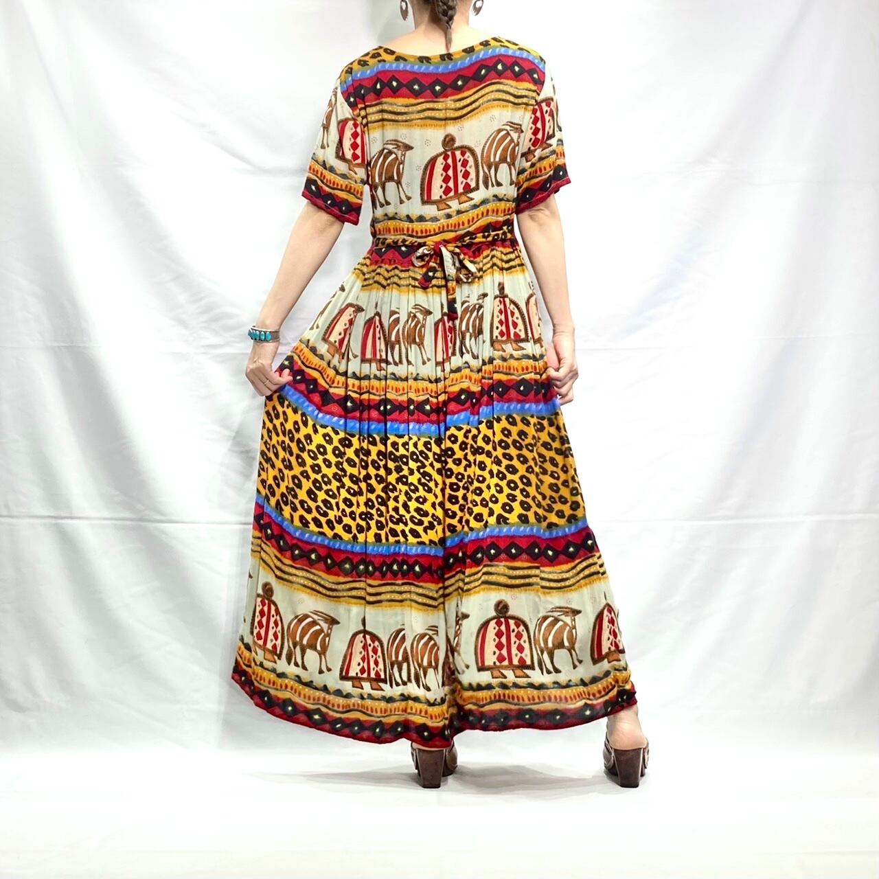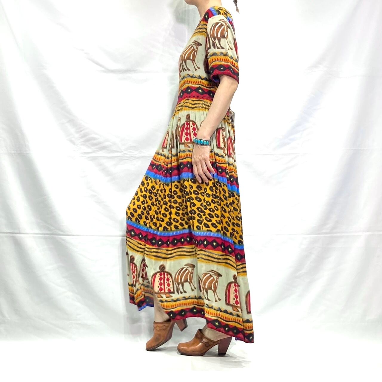 動物、人、レオパード柄などアフリカンテイストの総柄が素敵な8-90s BILA パキスタンレーヨン100%半袖マキシ丈ワンピースです。