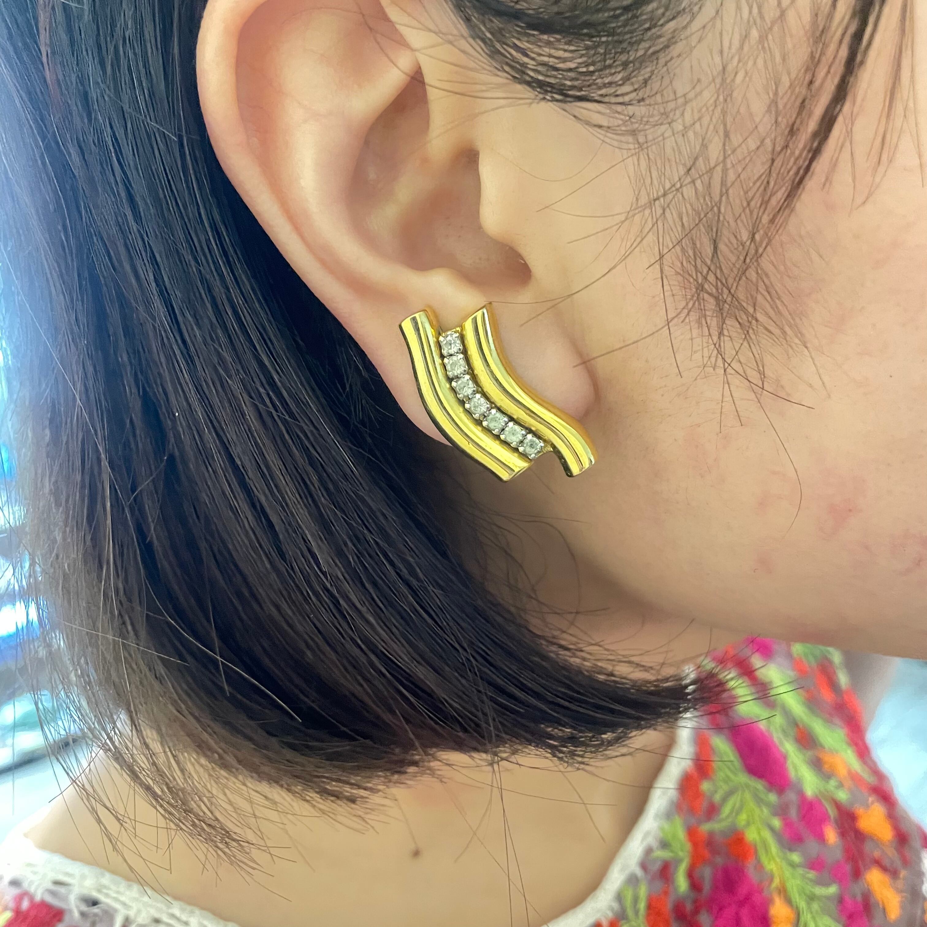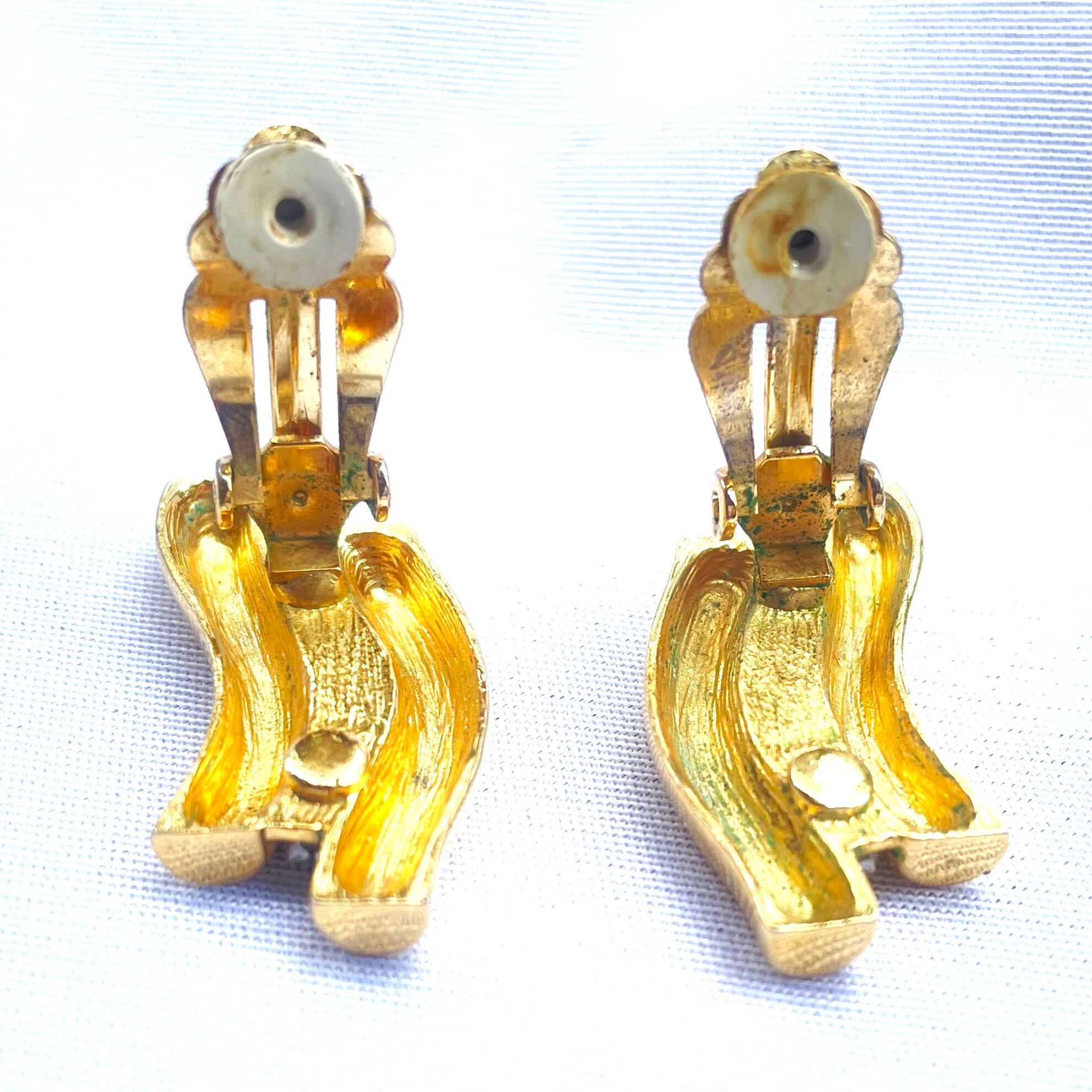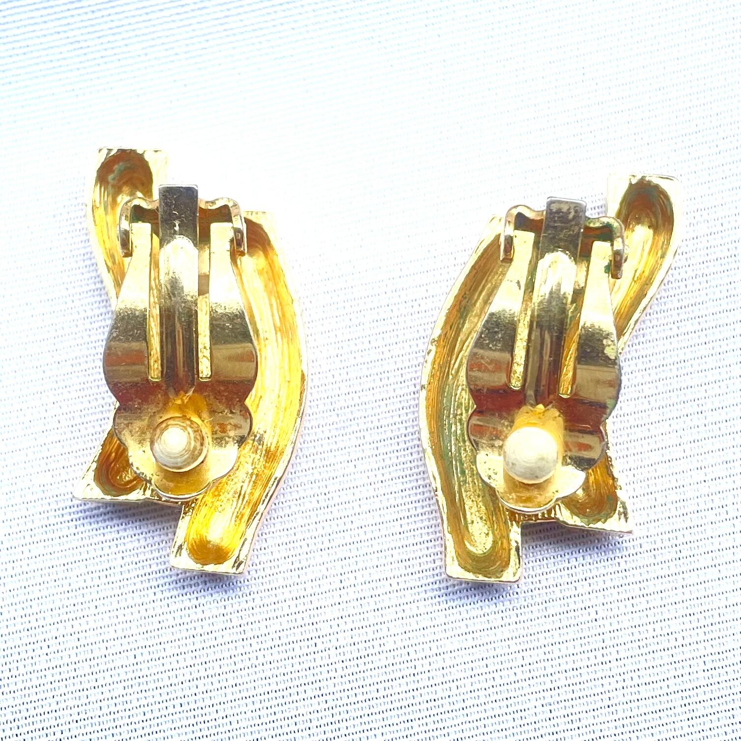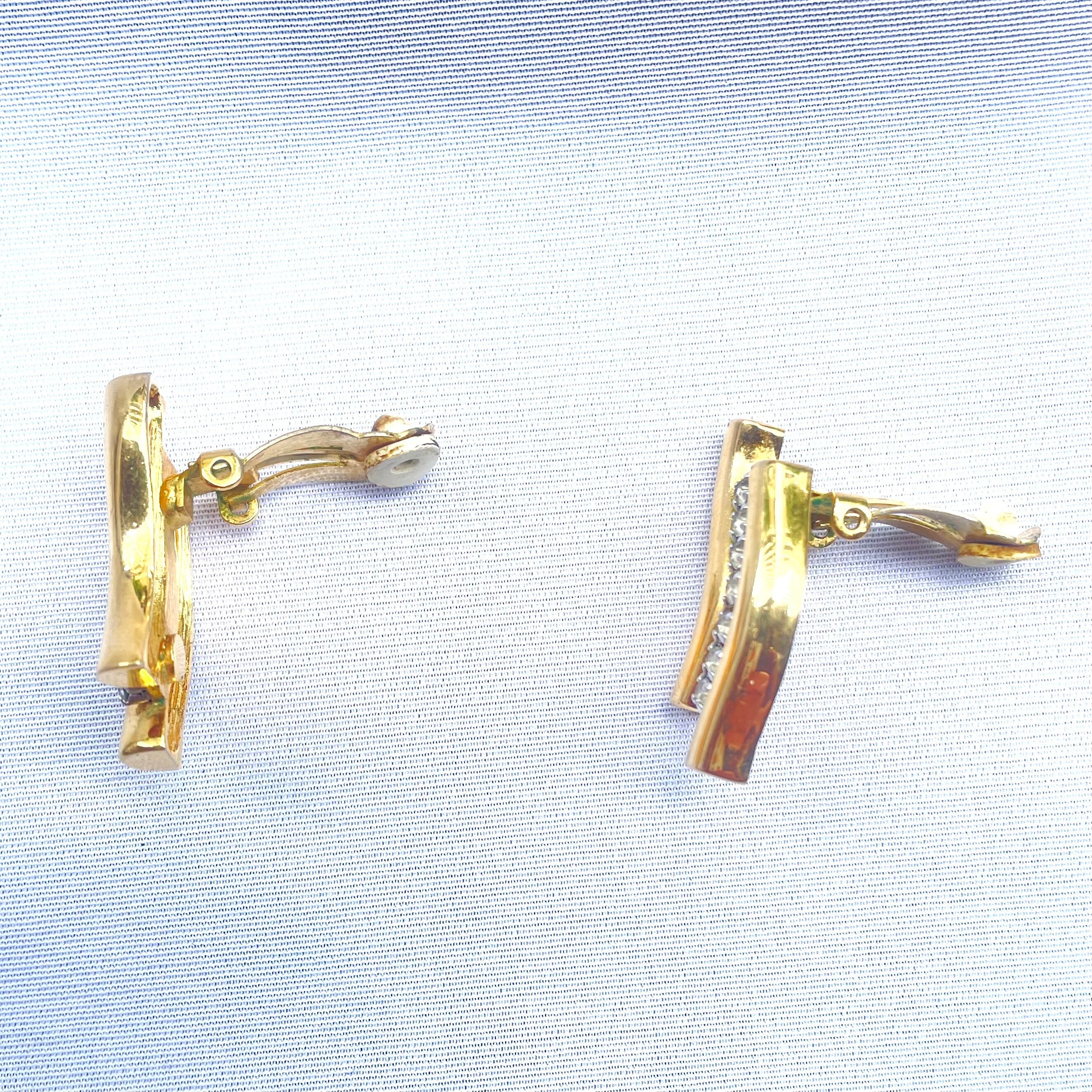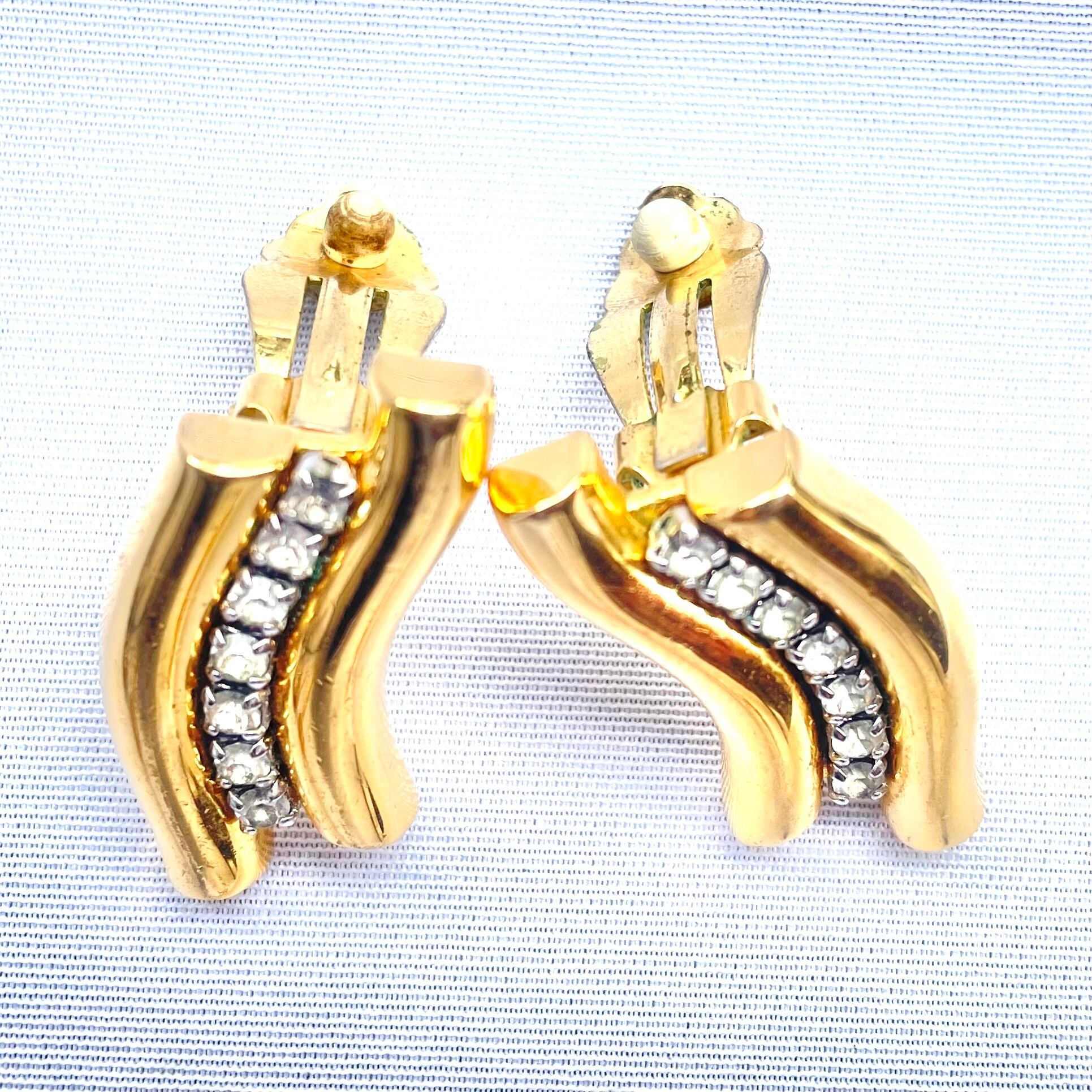 ゴールド色のウェーブ型の中央にラインストーンが並んだイヤリングです。