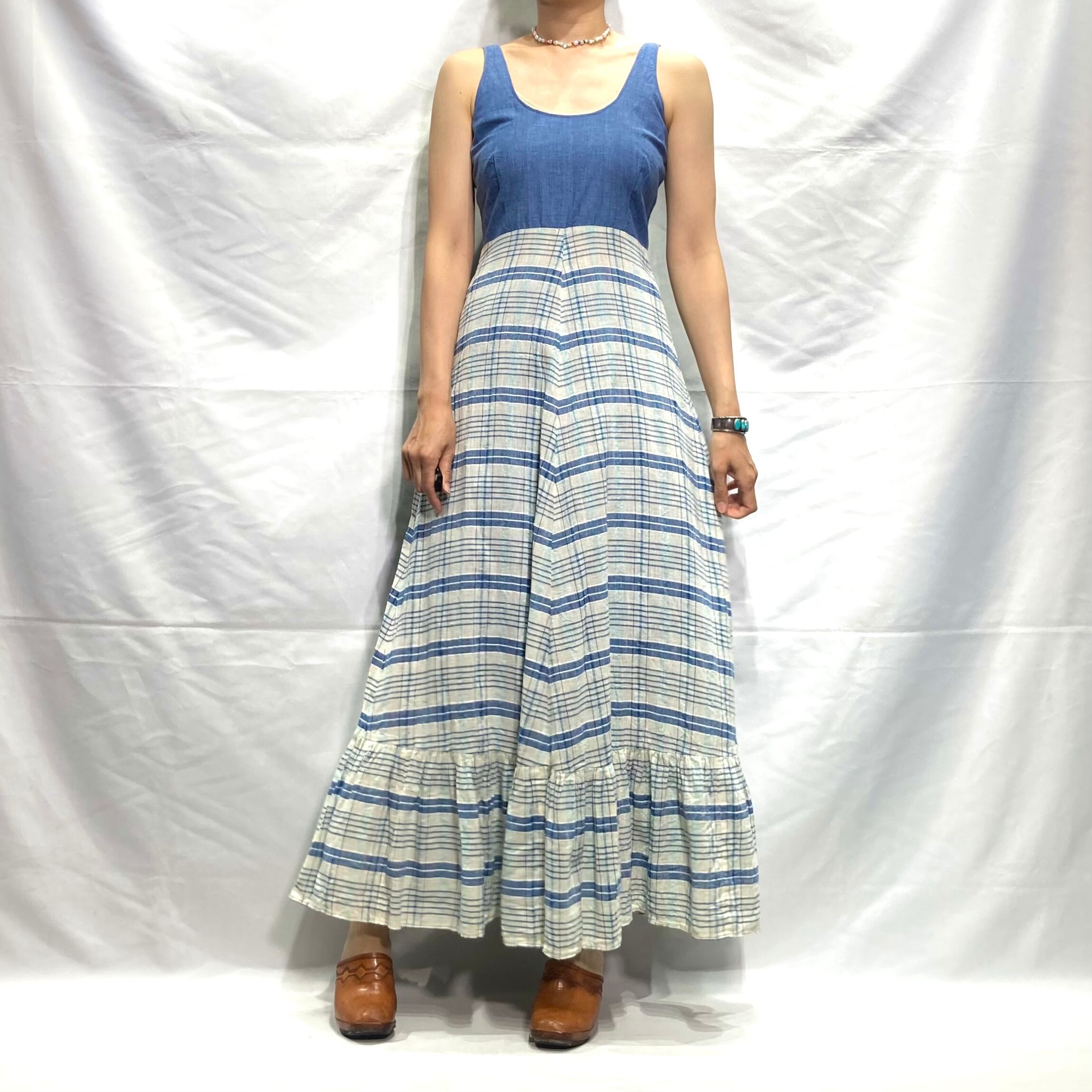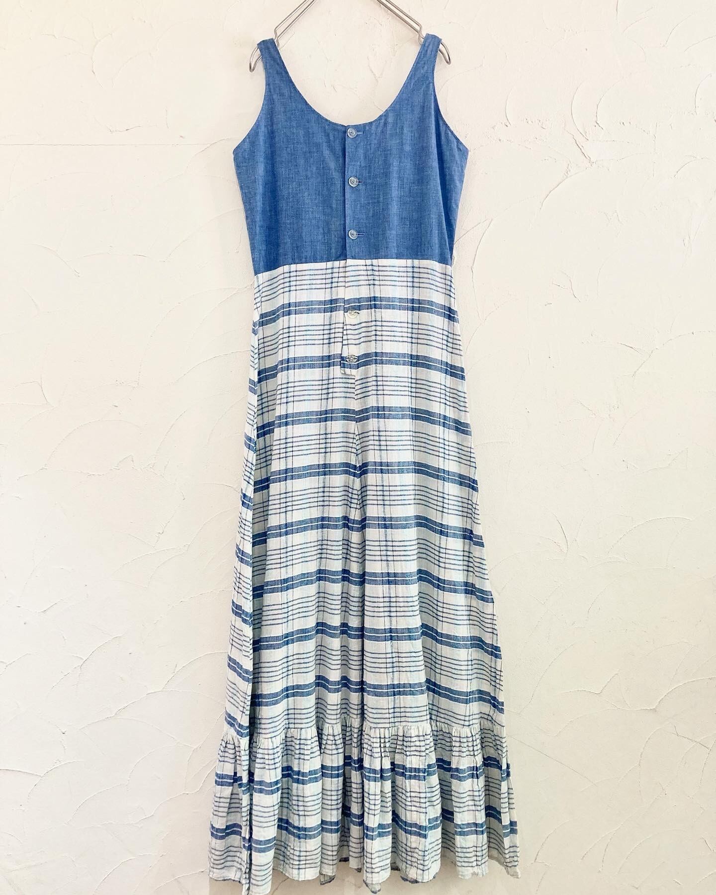 シャンブレー×チェック柄の切替がかわいい涼し気な色使いのノースリーブマキシワンピースです。