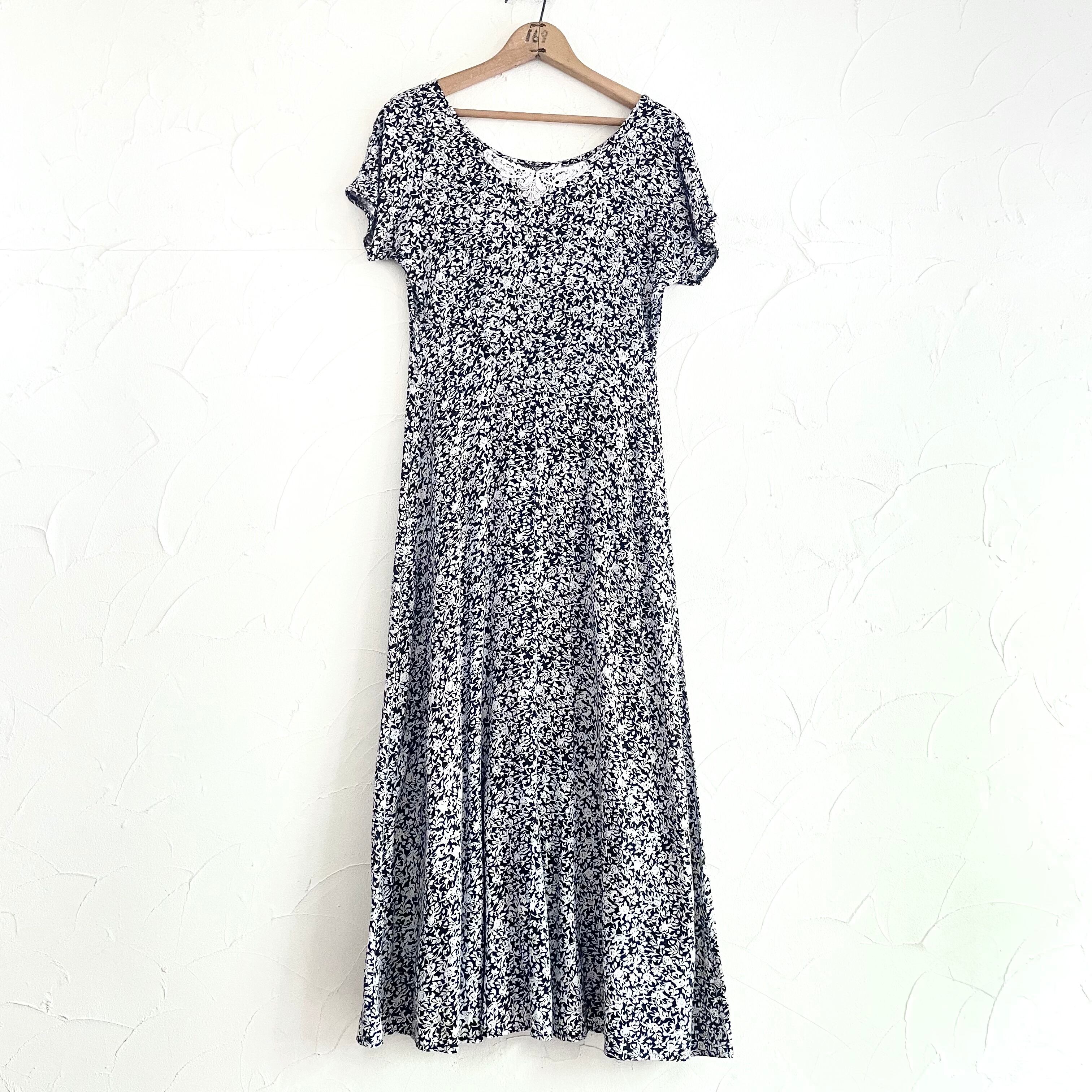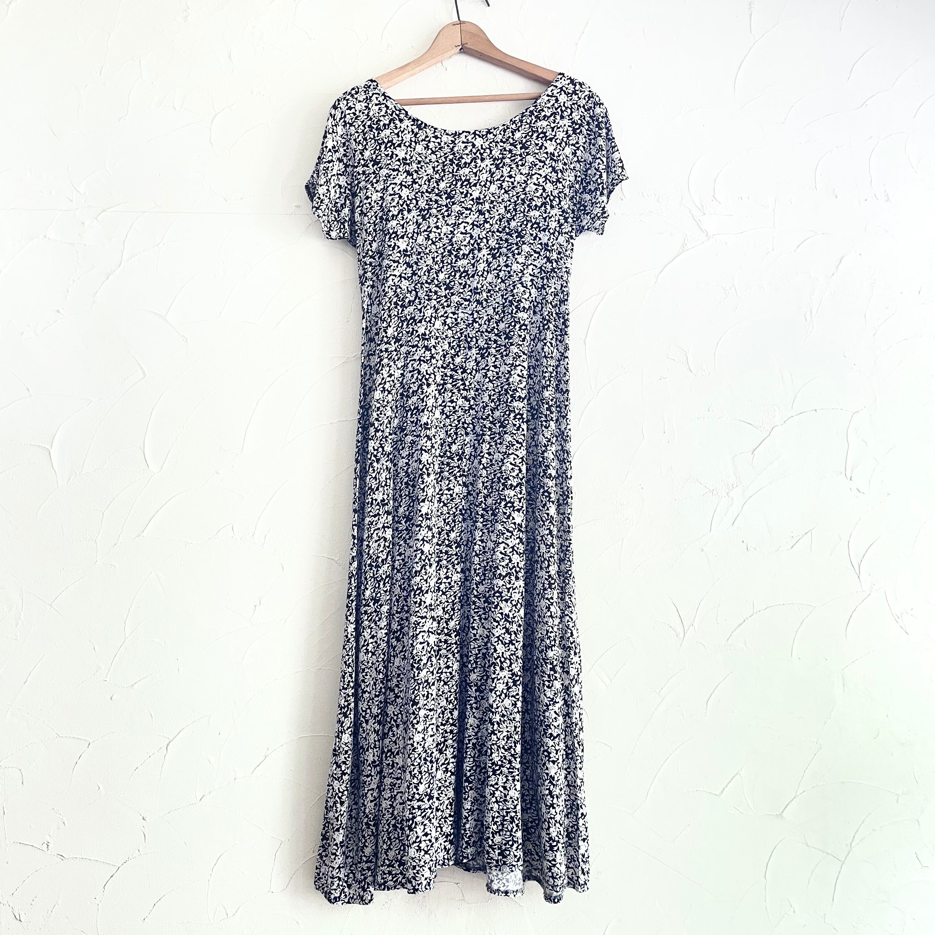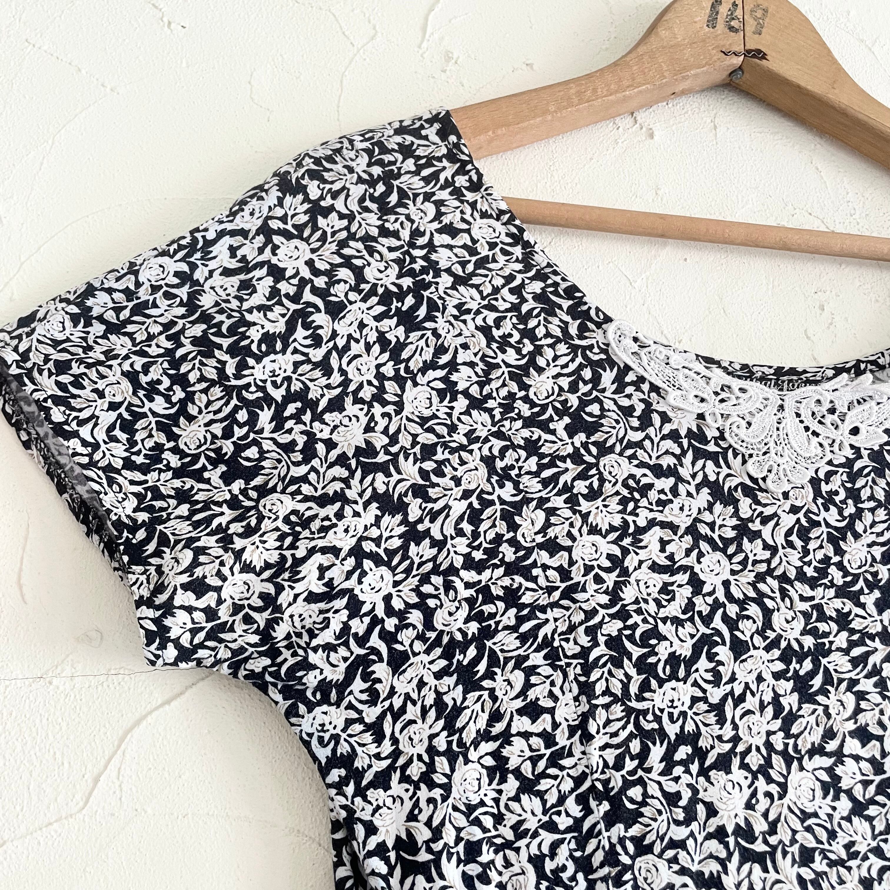 黒地に白、ベージュ花柄のレーヨン100%白レース襟付きアメリカ製マキシ丈半袖ワンピースです。