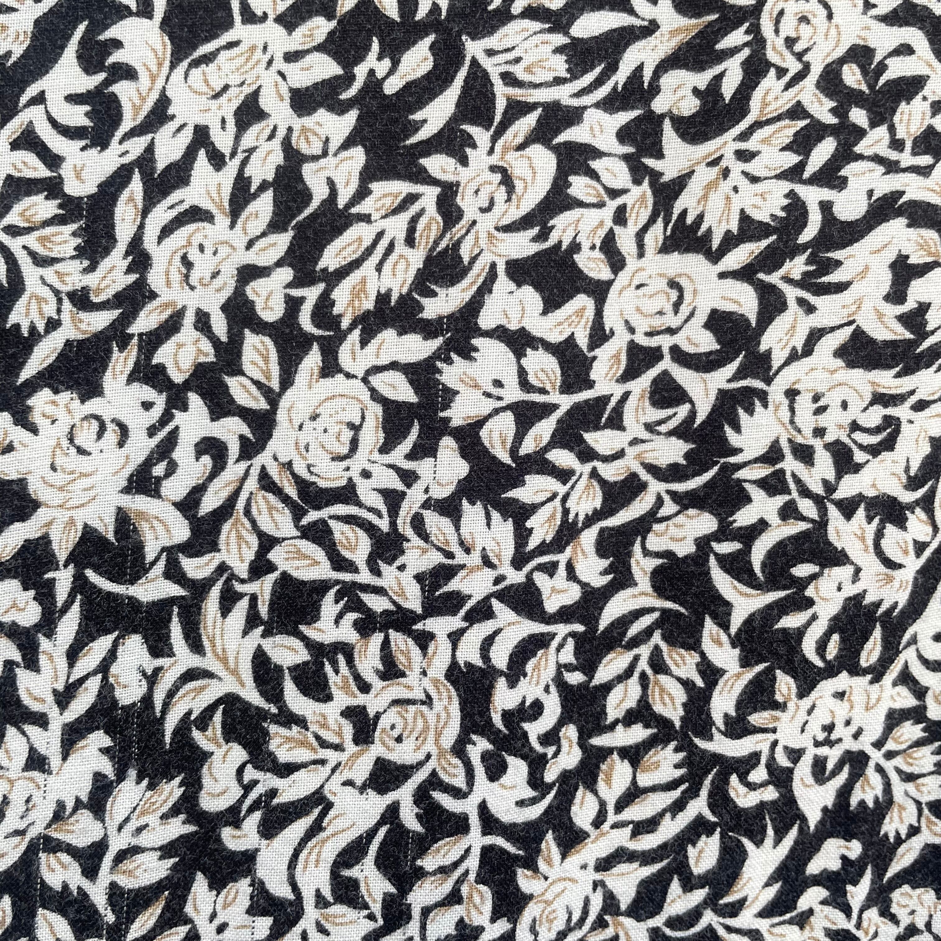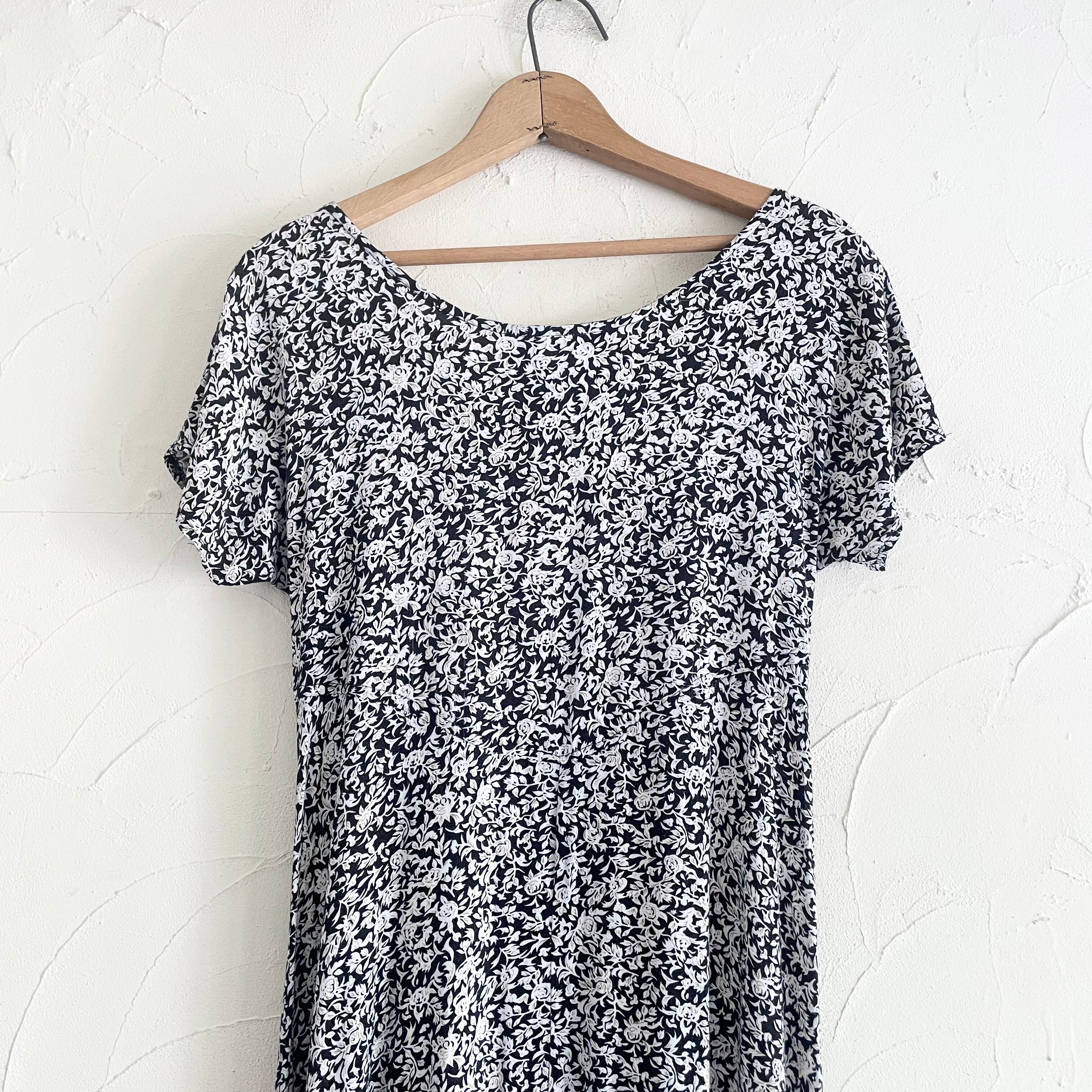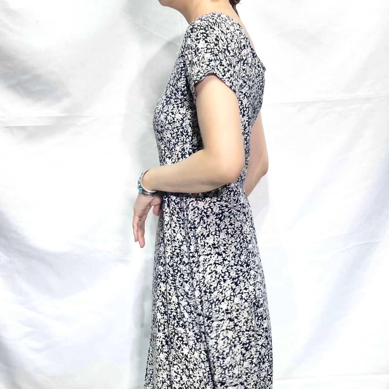 黒地に白、ベージュ花柄のレーヨン100%白レース襟付きアメリカ製マキシ丈半袖ワンピースです。
