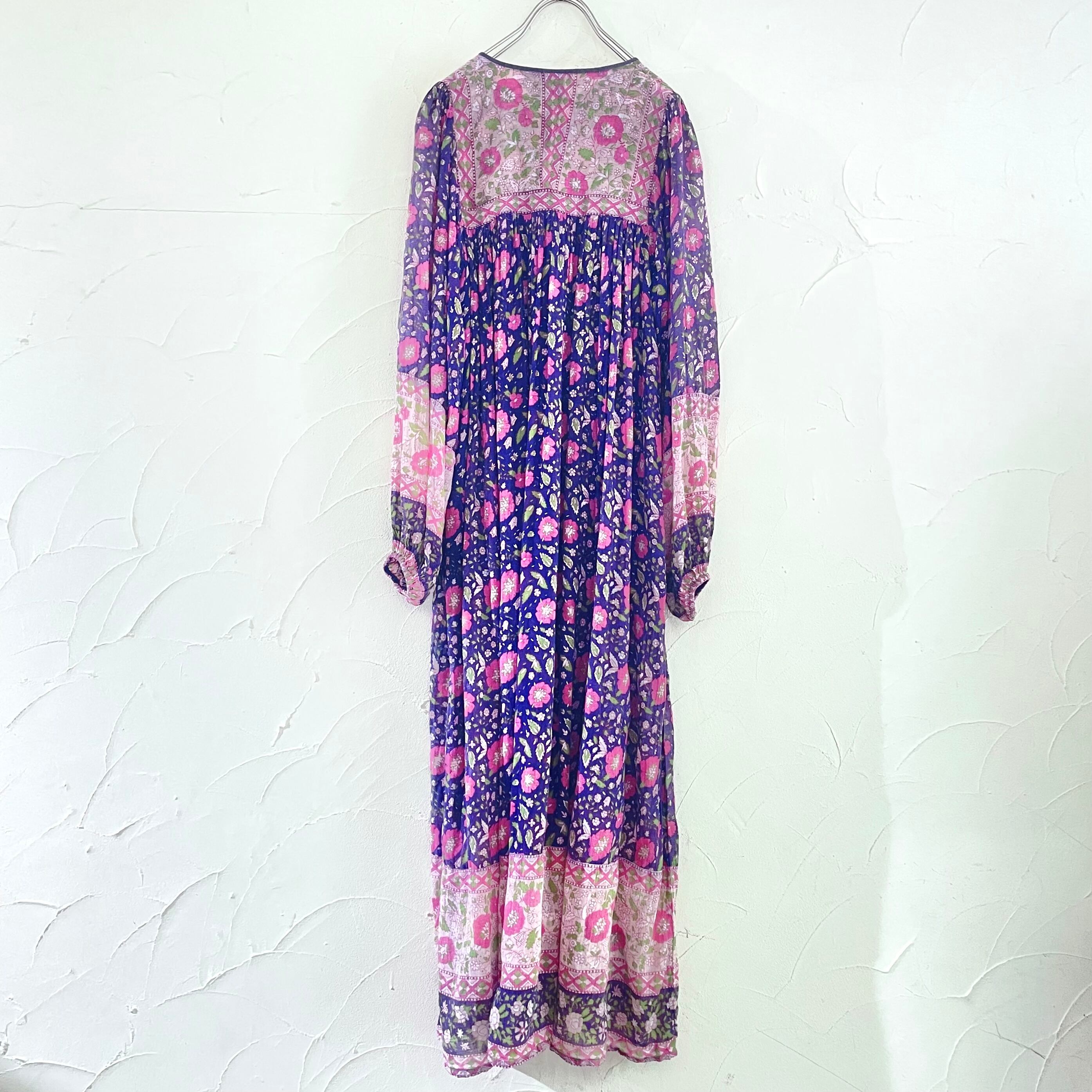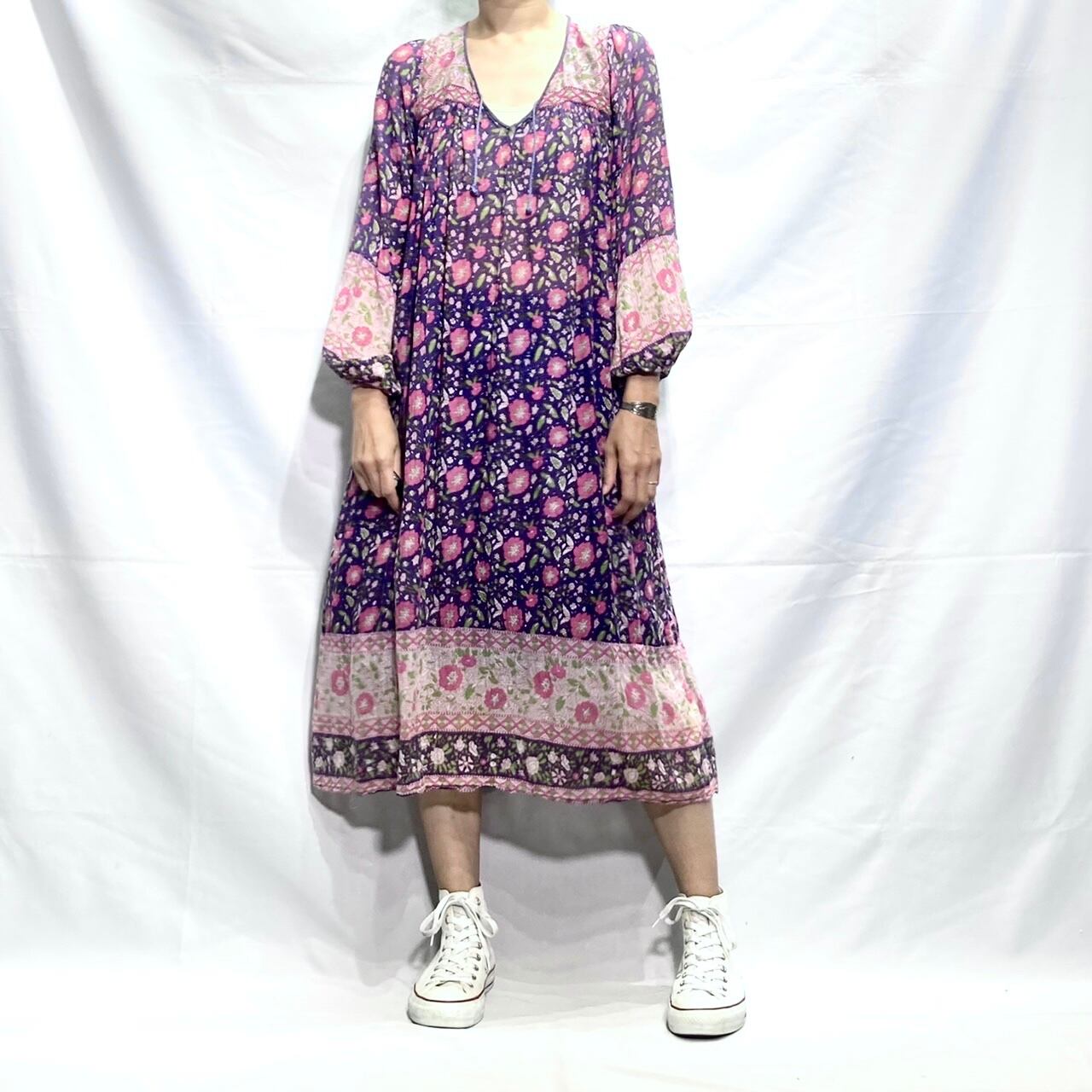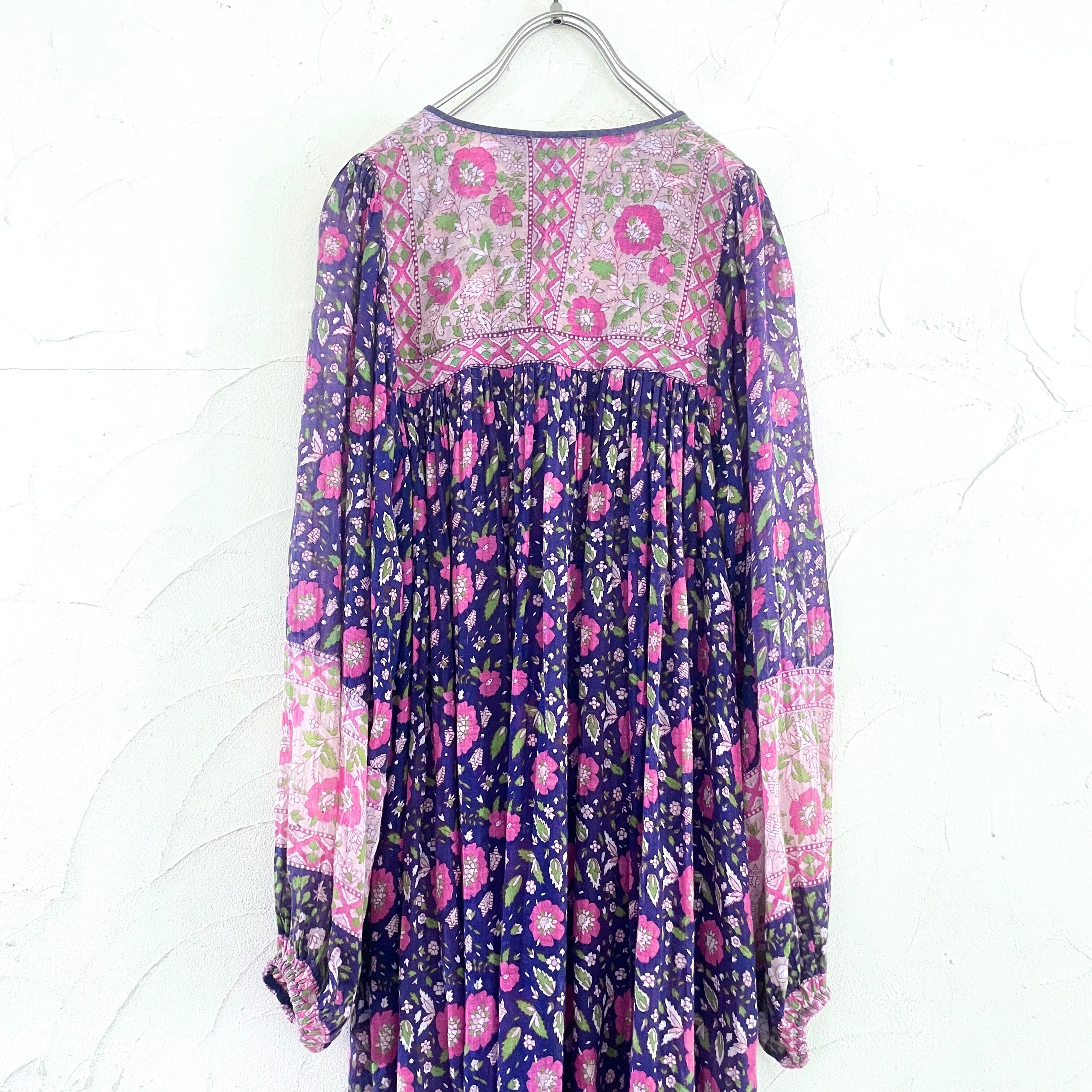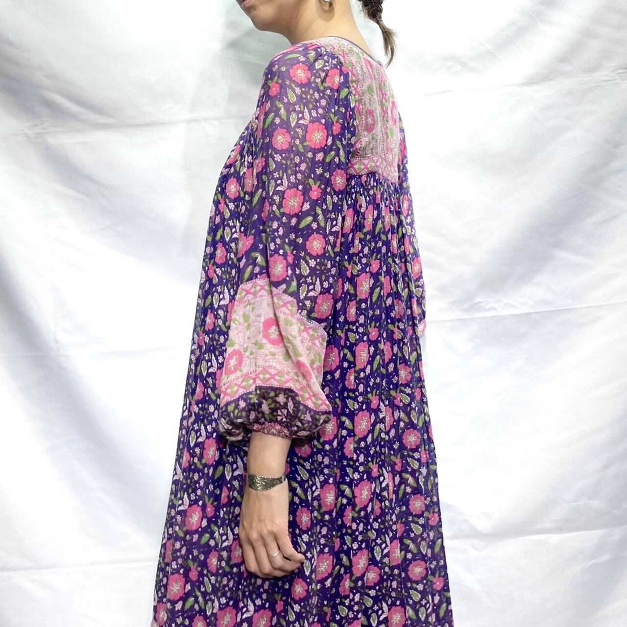 紫地にピンクの花柄、バルーンスリーブがとても可愛い、大変希少な70年代ヴィンテージインド綿ワンピースです。