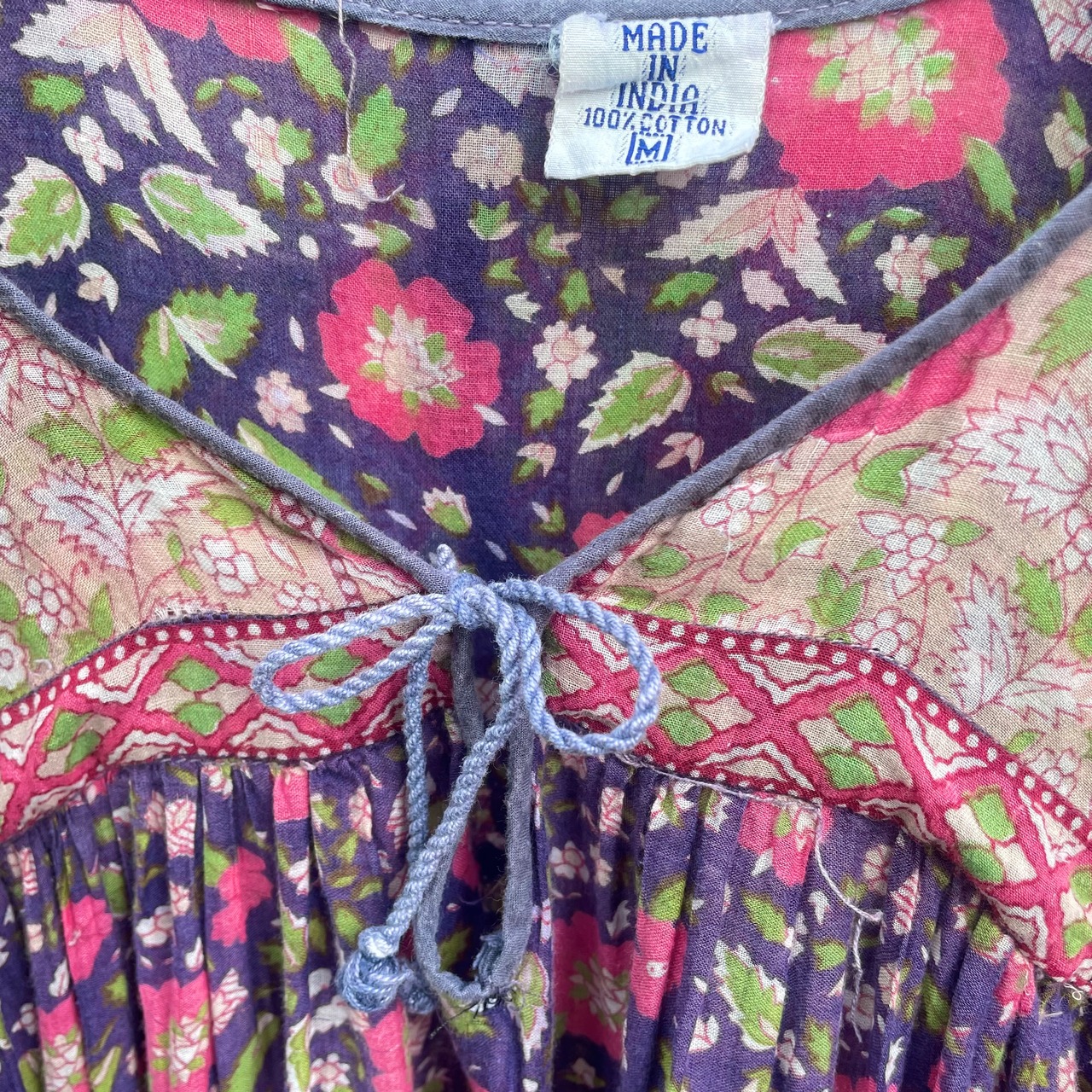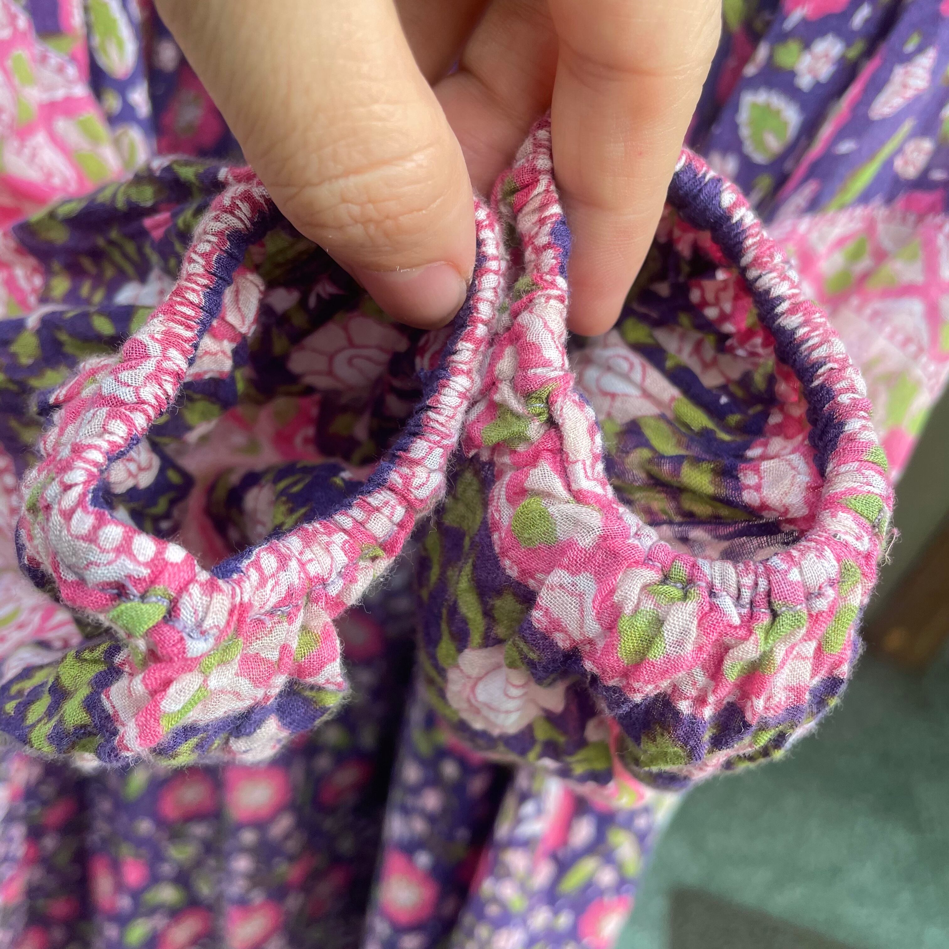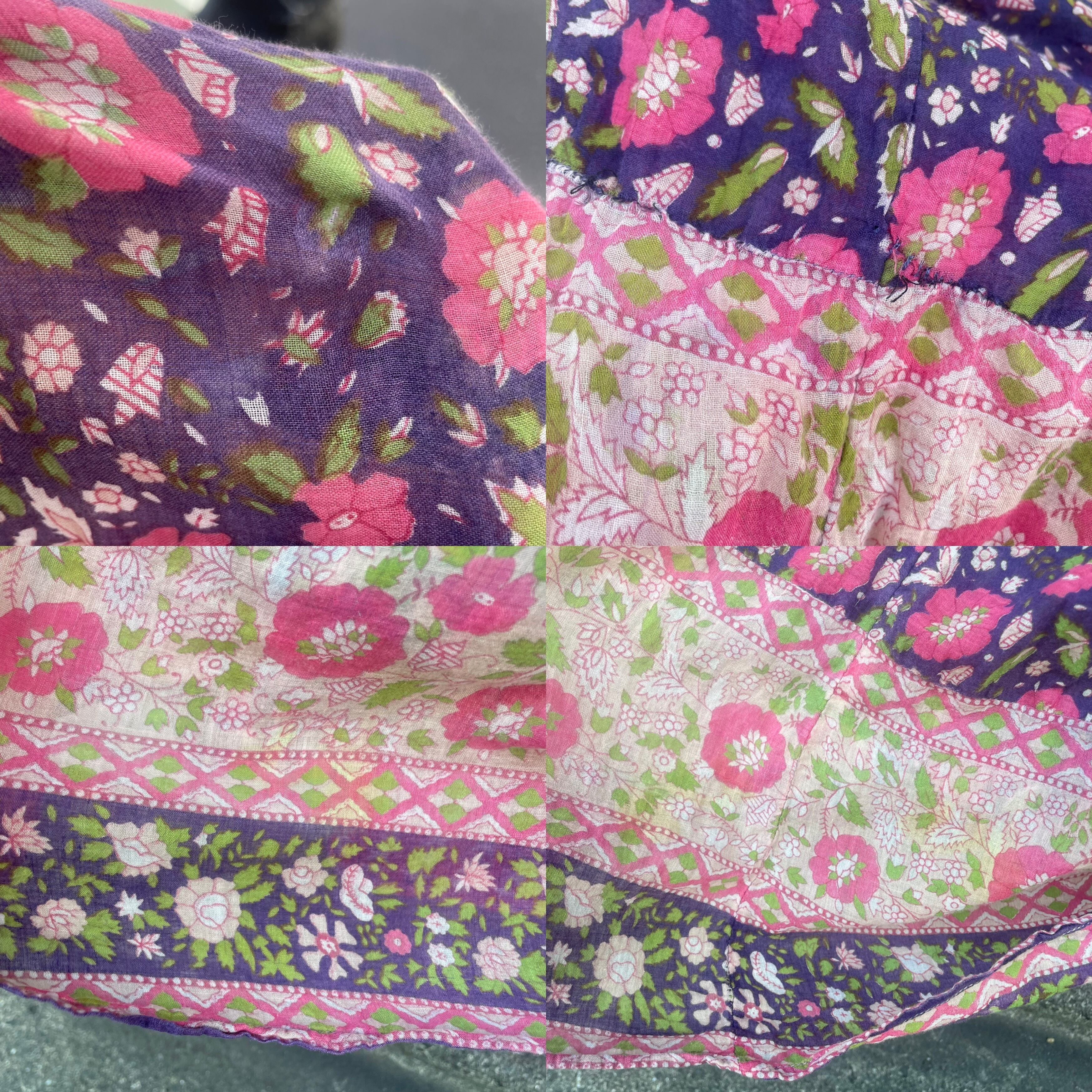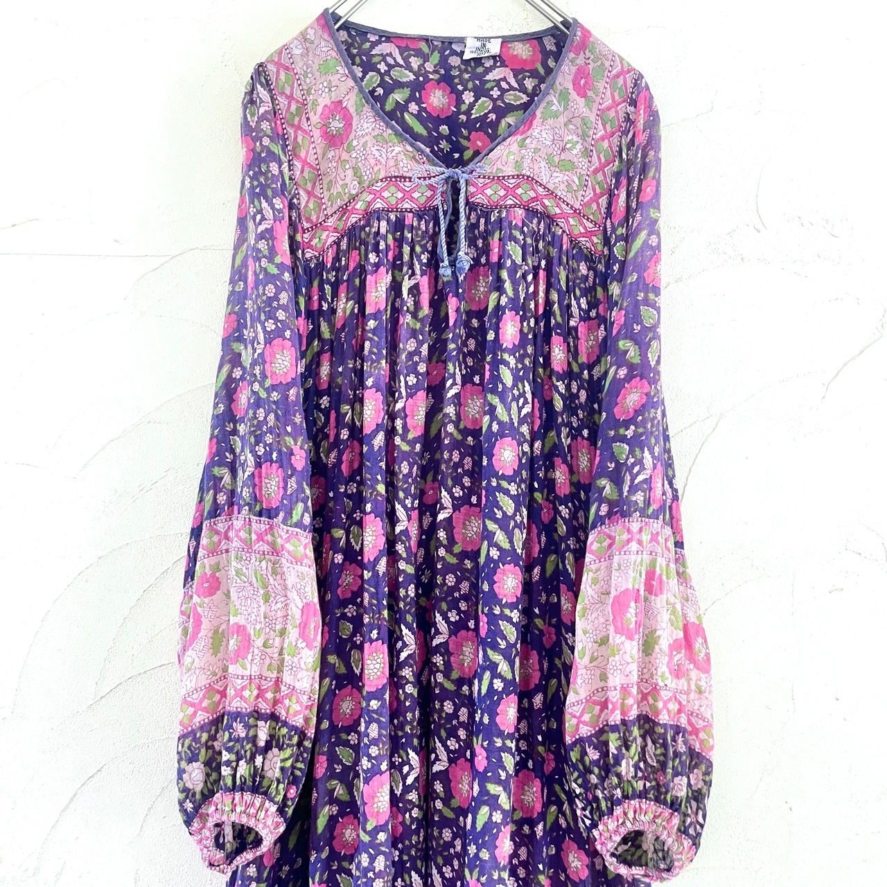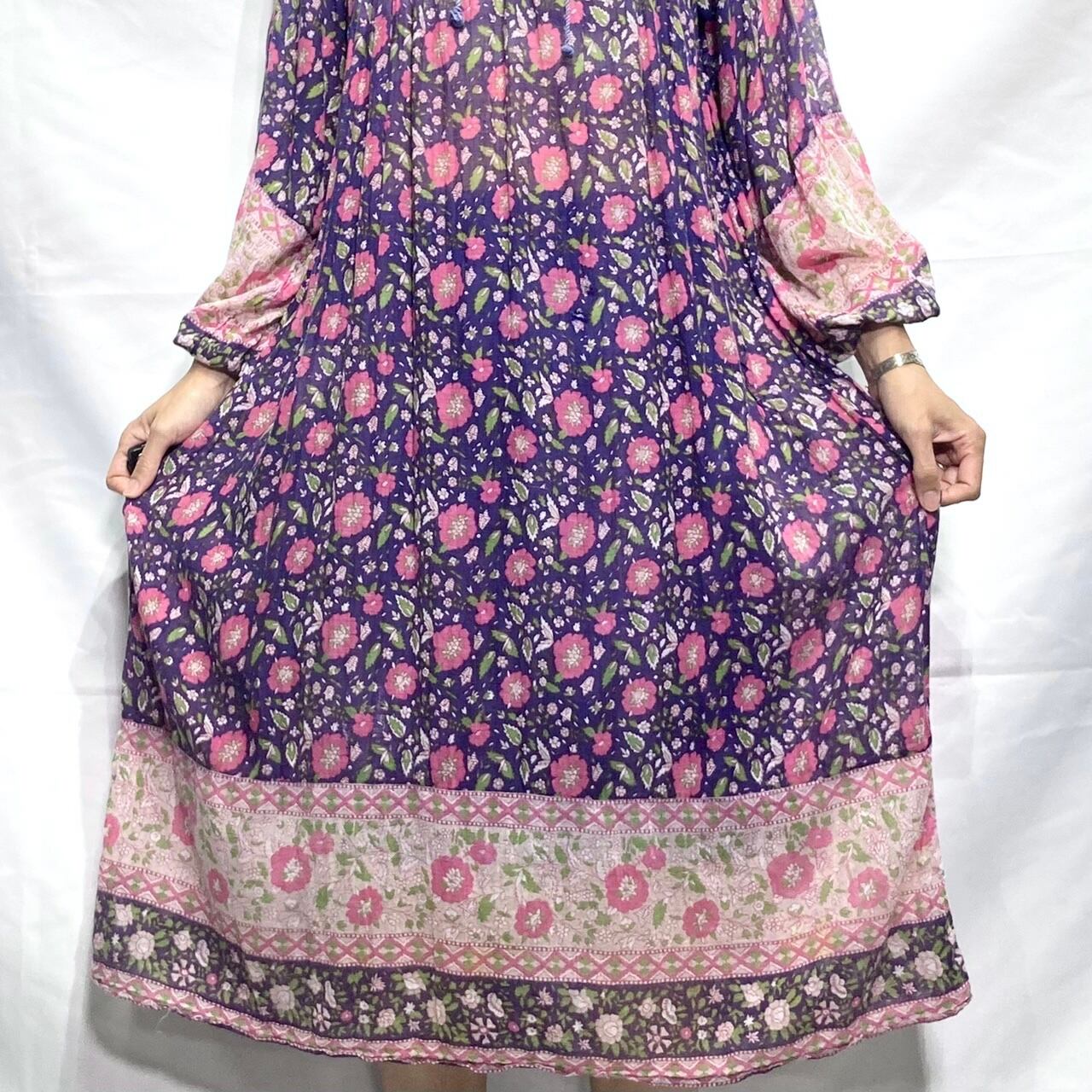 紫地にピンクの花柄、バルーンスリーブがとても可愛い、大変希少な70年代ヴィンテージインド綿ワンピースです。
