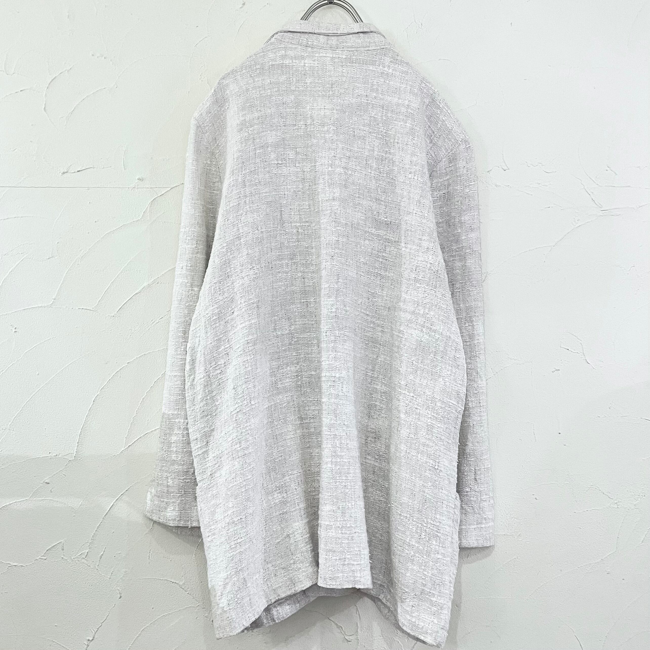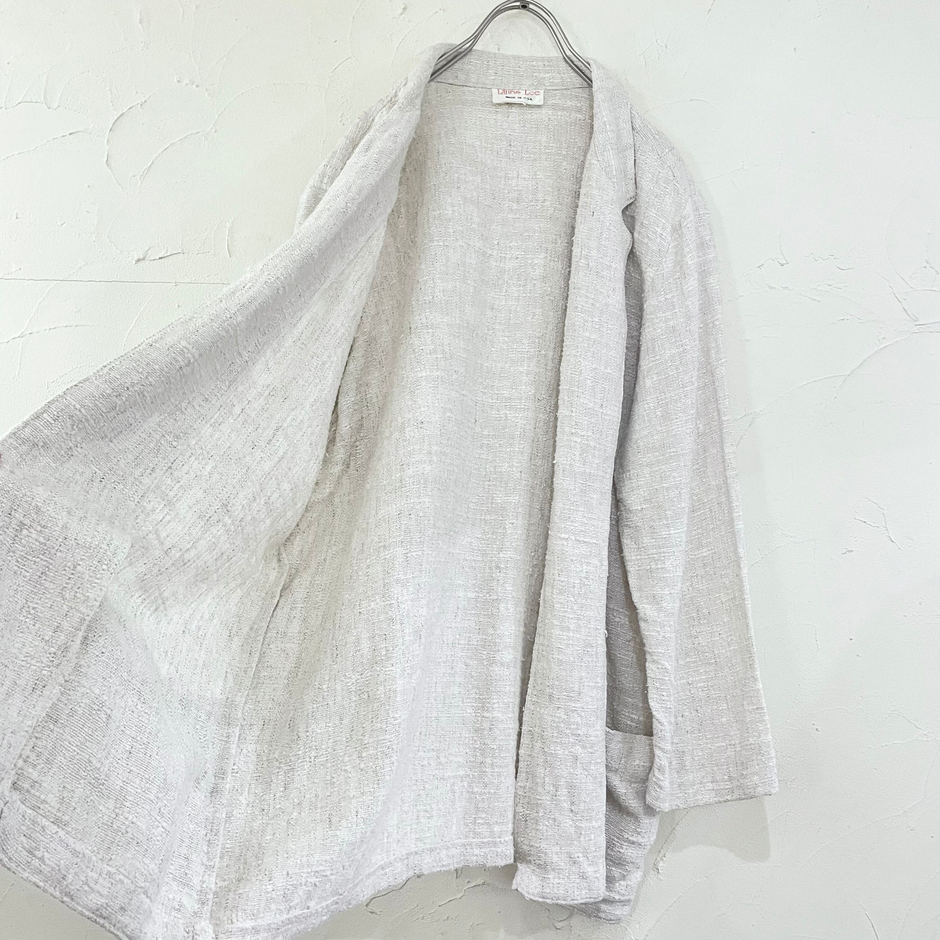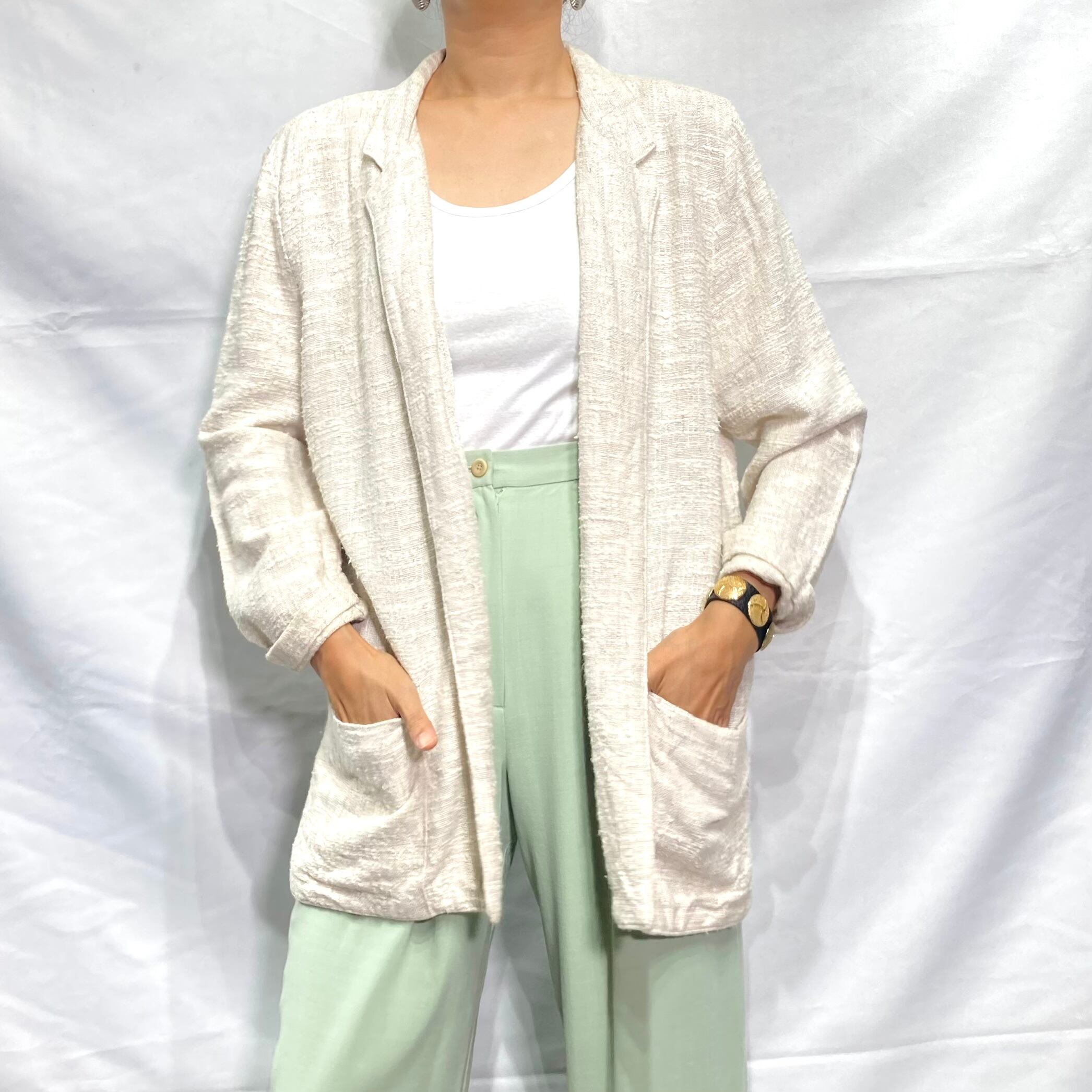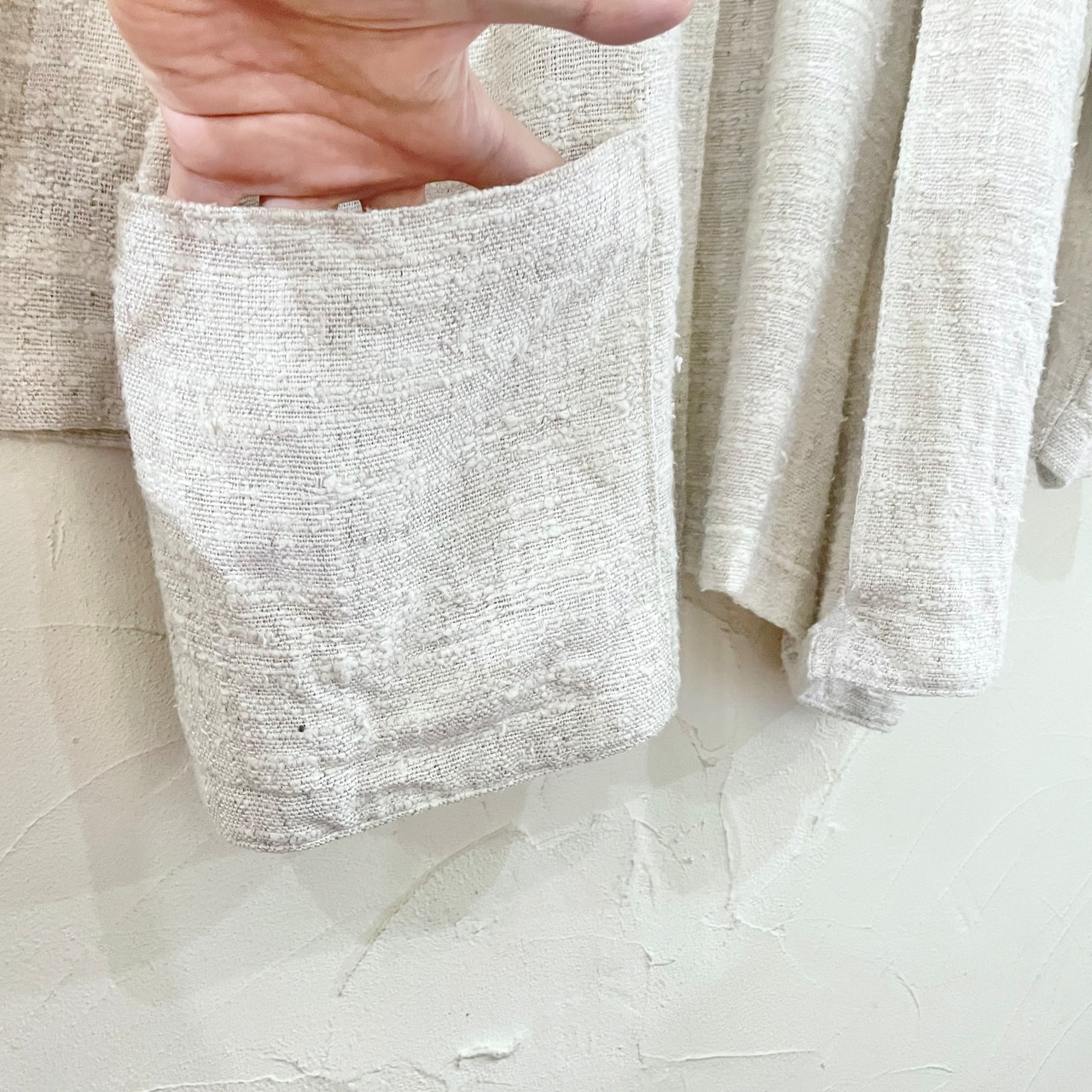 リネンとコットンレーヨンが混じったような素朴な素材のアイボリーオープンテーラードジャケットです。ポケット付き。