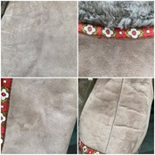 花模様のチロリアン風装飾とふさふさのボアがかわいらしい、やわらかくて暖かいリアルシープスキンのムートンベストです。
