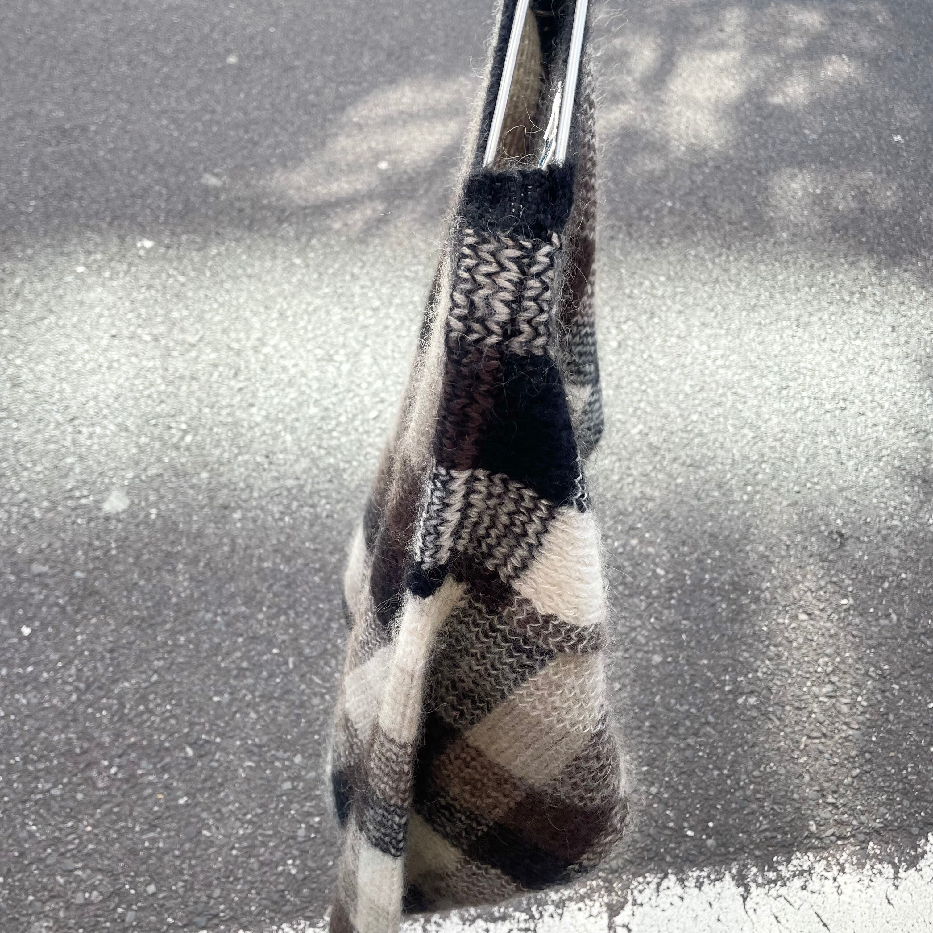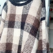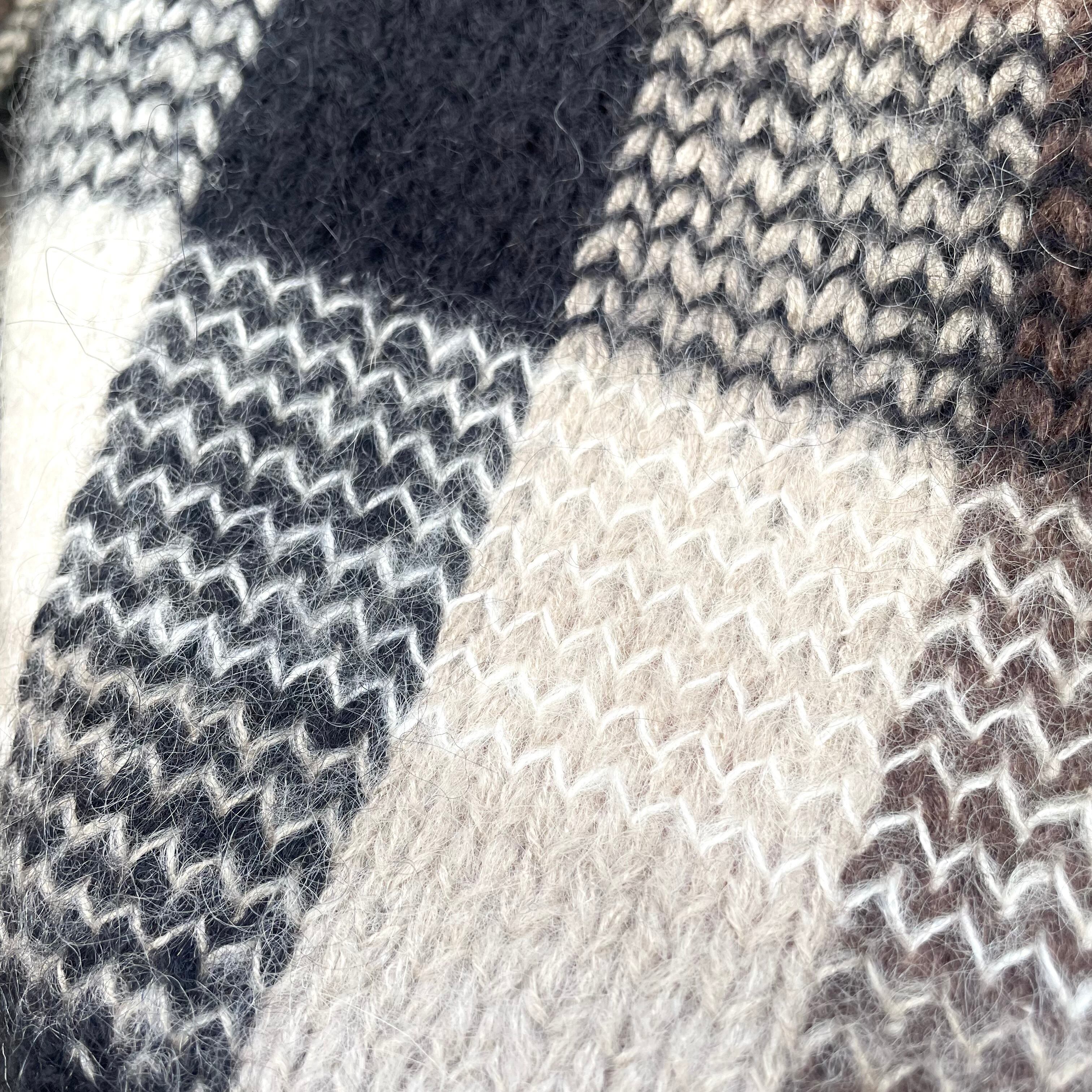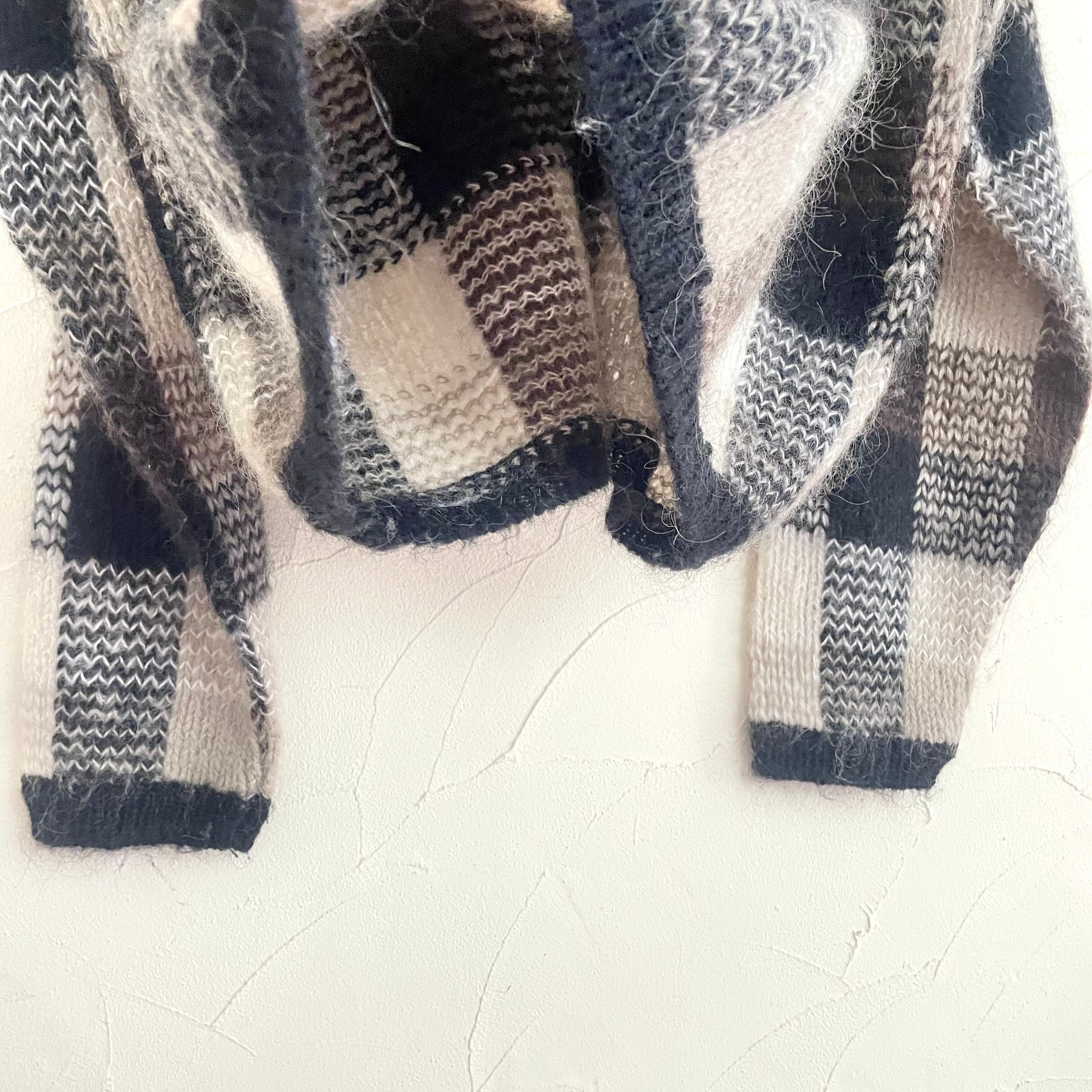モヘア/アクリル混合素材のふわふわな黒、白、茶色チェック柄ニットです。