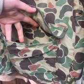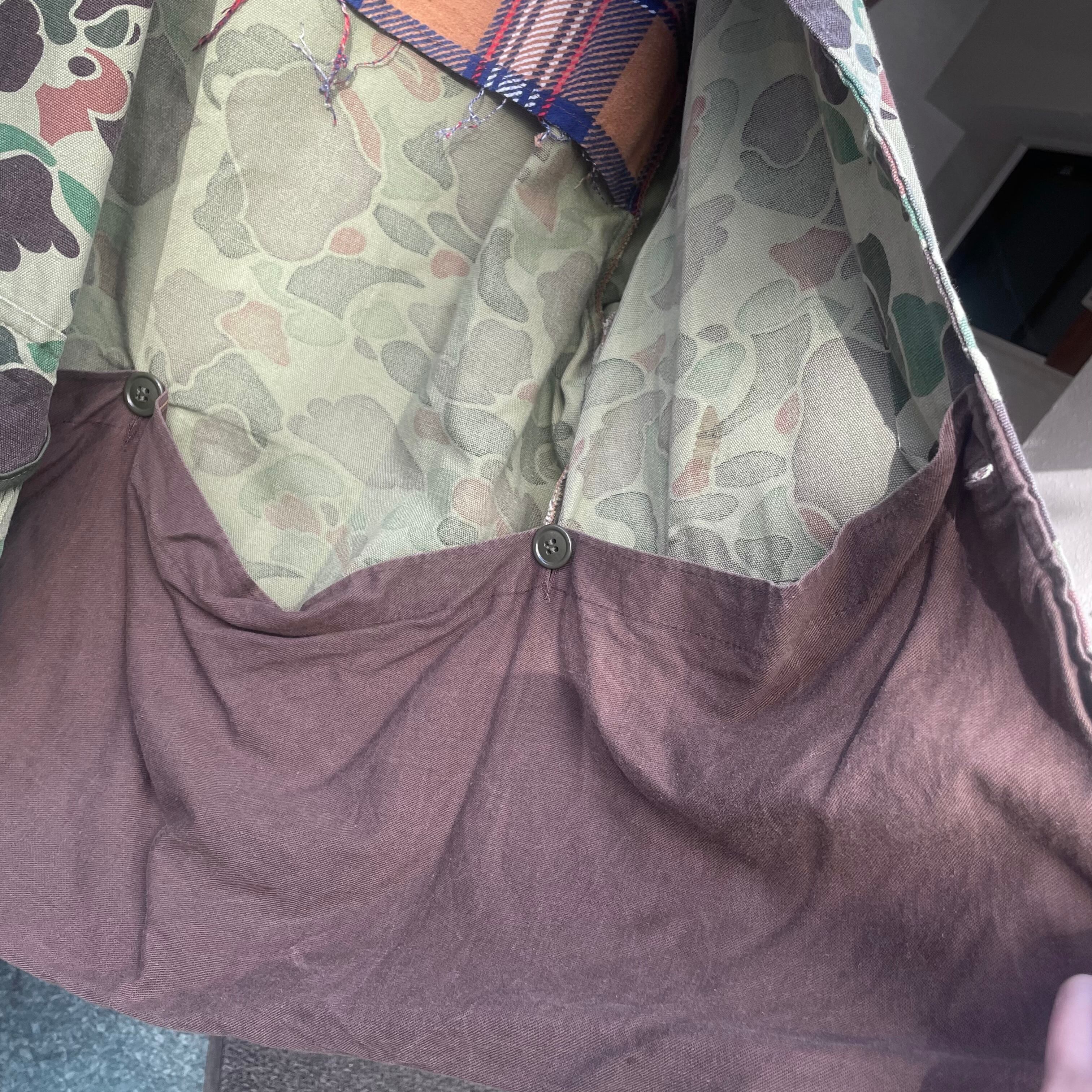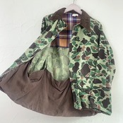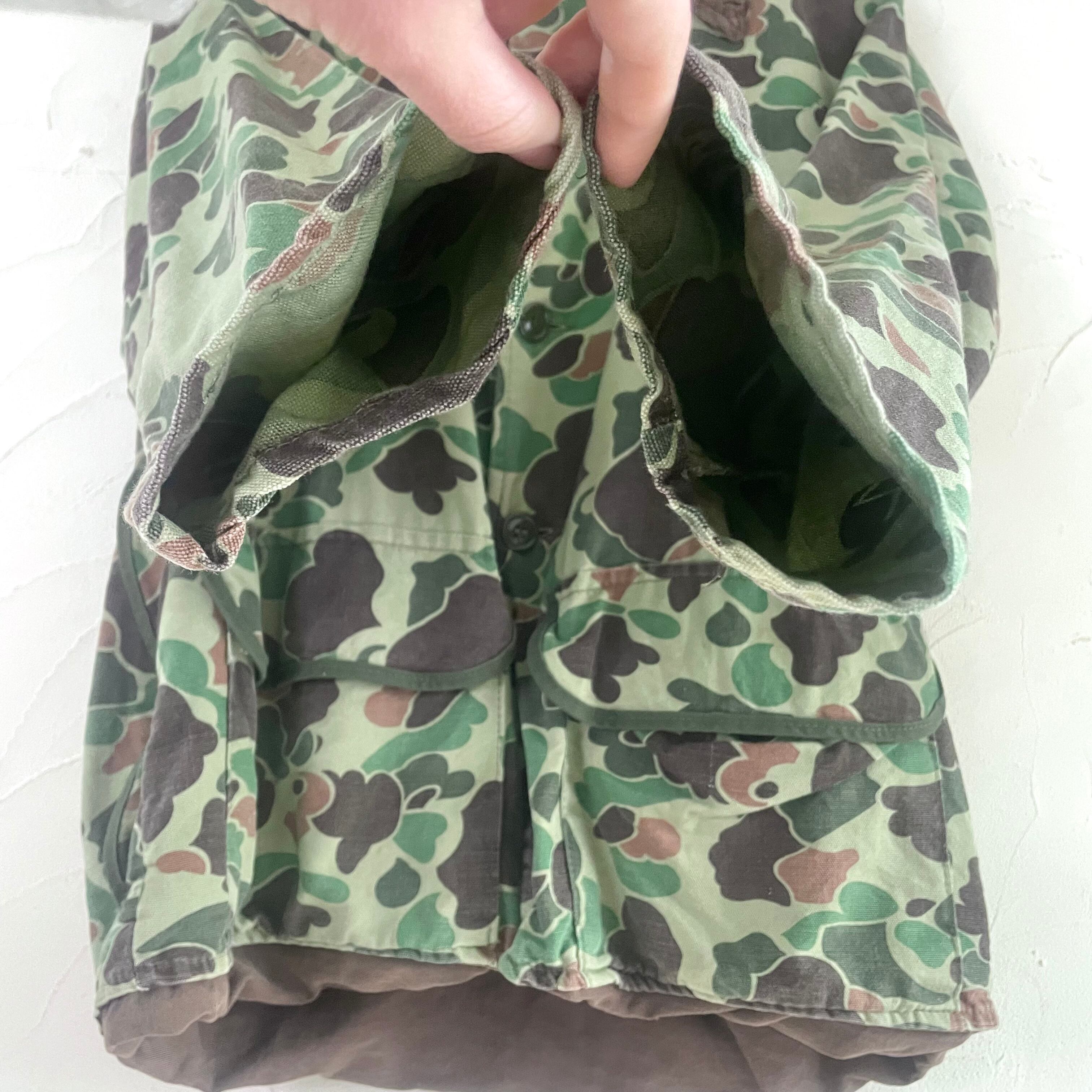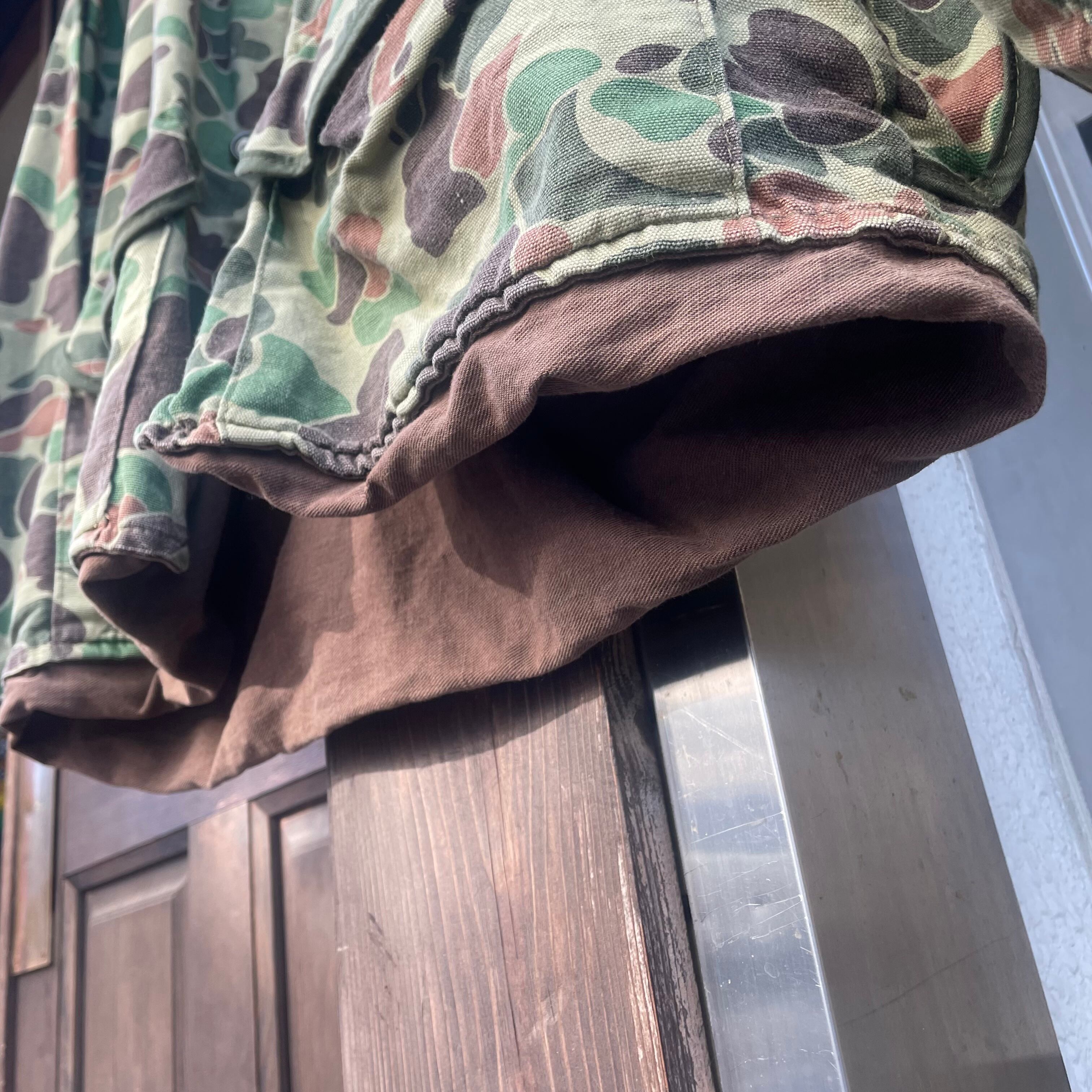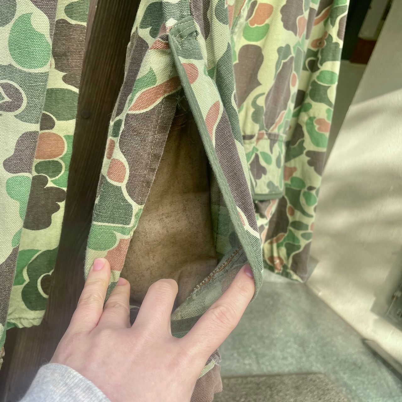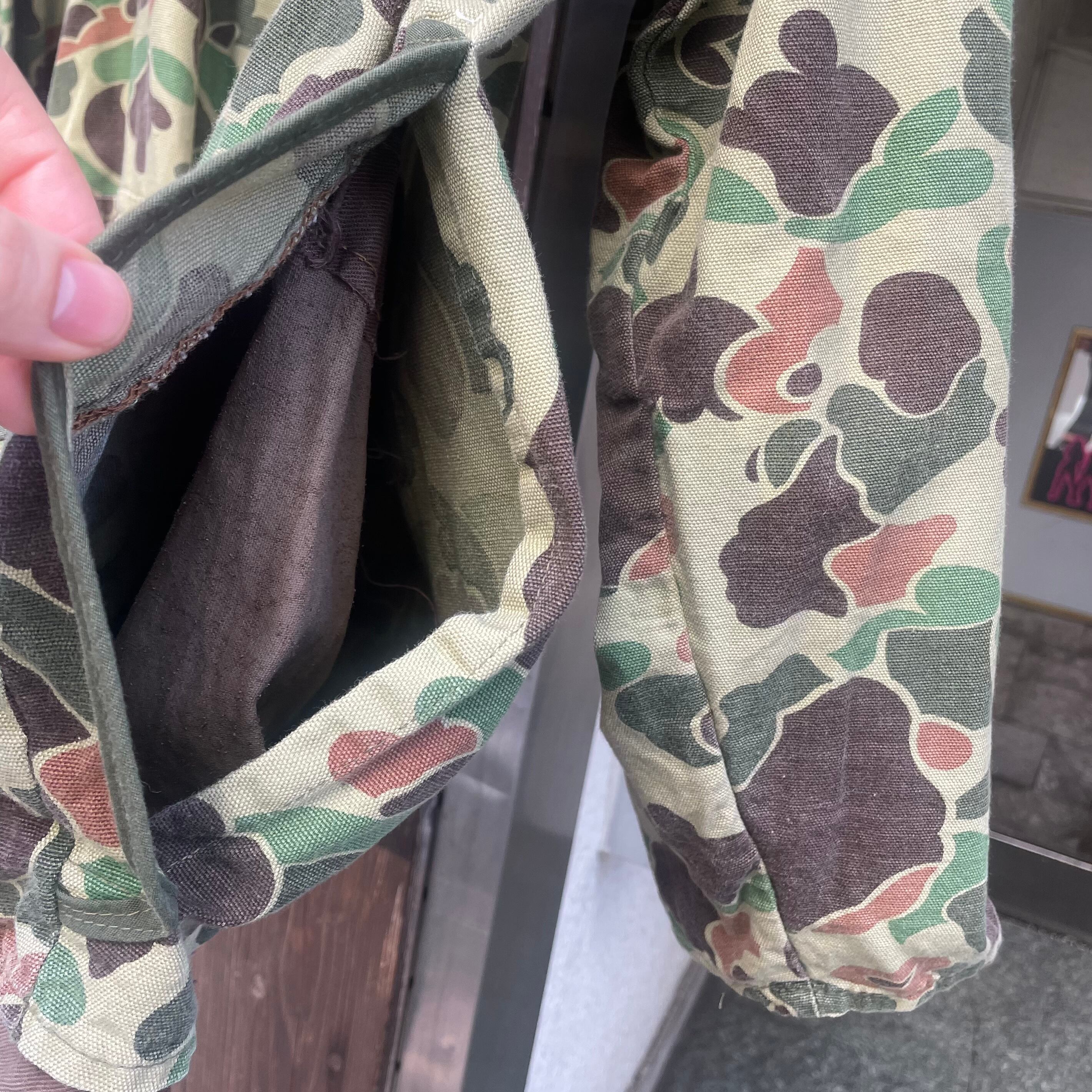 ダックハンターカモ柄ヴィンテージハンティングジャケットです。フロントポケットの他に後ろ脇サイド、裏側腰位置に1周ゲームポケット付き