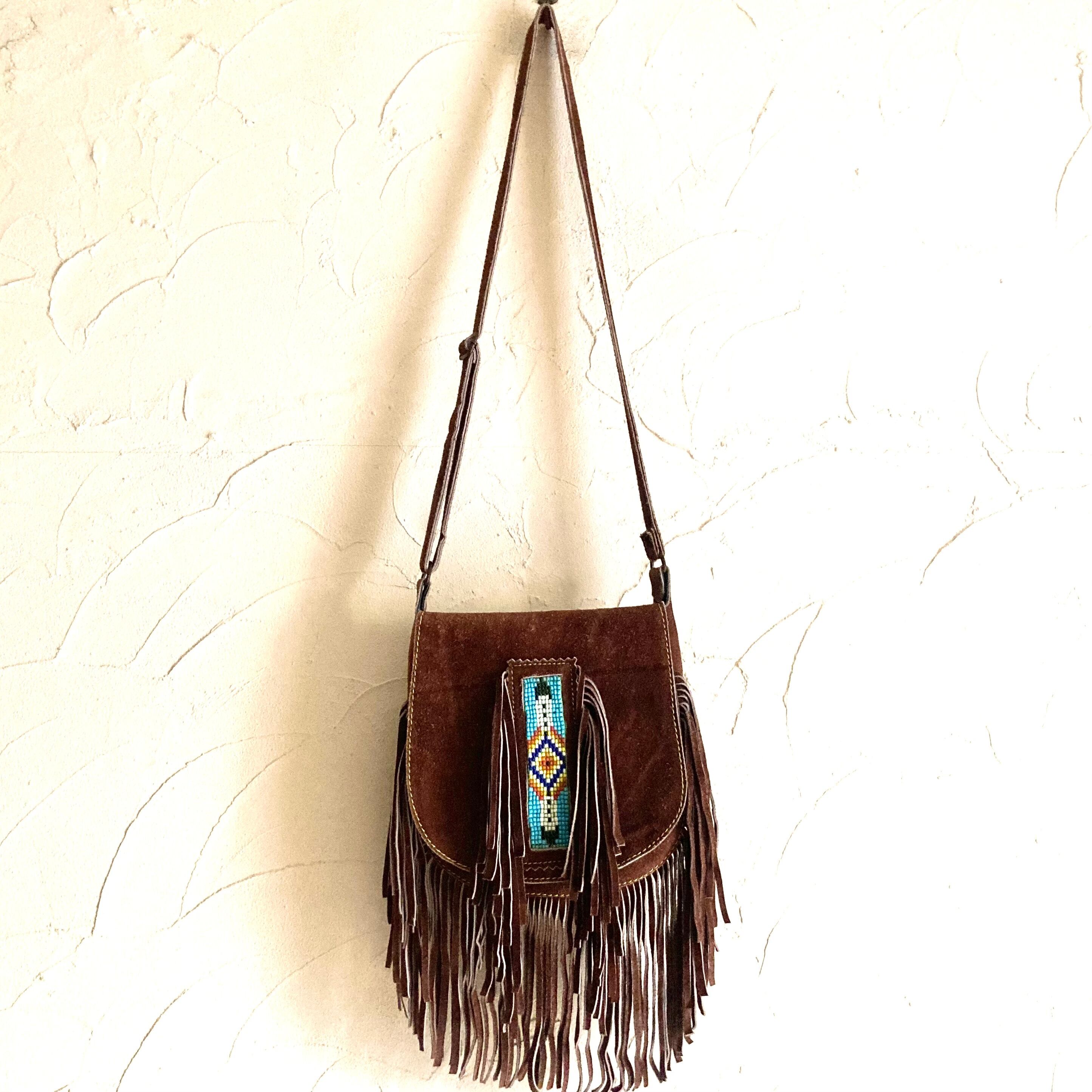 長めのフリンジ、凝ったビーズデザインがとっても可愛いスウェードバッグです。