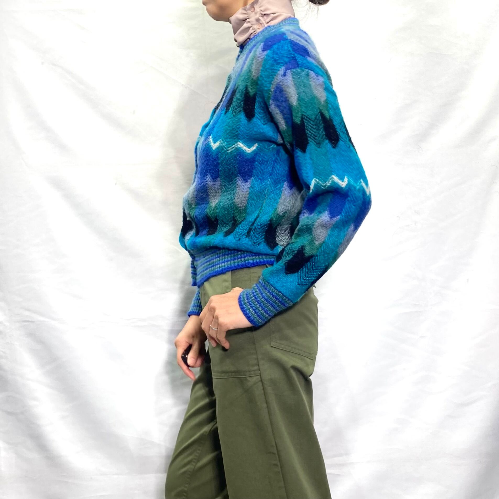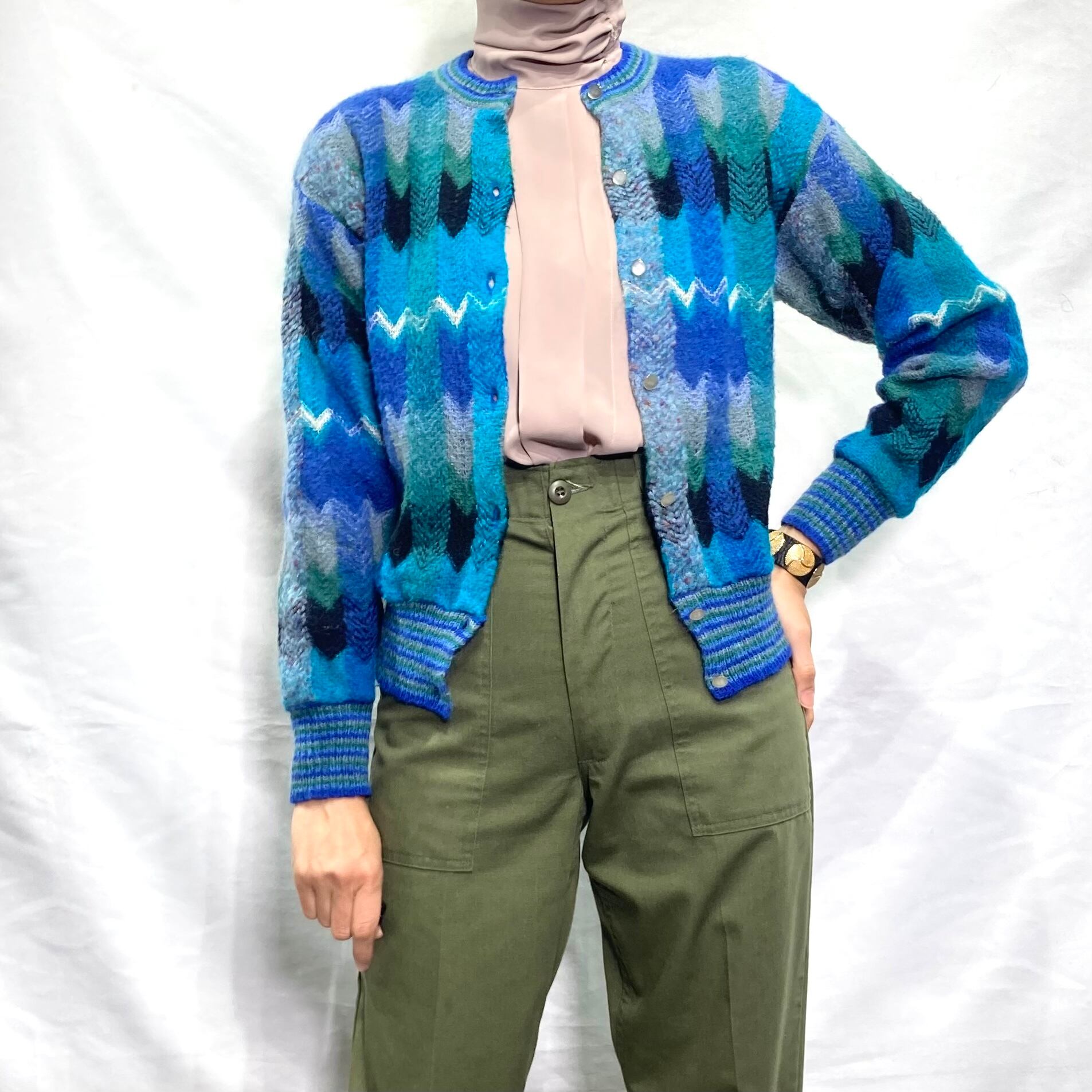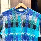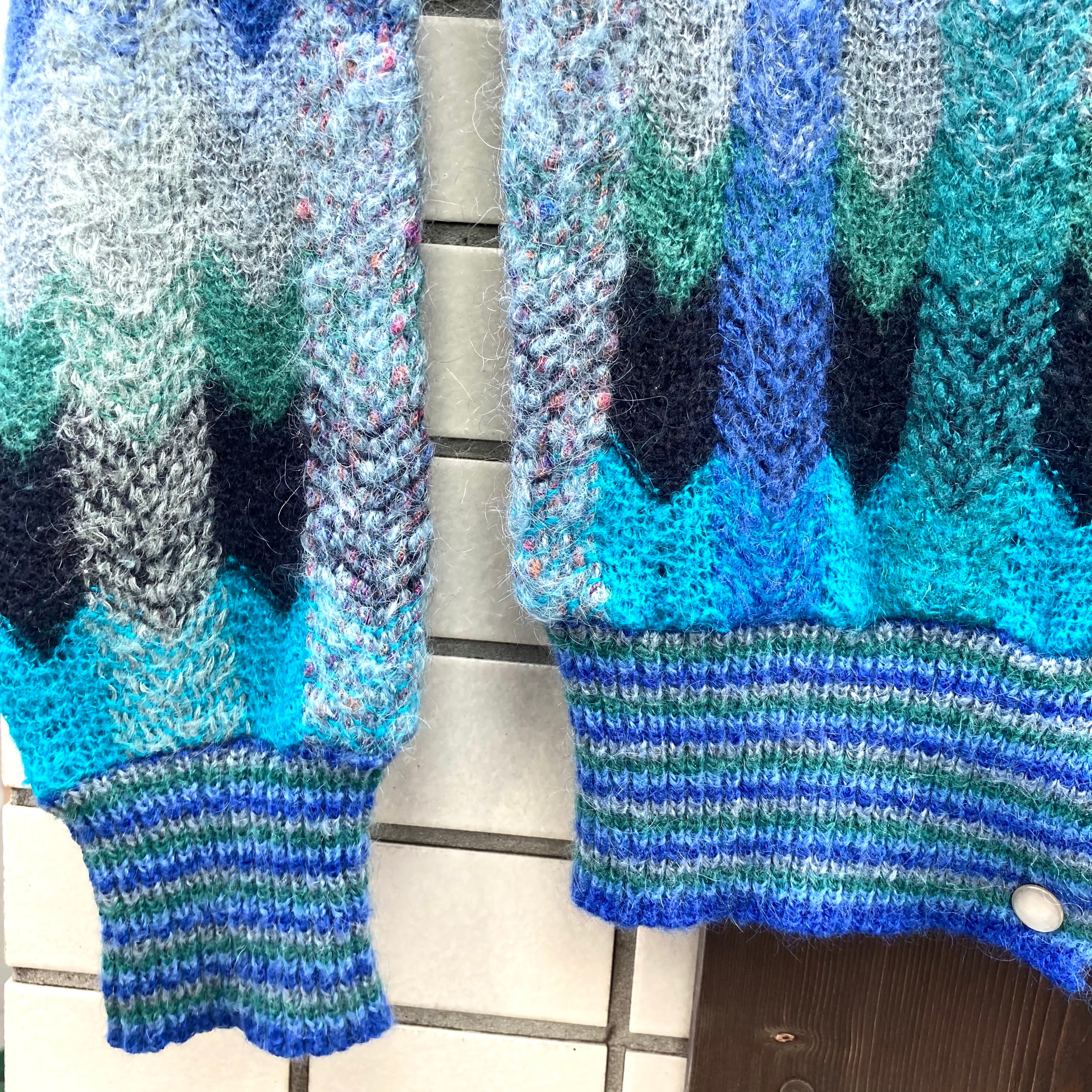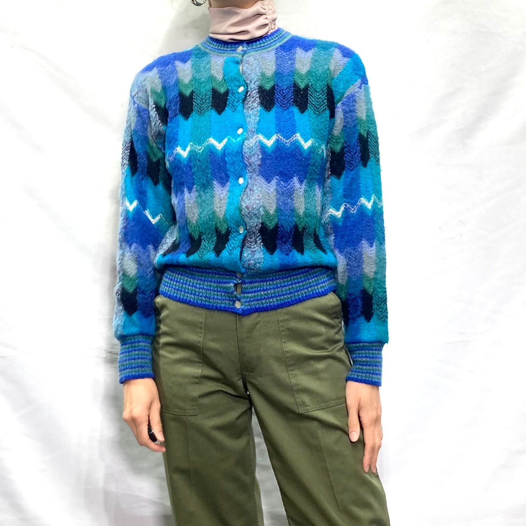 ジグザグ模様が可愛いブルー系ジャガードニットカーディガンです。モヘア39%ミックス。