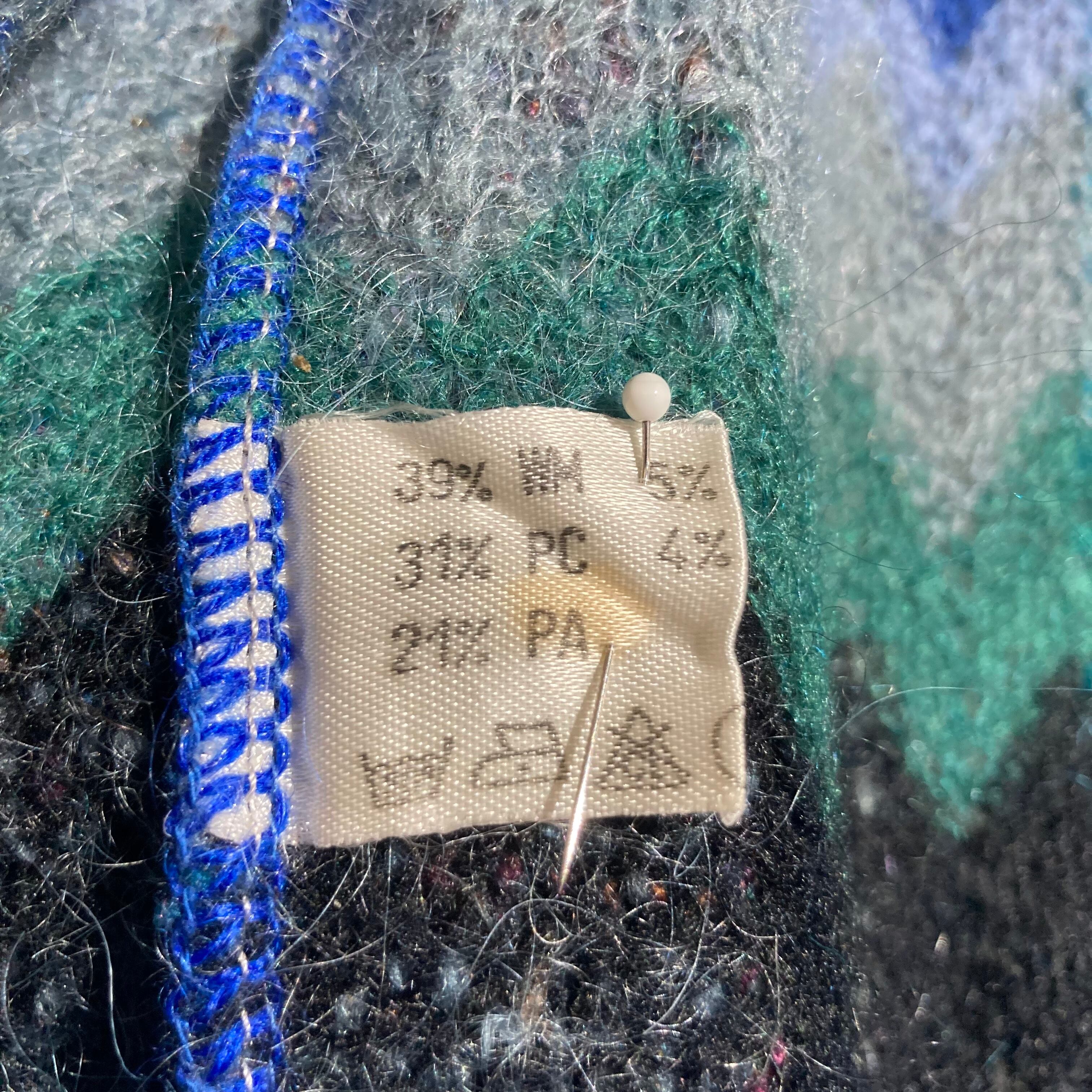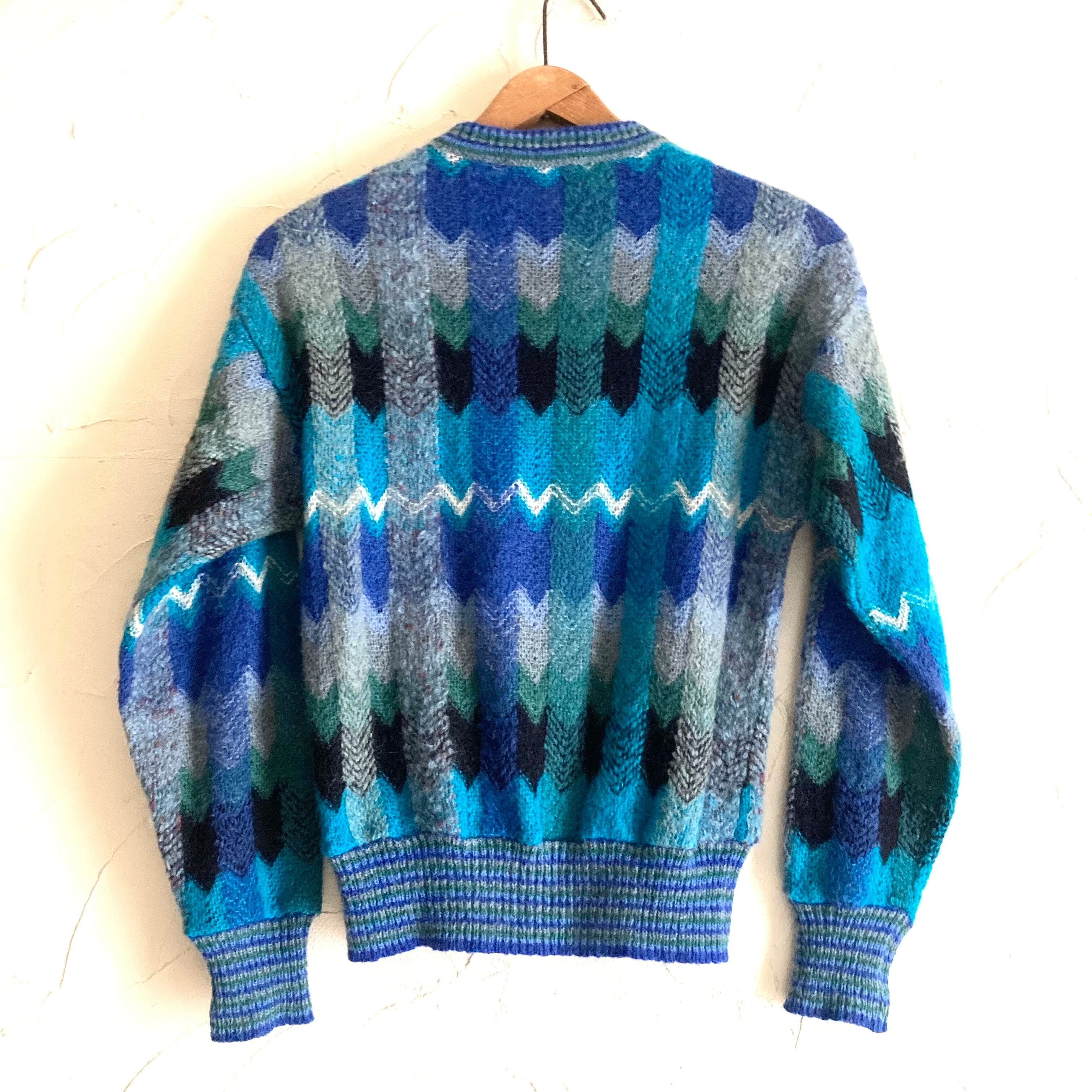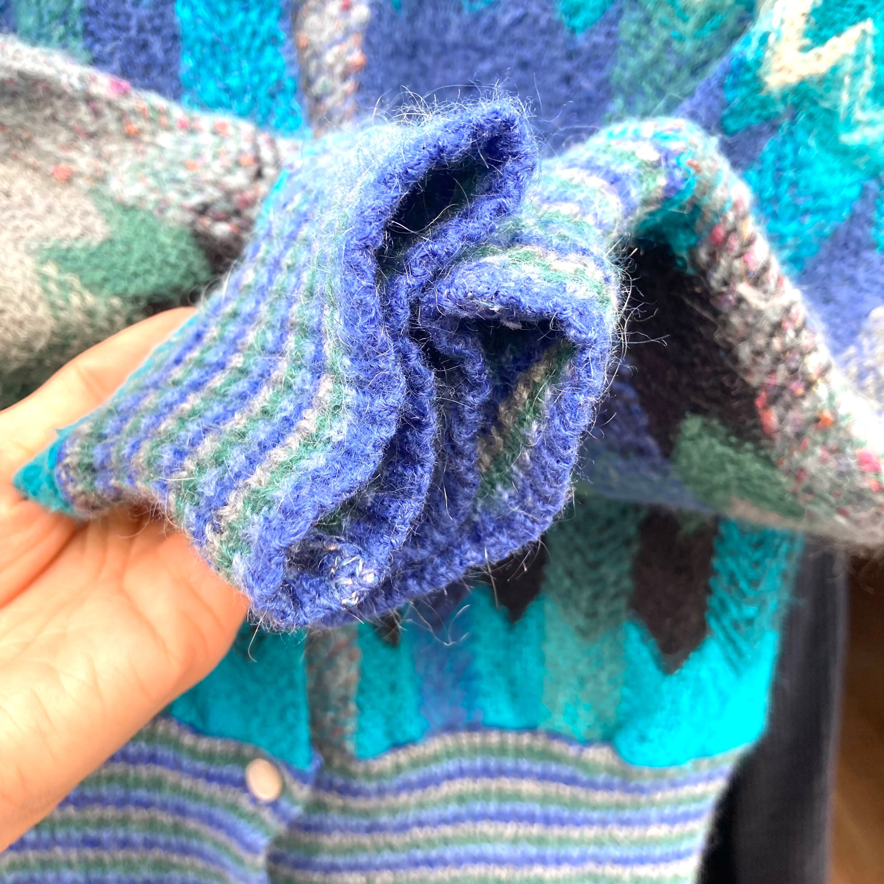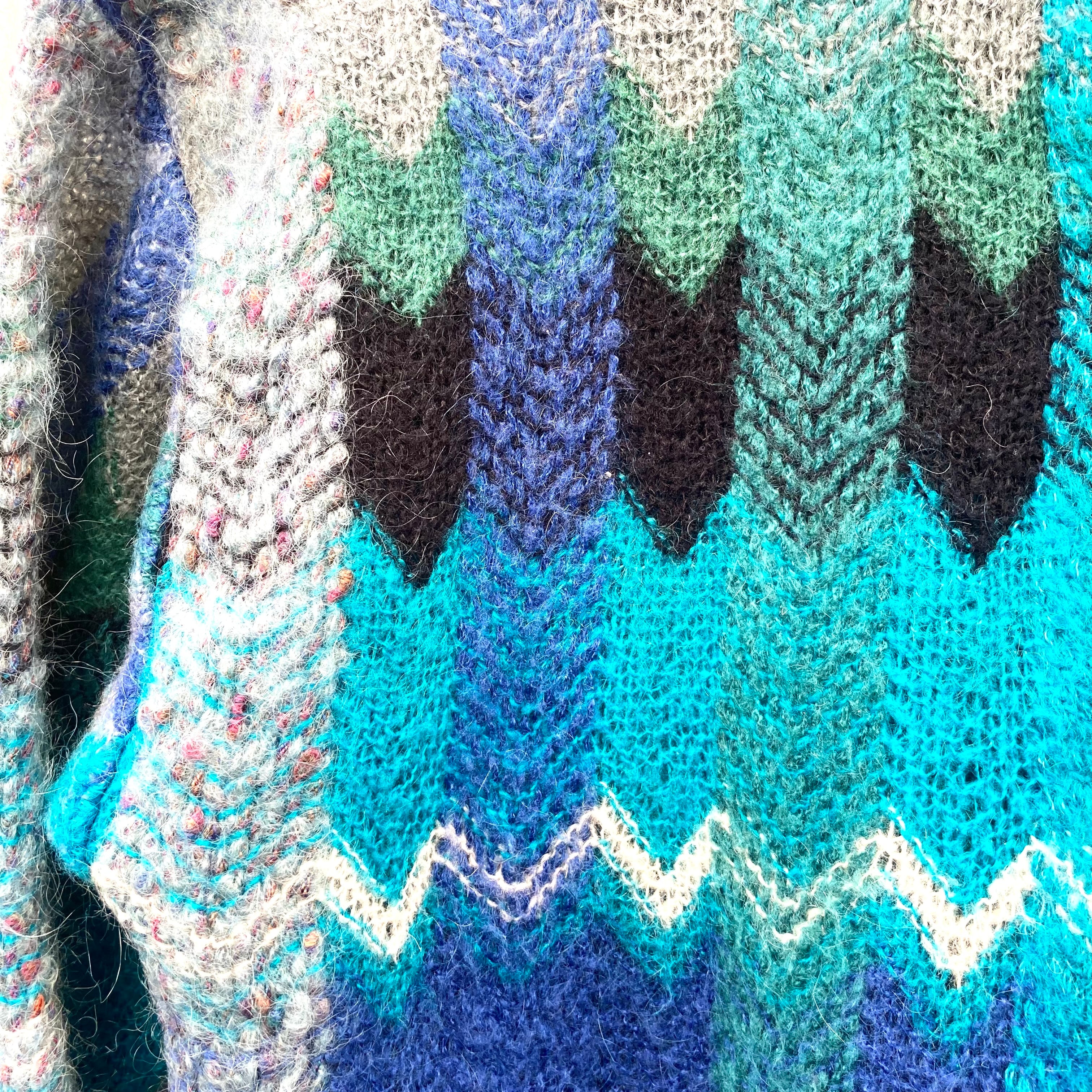 ジグザグ模様が可愛いブルー系ジャガードニットカーディガンです。モヘア39%ミックス。