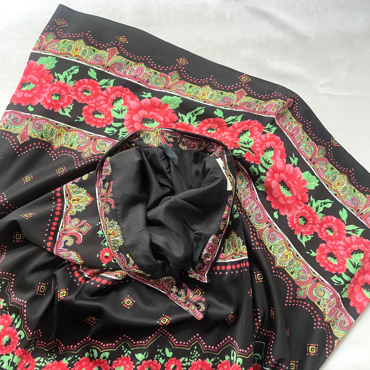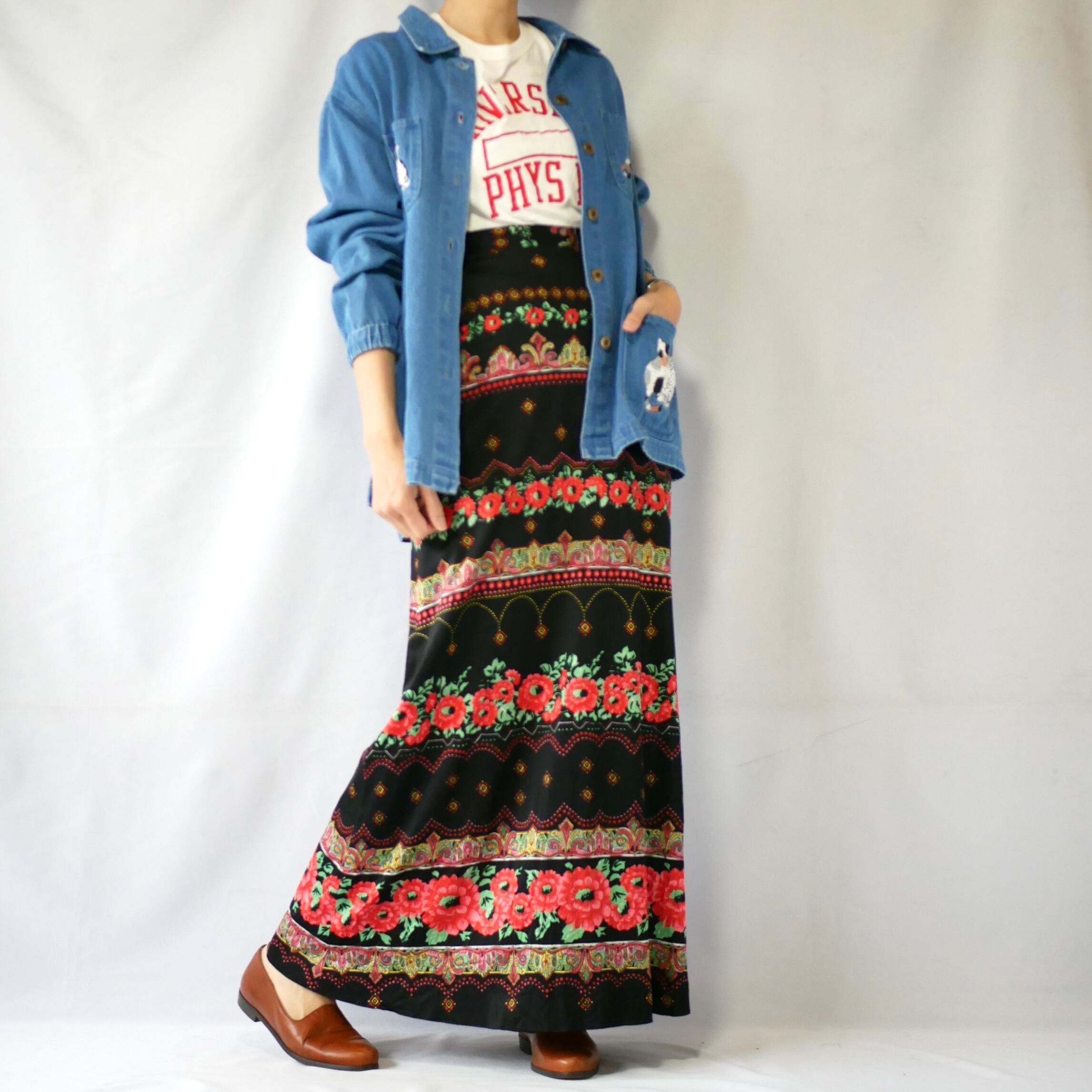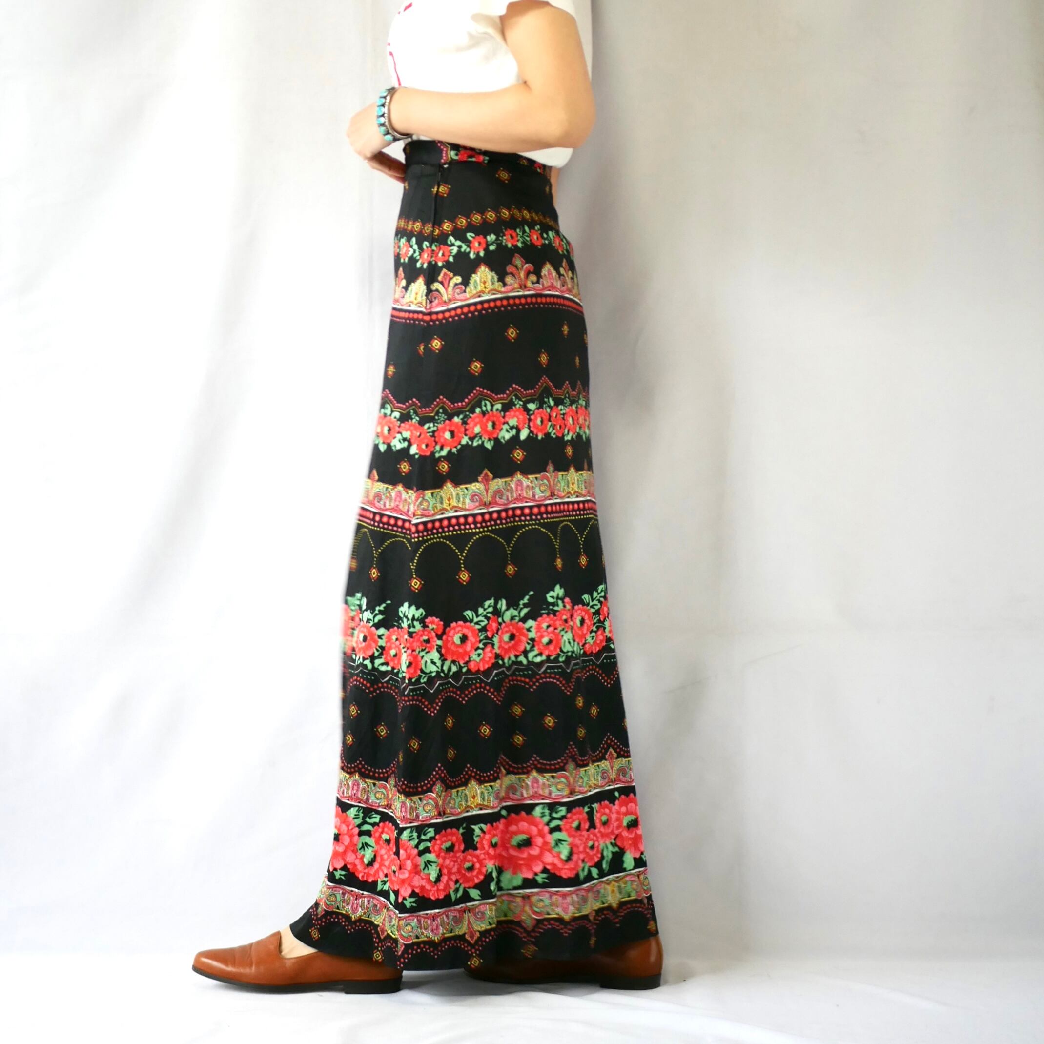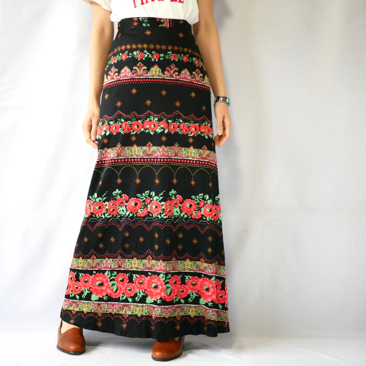 70年代頃の ヨーロッパヴィンテージ 黒花柄 マキシ丈スカートです。ポリエステルかナイロンの様な生地感です。裏地付き。opti zipper
