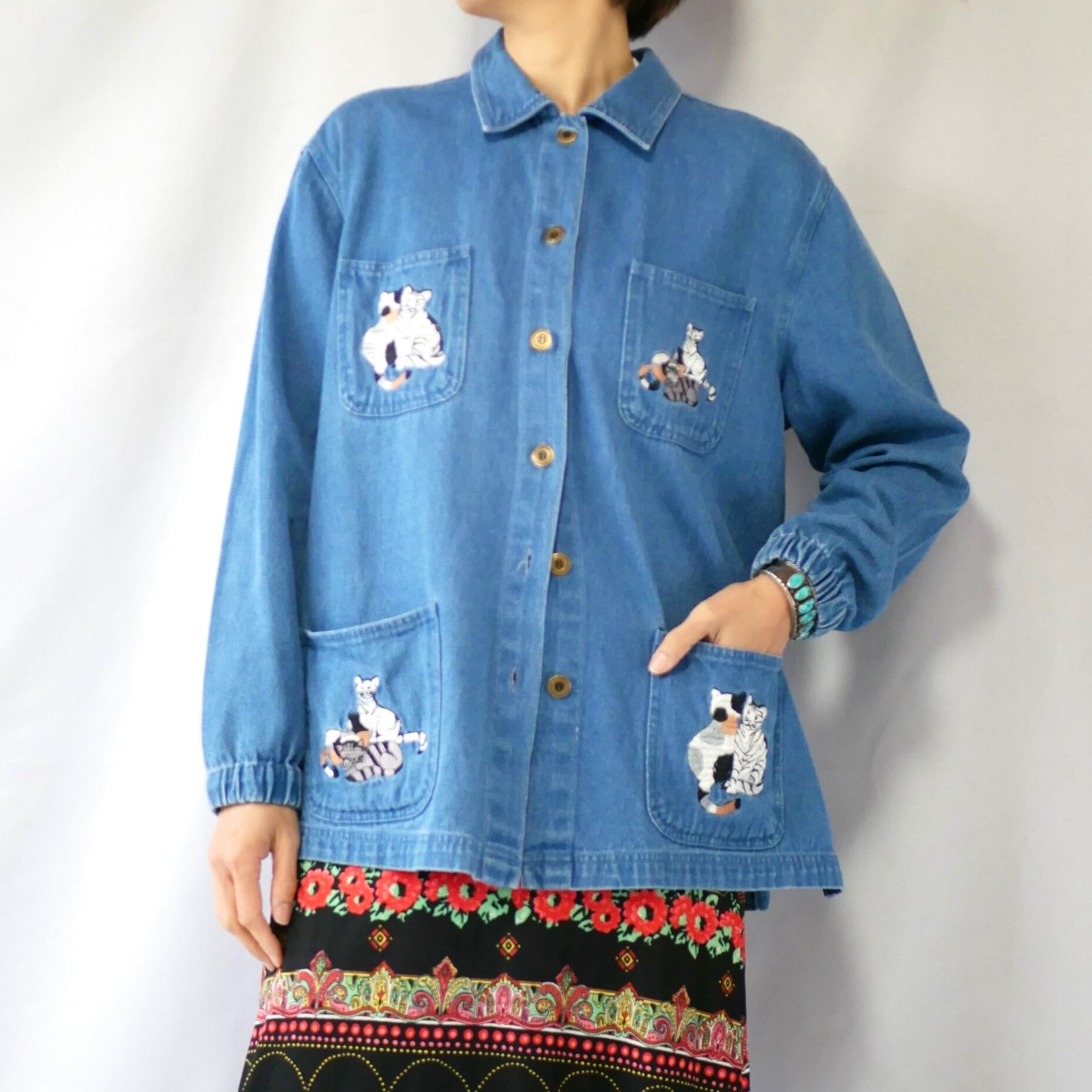 4つのポケット全てに猫の刺繍が施されたデニムジャケットです。同じ2匹の猫、3匹の猫が斜めに配置されています。