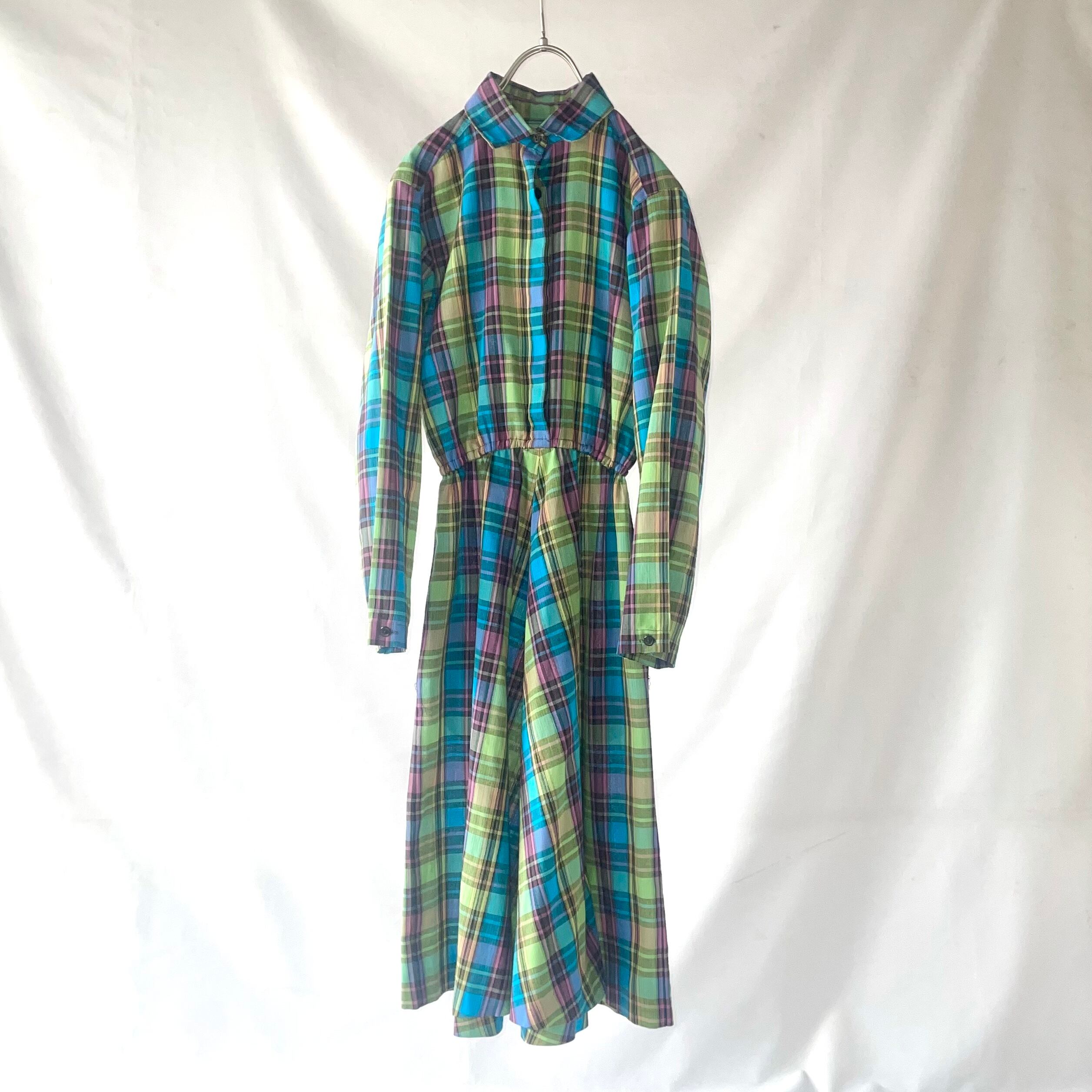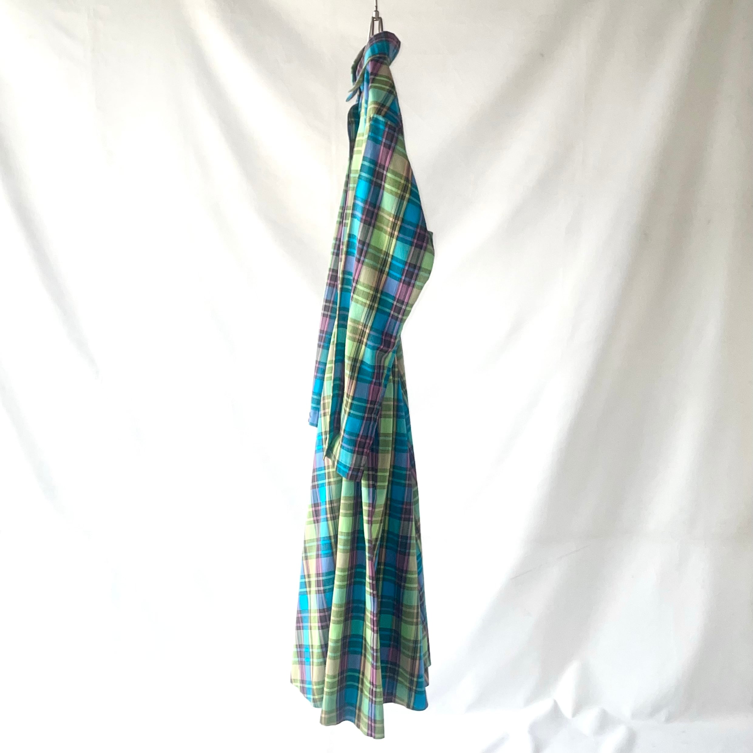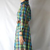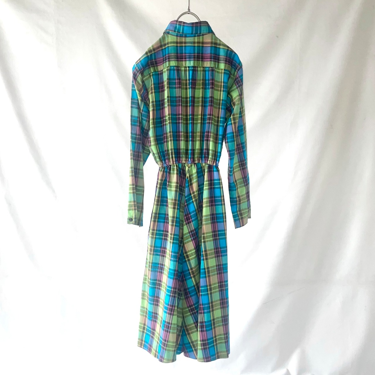 ウエストゴム入りでフレアなシルエットがかわいい、グリーン、ブルー、ピンクのマドラスチェック柄シャツワンピースです。