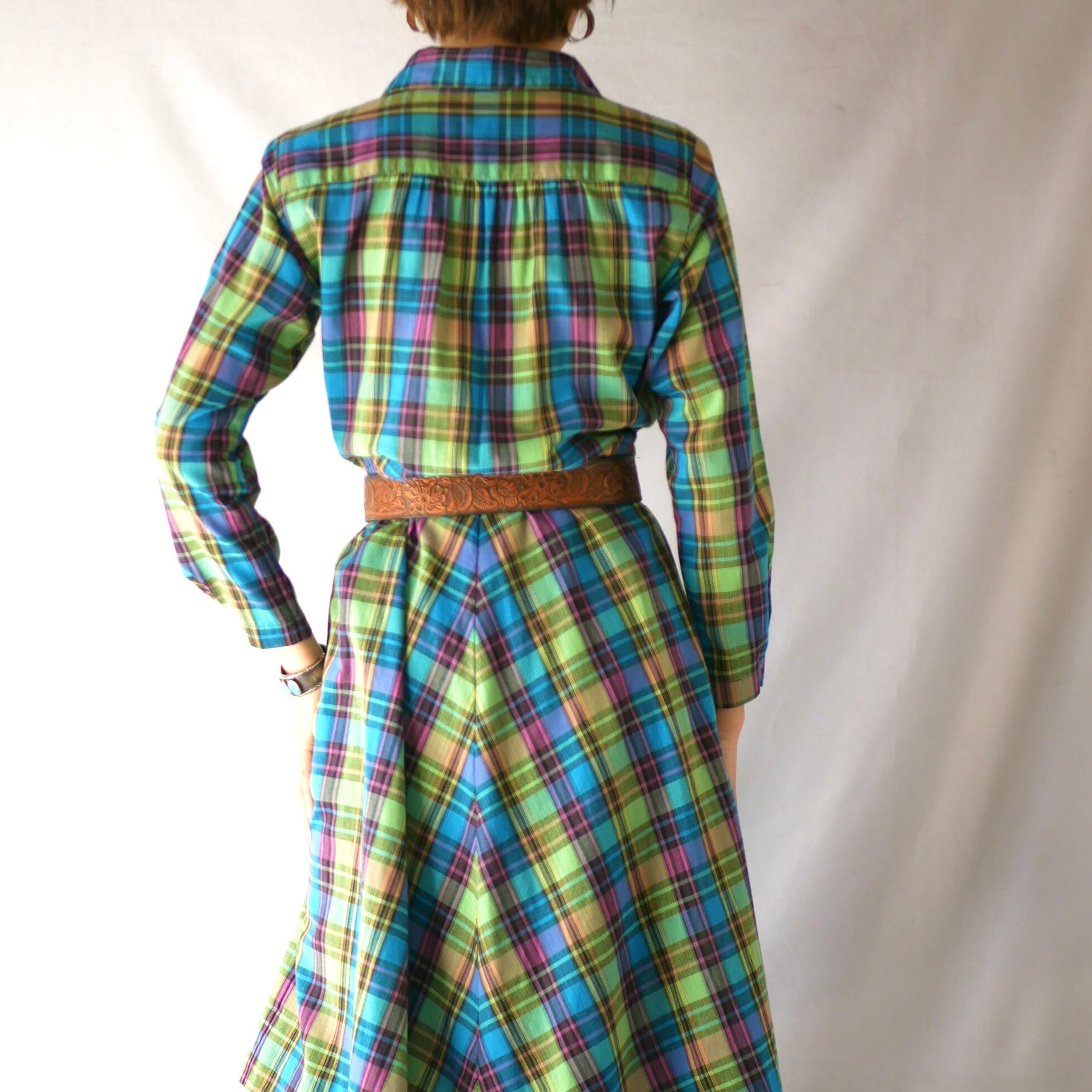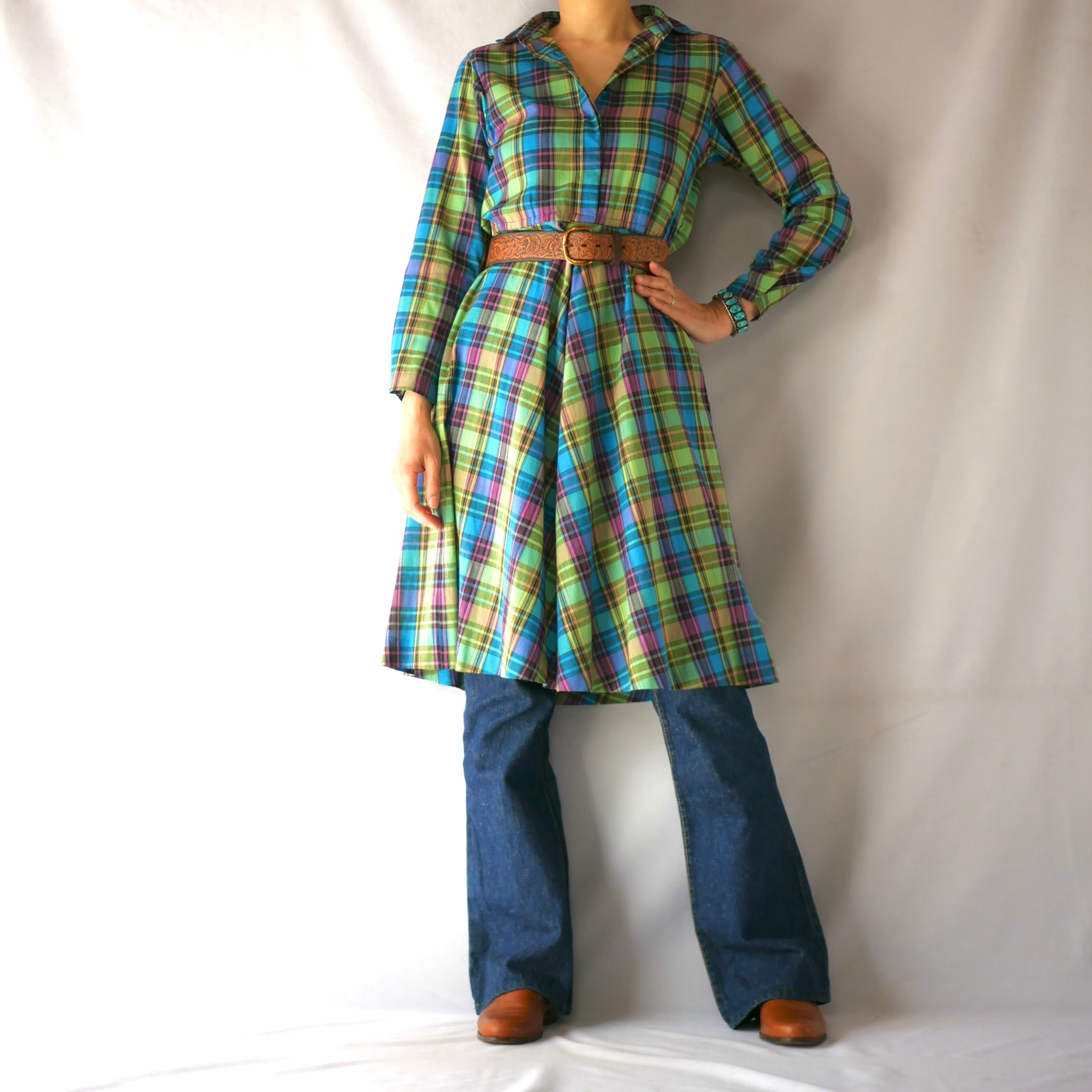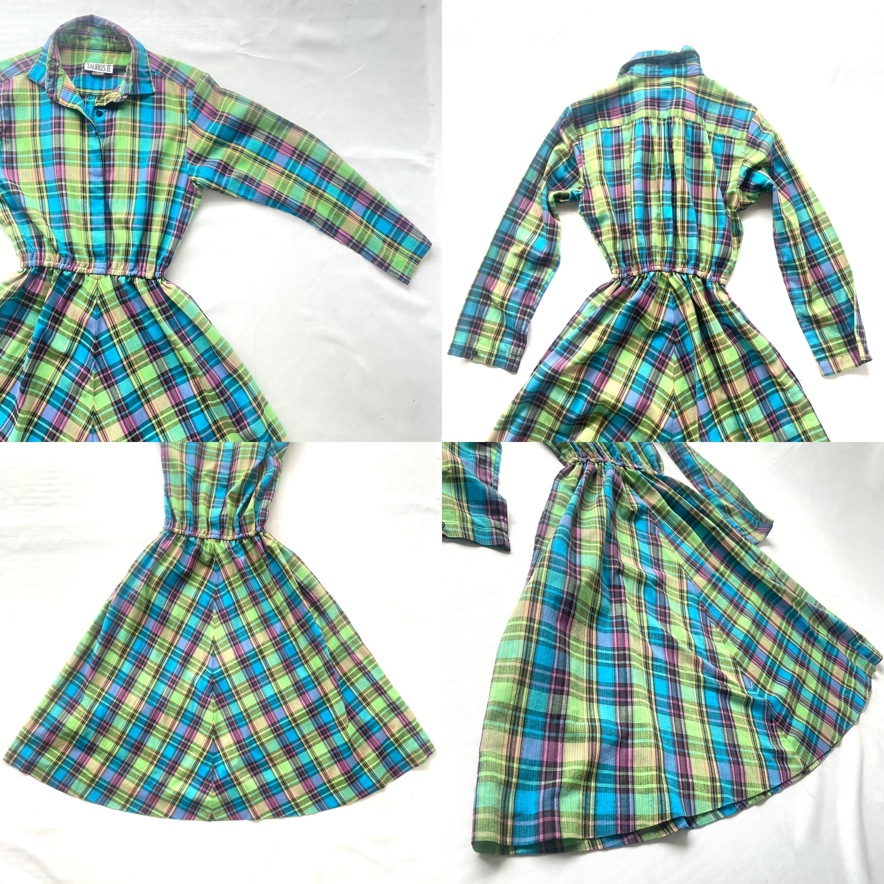 ウエストゴム入りでフレアなシルエットがかわいい、グリーン、ブルー、ピンクのマドラスチェック柄シャツワンピースです。