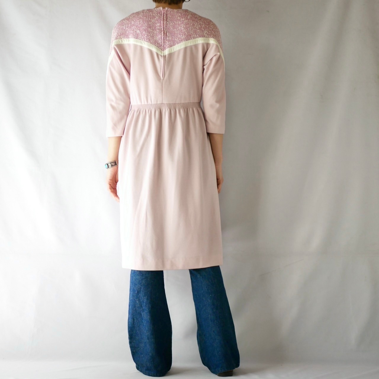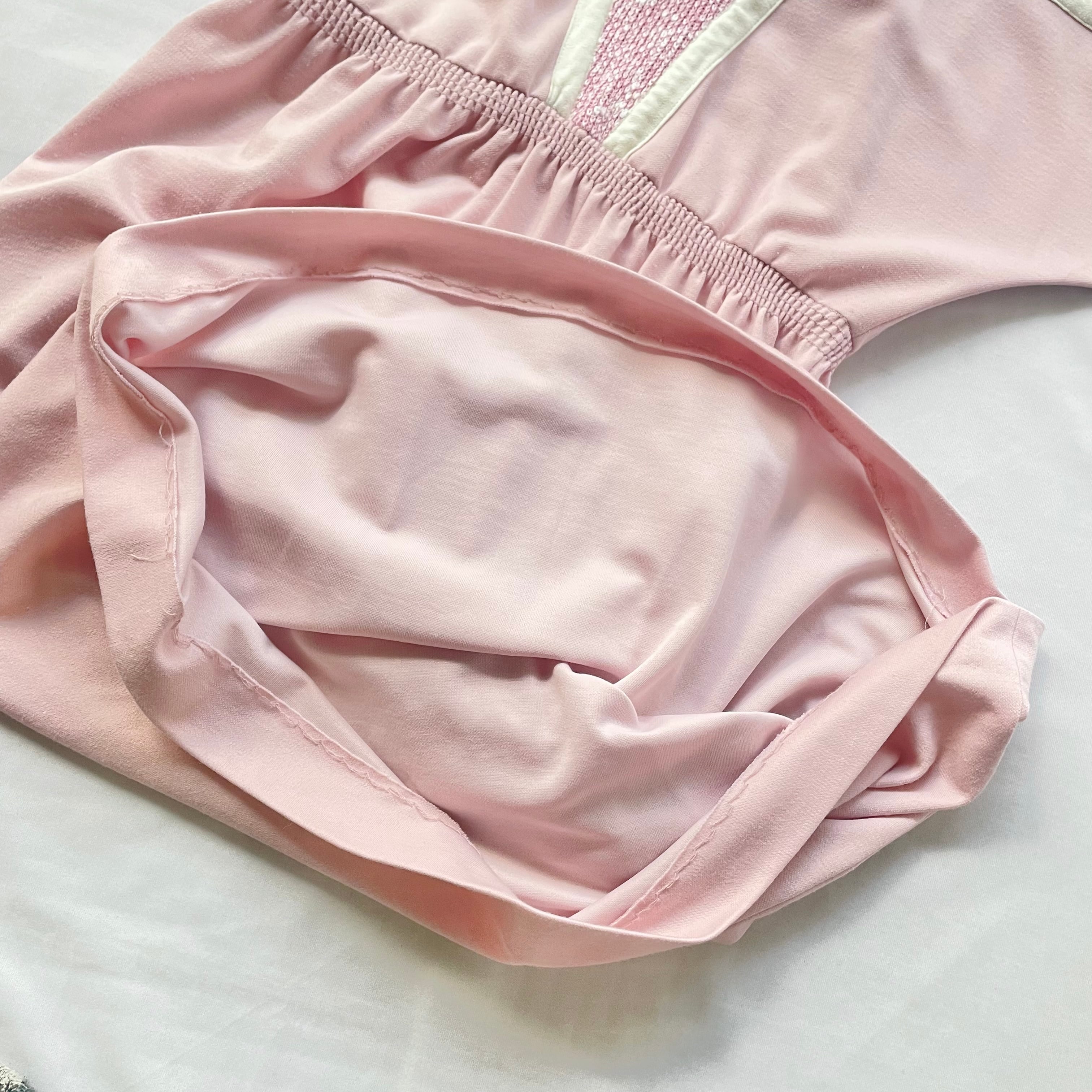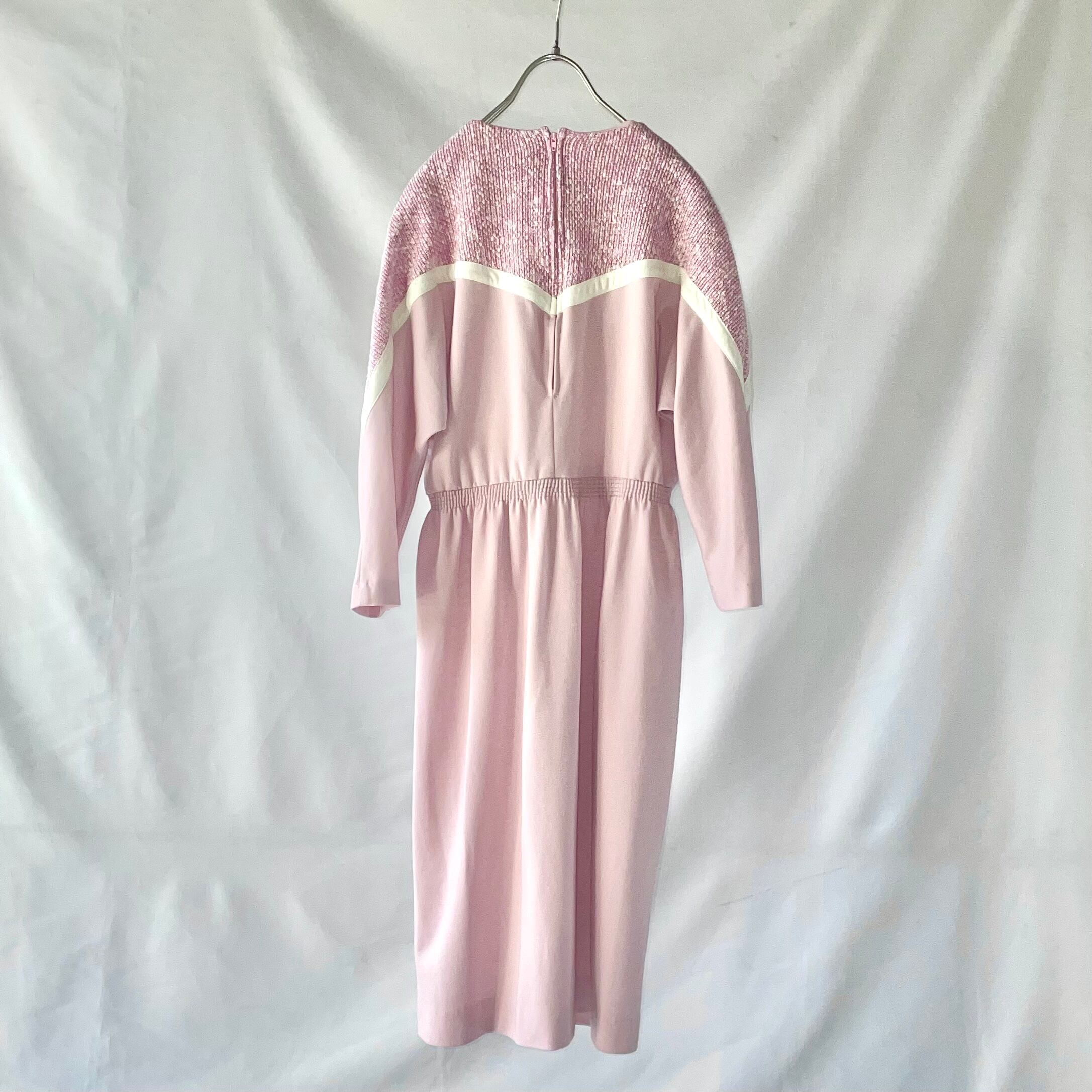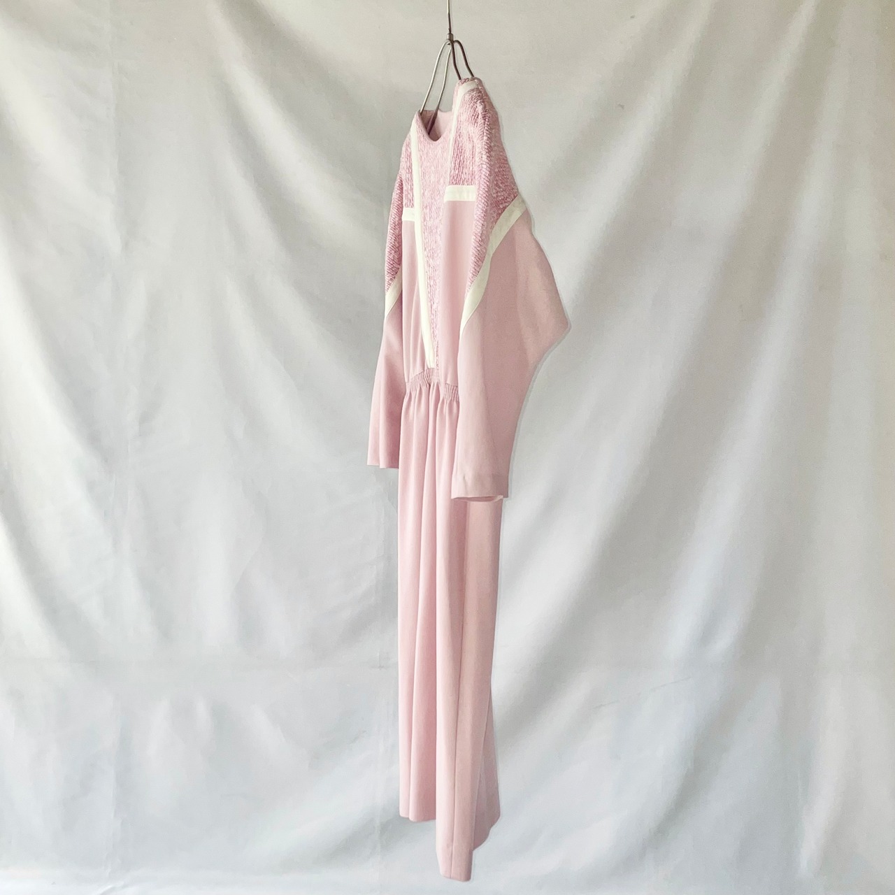 桜の花のようなピンク色のニット地とスウェット地切替 ヴィンテージアメリカ製 ドルマンスリーブ ワンピース です。