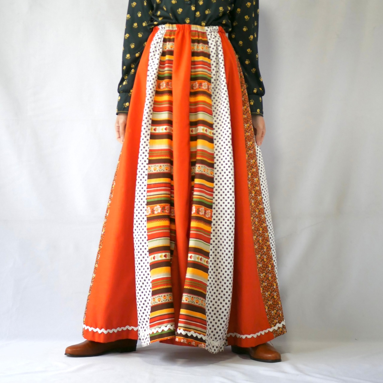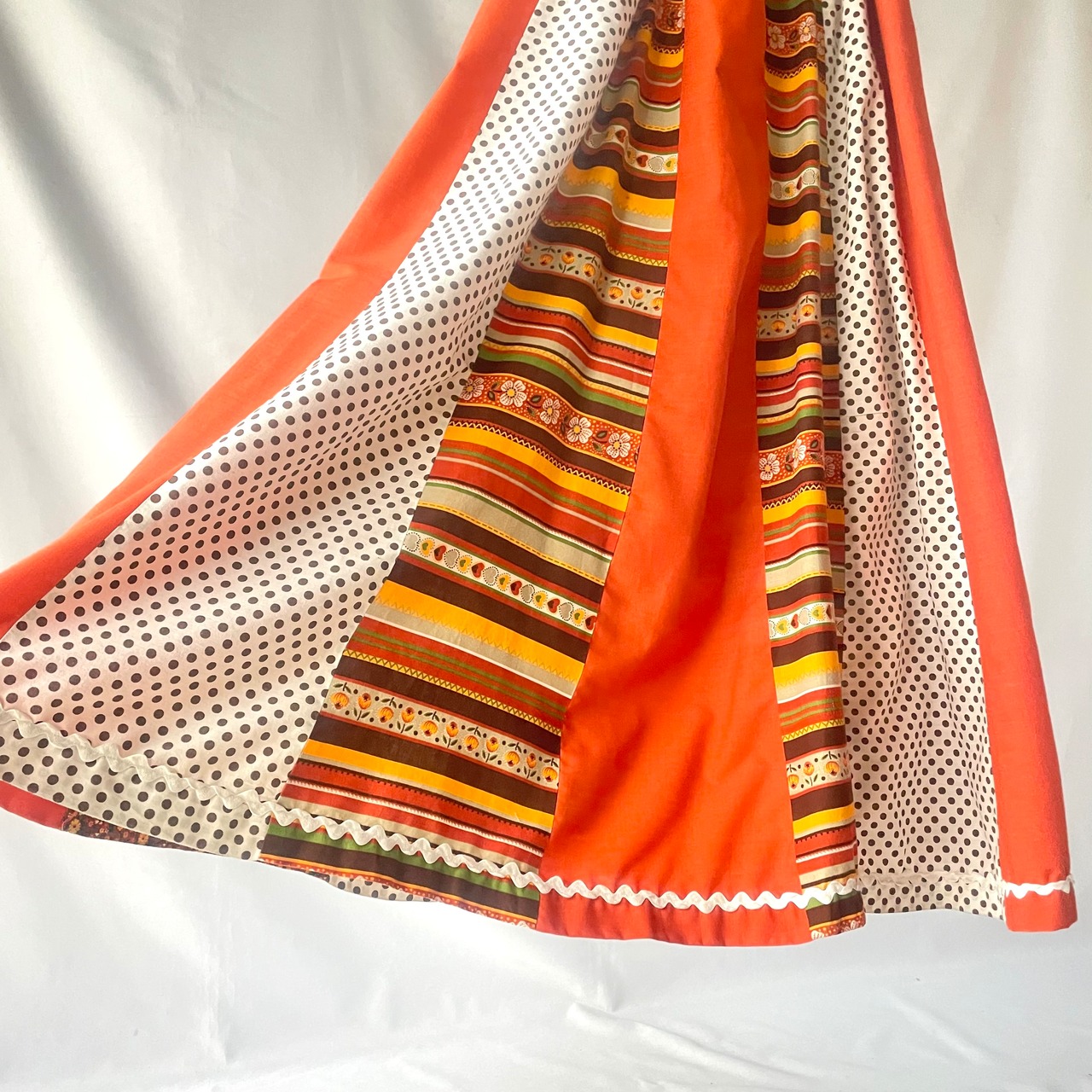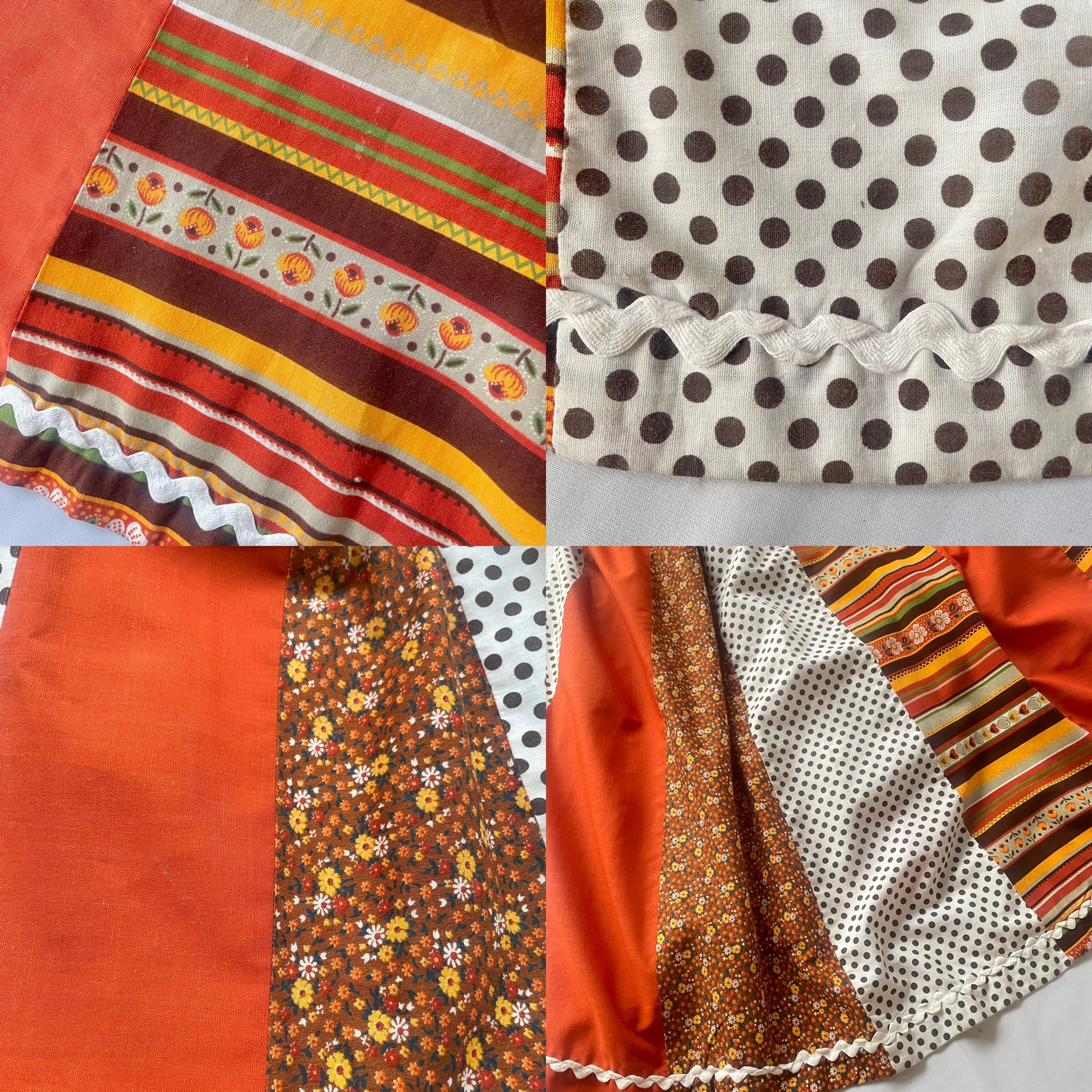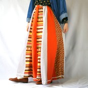 70年代ヴィンテージ オレンジ 花柄 ドット 切替 コットン マキシ丈スカートです。裏地付き。