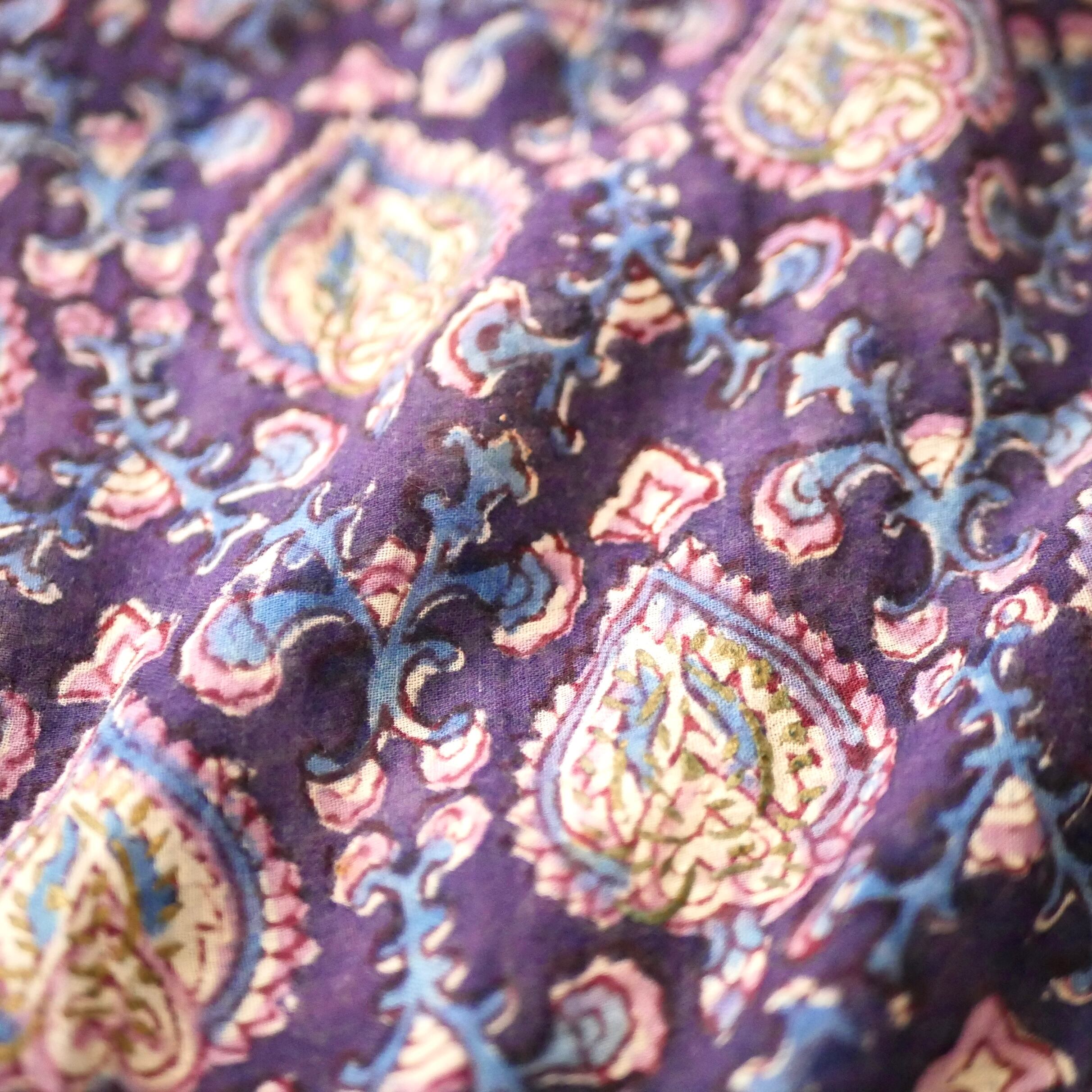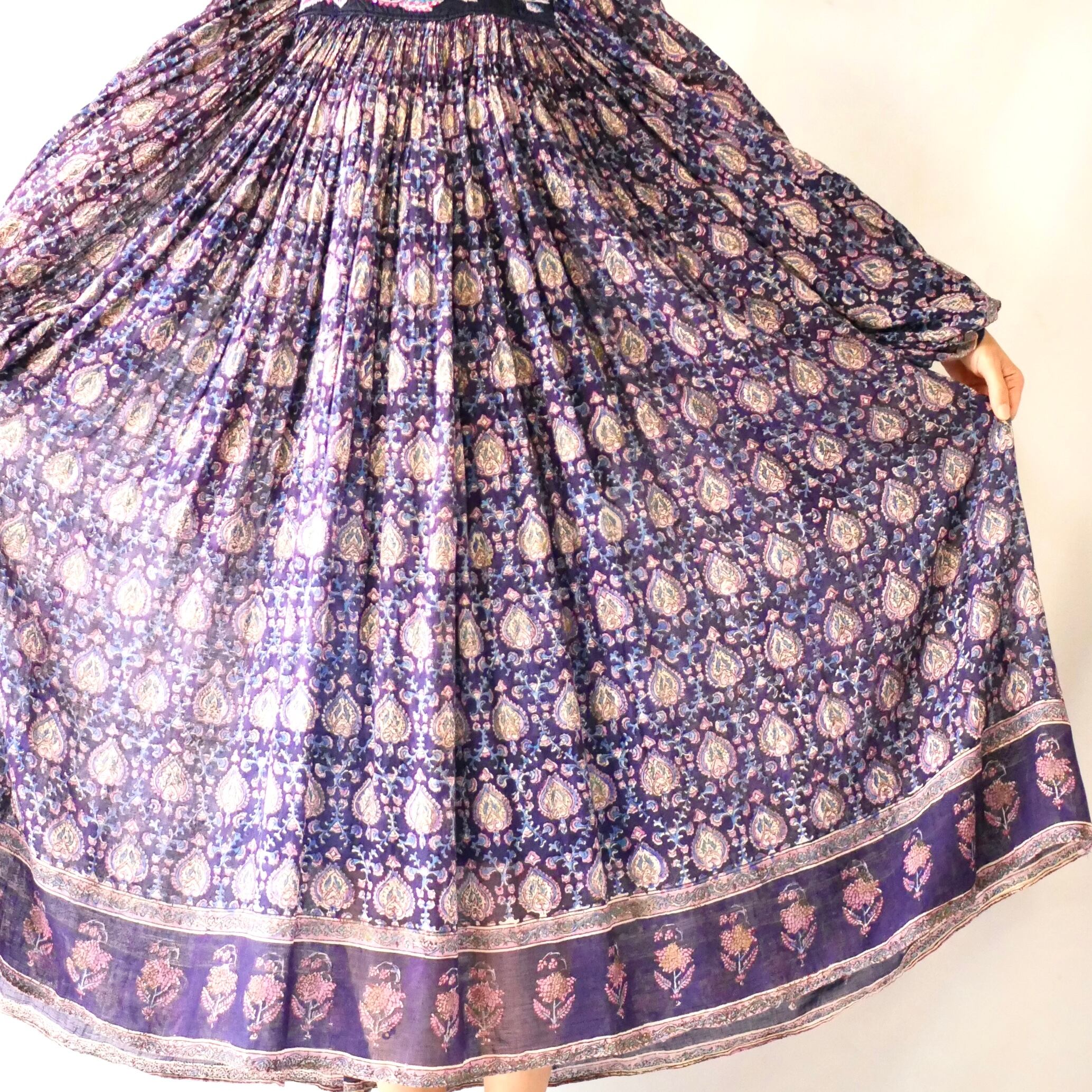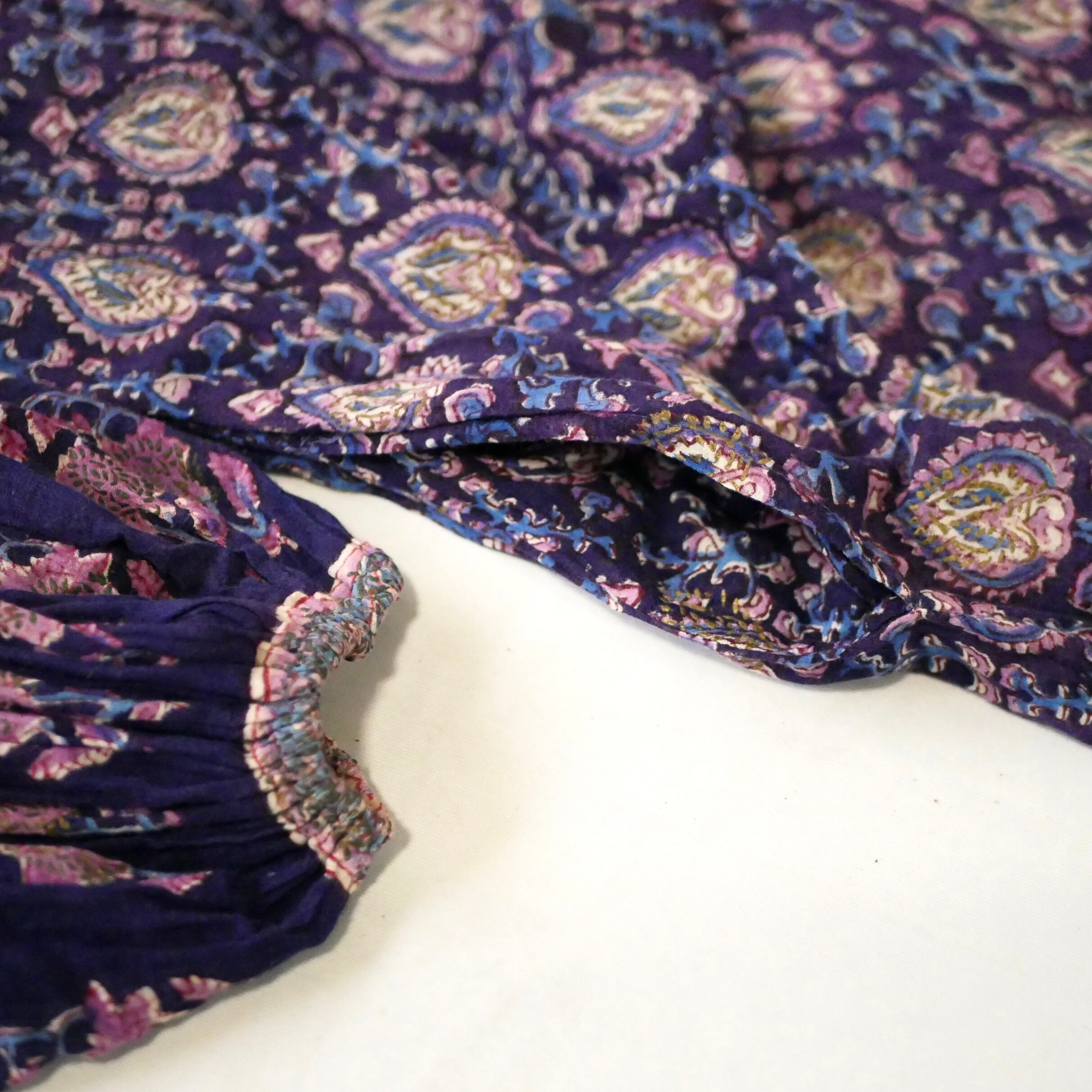 たっぷり生地が使われたボリューミーな袖がとても存在感のある、70年代ヴィンテージ PHOOL インド綿ワンピースです。大人も着やすい濃いめのパープルベースペイズリー柄でマキシ丈。散りばめられたゴールドスタンプやネックラインのビーズ刺繍など、とても豪華で可愛い1枚です。ポケット付き。