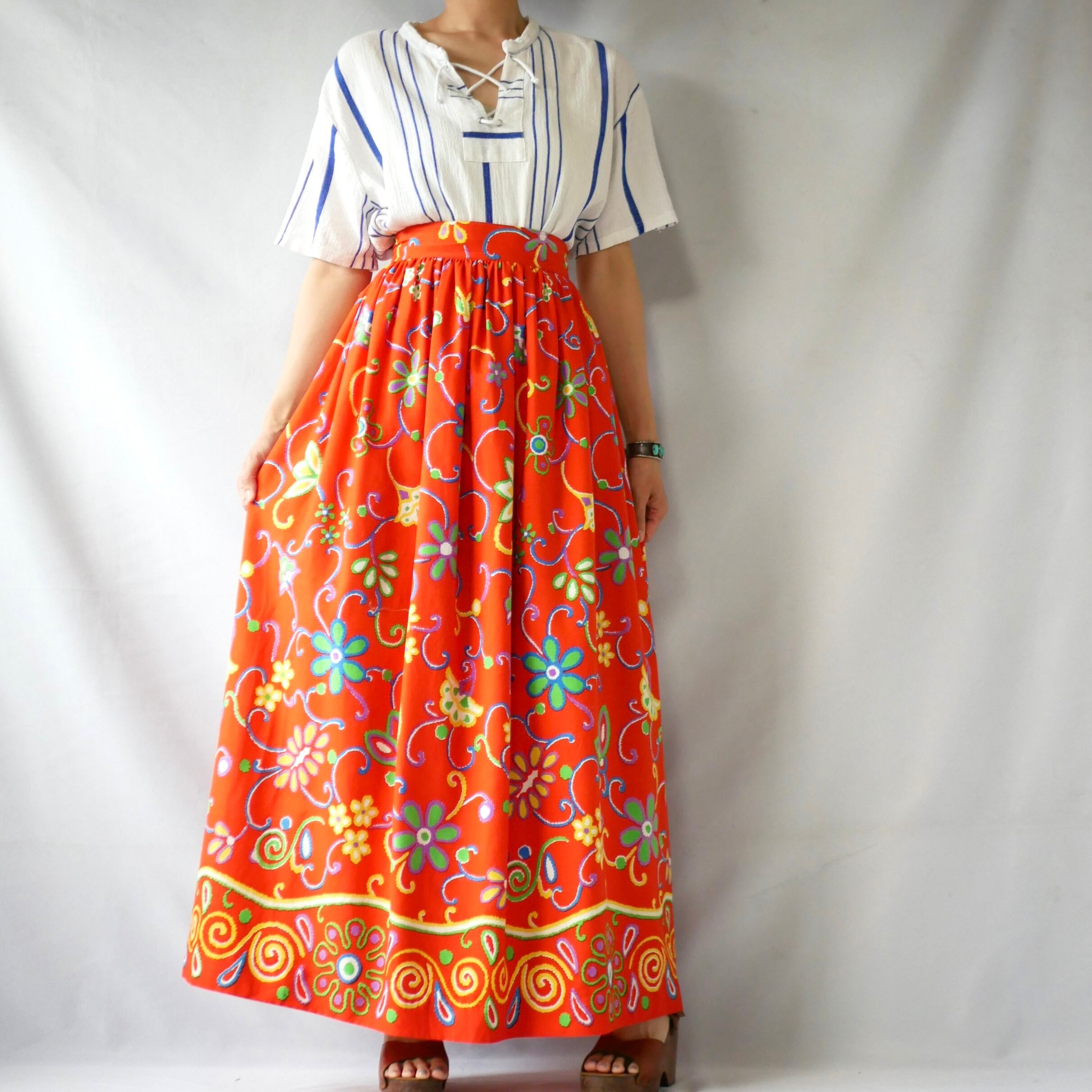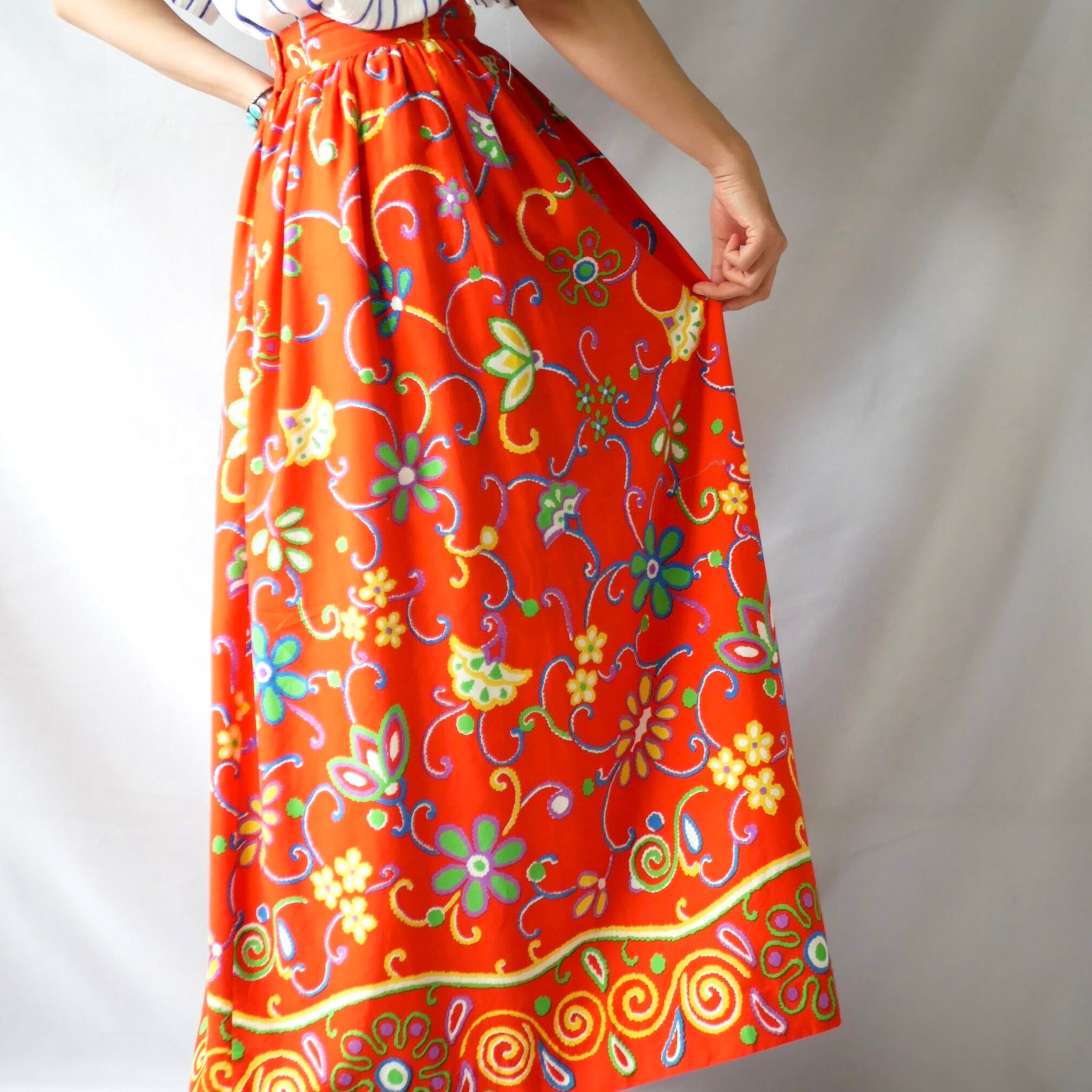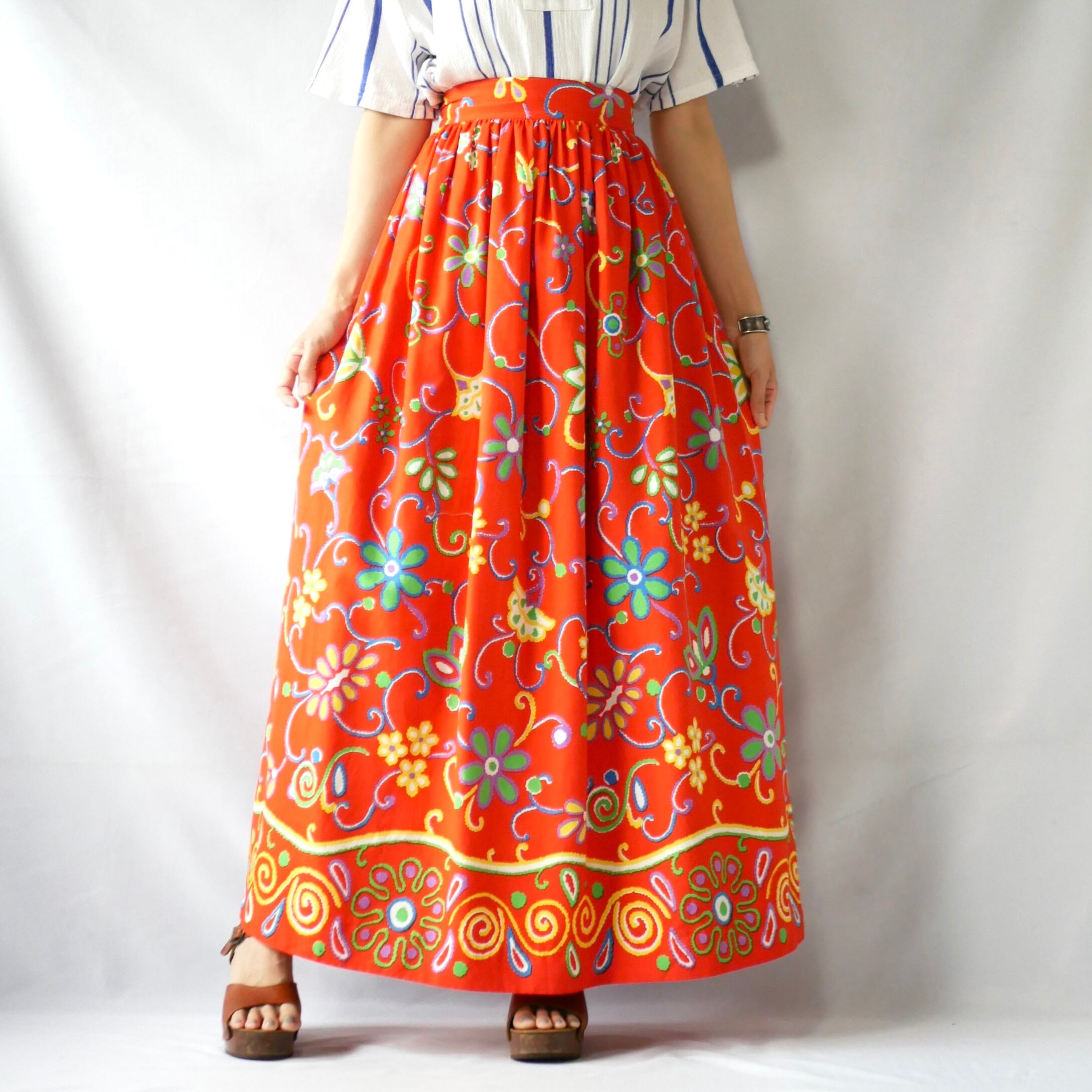 赤にpopな花柄が可愛い70年代ヴィンテージ マキシ丈スカートです。