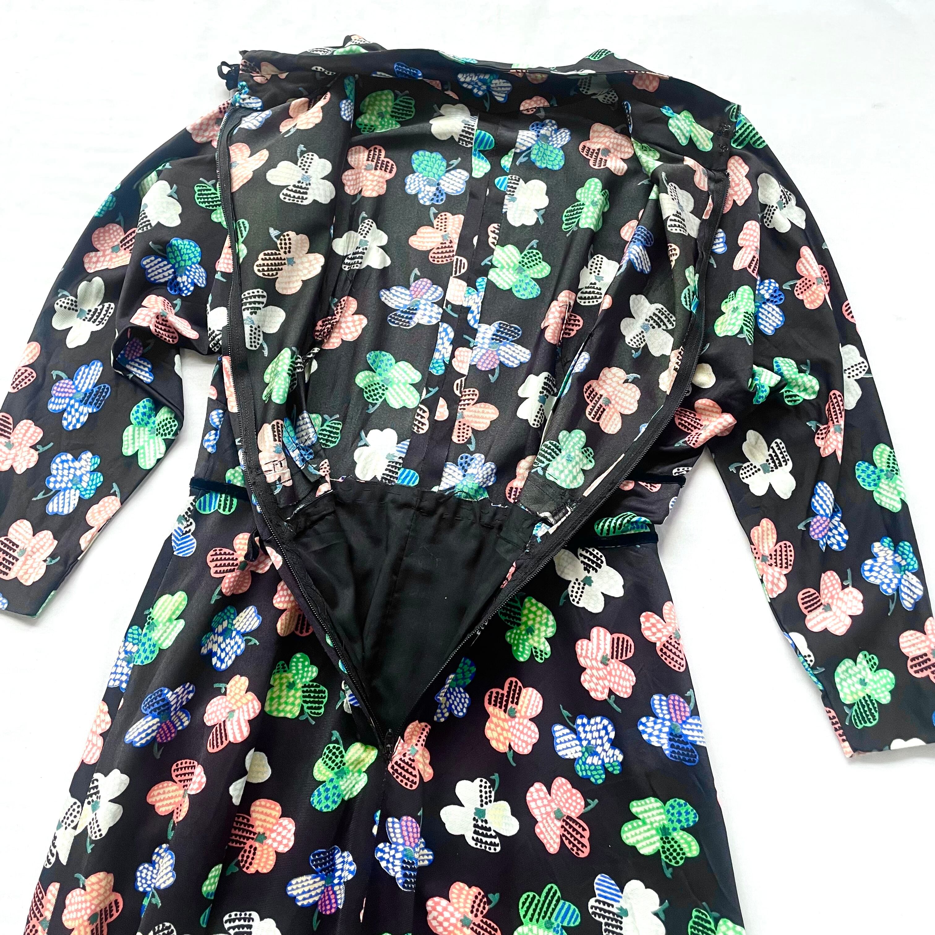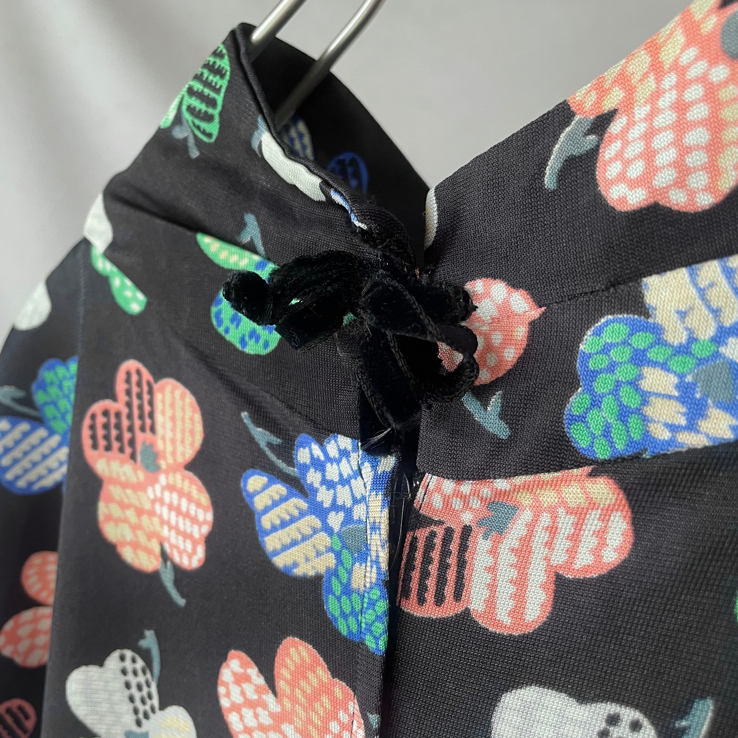 後ろネックと腰に付いたベロアりぼんや、カラフルでPOPなお花柄に裾の赤いテープも可愛い、6-70sの物と思われるヴィンテージマキシ丈ワンピースです。二枚仕立てになっていて透けません。