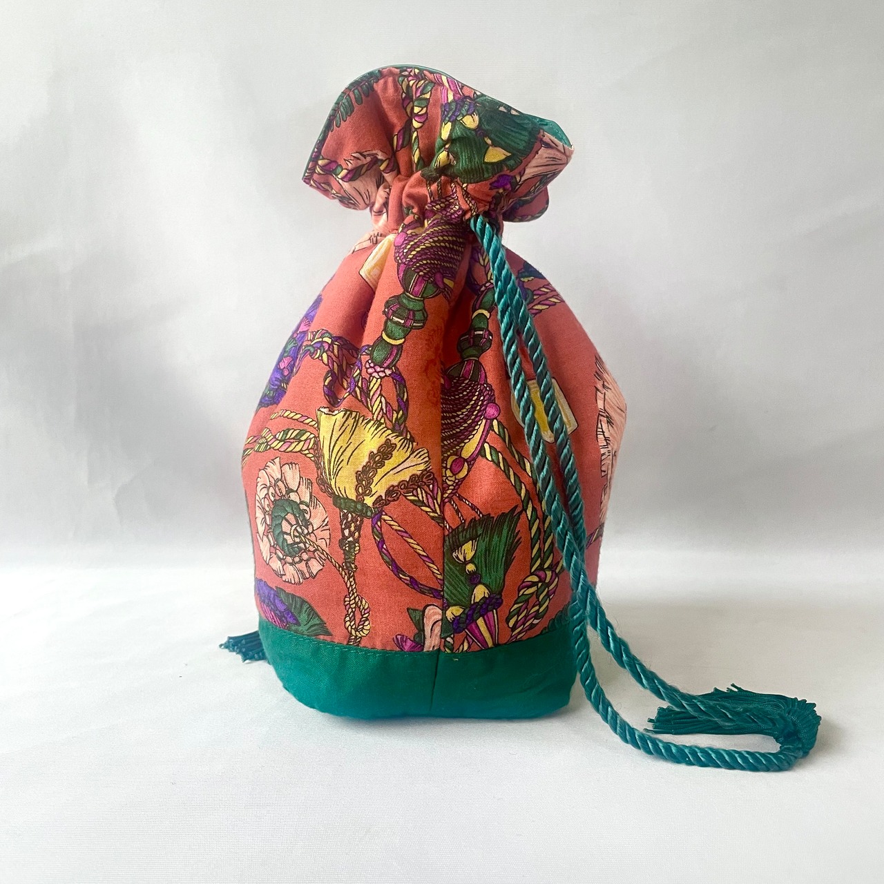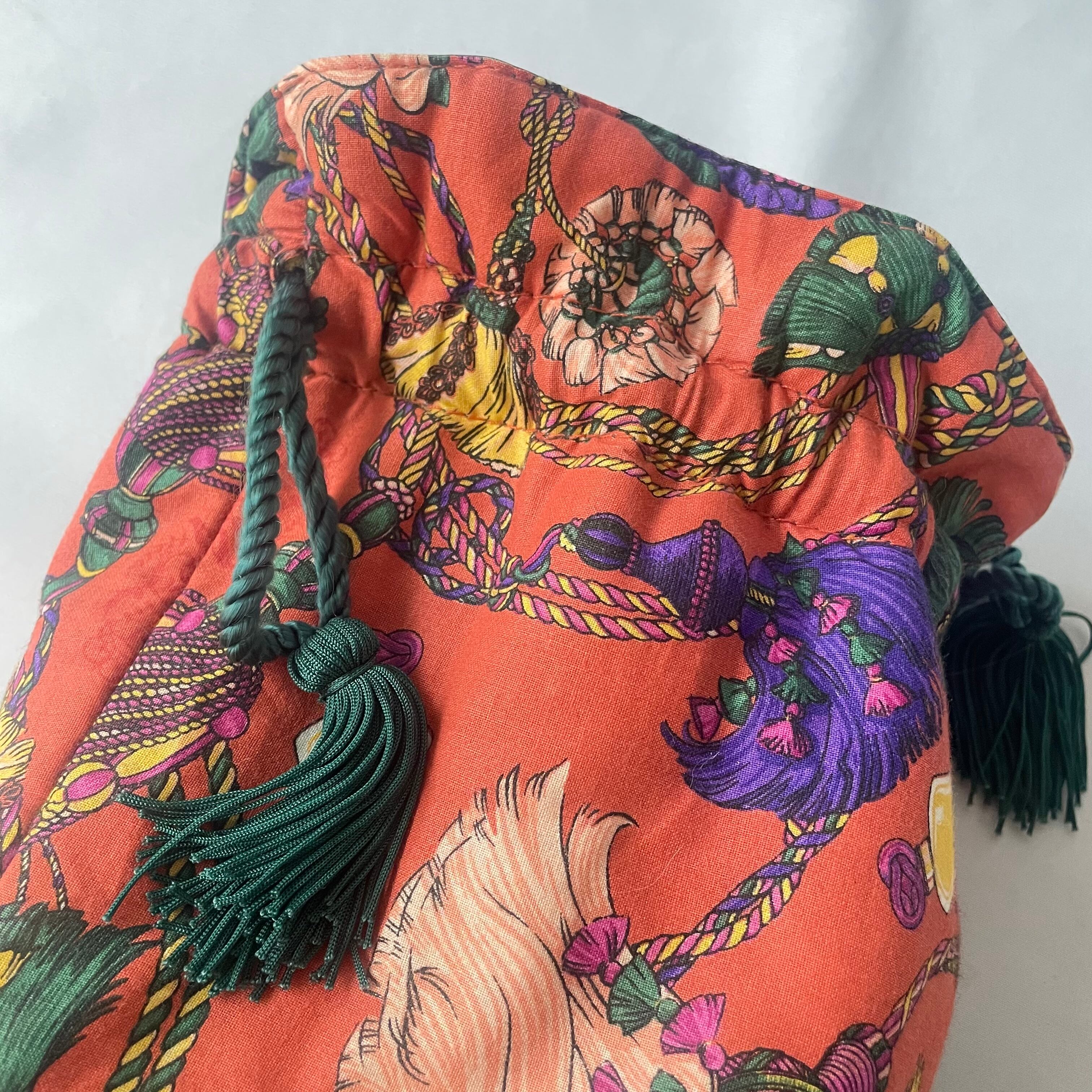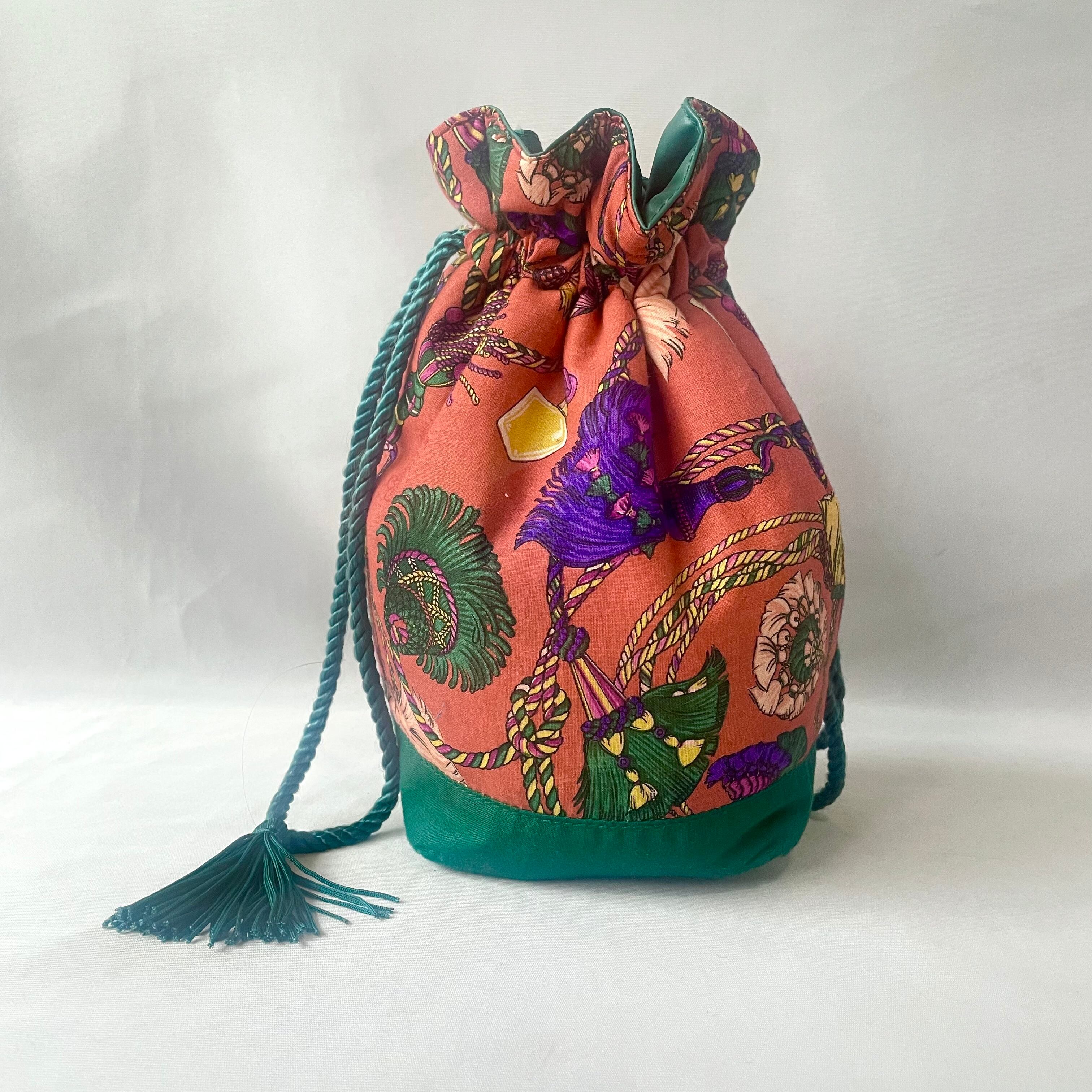 タッセルりぼん柄生地にコロンとした巾着型が可愛い、キルティング地ミニハンドバッグです。内側はビニール生地になっています。Made in china