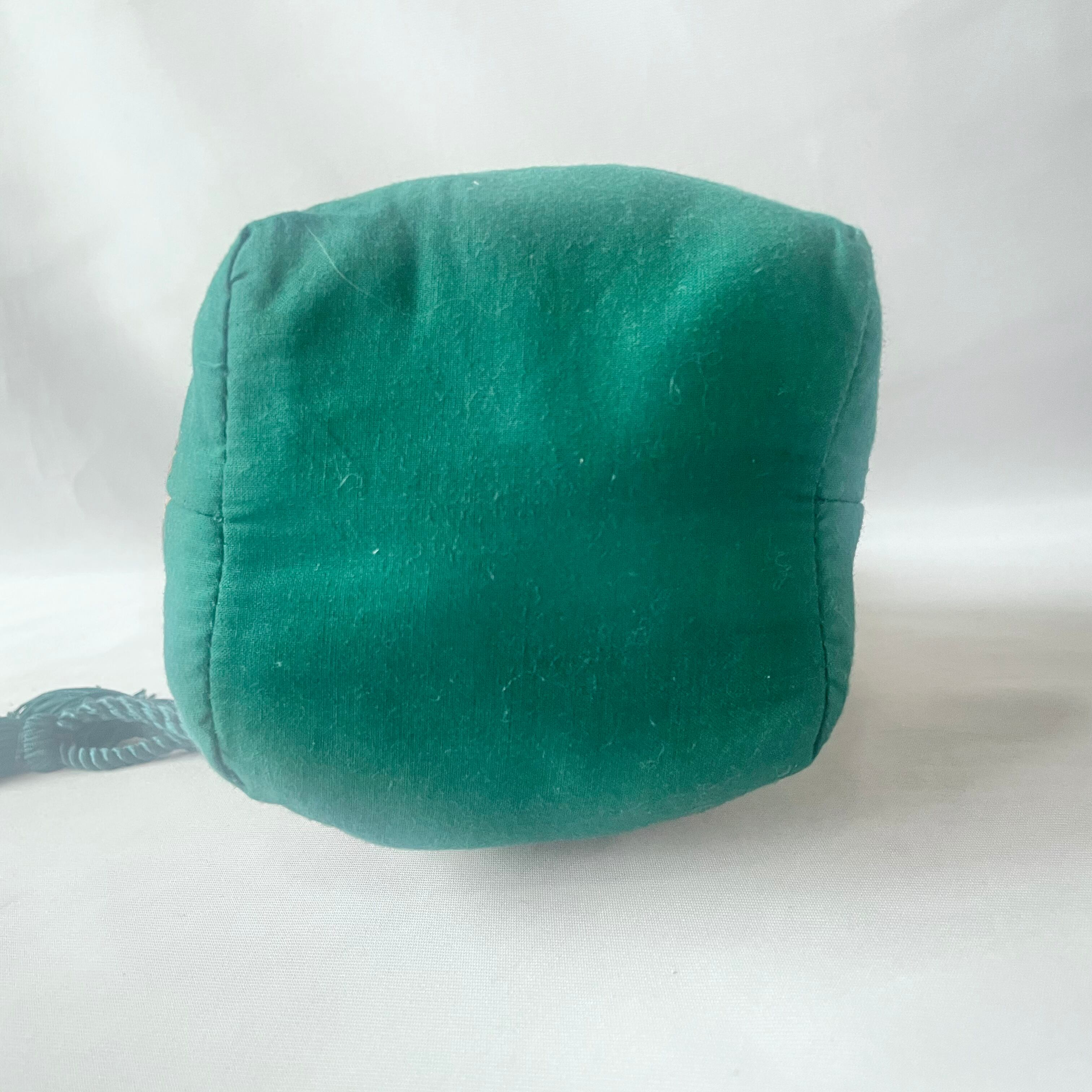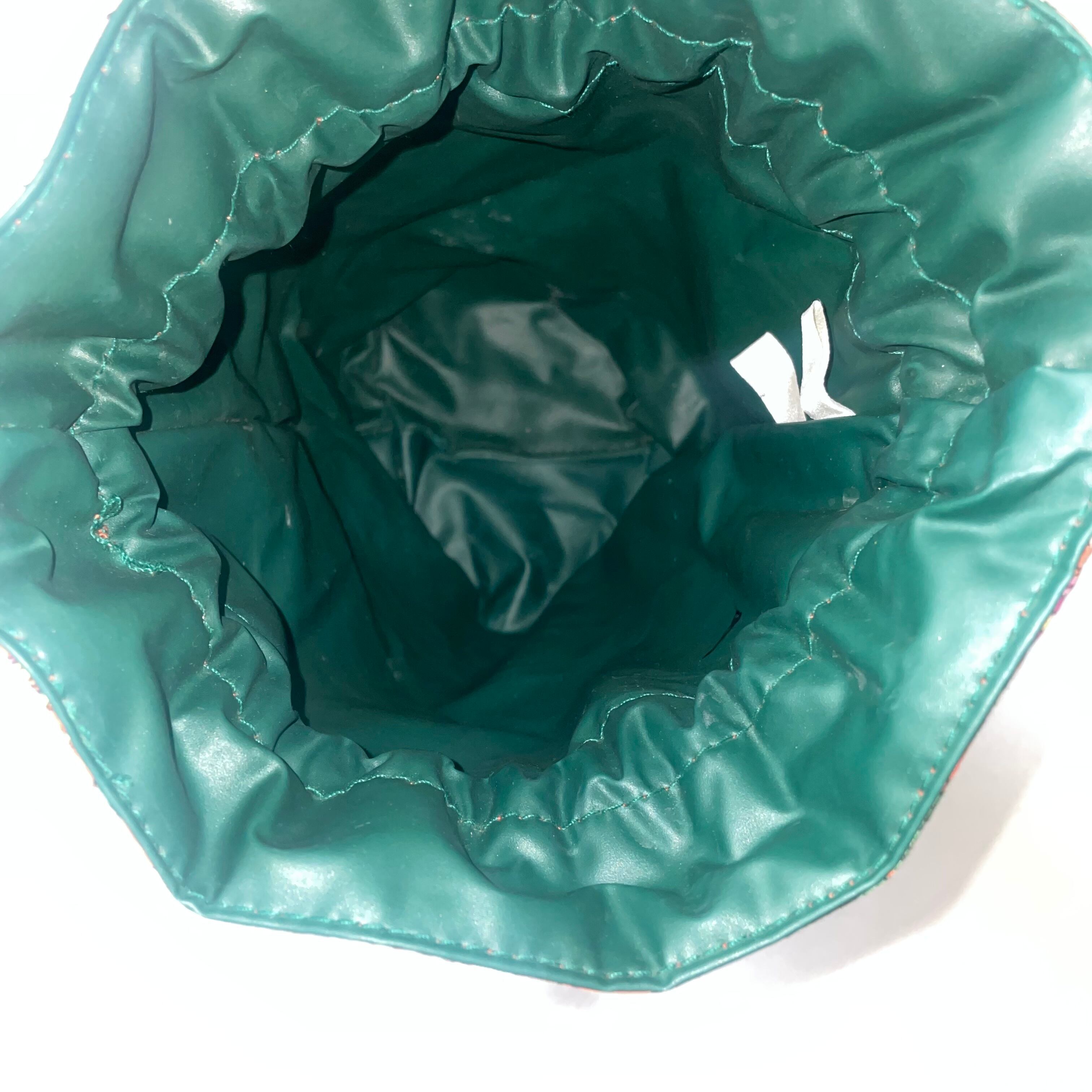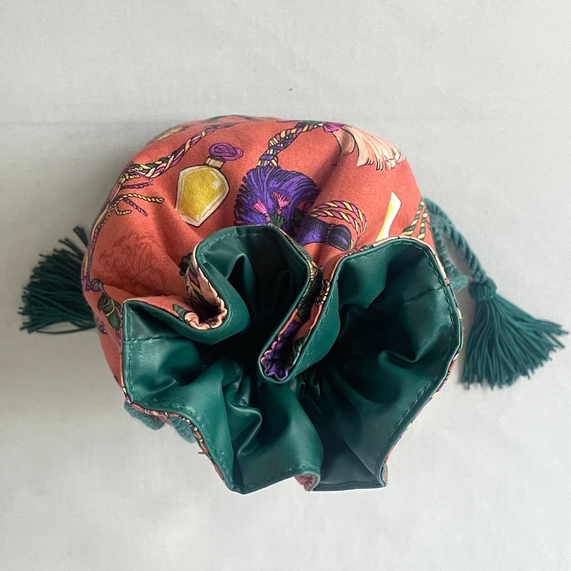 タッセルりぼん柄生地にコロンとした巾着型が可愛い、キルティング地ミニハンドバッグです。内側はビニール生地になっています。Made in china