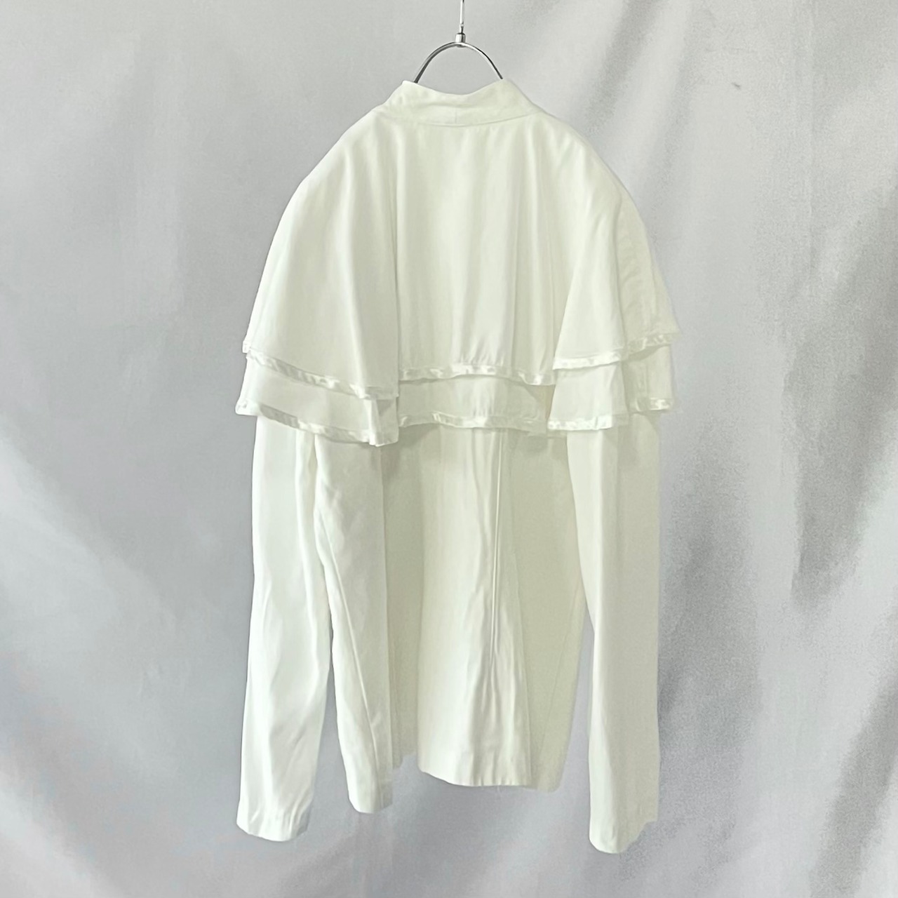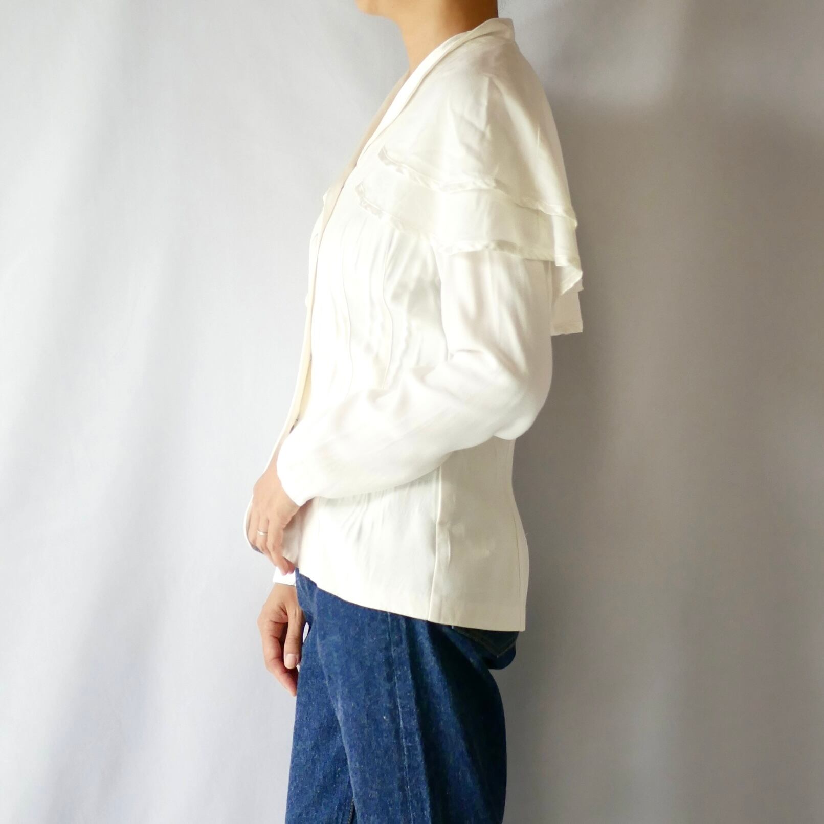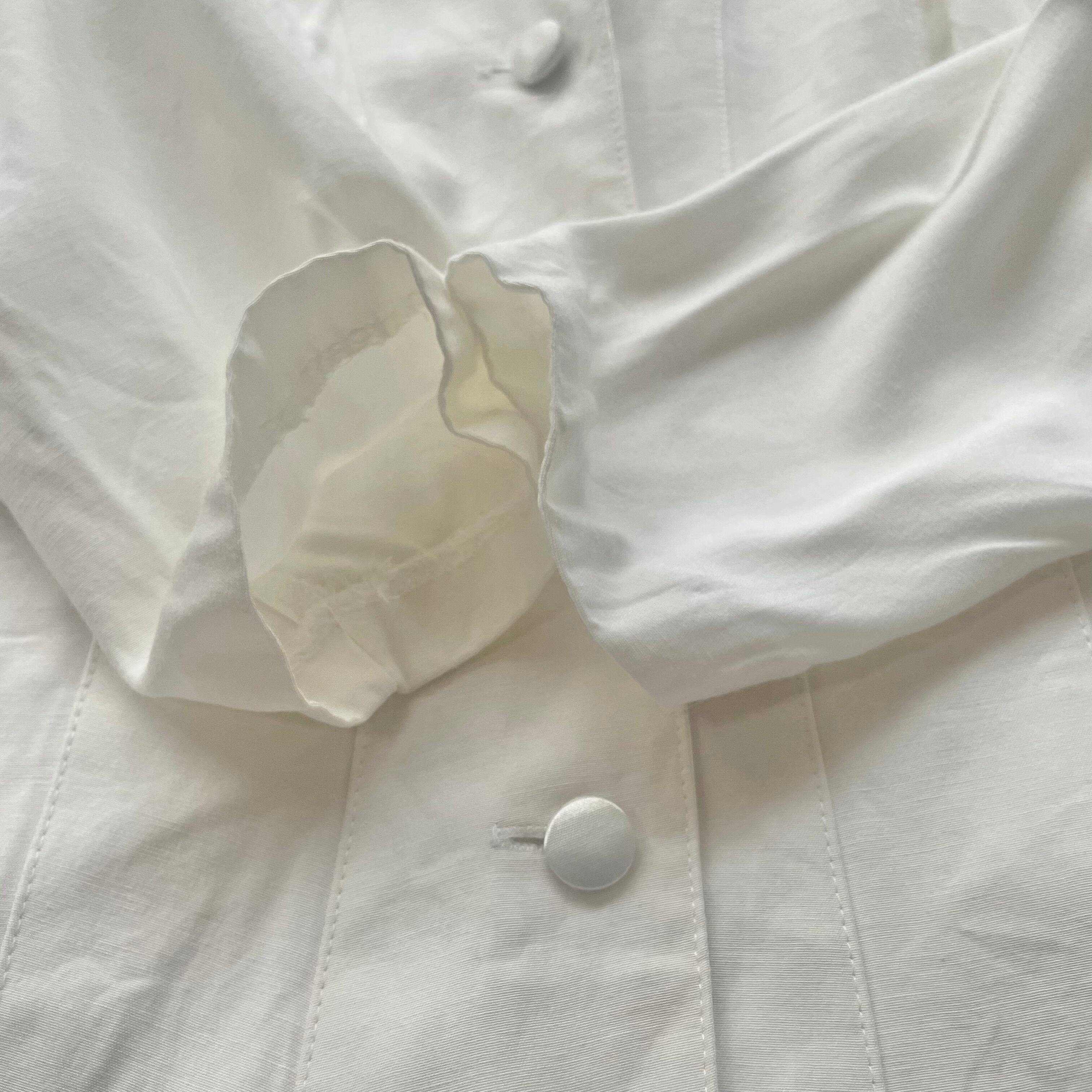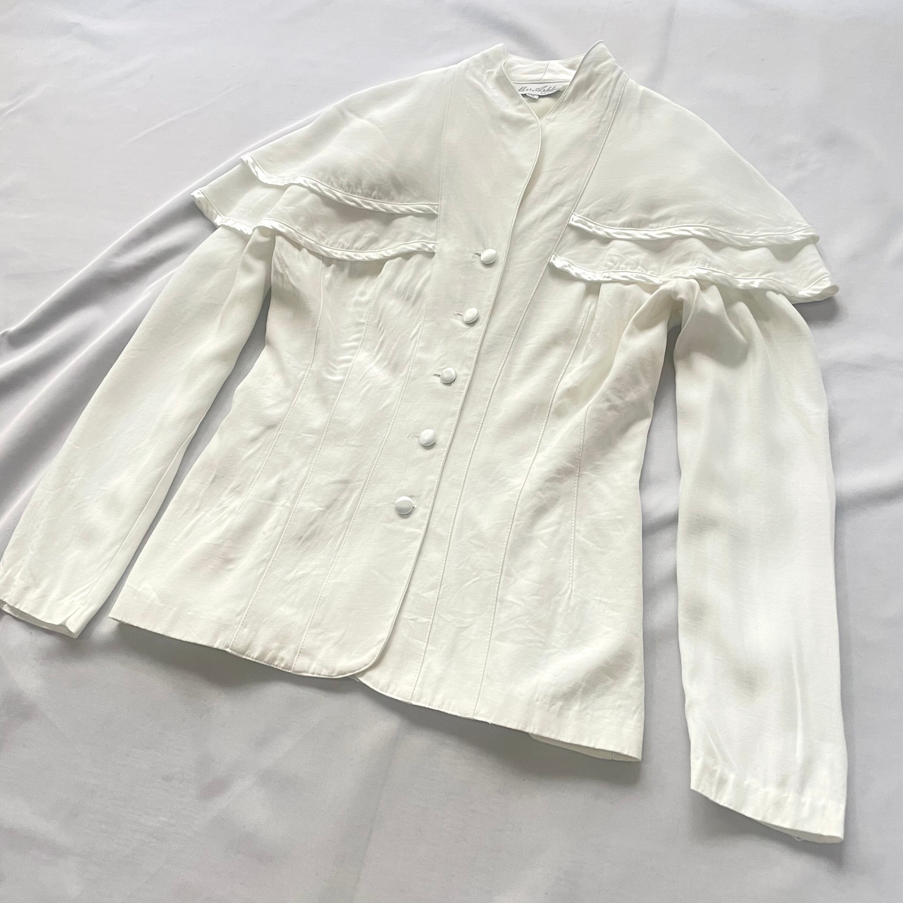 クラゲの様に見える、肩の生地が二重になっているデザインが素敵な白長袖ブラウスです。