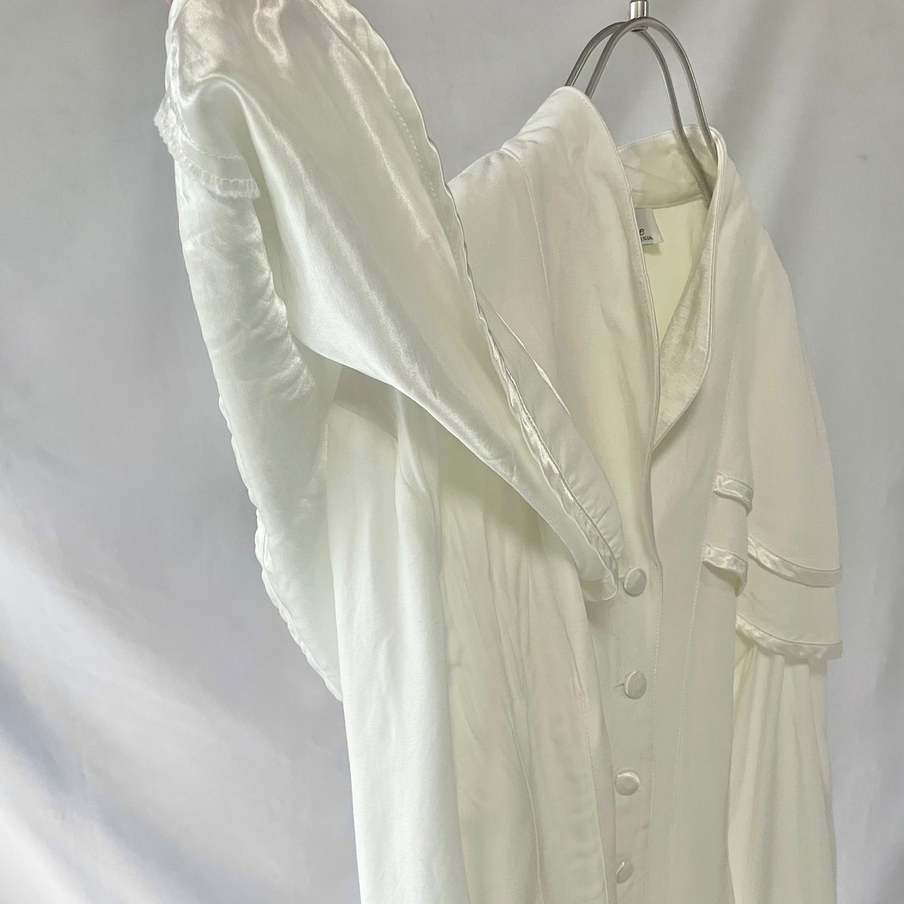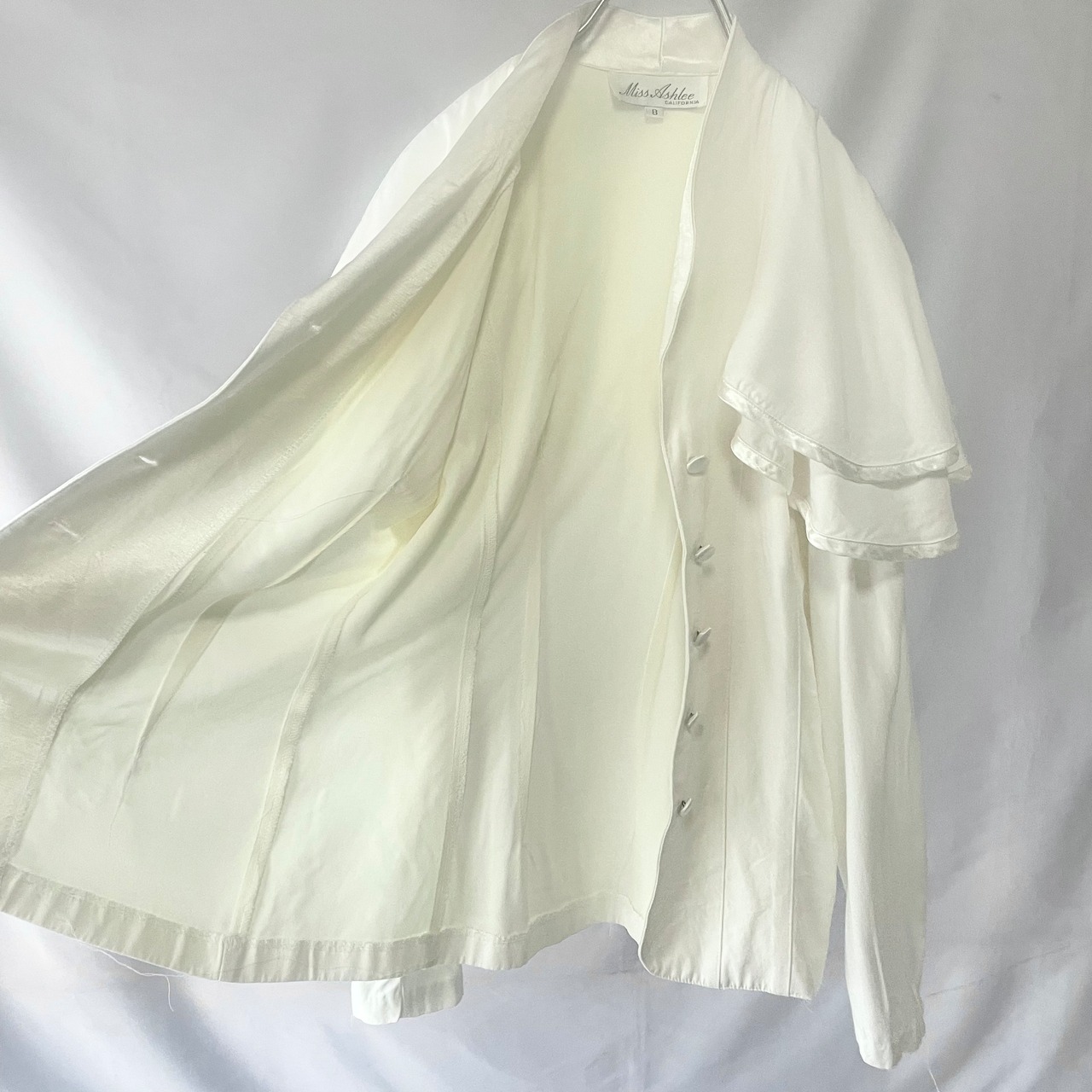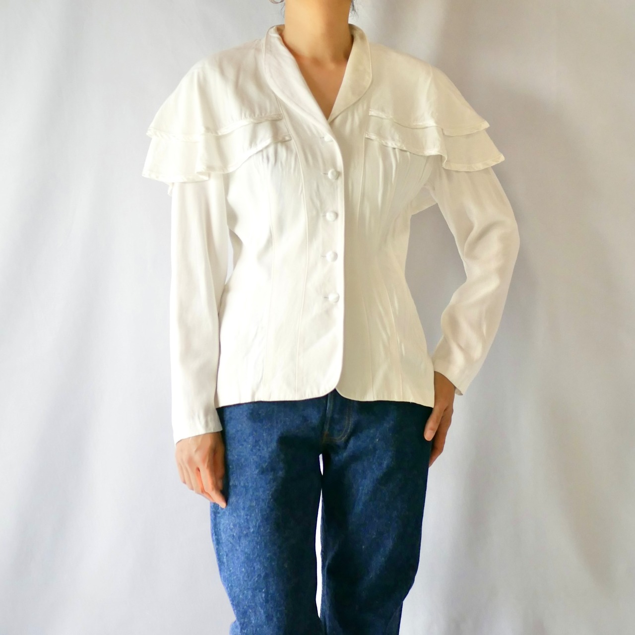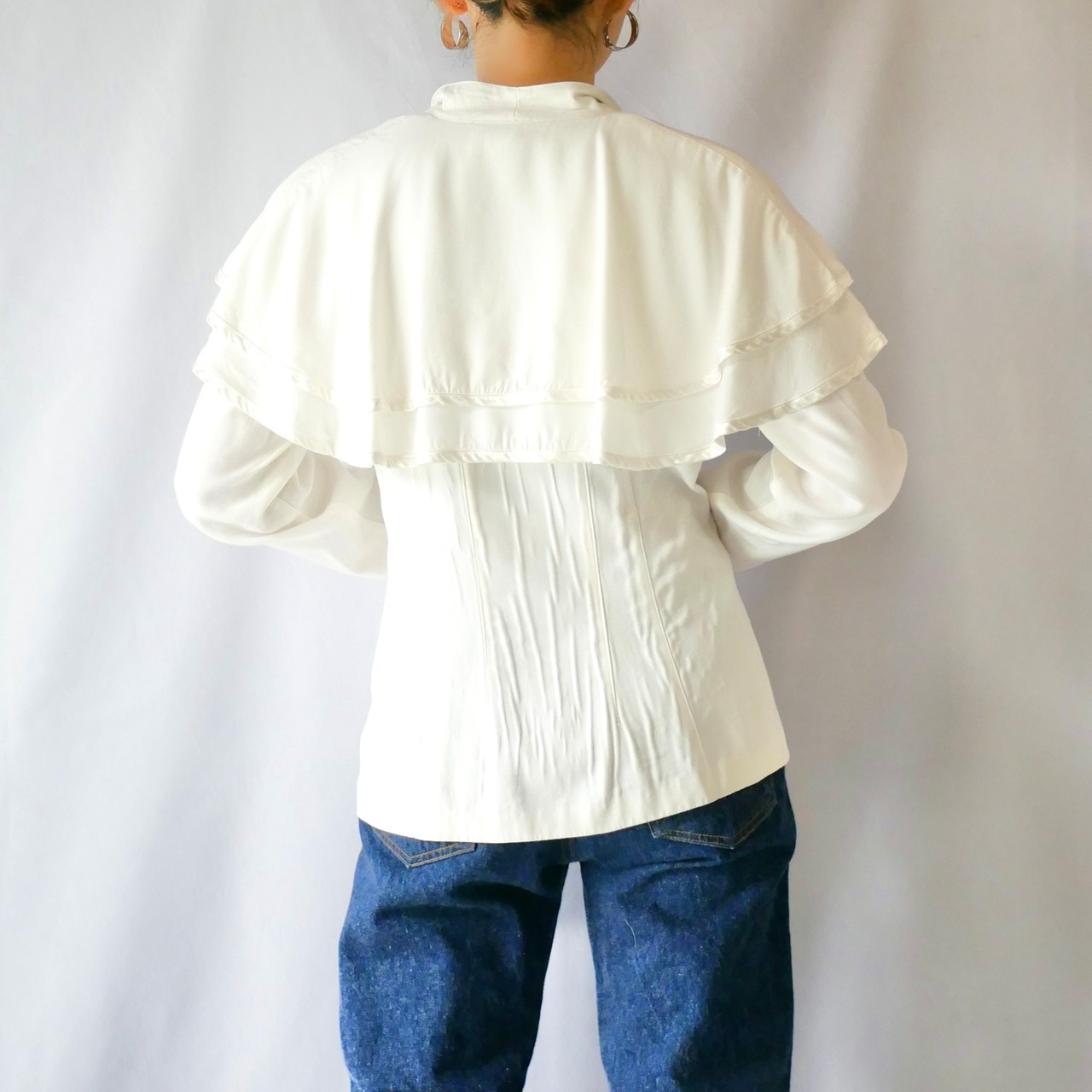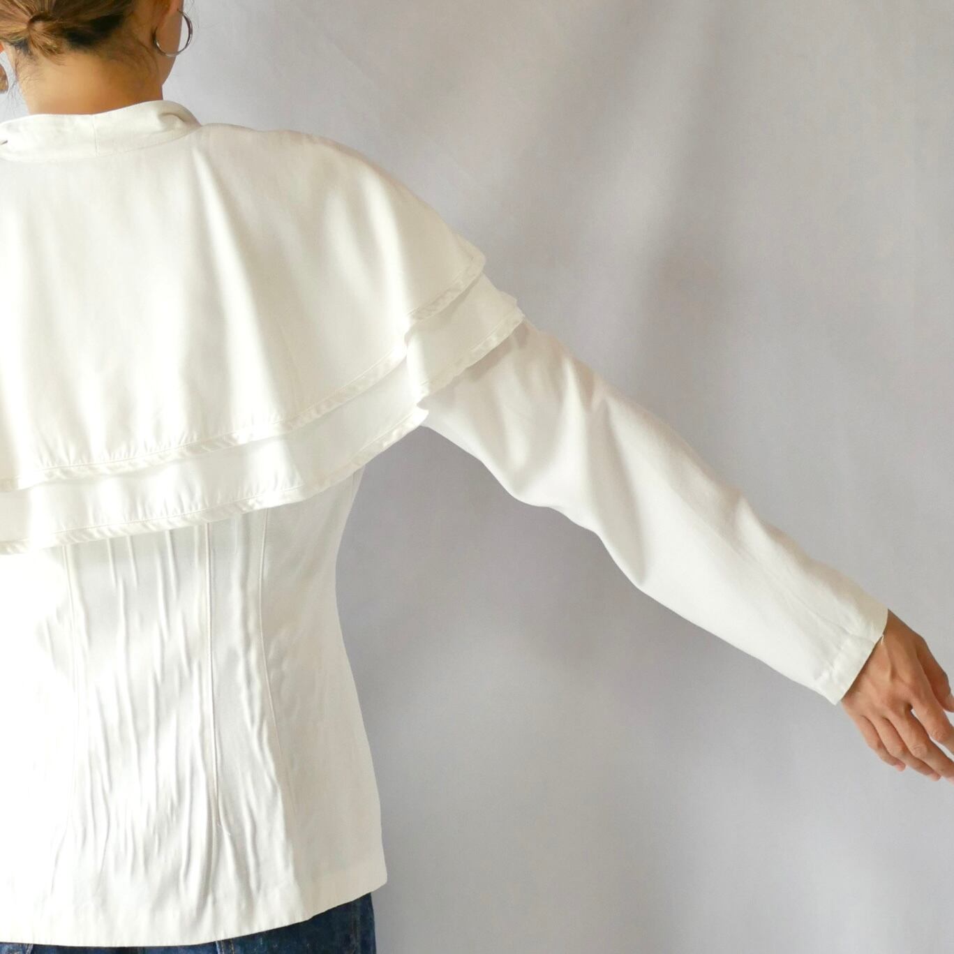 クラゲの様に見える、肩の生地が二重になっているデザインが素敵な白長袖ブラウスです。
