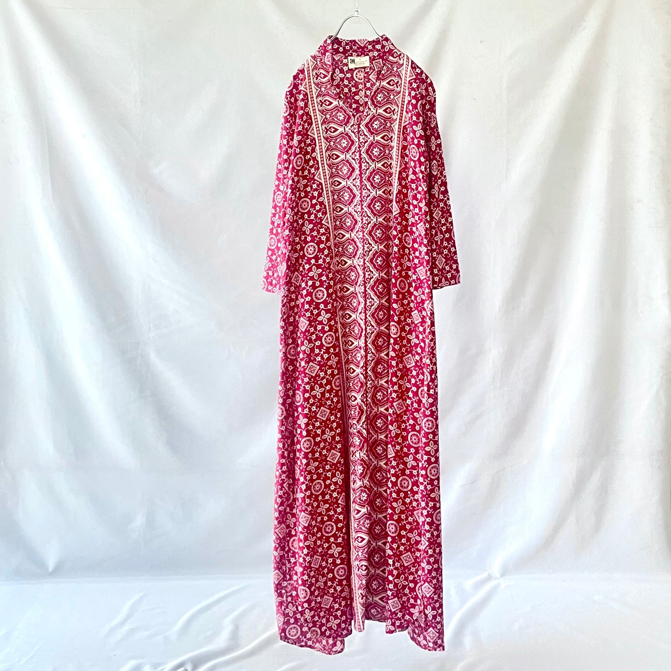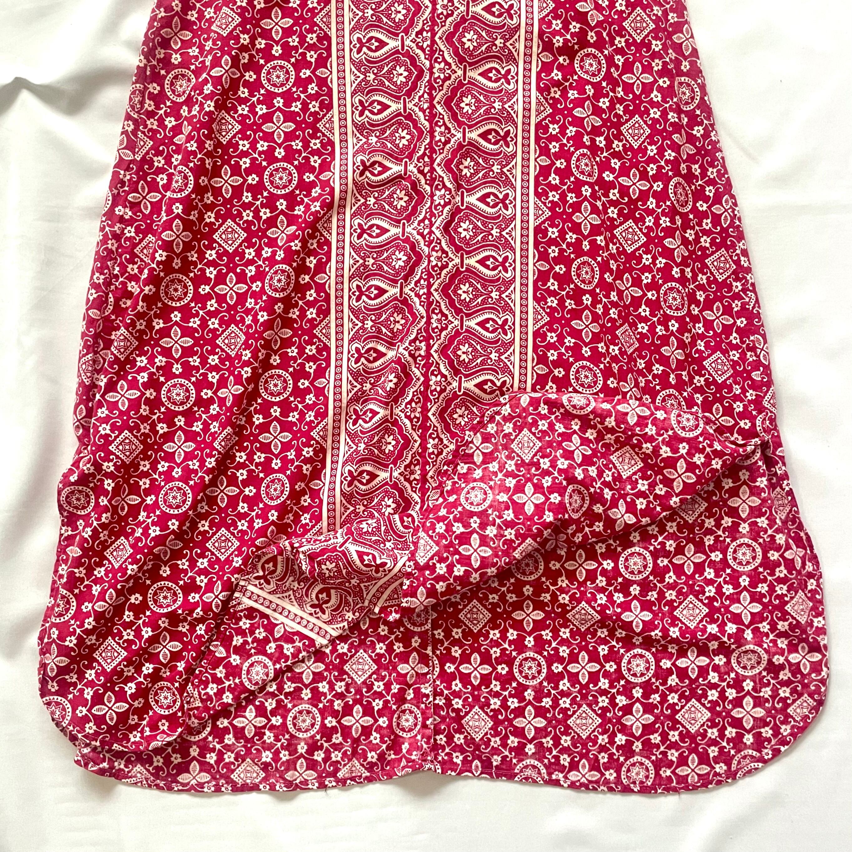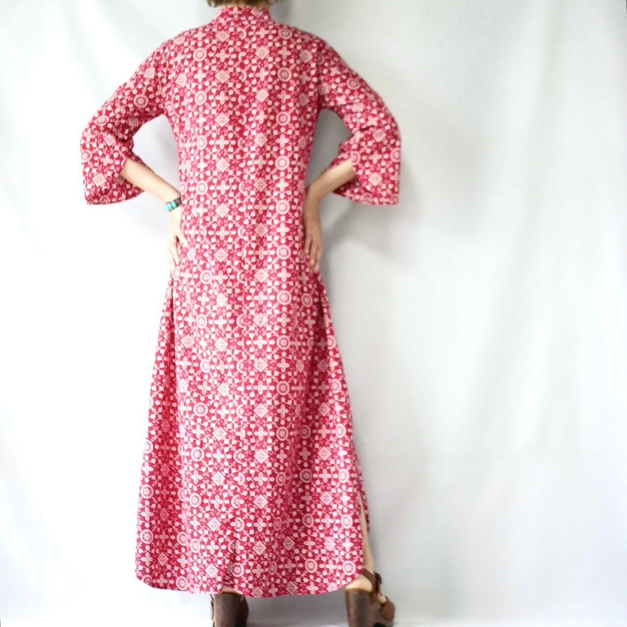 七分袖の袖口のラインが素敵な、70年代ヴィンテージ パキスタンコットン バーガンディーペイズリー柄 マキシ丈 カフタンワンピースです。