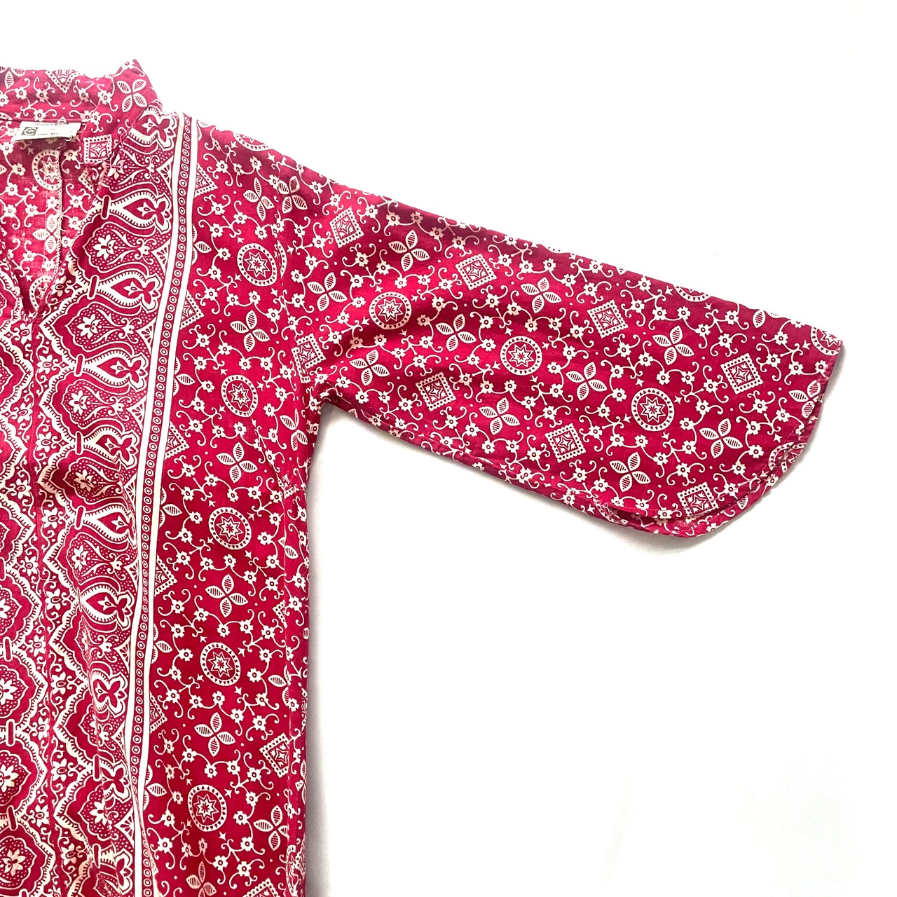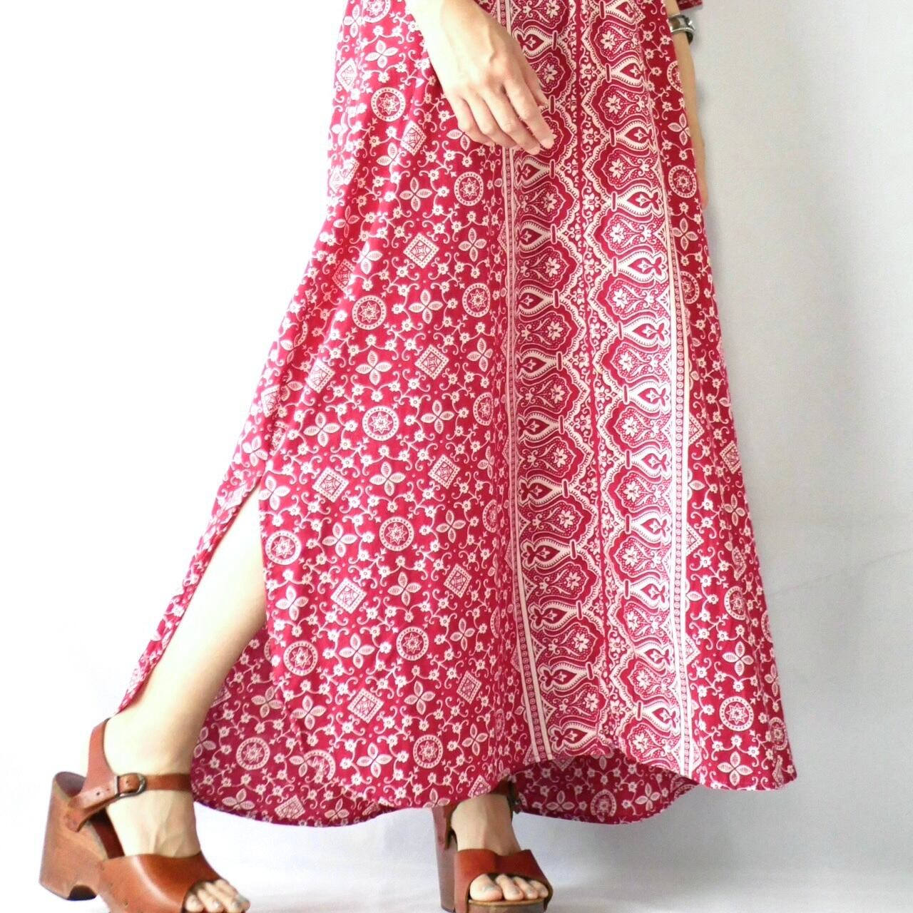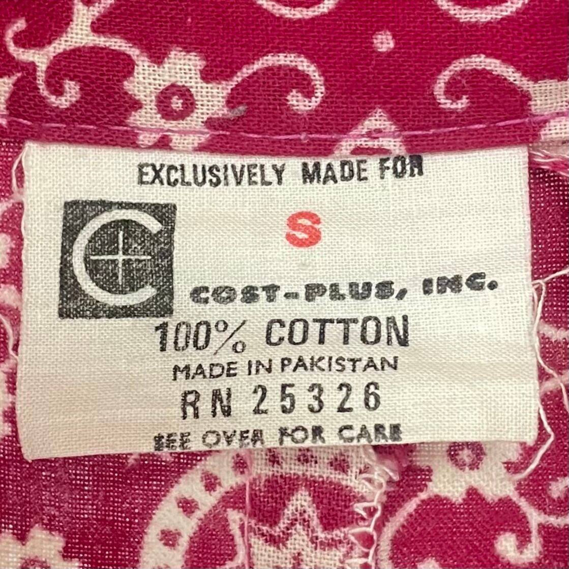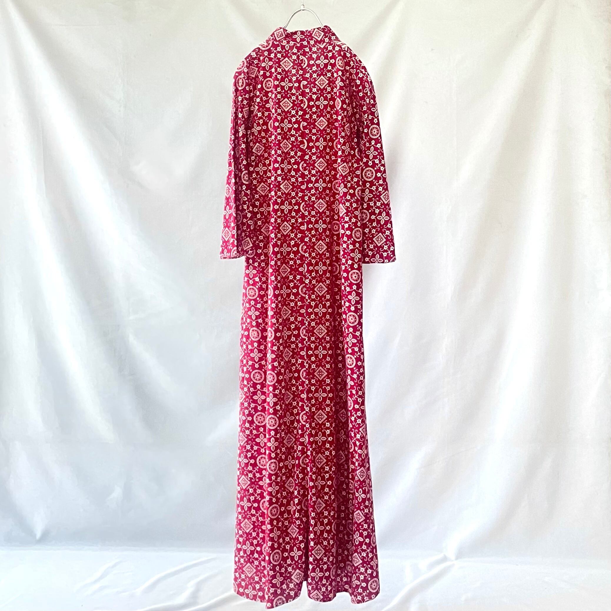 七分袖の袖口のラインが素敵な、70年代ヴィンテージ パキスタンコットン バーガンディーペイズリー柄 マキシ丈 カフタンワンピースです。